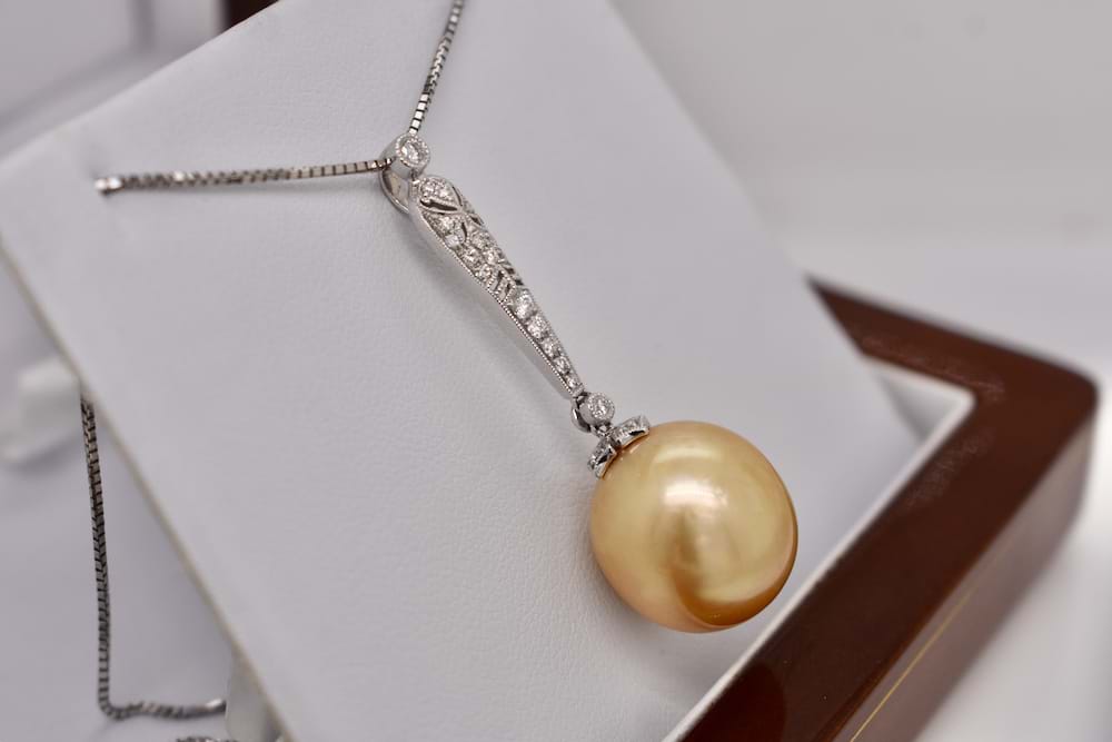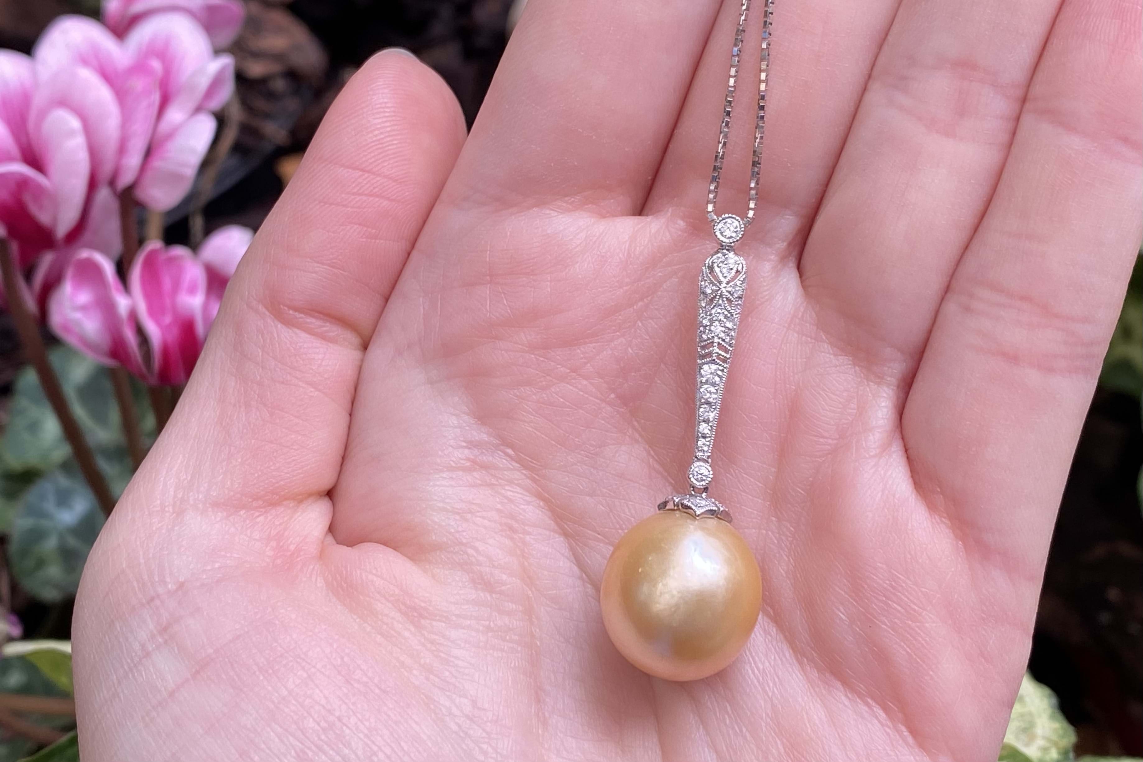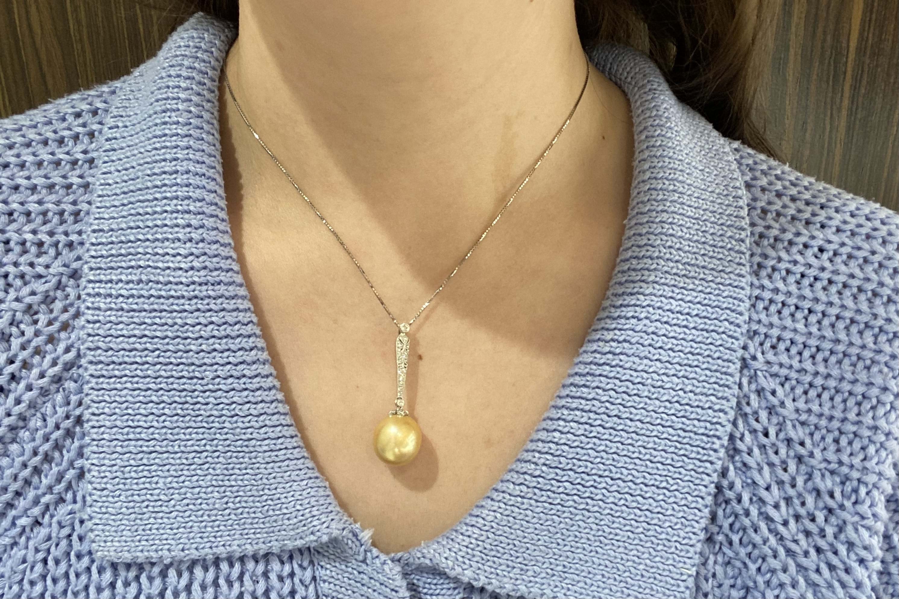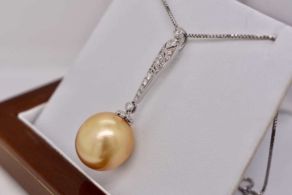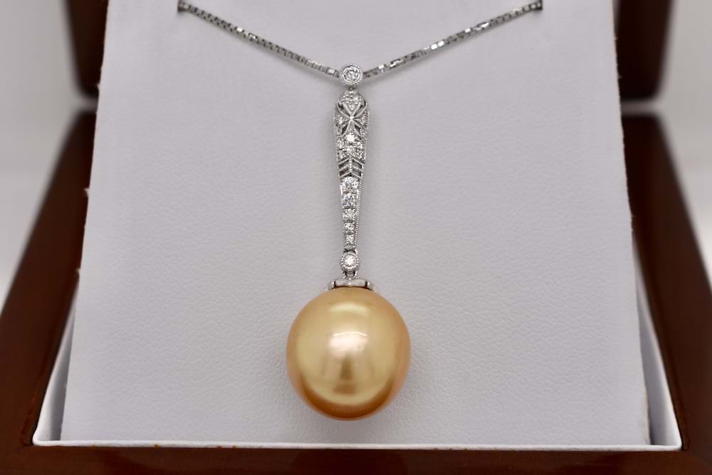 A stunning and elegant pendant featuring an oval 14.35mm golden south sea pearl with a med-good lustre, lightly blemished suspended from an intricate Art Deco inspired elongated drop panel carved in 18ct white gold and set with 24 round brilliant cut diamonds equalling 0.22cts (GVS). Independent Valuation Supplied. Chains are available for separate purchase