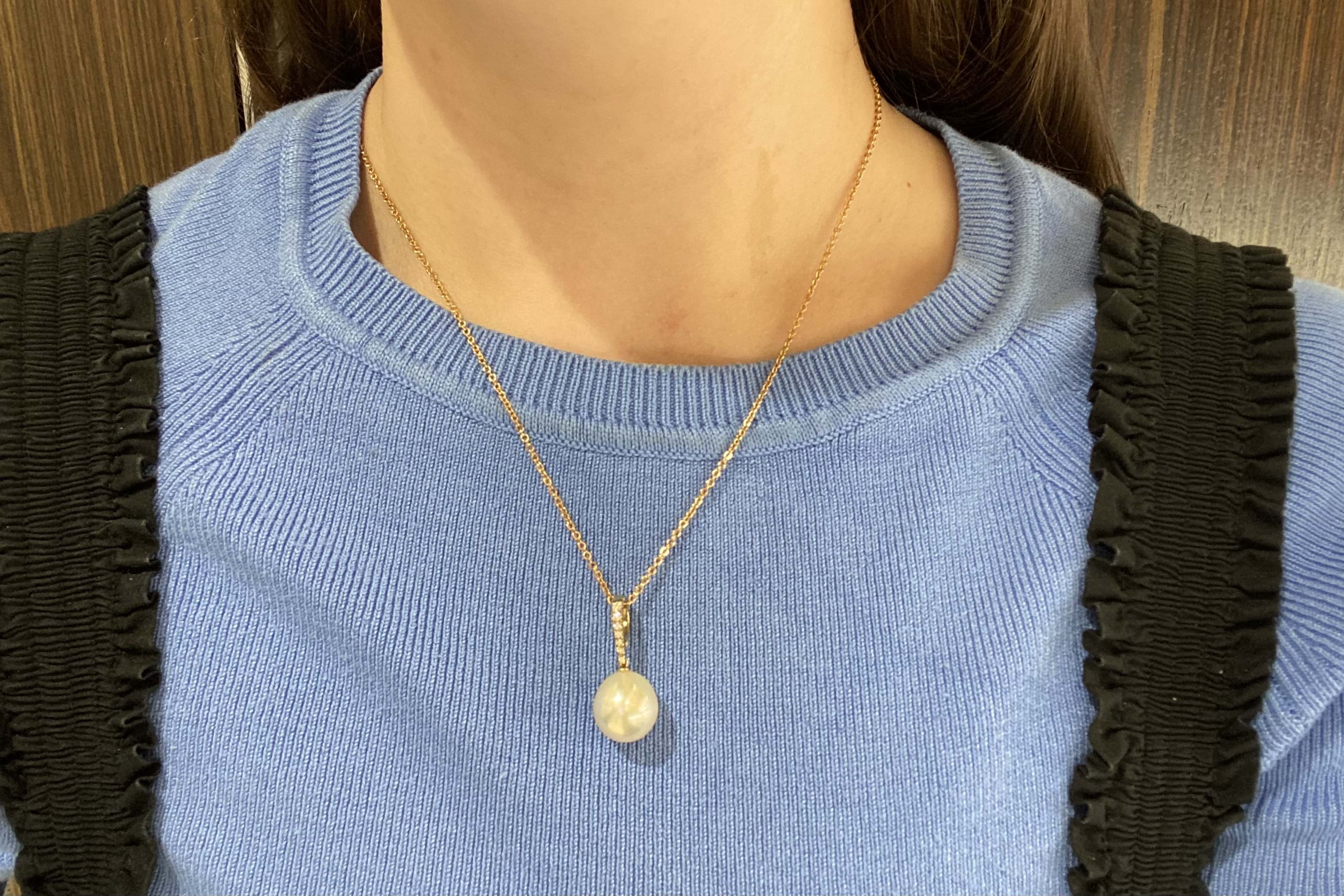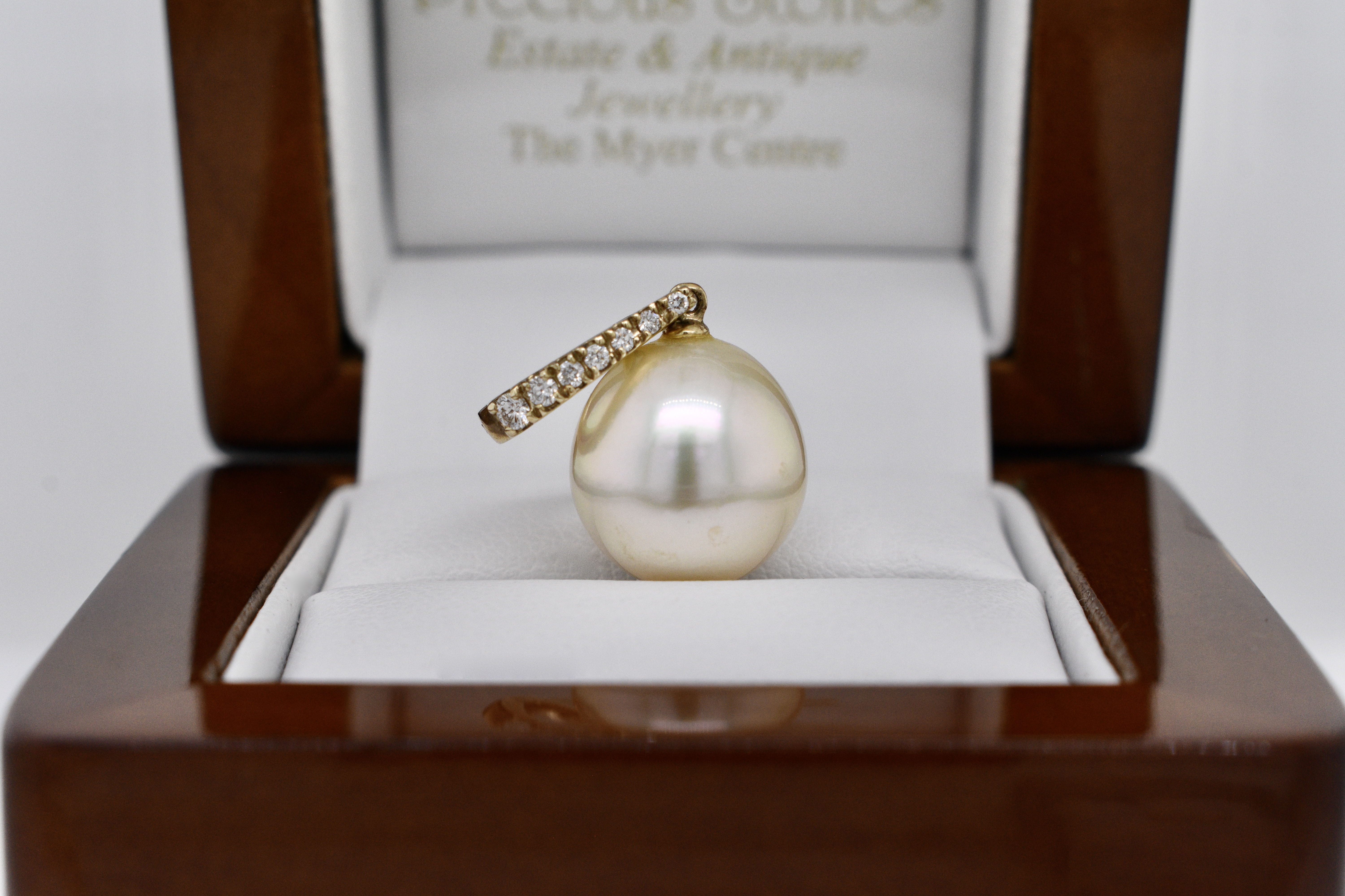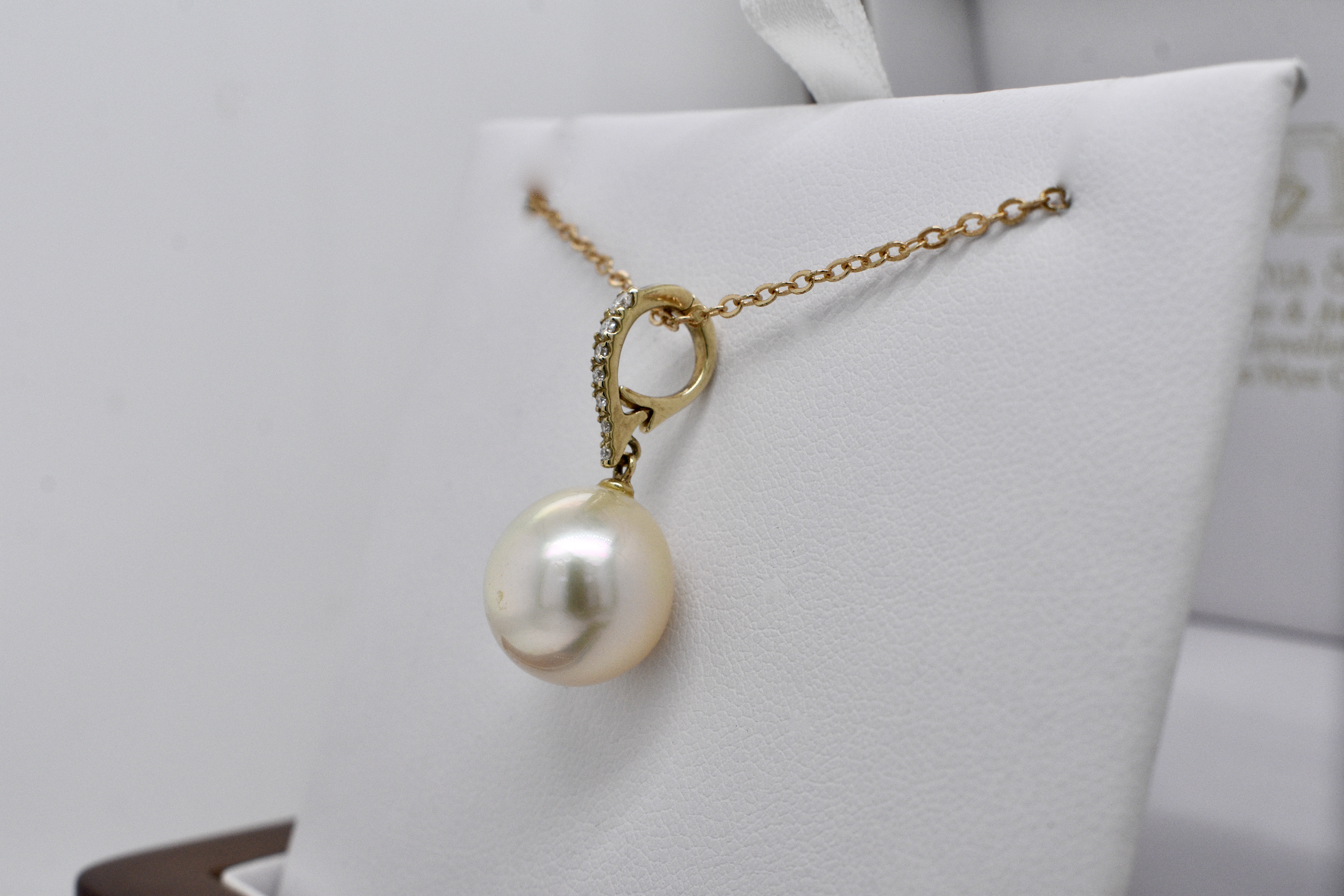 A diamond set 9ct yellow gold enhancer clasp containing seven round brilliant cuts equalling 0.12cts and leading the eye to a lustrous Australian south sea pearl measuring 12.5-13mm. Independent Valuation Supplied
