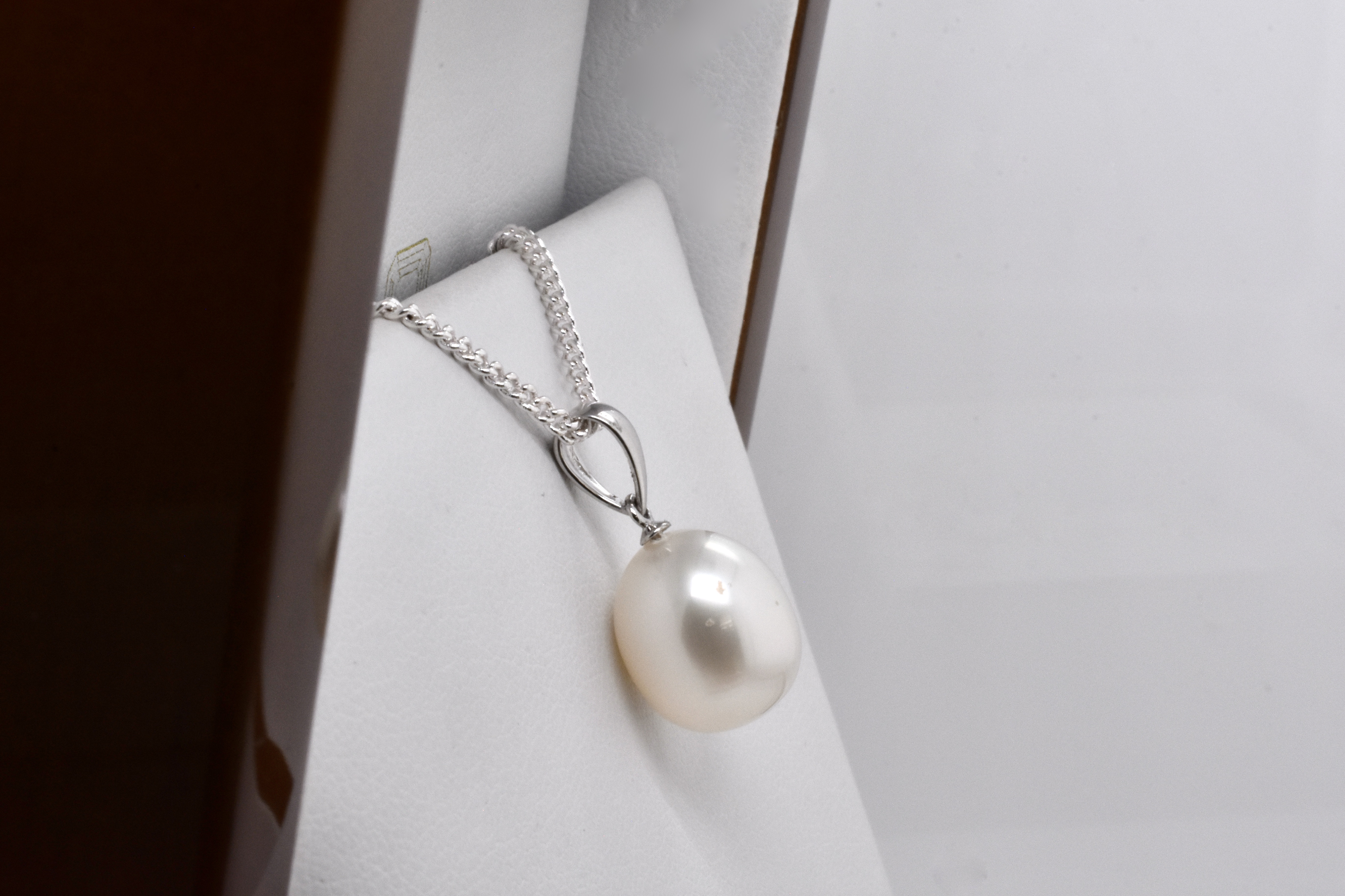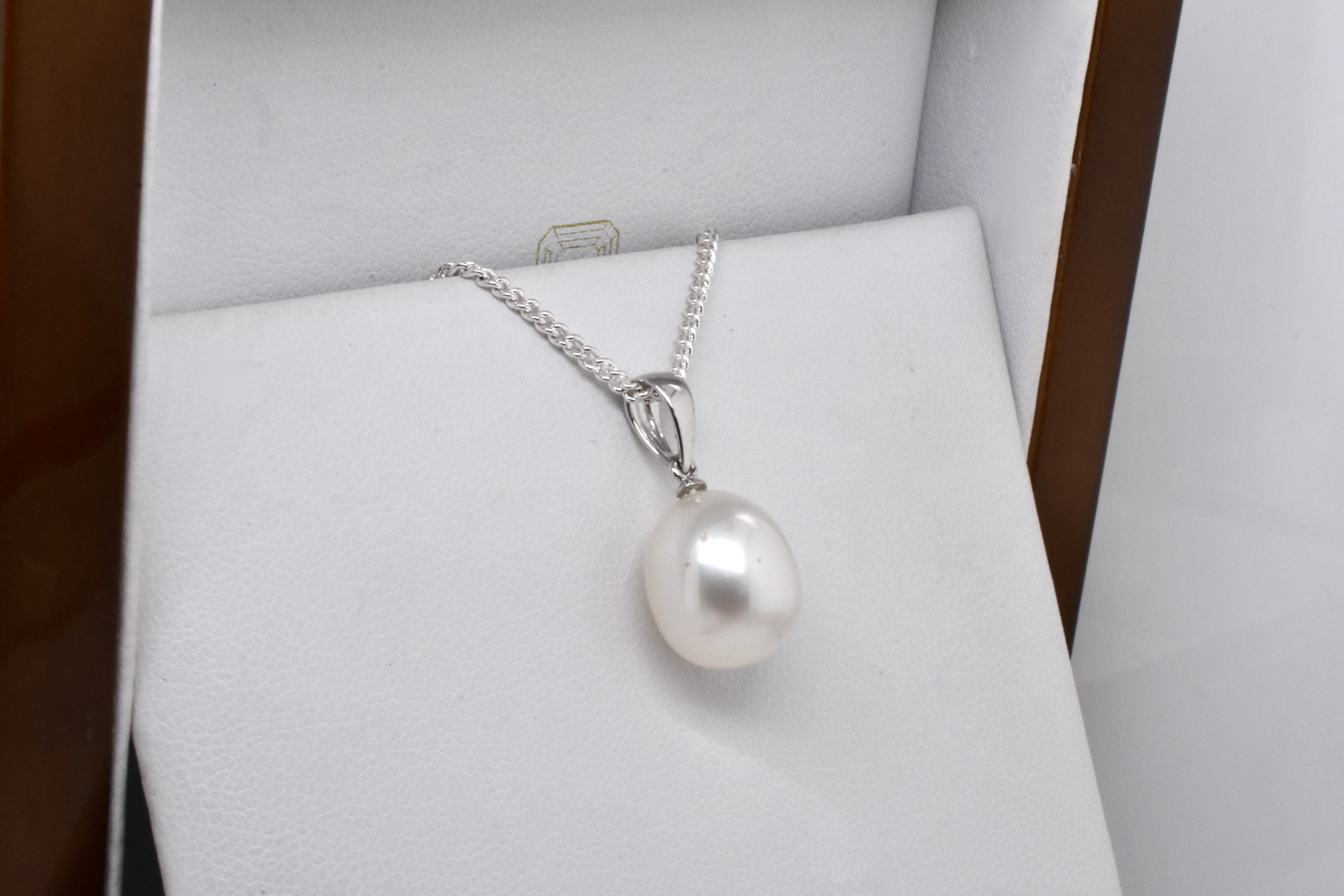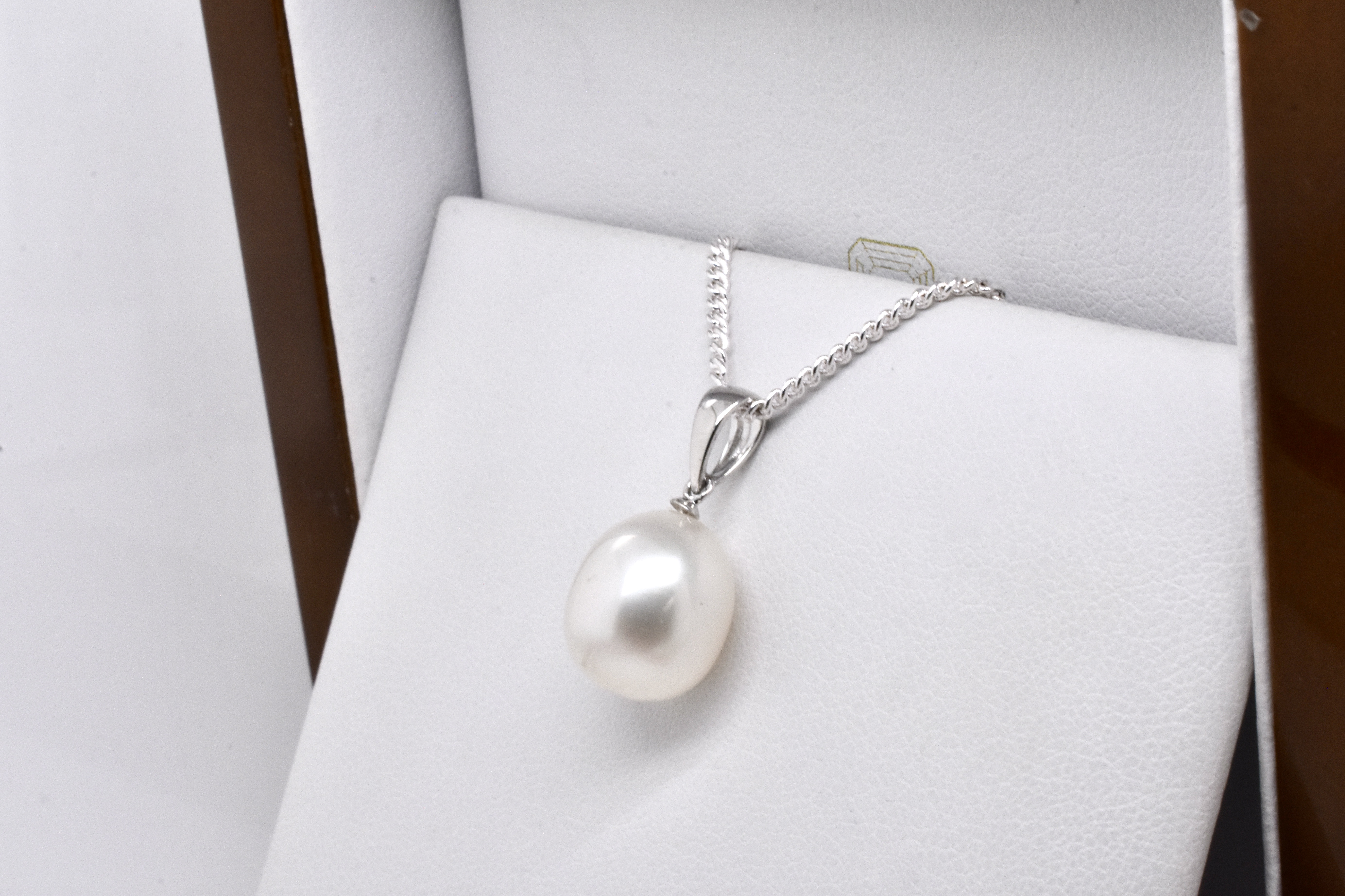 A timeless pendant made in 9ct white gold with a plain tapered bail, set with a 10-11mm slightly oval white south sea pearl with good lustre. Chains available for separate purchase