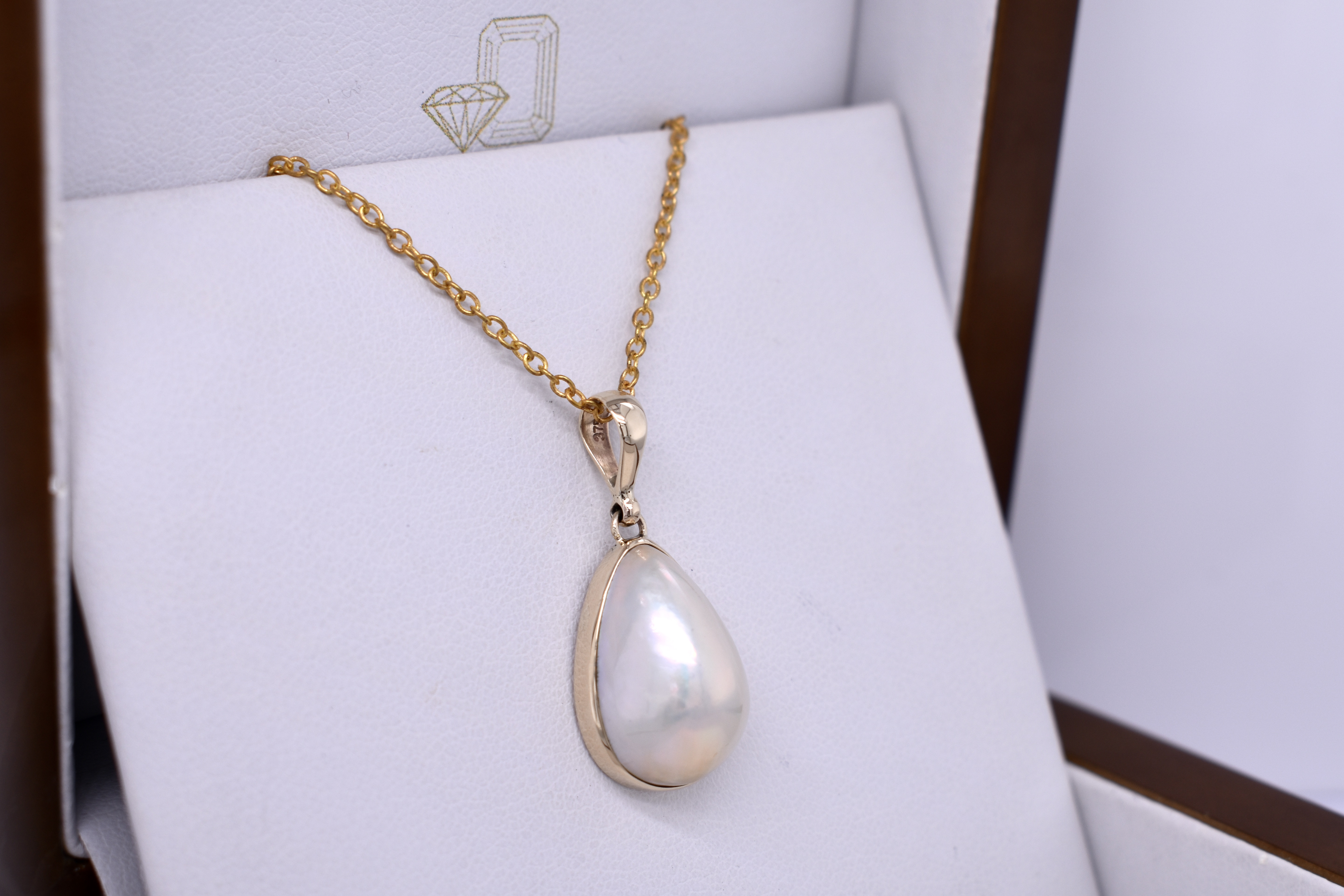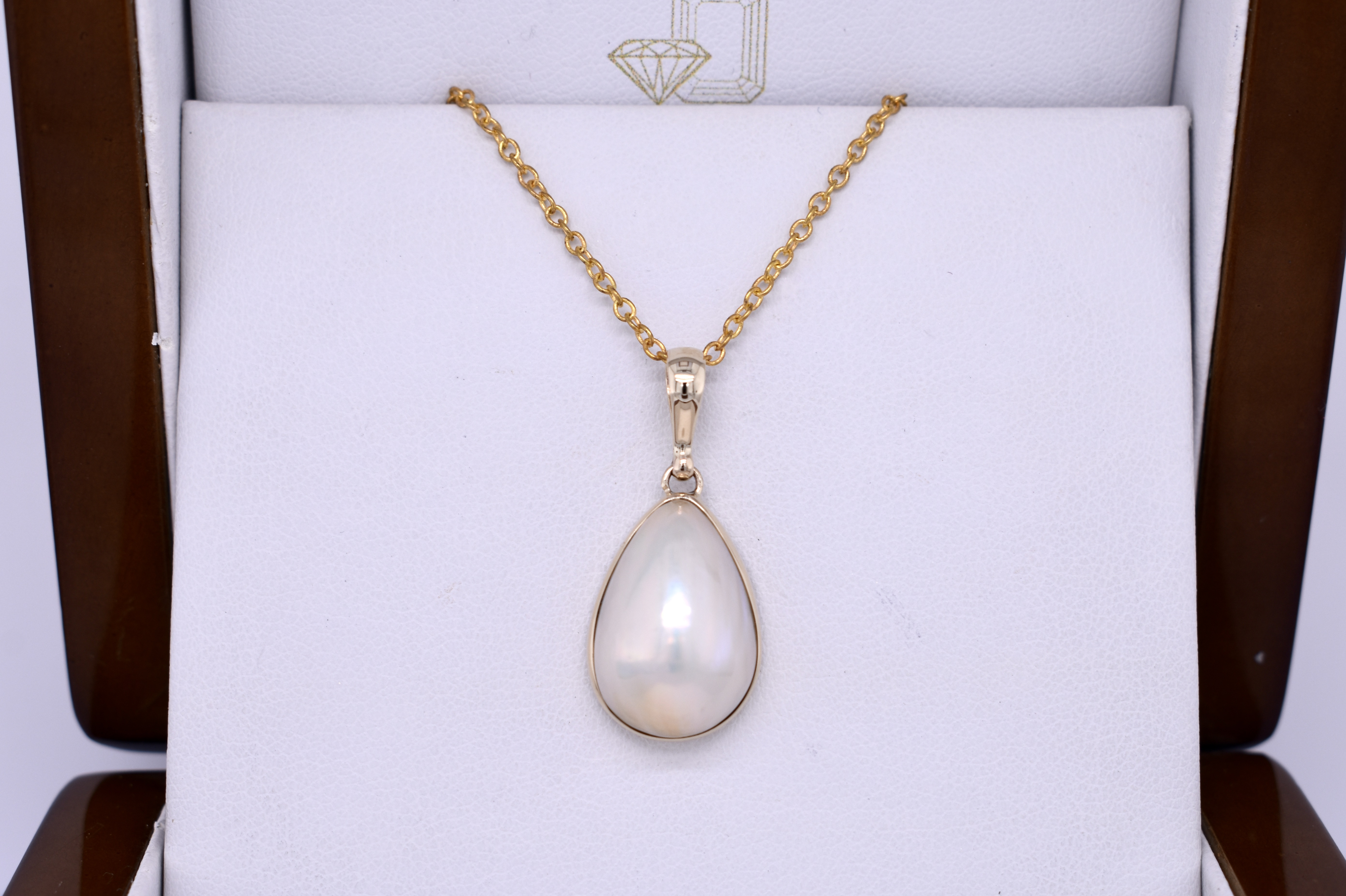 Simple and elegant pearshape mabe pearl measuring approx. 18.5x13.1mm bezel set into a classic 9ct yellow gold pendant attached with a plain bale. Chains are available for separate purchase.