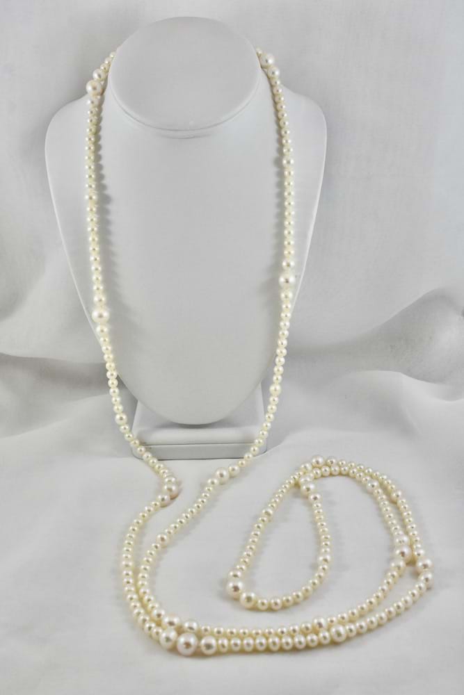 A striking and versatile strand of freshwater pearls measuring a total length of 160cm consisting of mainly 5-6mm pearls with feature sections graduating up to 8mm. You can wear this extra long strand many ways, making it a fabulous addition to your jewellery collection!