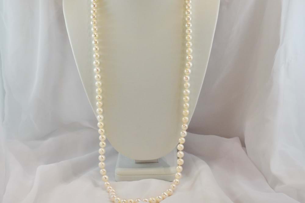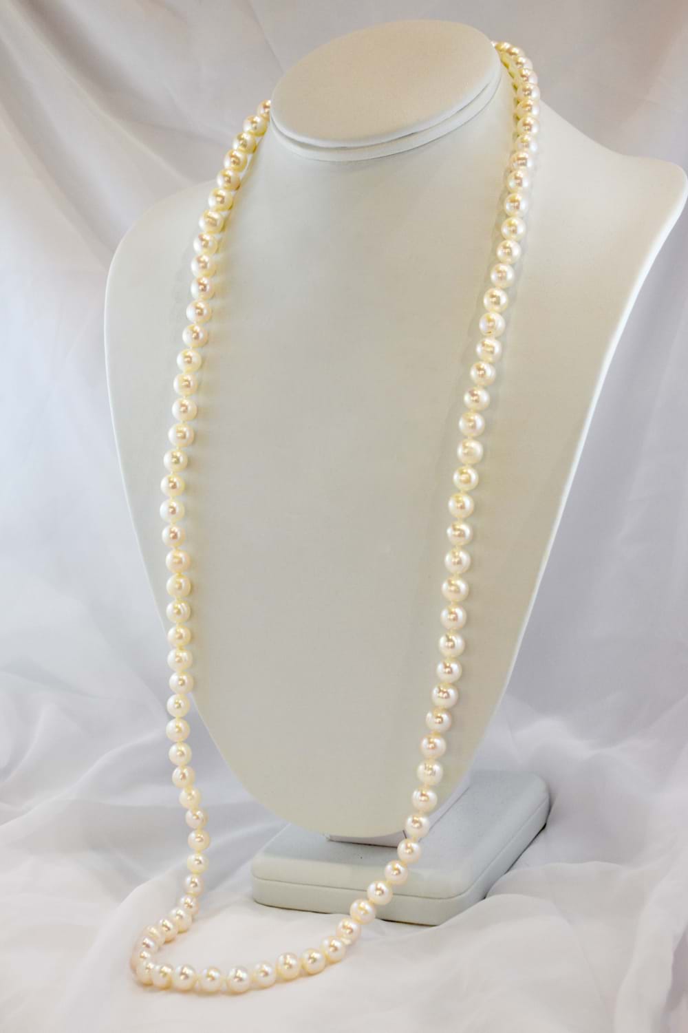 This long strand of freshwater pearls measuring 8-9mm semi-round is 32" long and has no clasp. A great strand to dress up any outfit