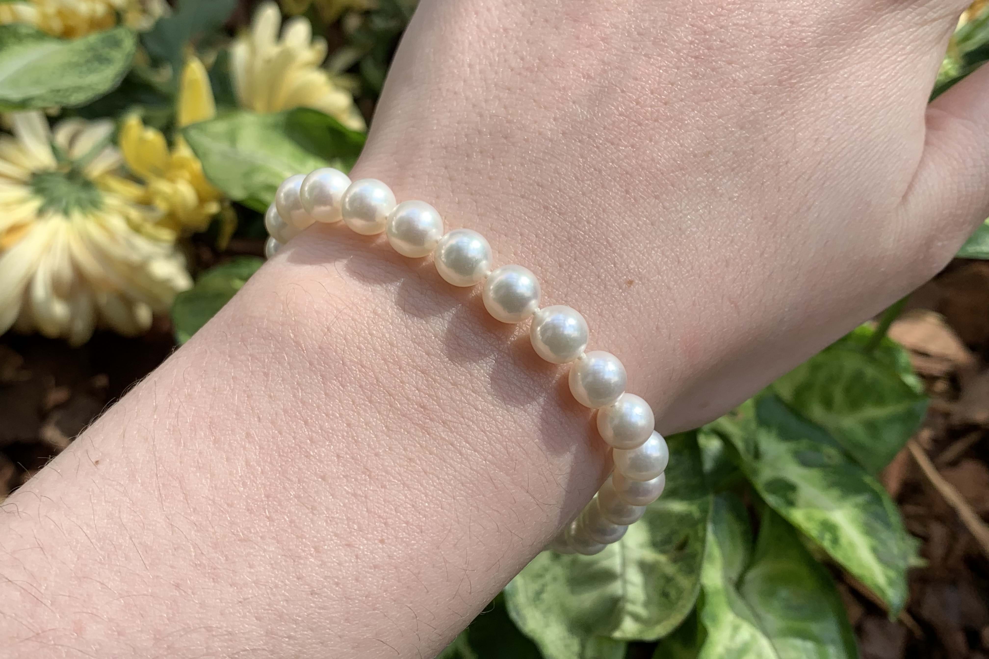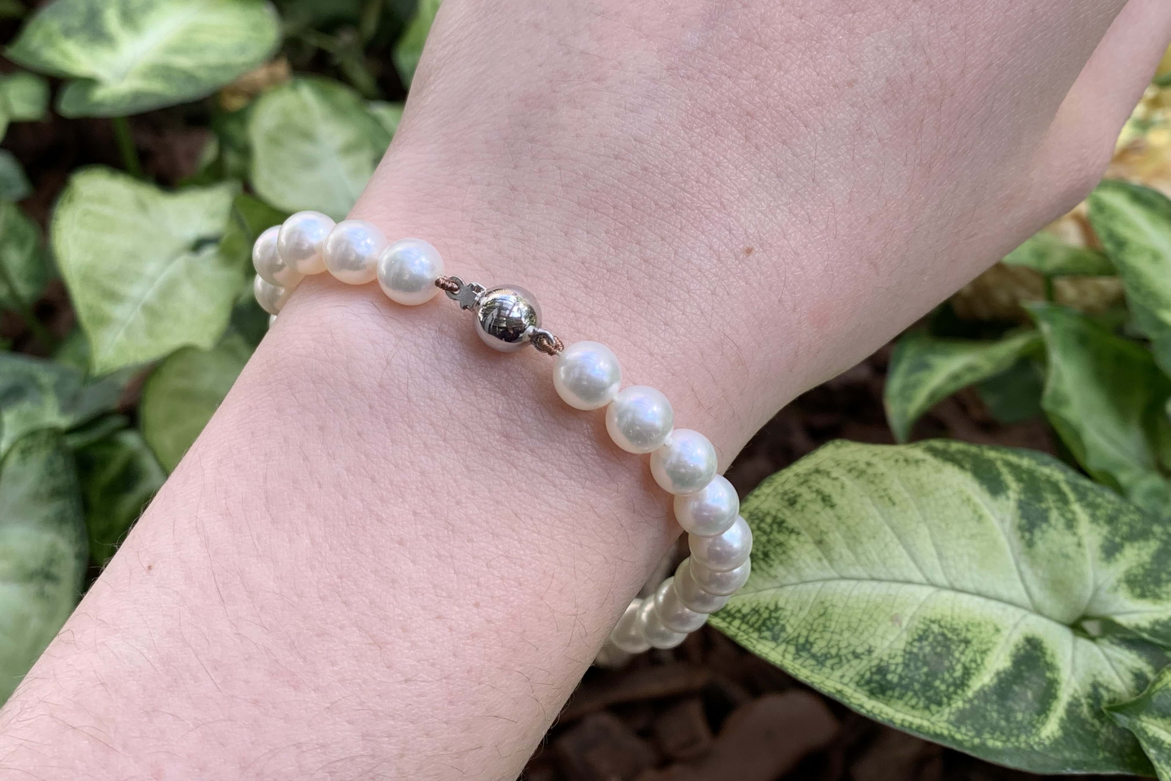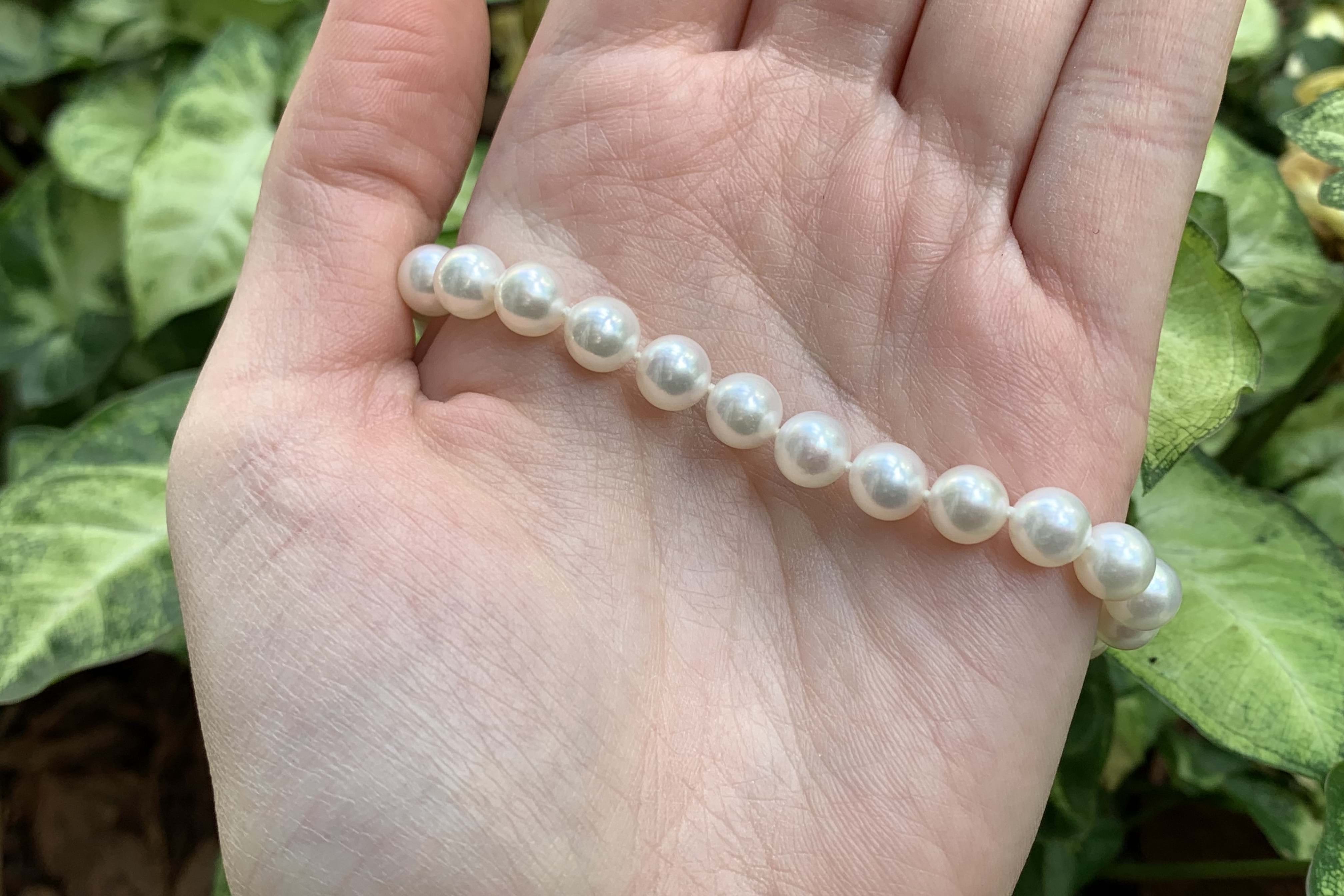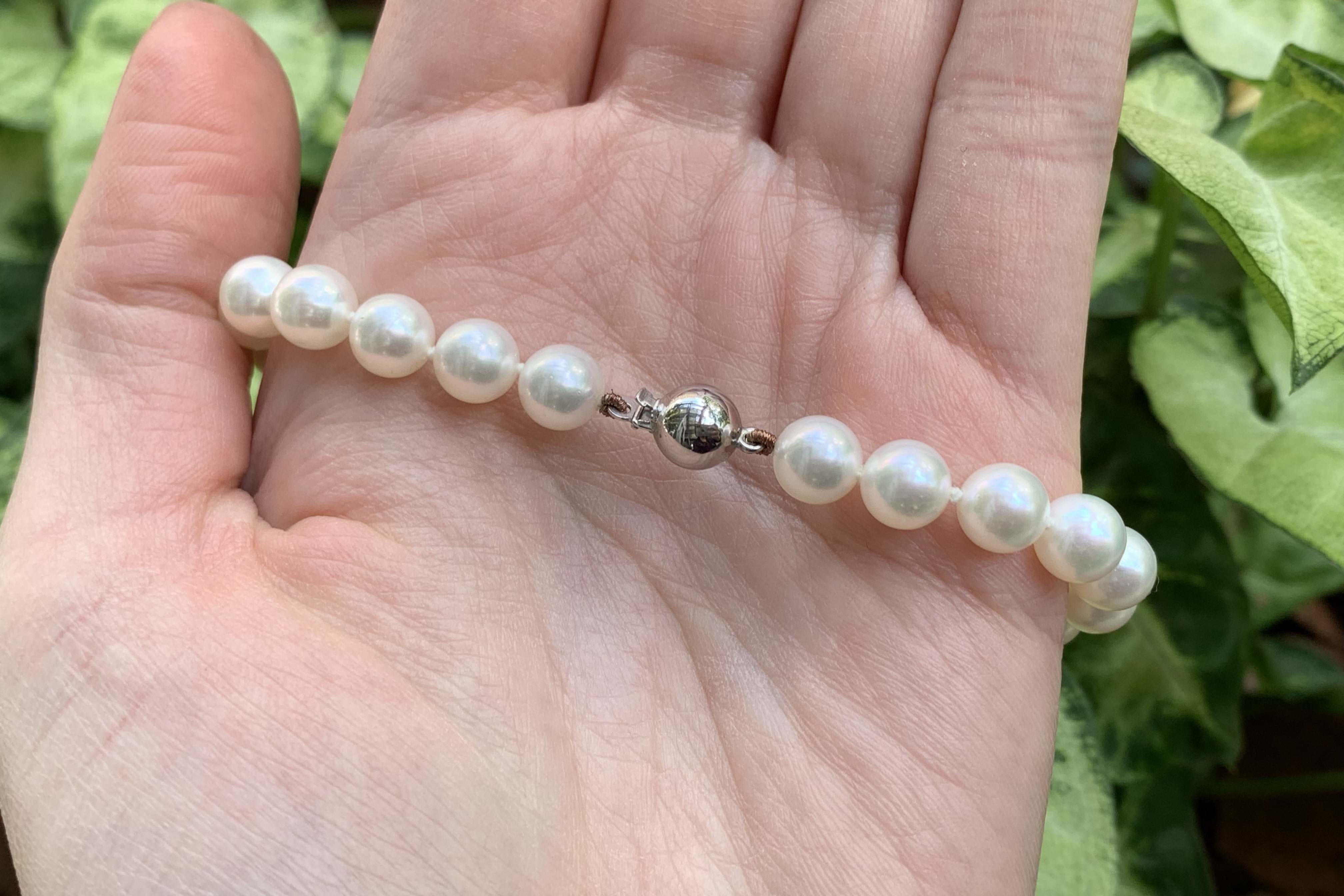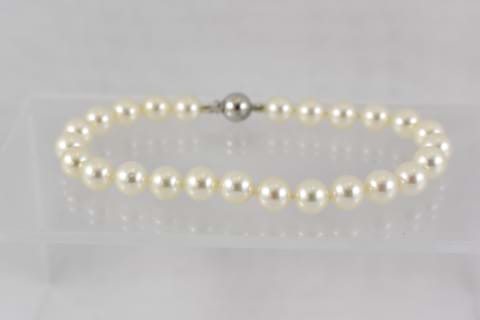 A hand strung bracelet individually knotted featuring 6.5-7mm lustrous, near round, Akoya pearls with a 9ct white gold ball clasp. Independent Valuation Supplied. Matching necklace available for separate purchase