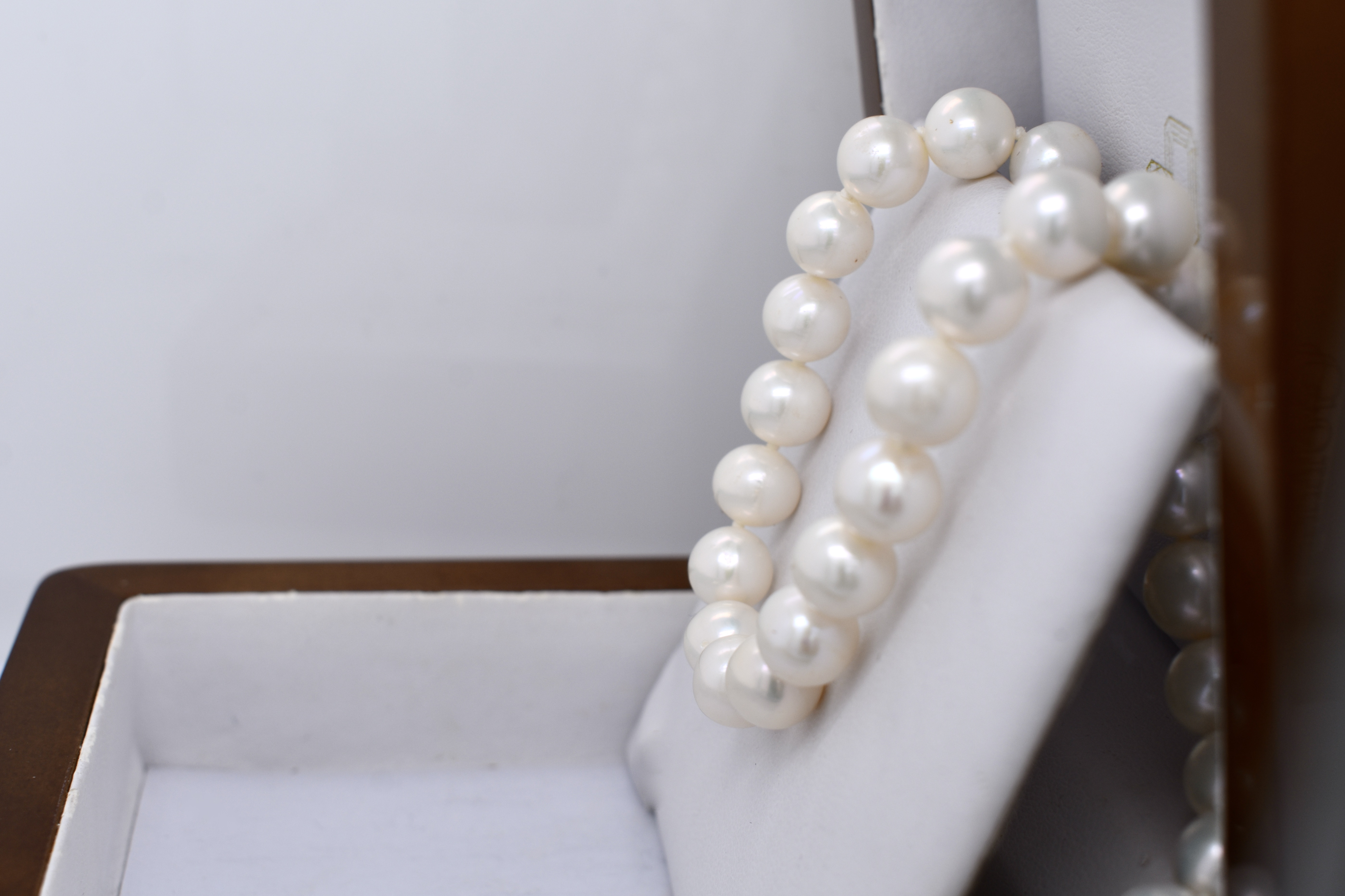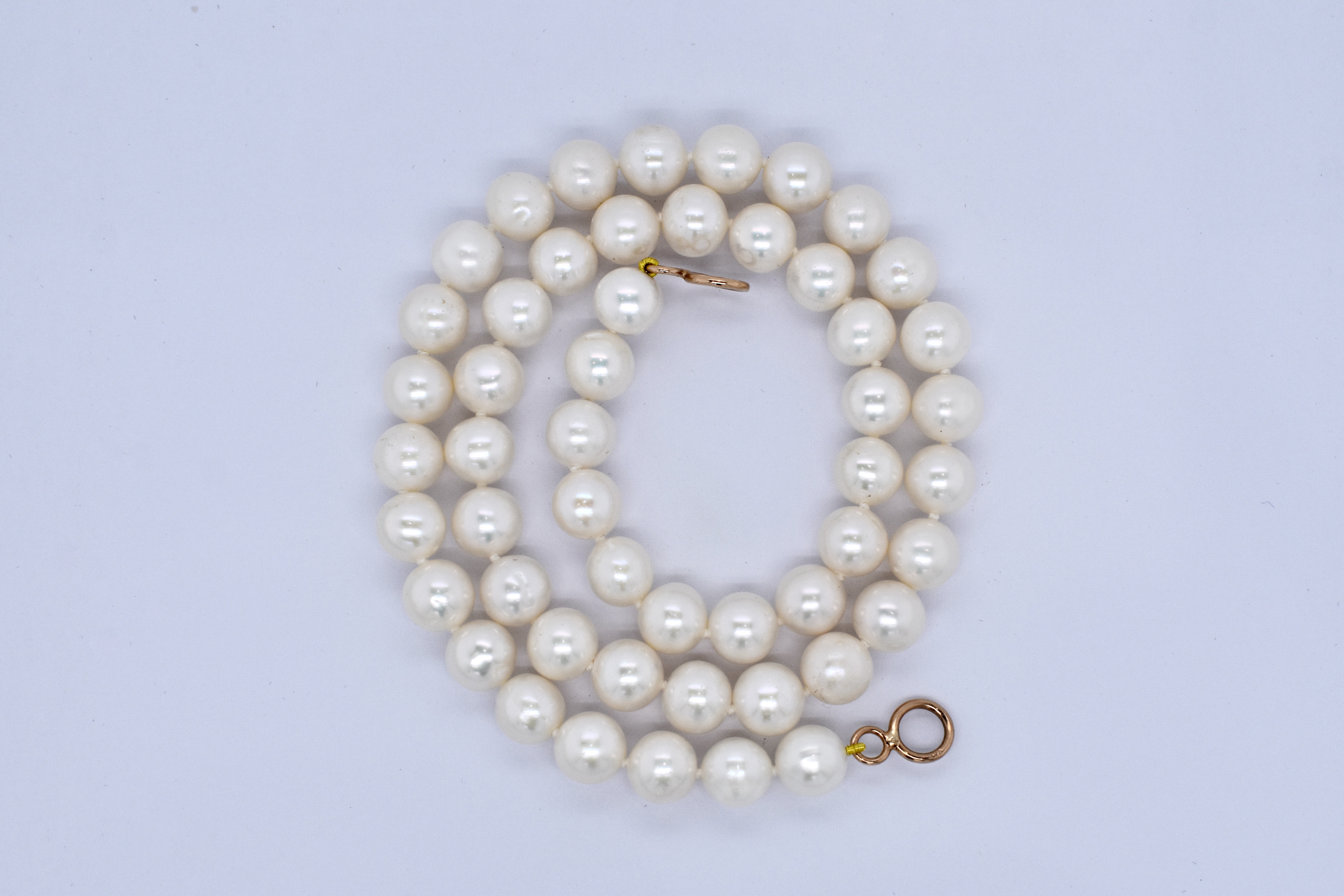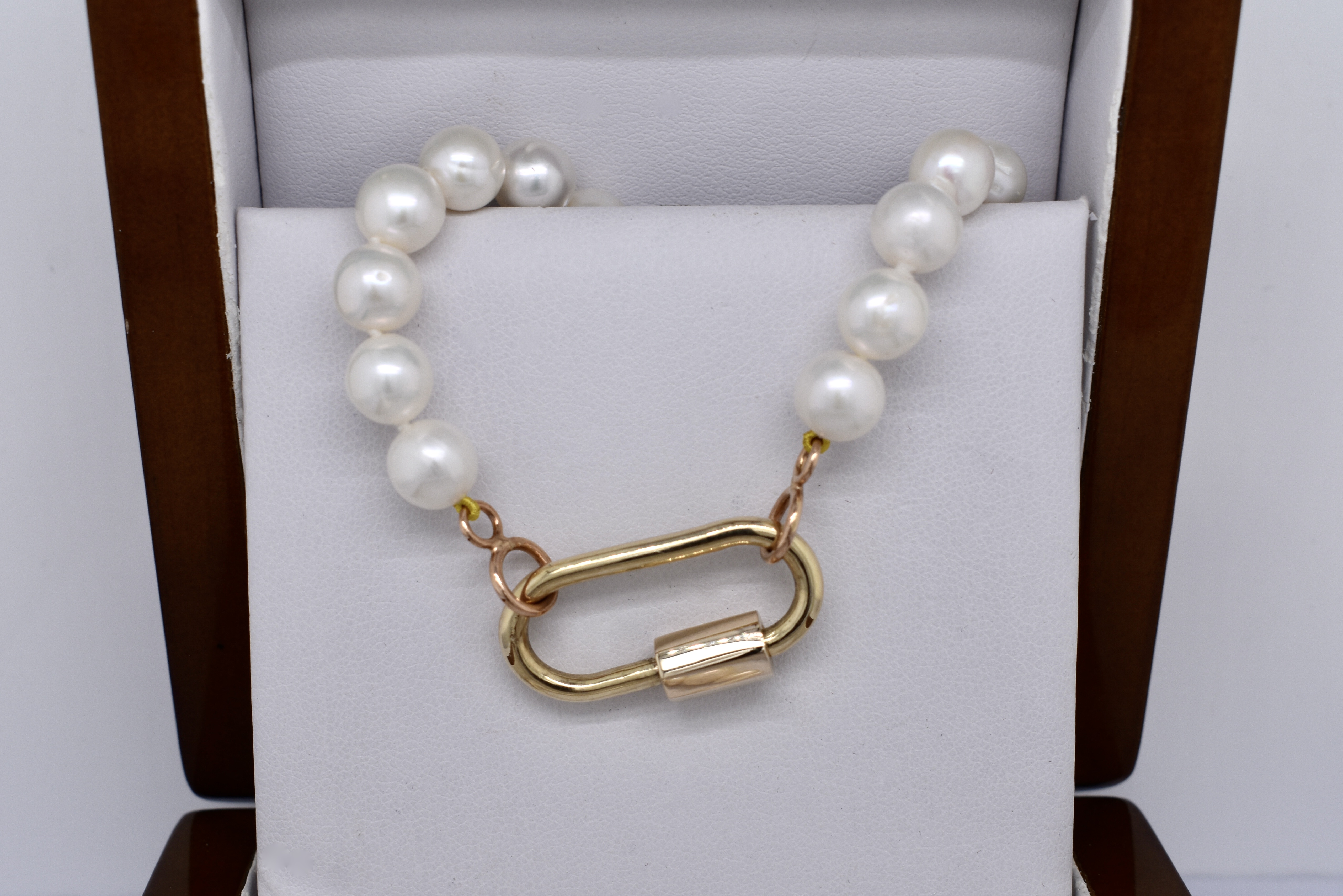A beautiful strand of white Freshwater pearls with good lustre, measuring 8-8.5mm near round. The pearls have been hand strung on silk and with two 9ct rose gold jump ring ends. Strand length 45cm. These ends allow for a wide range of styling versatility, including various brooches, enhancers or carabiners. Carabiners are available for separate purchase.