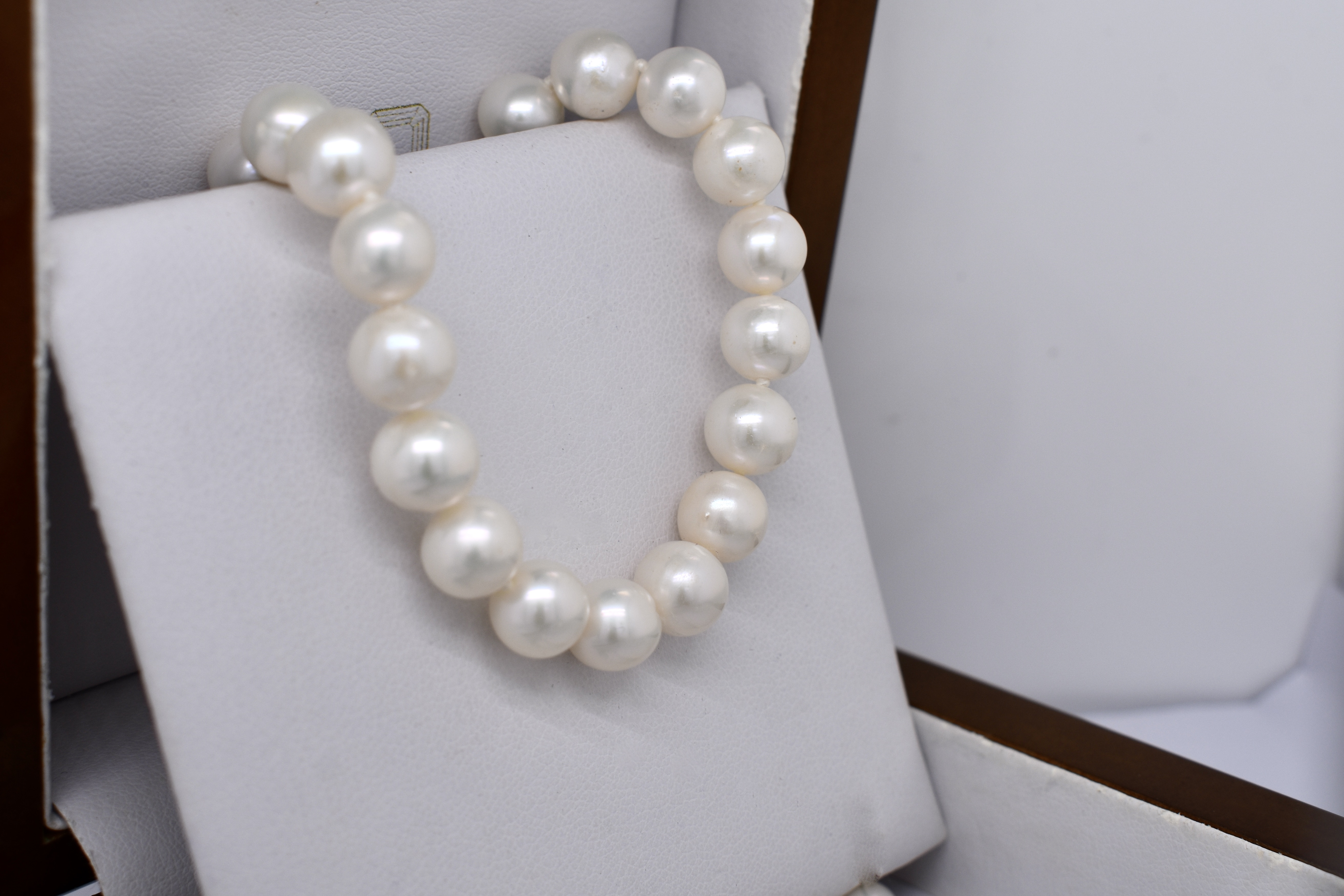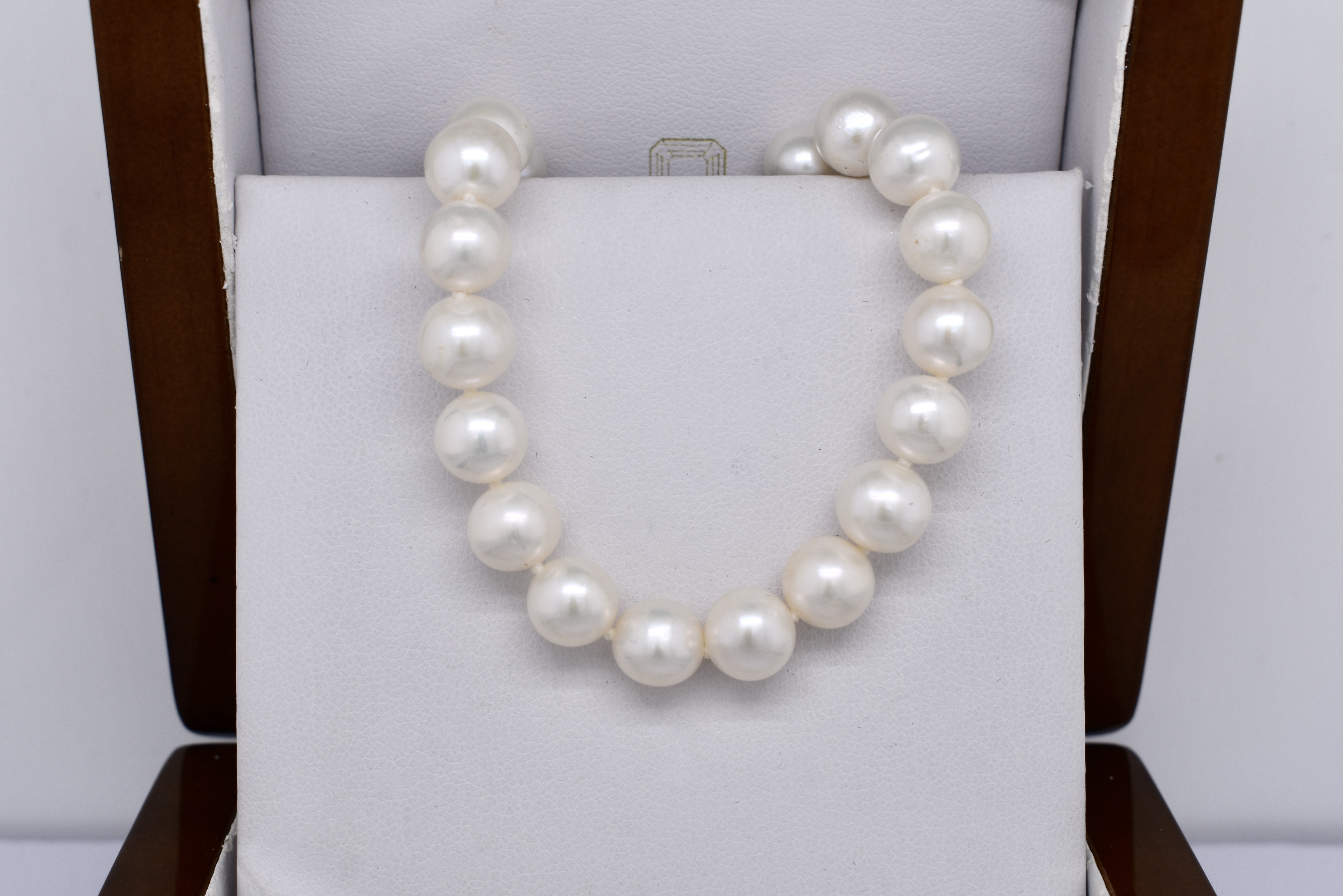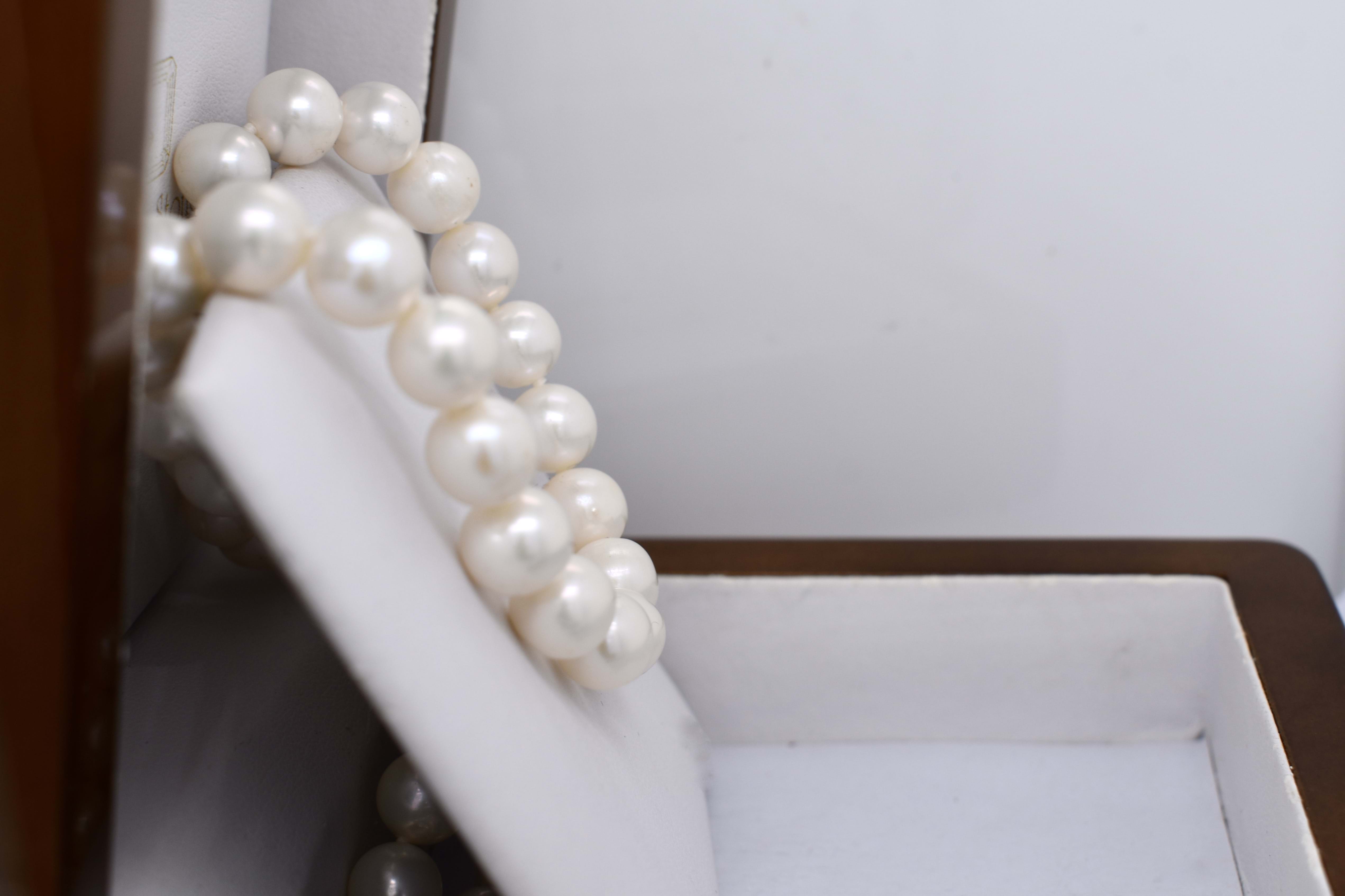 A beautiful strand of white Freshwater pearls with good lustre, measuring 8-8.5mm near round. The pearls have been hand strung on silk and with two 9ct rose gold jump ring ends. Strand length 45cm. These ends allow for a wide range of styling versatility, including various brooches, enhancers or carabiners. Carabiners are available for separate purchase.