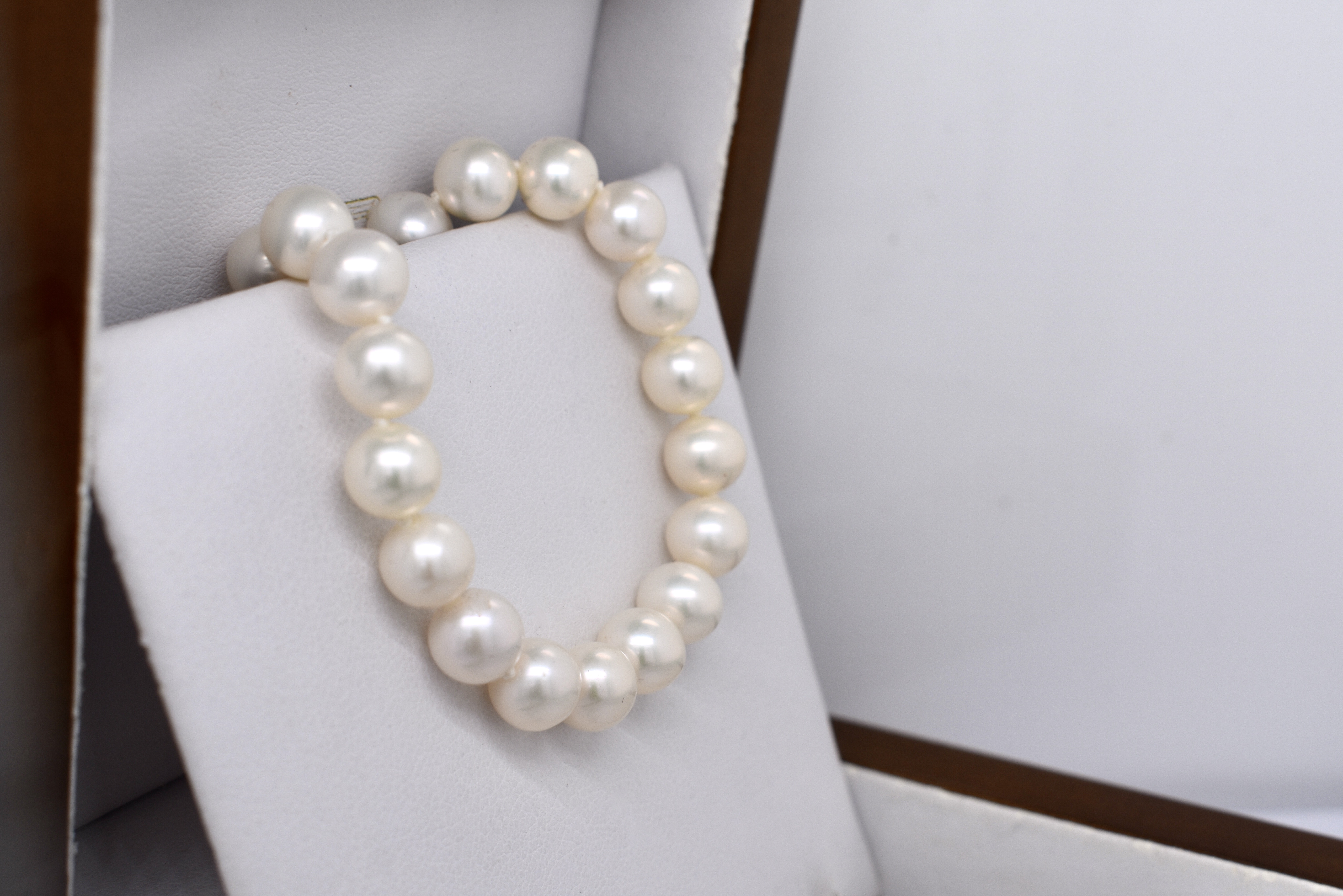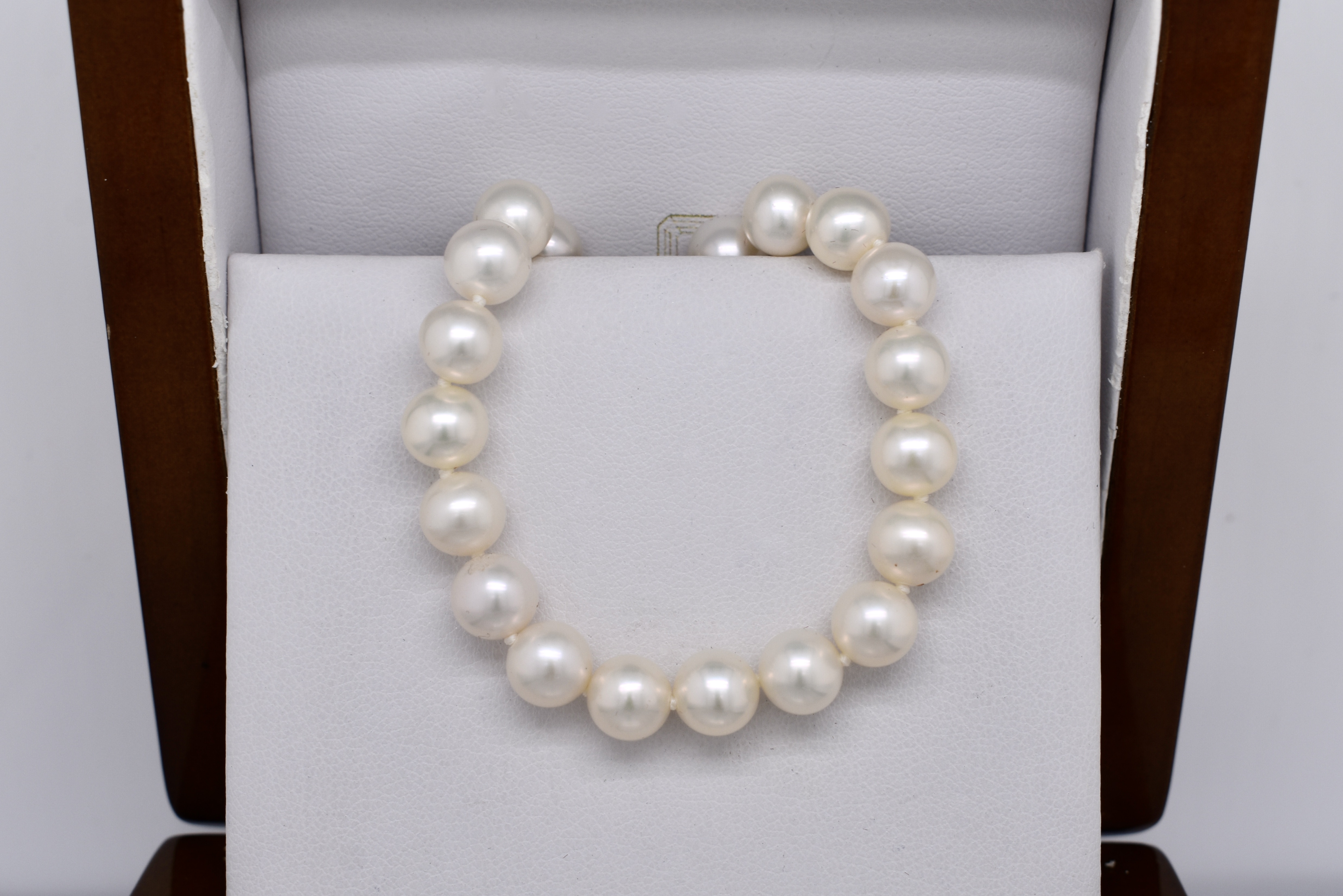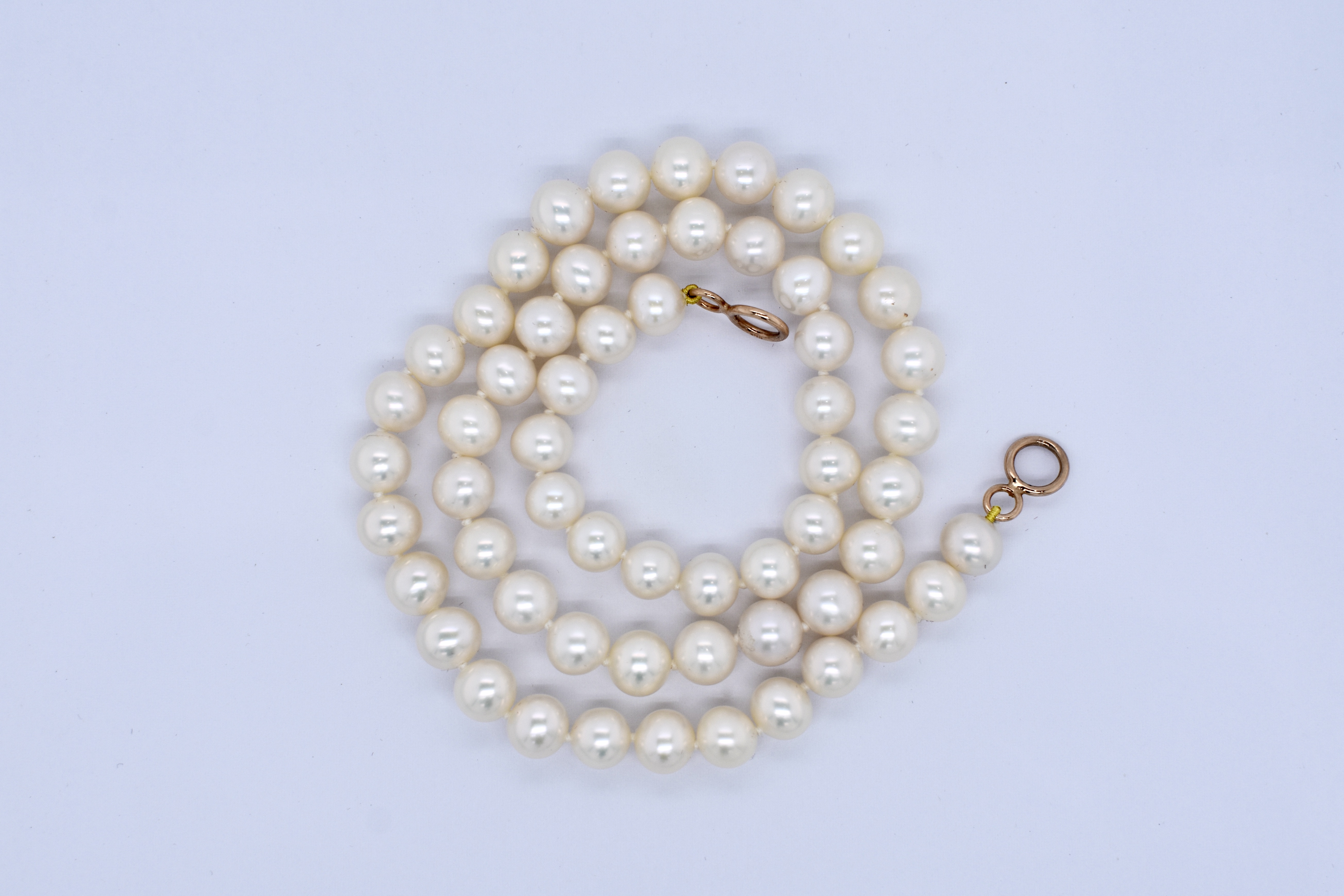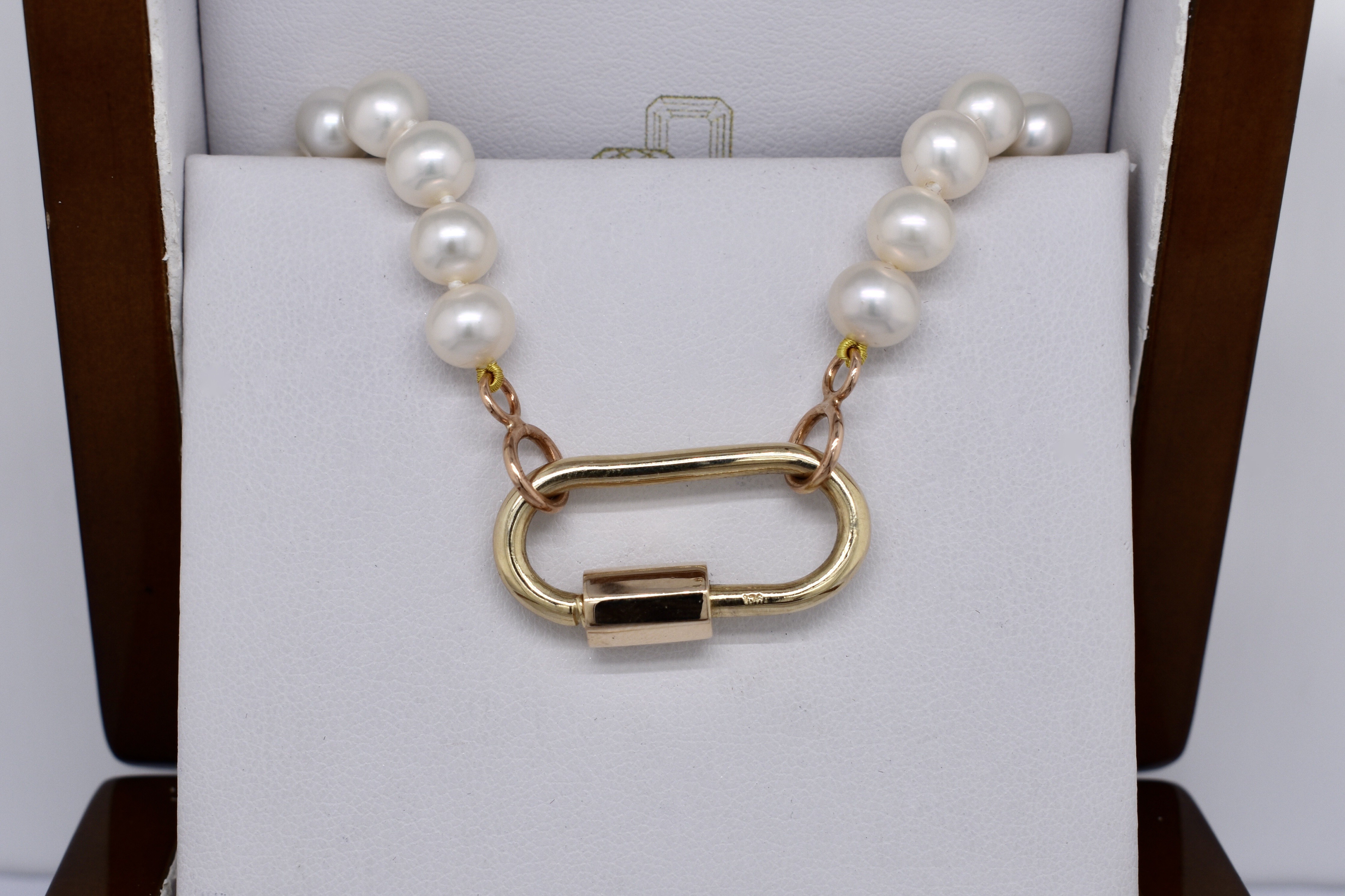 A classic strand of white Freshwater pearls with good lustre, measuring 7-7.5mm near round. The pearls have been hand strung on silk and knotted with two 9ct rose gold jump ring ends. Strand length 45cm. These ends allow for a wide range of styling versatility, including various brooches, enhancers or carabiners. Carabiners are available for separate purchase.