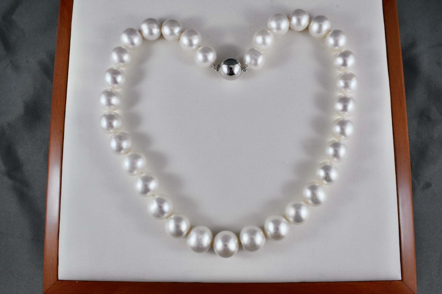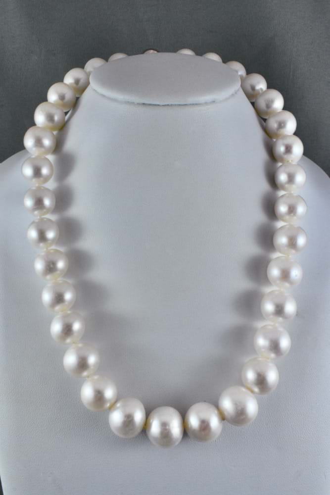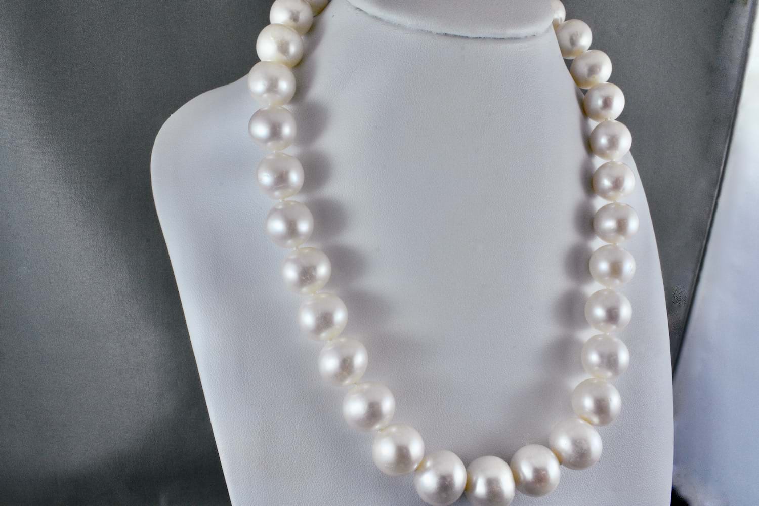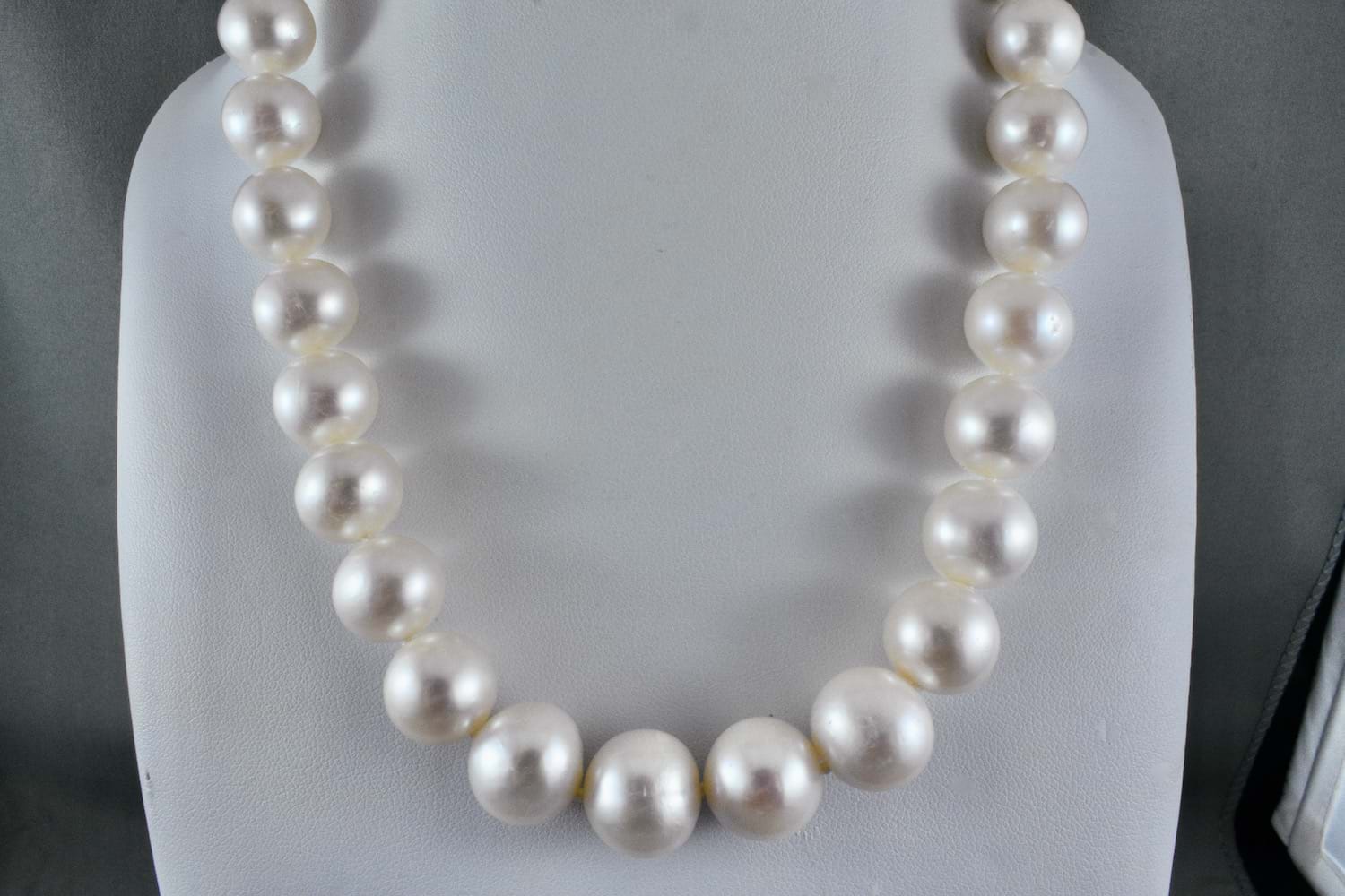 Impressive strand of 12.5-15mm freshwater pearls hand strung on silk and individually knotted with a 13mm 9ct white gold ball clasp. The strand measures 43cm and the pearls have been graded as oval, medium lustre, pink white hue and moderately blemished. Independent Valuation Supplied
