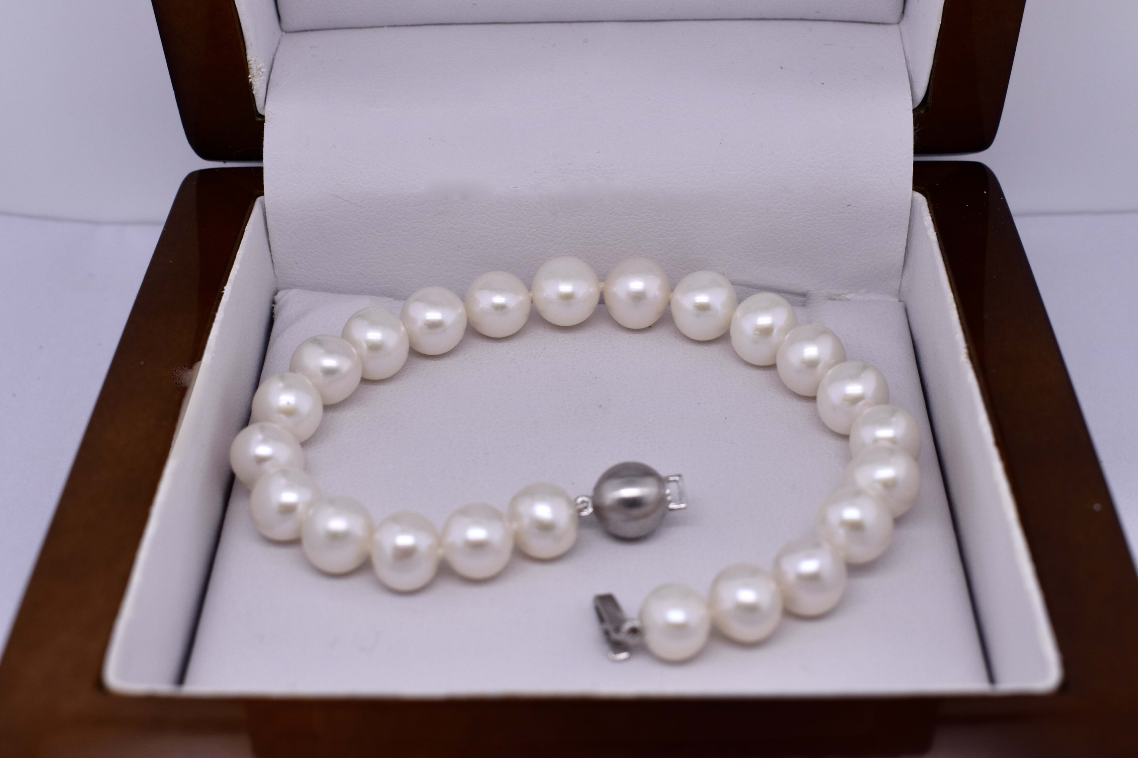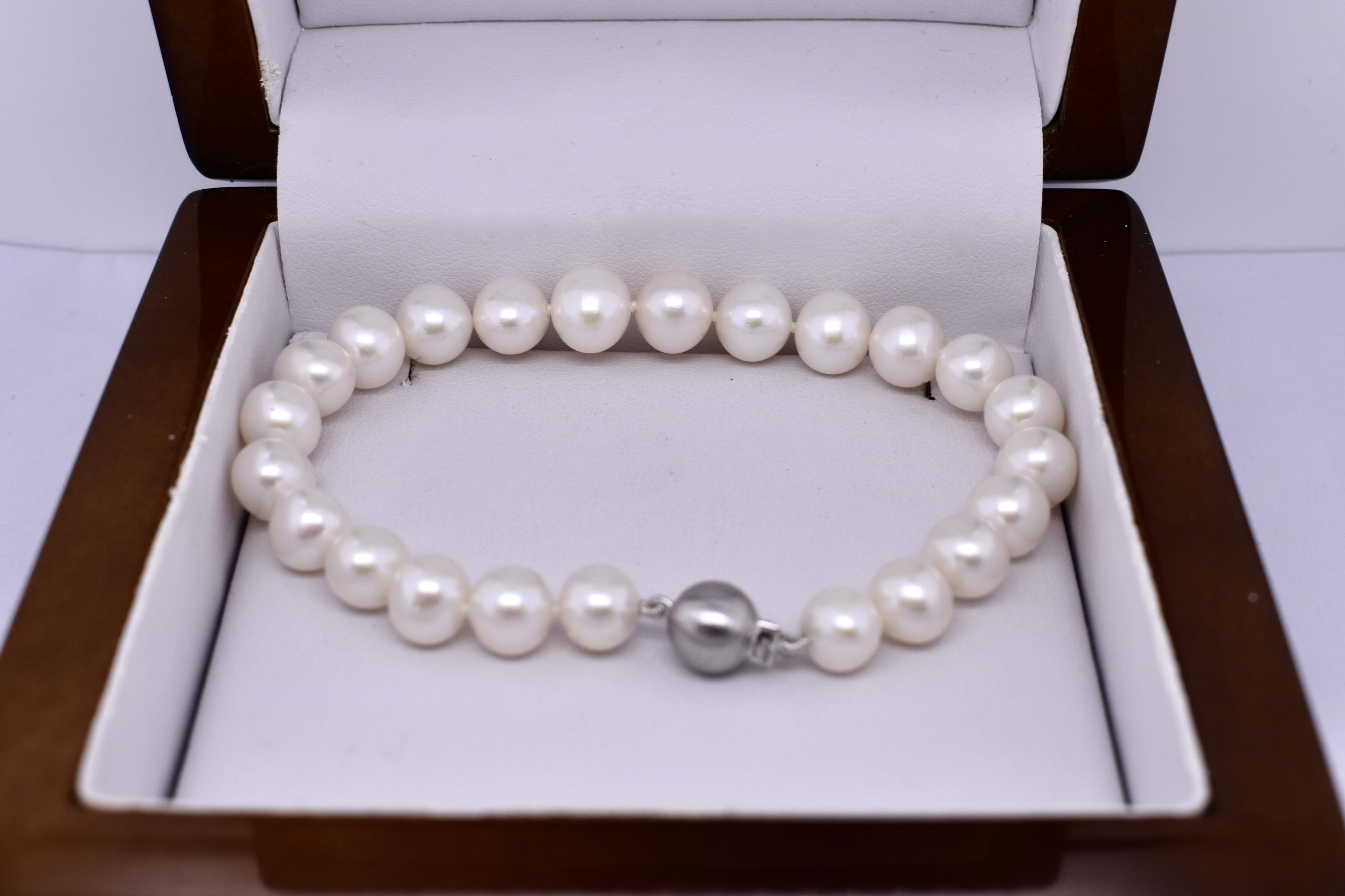 This classic bracelet of white near round freshwater pearls, measuring 7.5-8.5mm, has been hand strung on silk with 9ct white gold brushed finish ball clasp. Length is 20cm.