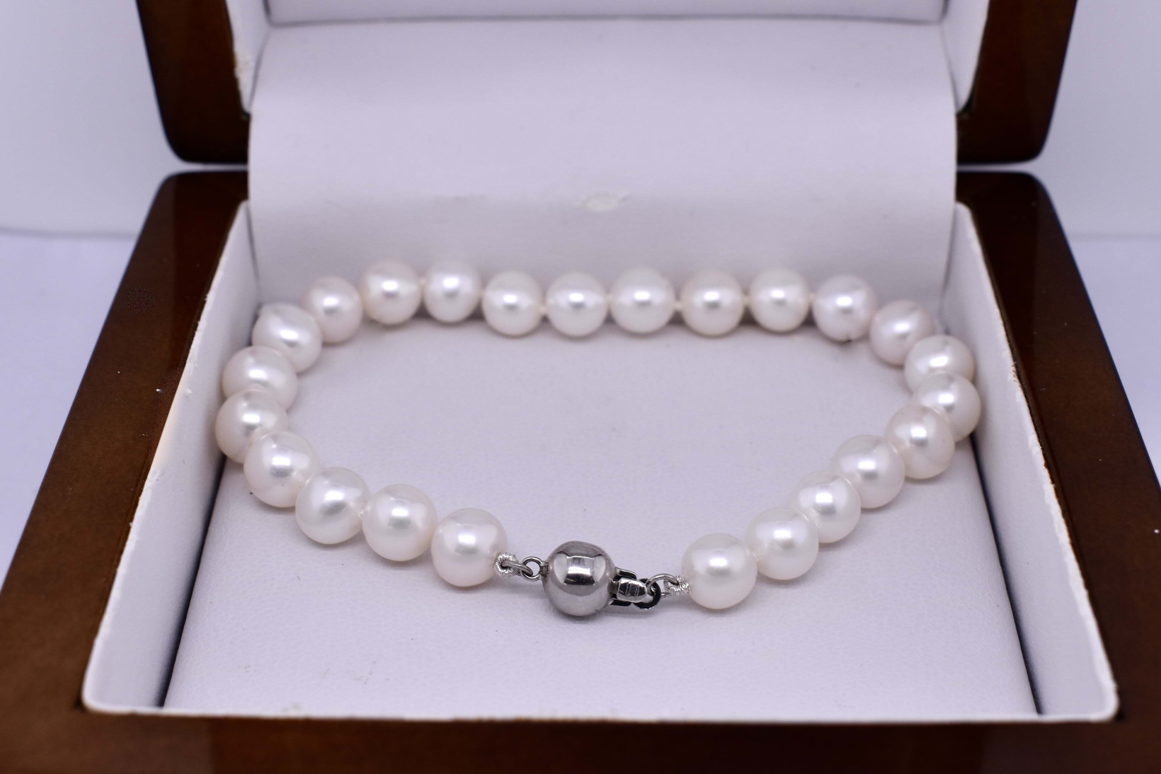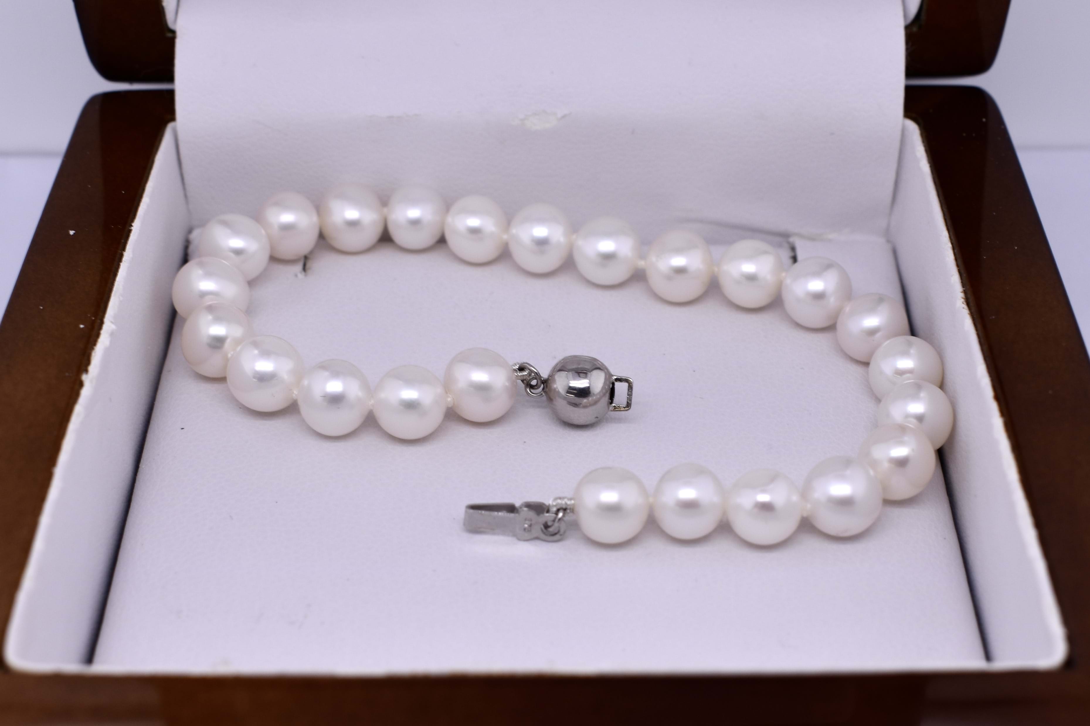 This classic bracelet of white near round freshwater pearls, measuring 7.5mm, has been hand strung on silk with 9ct white gold ball clasp. Length is 20cm.