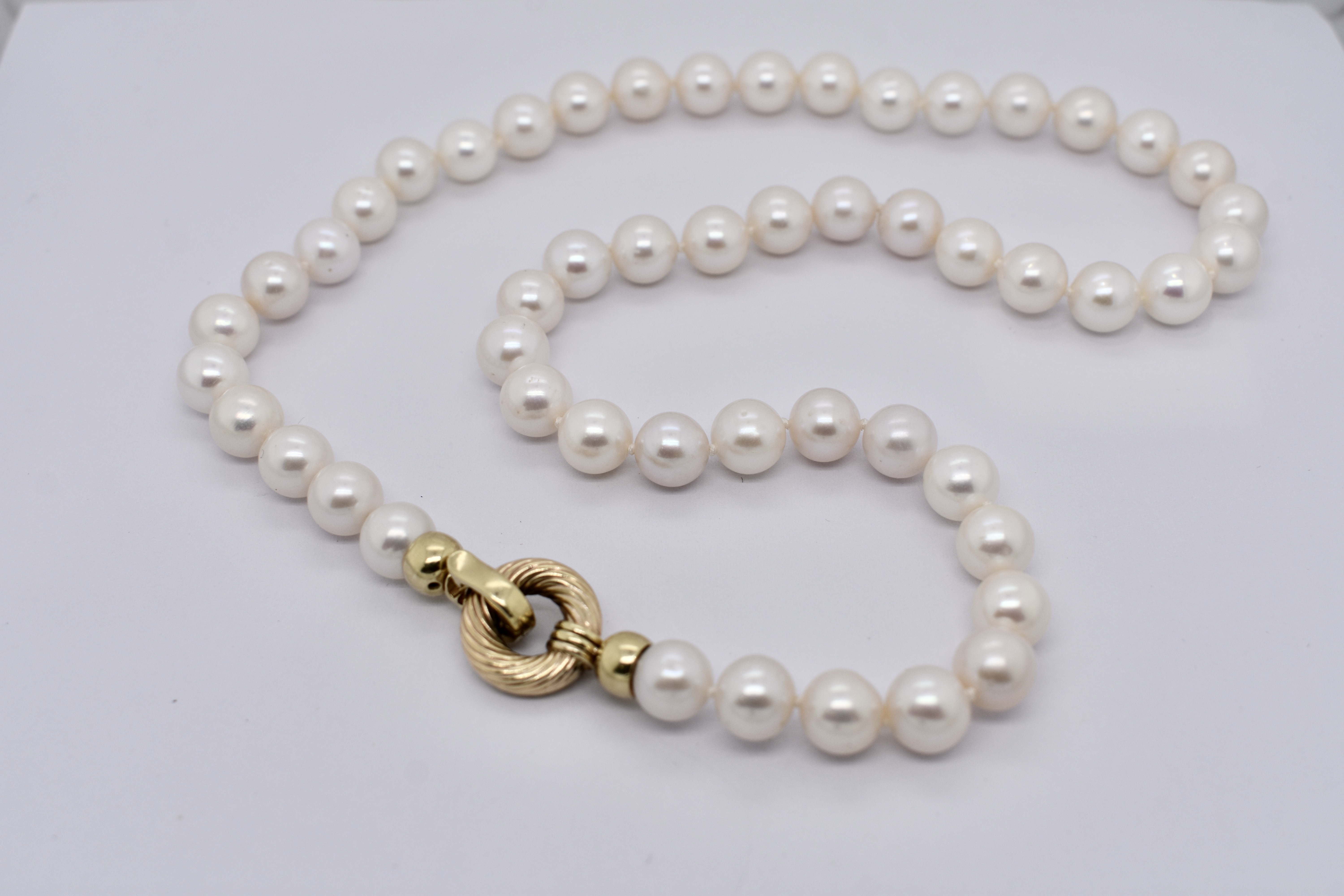 Beautiful strand of 8-8.5mm white freshwater pearls, knotted, measuring 46cm long. Completed with a 9ct yellow gold grooved loop and clip clasp.