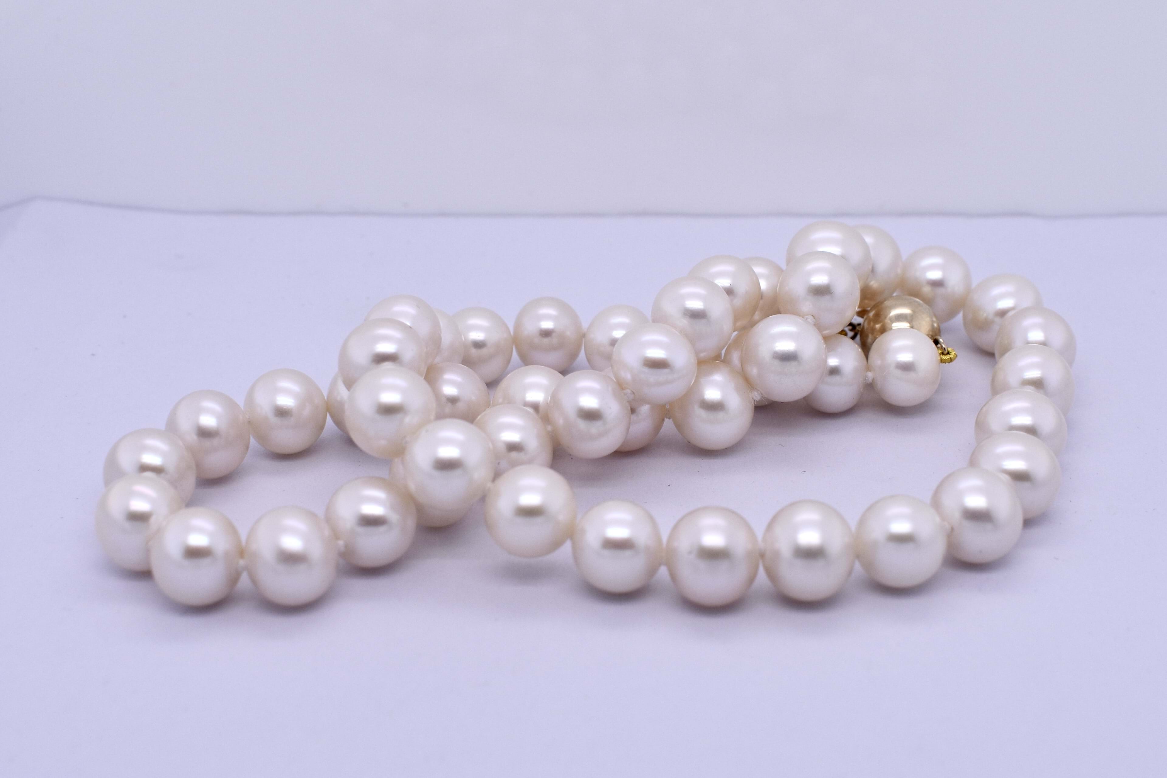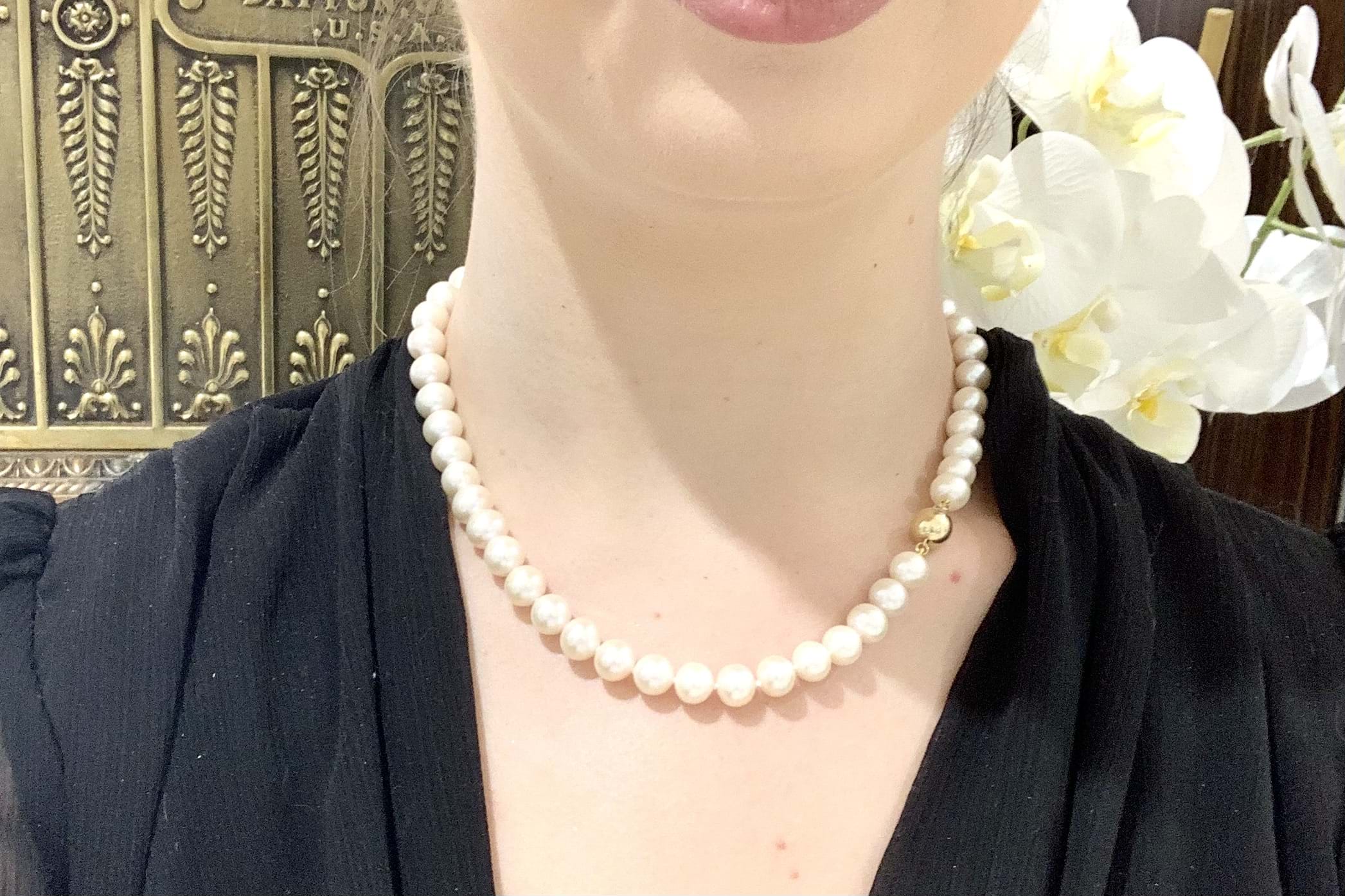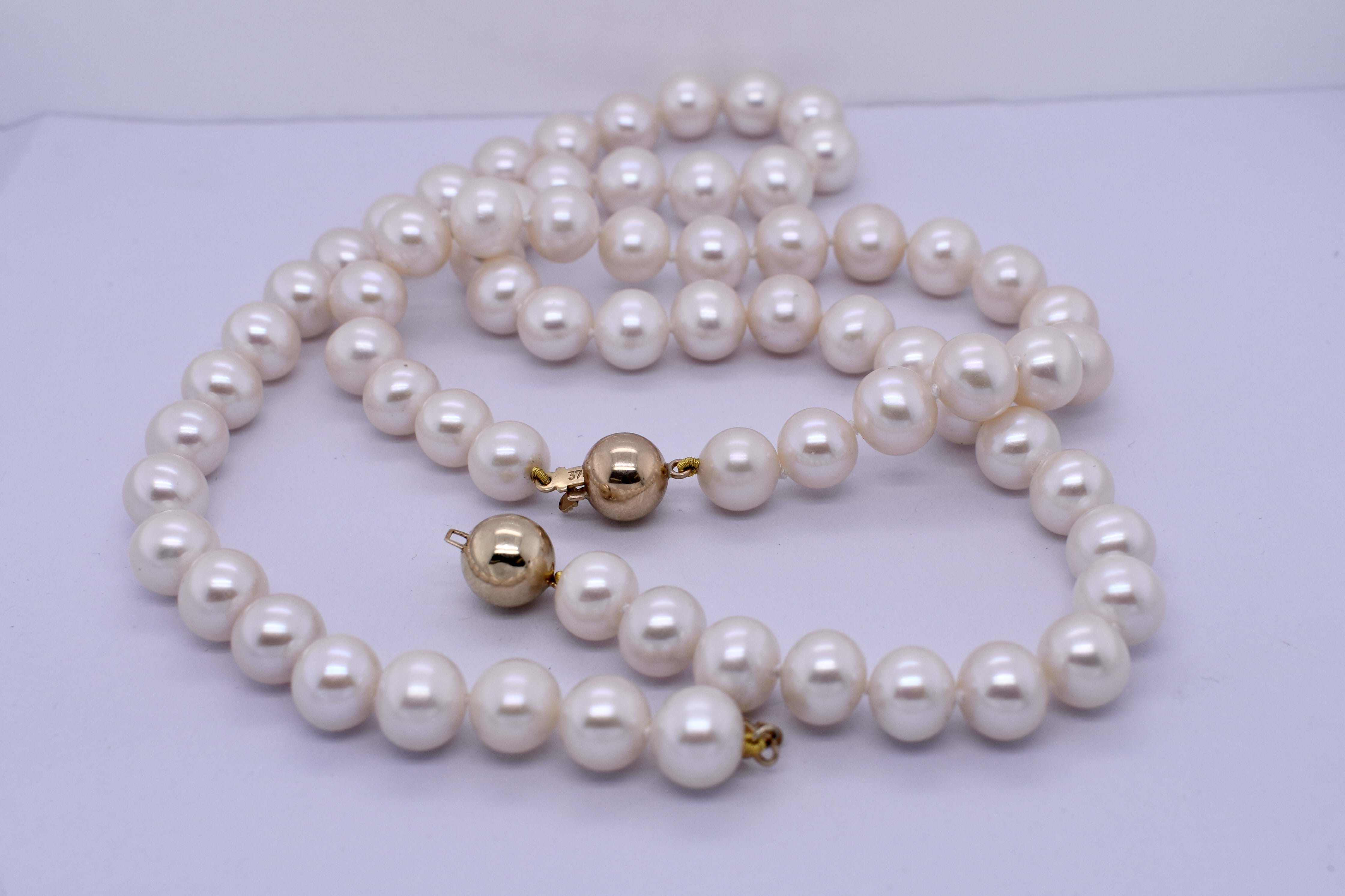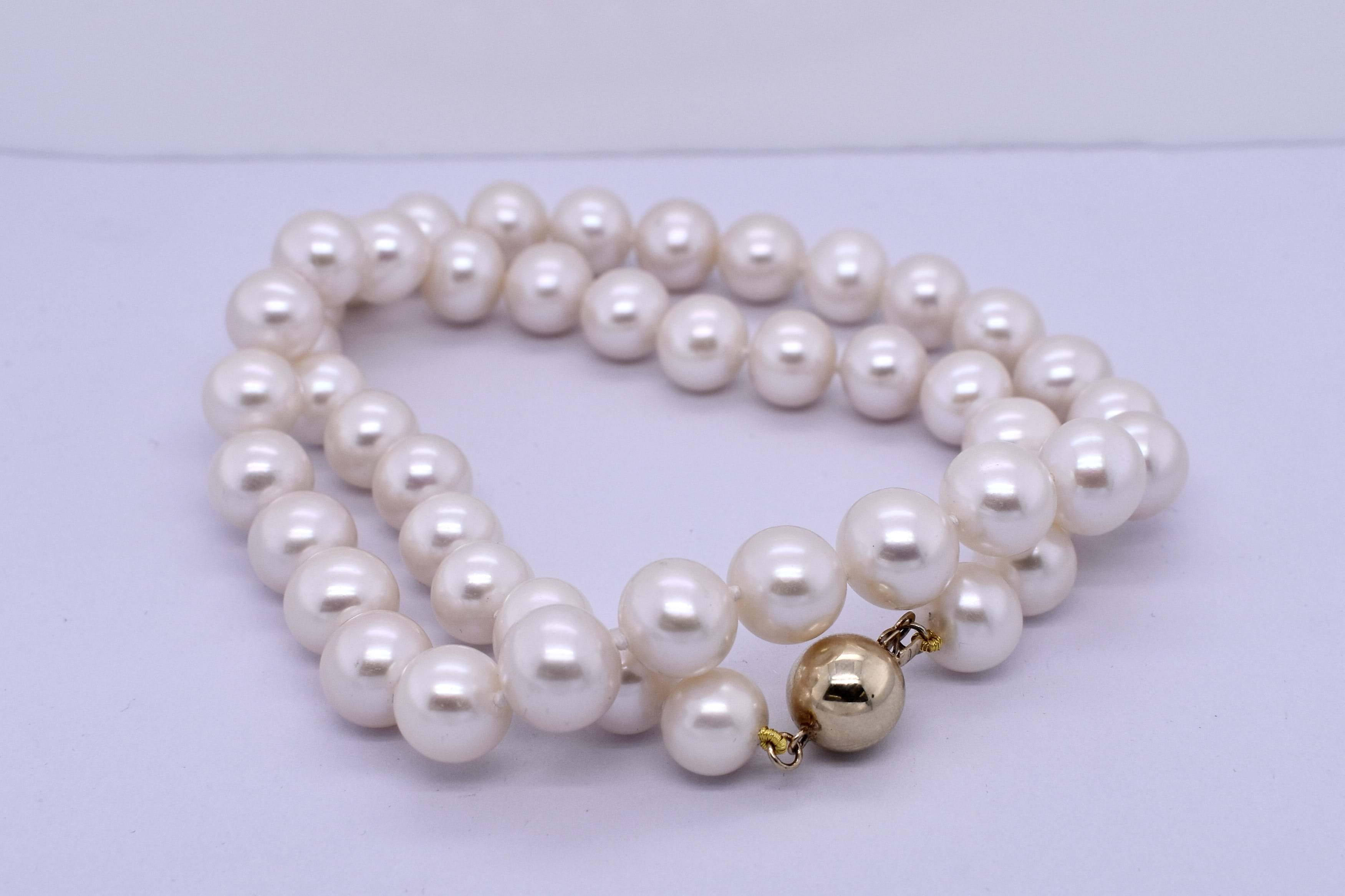 This lovely strand of white near round freshwater pearls measuring 9-9.5mm has been hand strung on silk with 9ct yellow gold ball clasp. Length is 45cm.