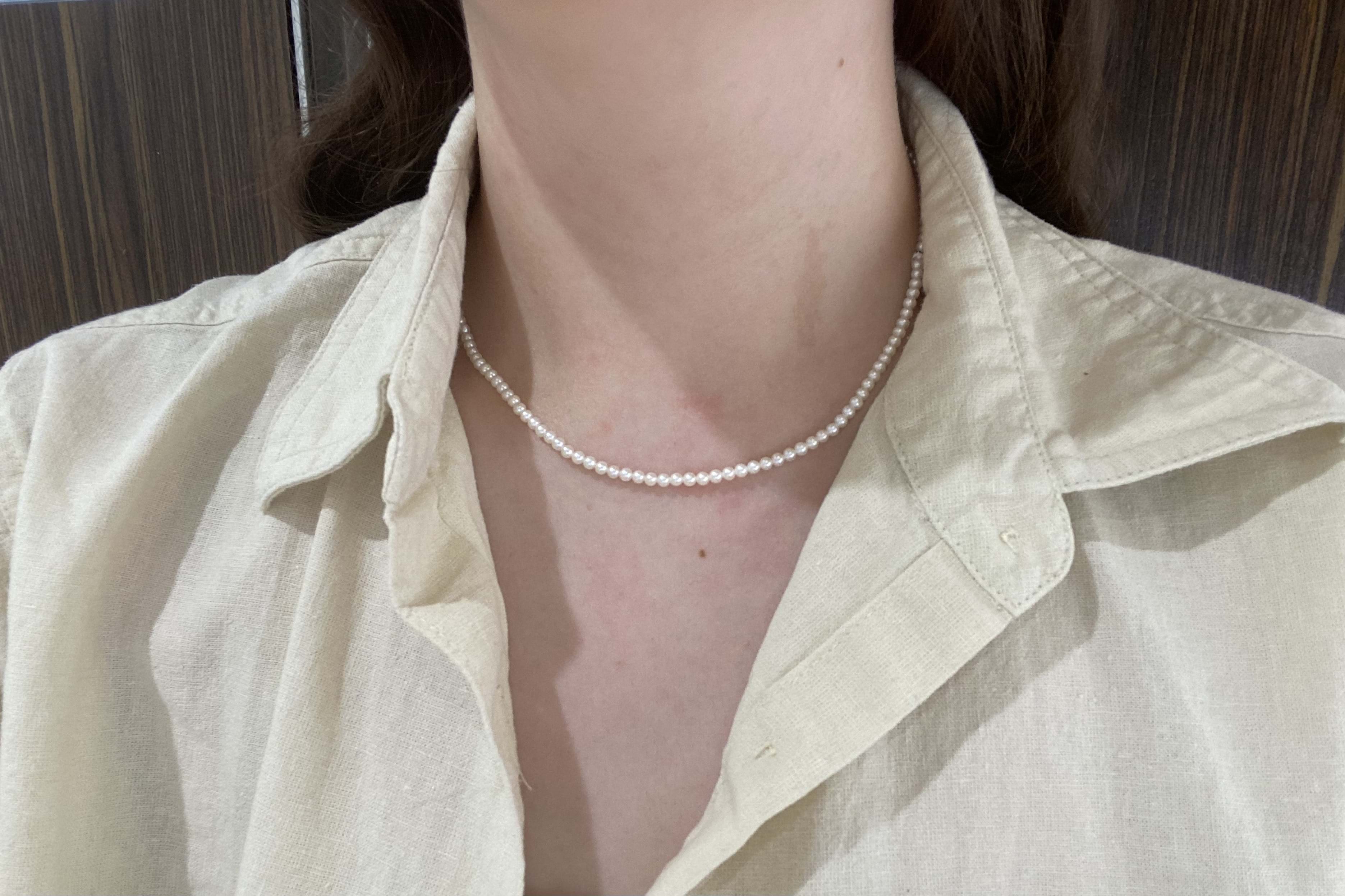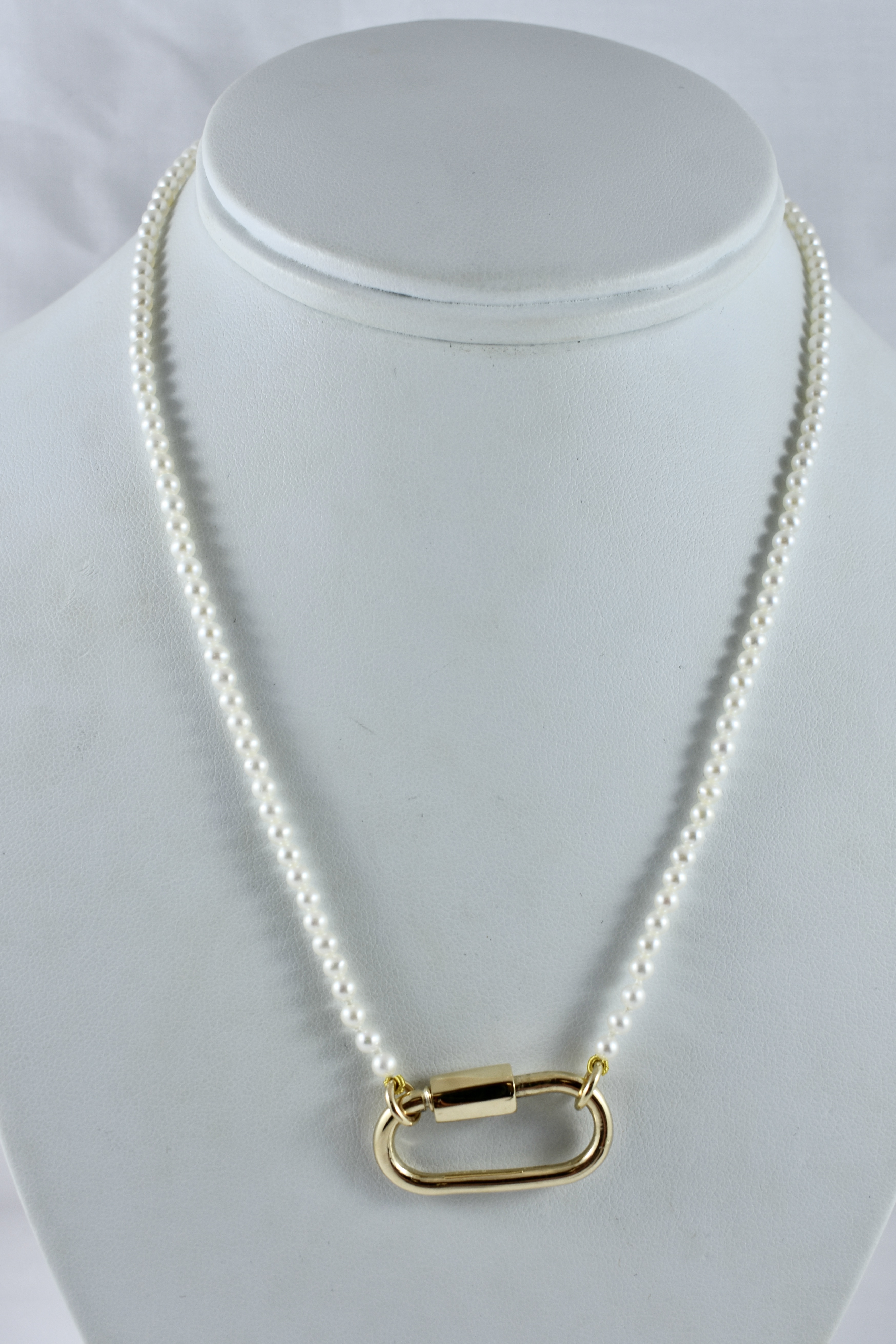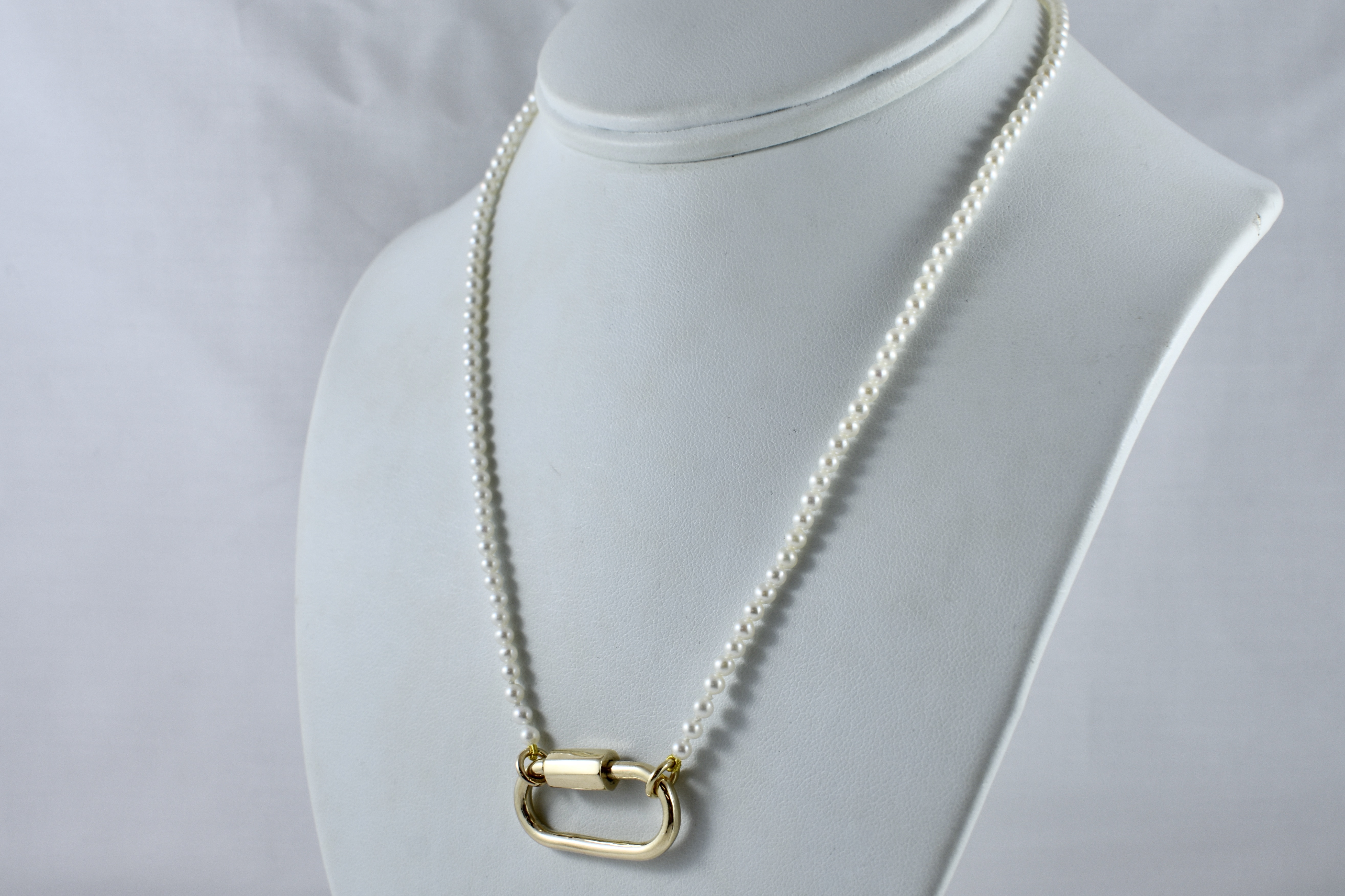 A pretty strand of white Freshwater pearls with good lustre, measuring 3-3.5mm semi-round. The pearls have been hand strung on silk with two 9ct yellow gold jump ring ends. Strand length 41cm. These ends allow for a wide range of styling versatility, including various brooches, enhancers or carabiners (as pictured). Carabiner available for separate purchase (20359102).