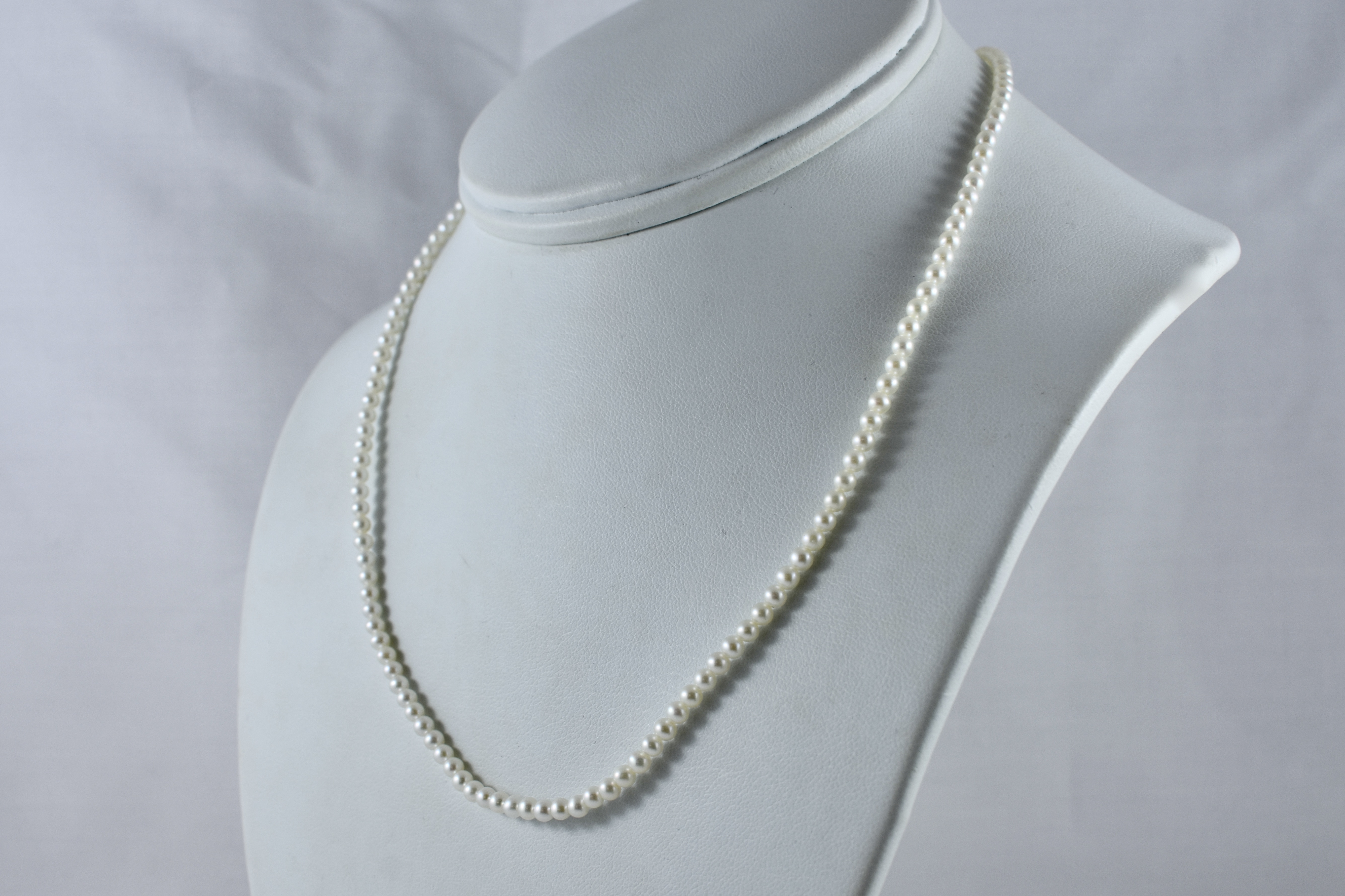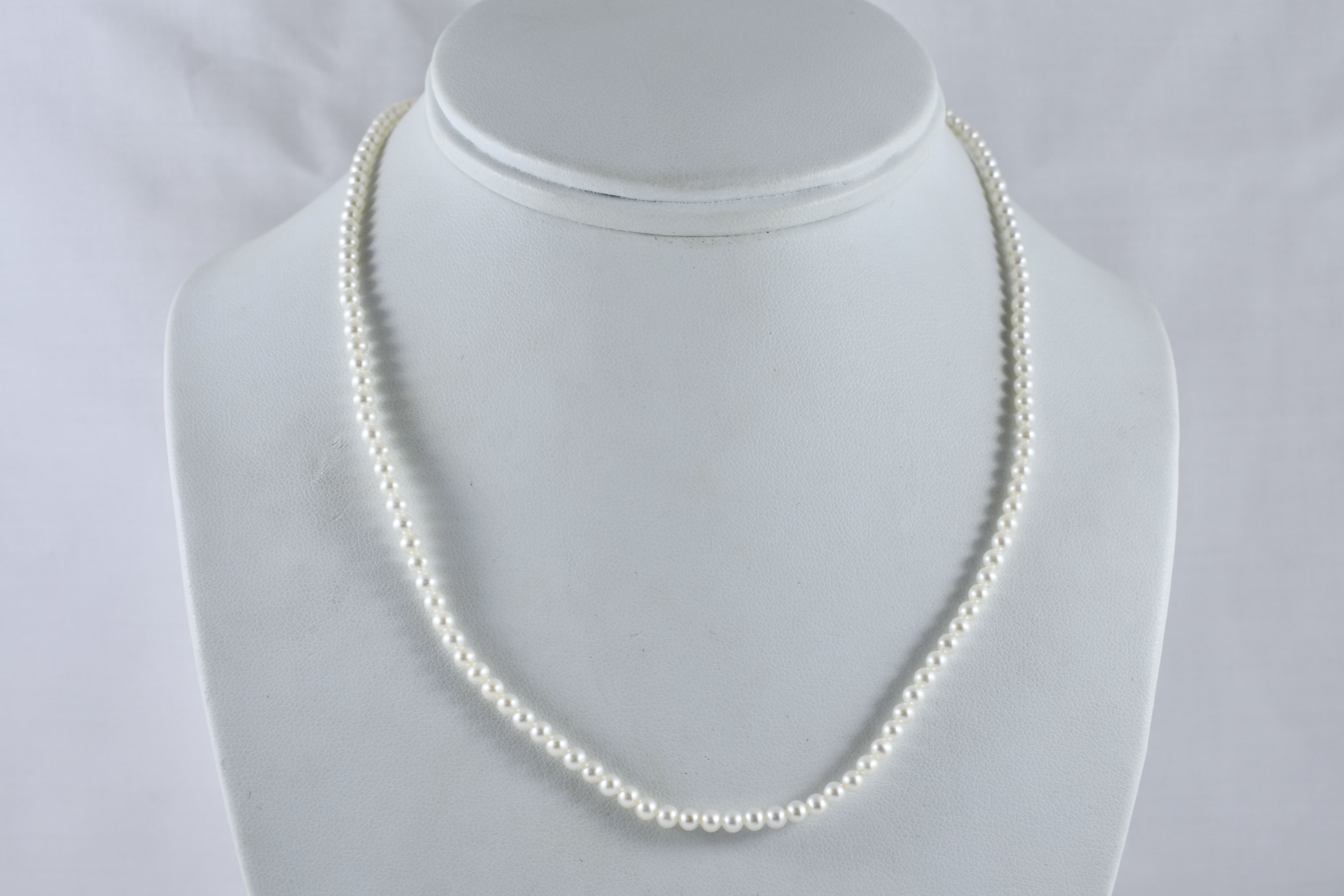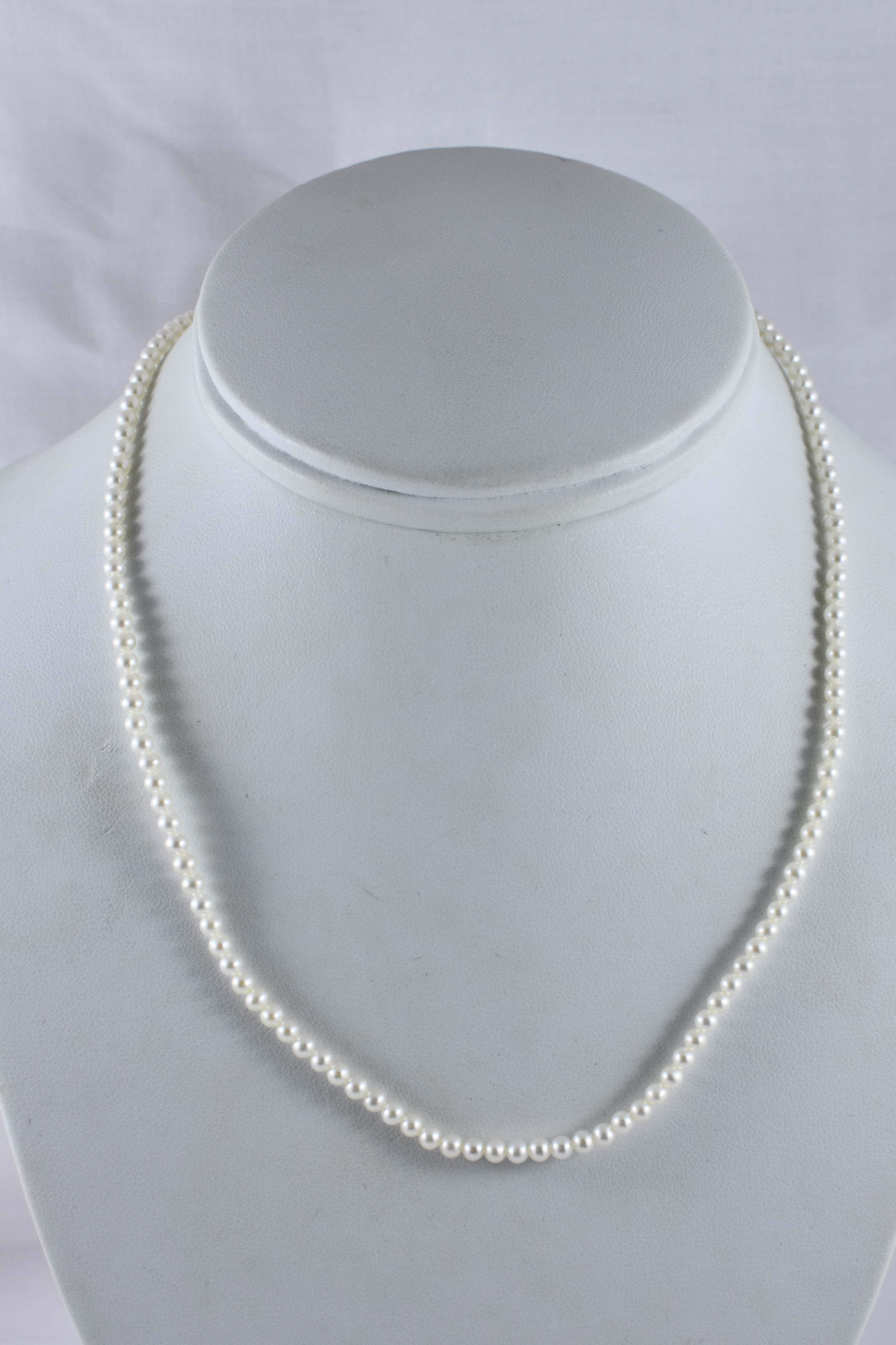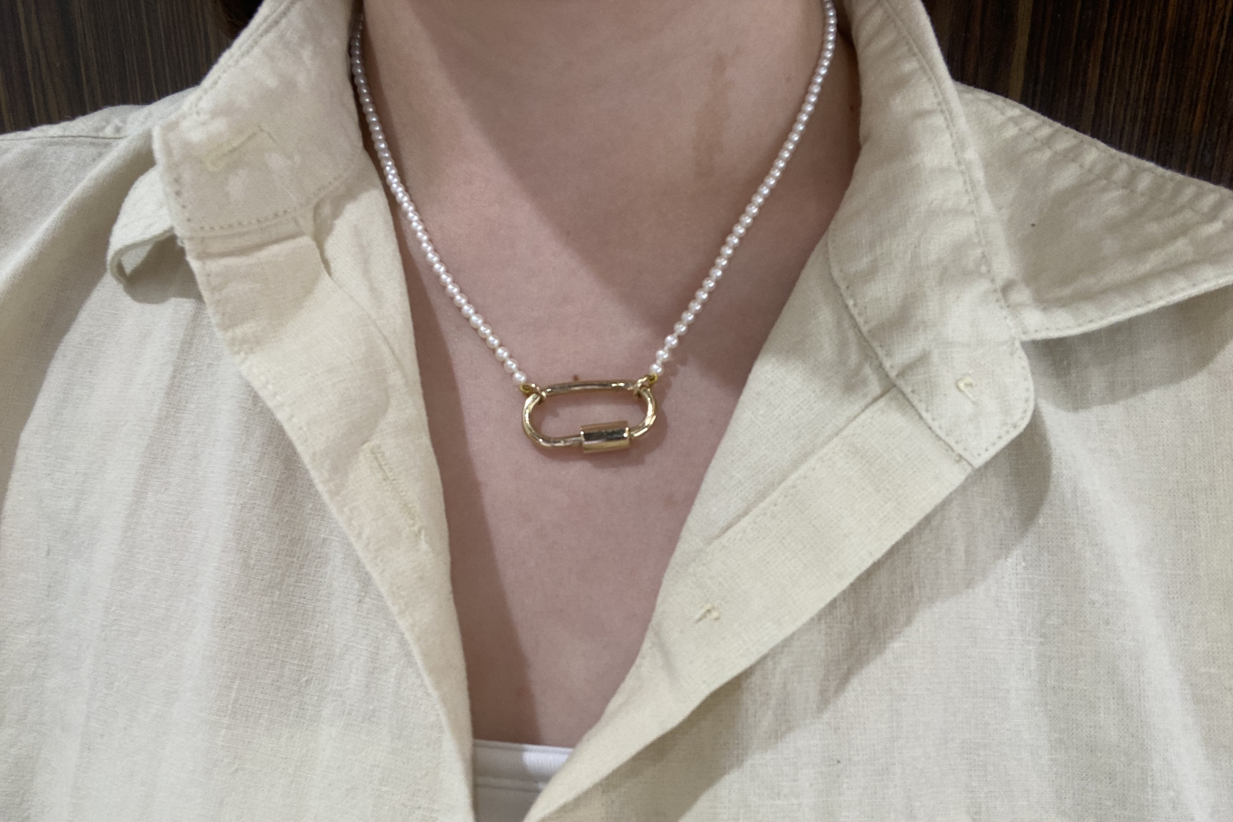 A pretty strand of white Freshwater pearls with good lustre, measuring 3-3.5mm semi-round. The pearls have been hand strung on silk with two 9ct yellow gold jump ring ends. Strand length 41cm. These ends allow for a wide range of styling versatility, including various brooches, enhancers or carabiners (as pictured). Carabiner available for separate purchase (20359102).