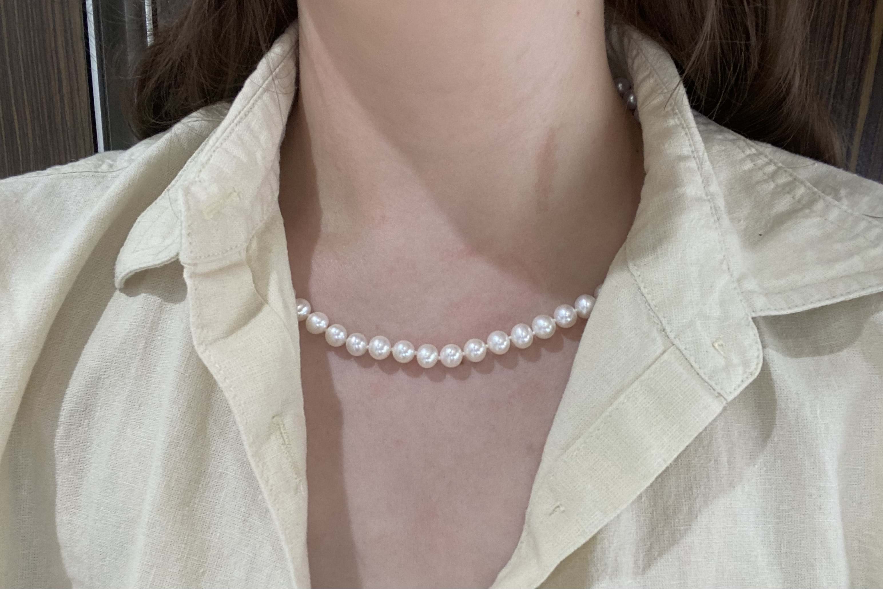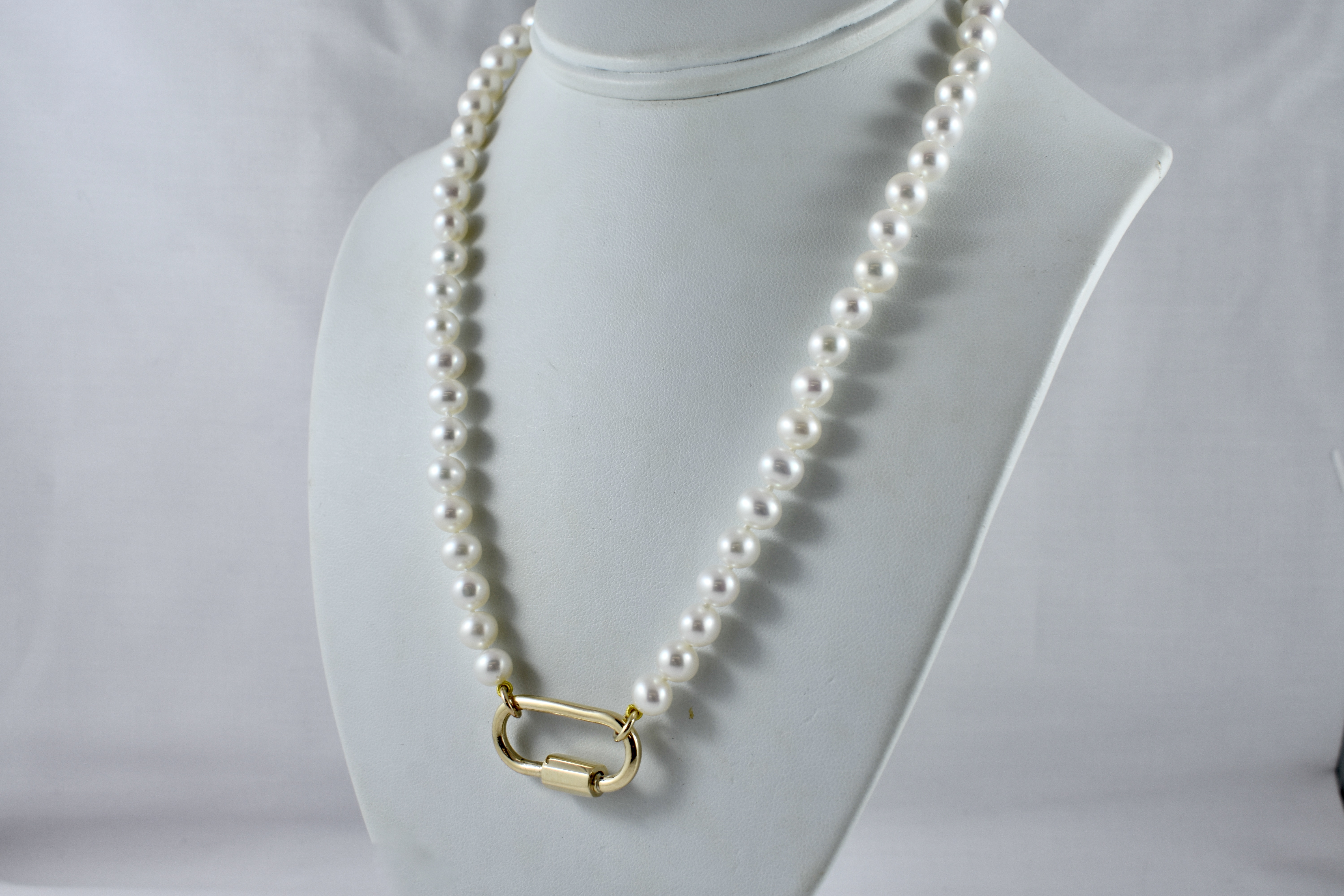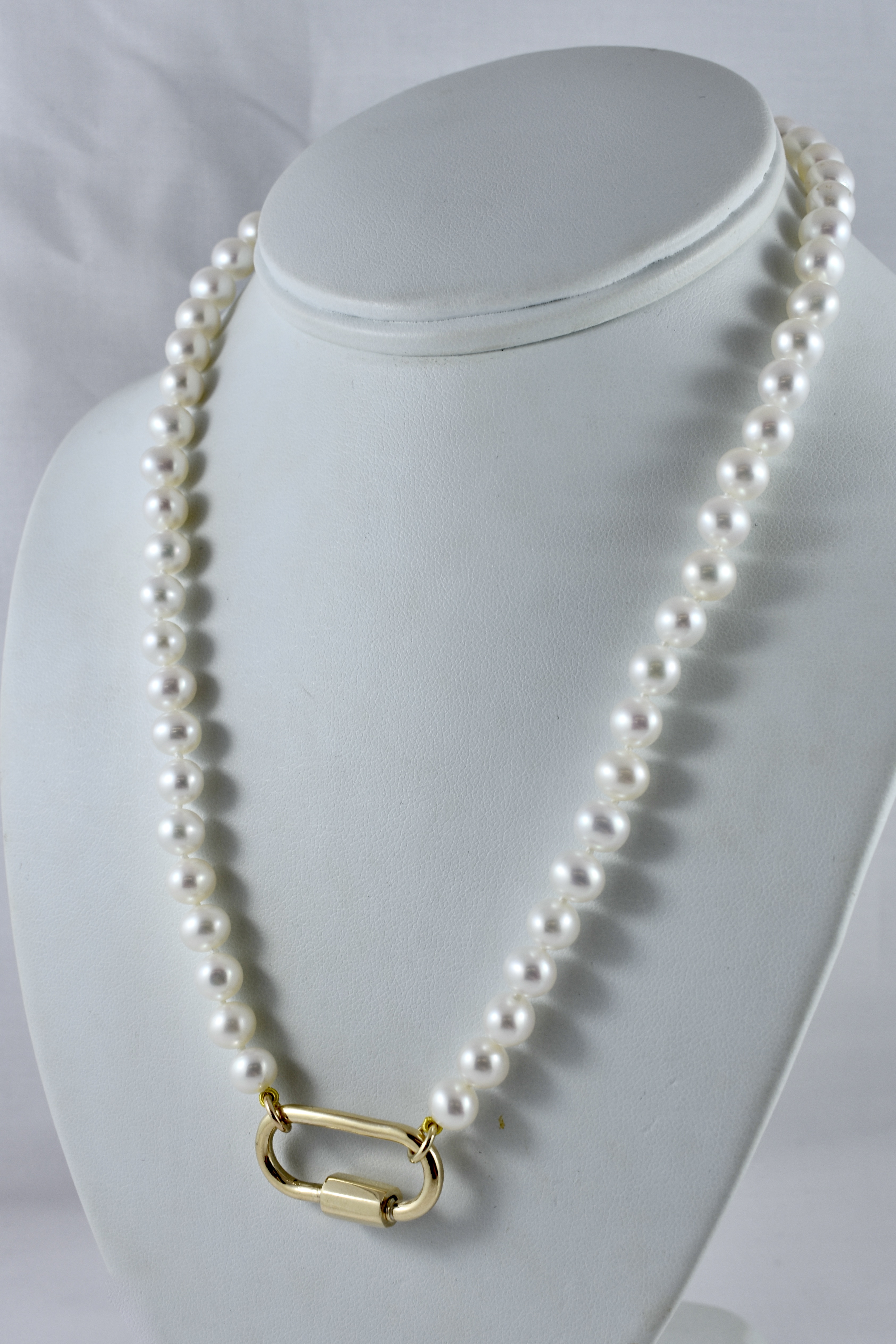 A pretty strand of white Freshwater pearls with good lustre, measuring 7-7.5mm semi-round. The pearls have been hand strung on silk with two 9ct yellow gold jump ring ends. Strand length 45cm. These ends allow for a wide range of styling versatility, including various brooches, enhancers or carabiners (as pictured). Carabiner available for separate purchase (20359102).