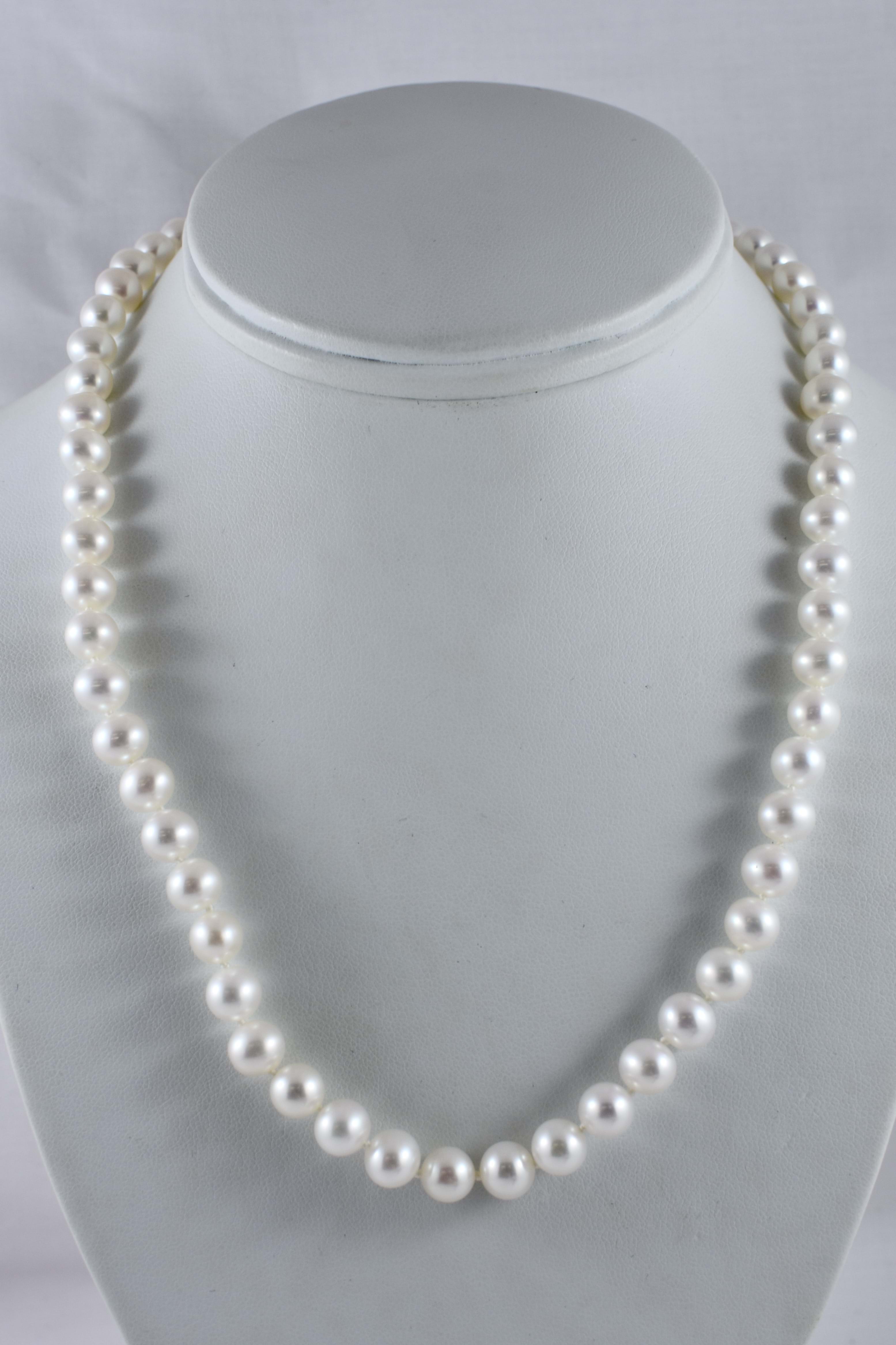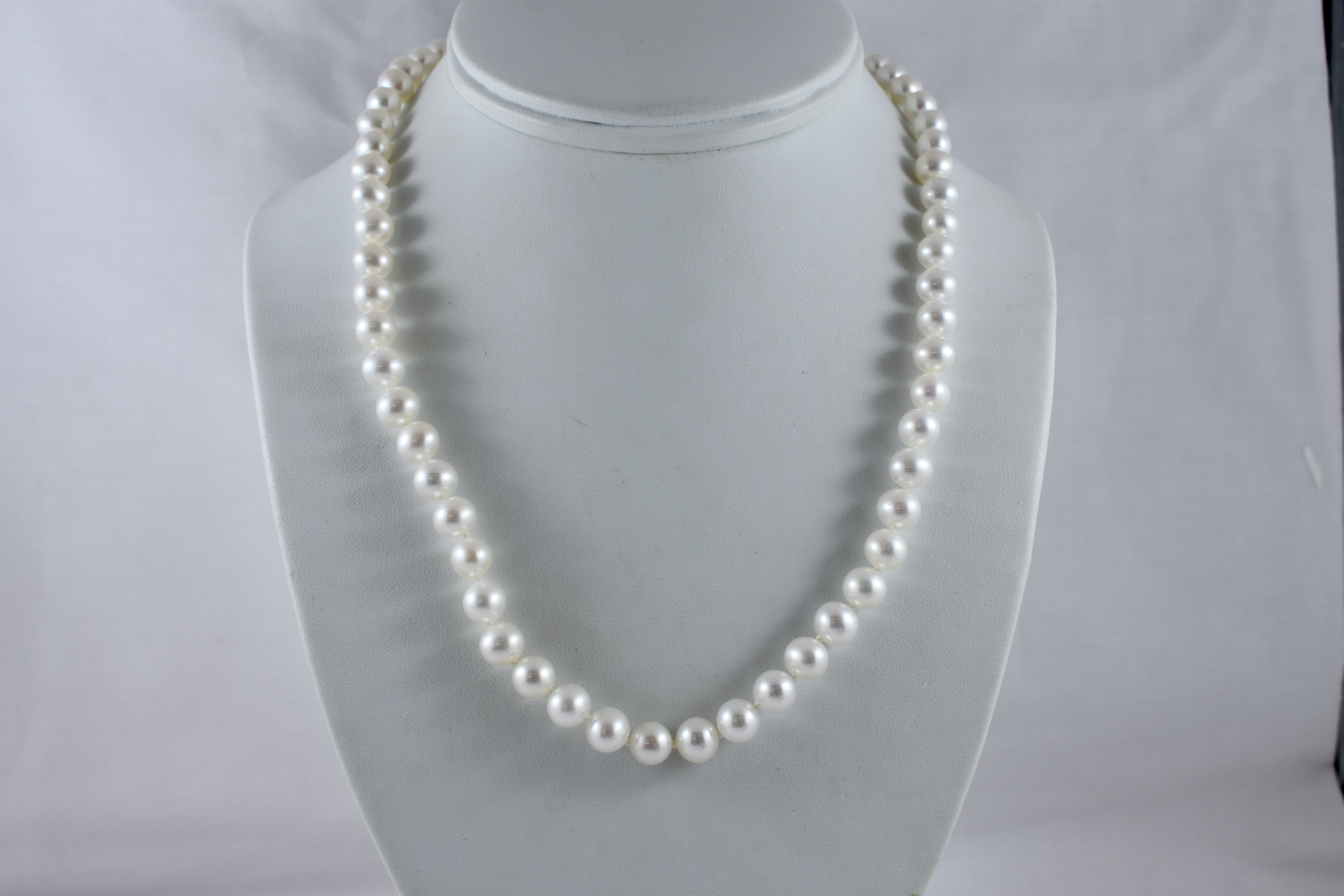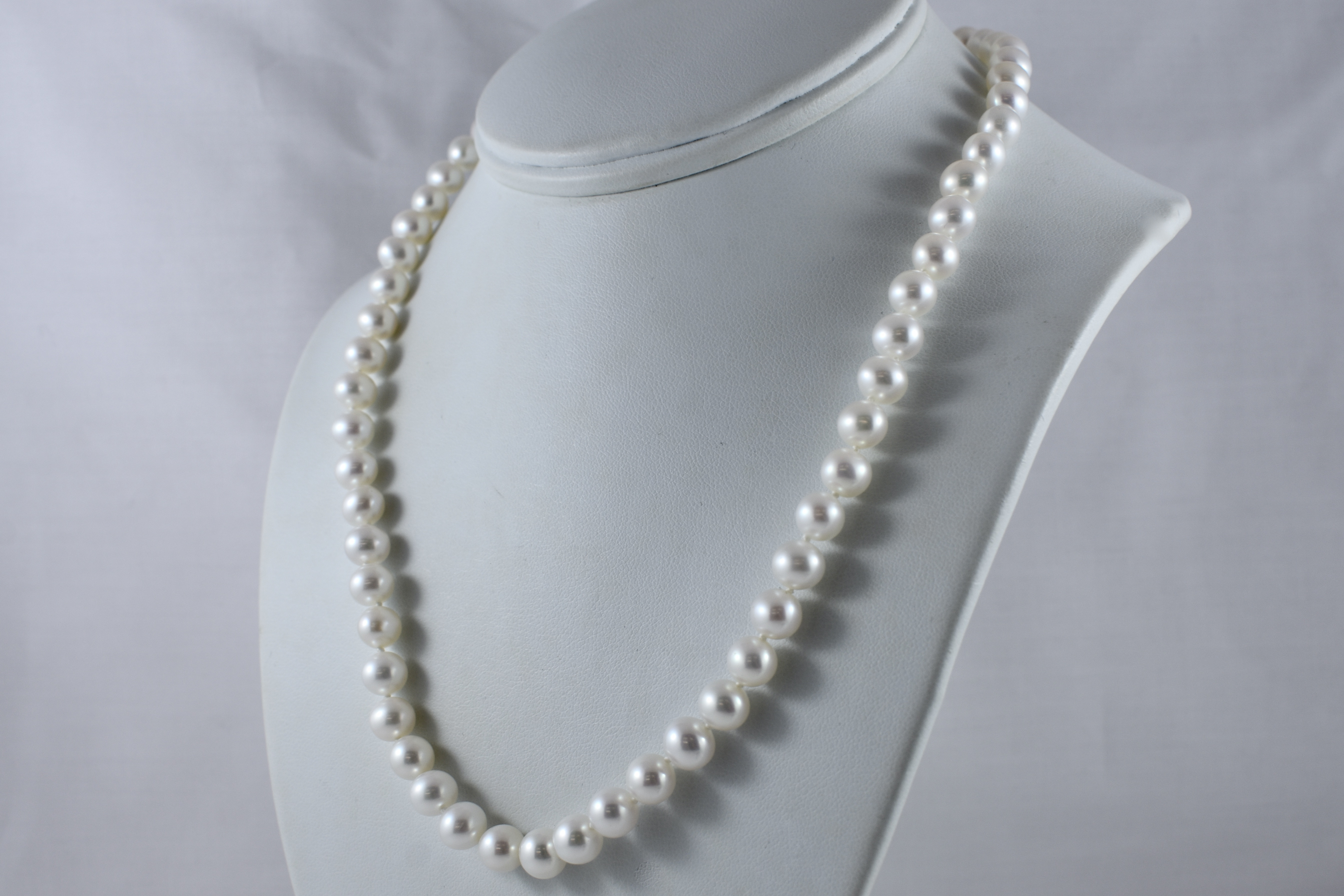 A pretty strand of white Freshwater pearls with good lustre, measuring 7-7.5mm semi-round. The pearls have been hand strung on silk with two 9ct yellow gold jump ring ends. Strand length 45cm. These ends allow for a wide range of styling versatility, including various brooches, enhancers or carabiners (as pictured). Carabiner available for separate purchase (20359102).