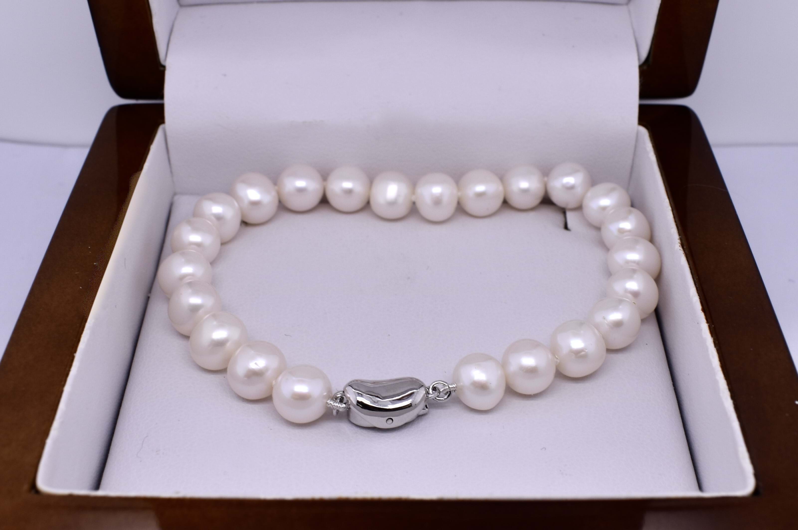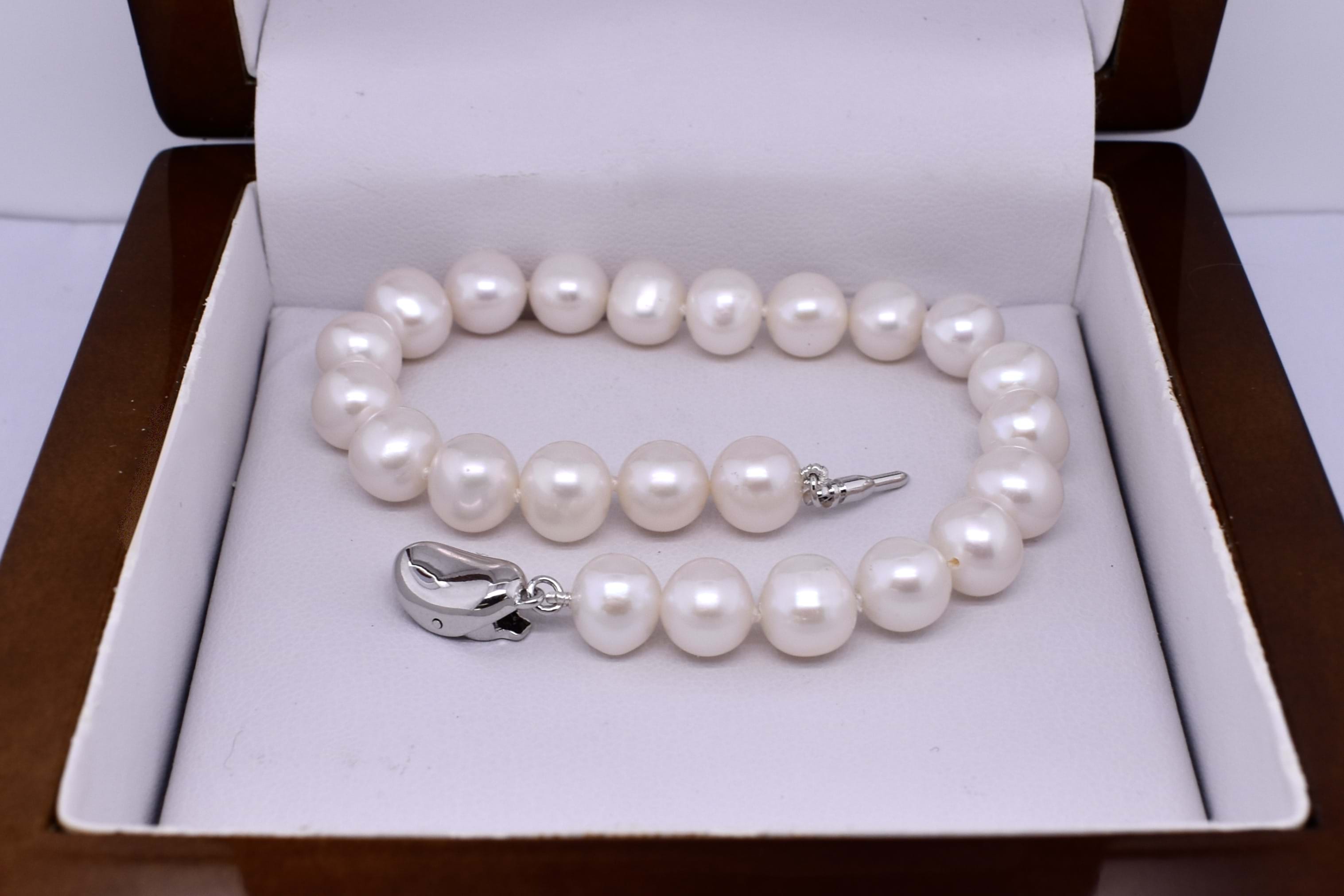 Amazing value! This pretty pearl bracelet, with 8-8.5mm near round white freshwater pearls with a good lustre, threaded and individually knotted on silk. Complete with a steel ''bean' shaped push button clasp. Bracelet is 19cm long. Matching strand available for separate purchase (20383879).