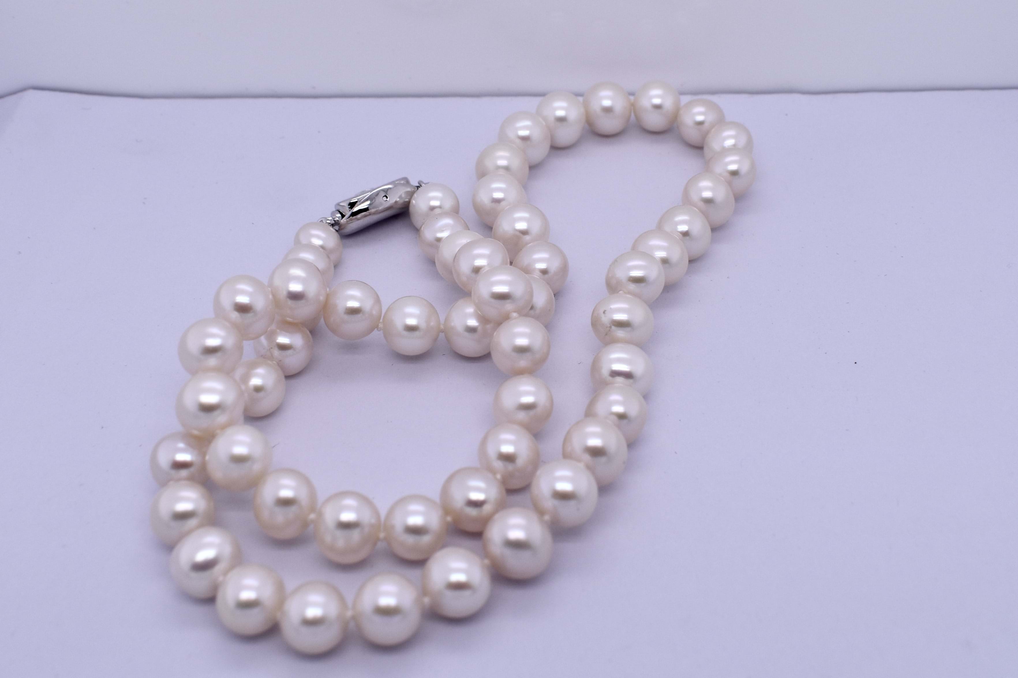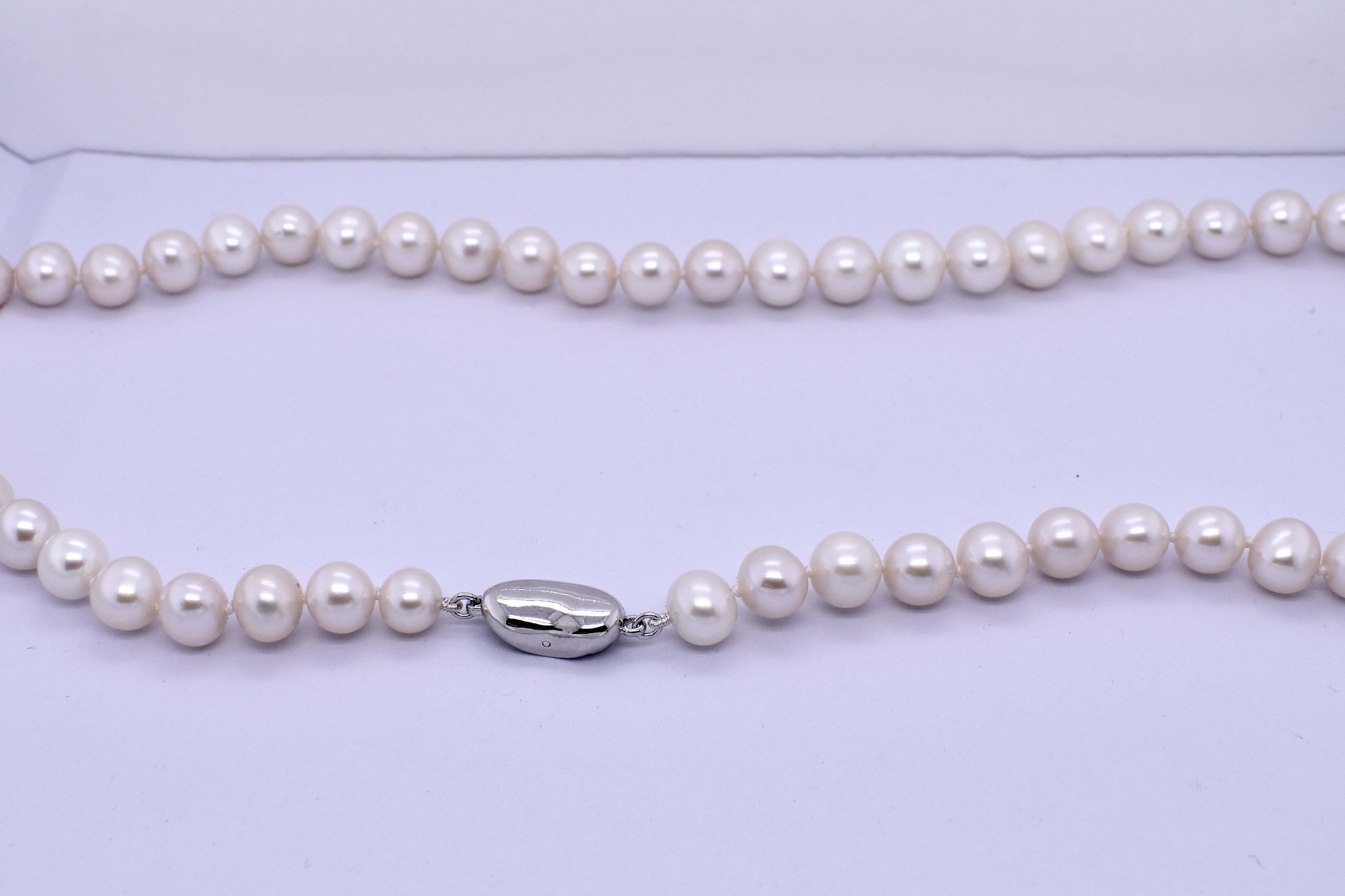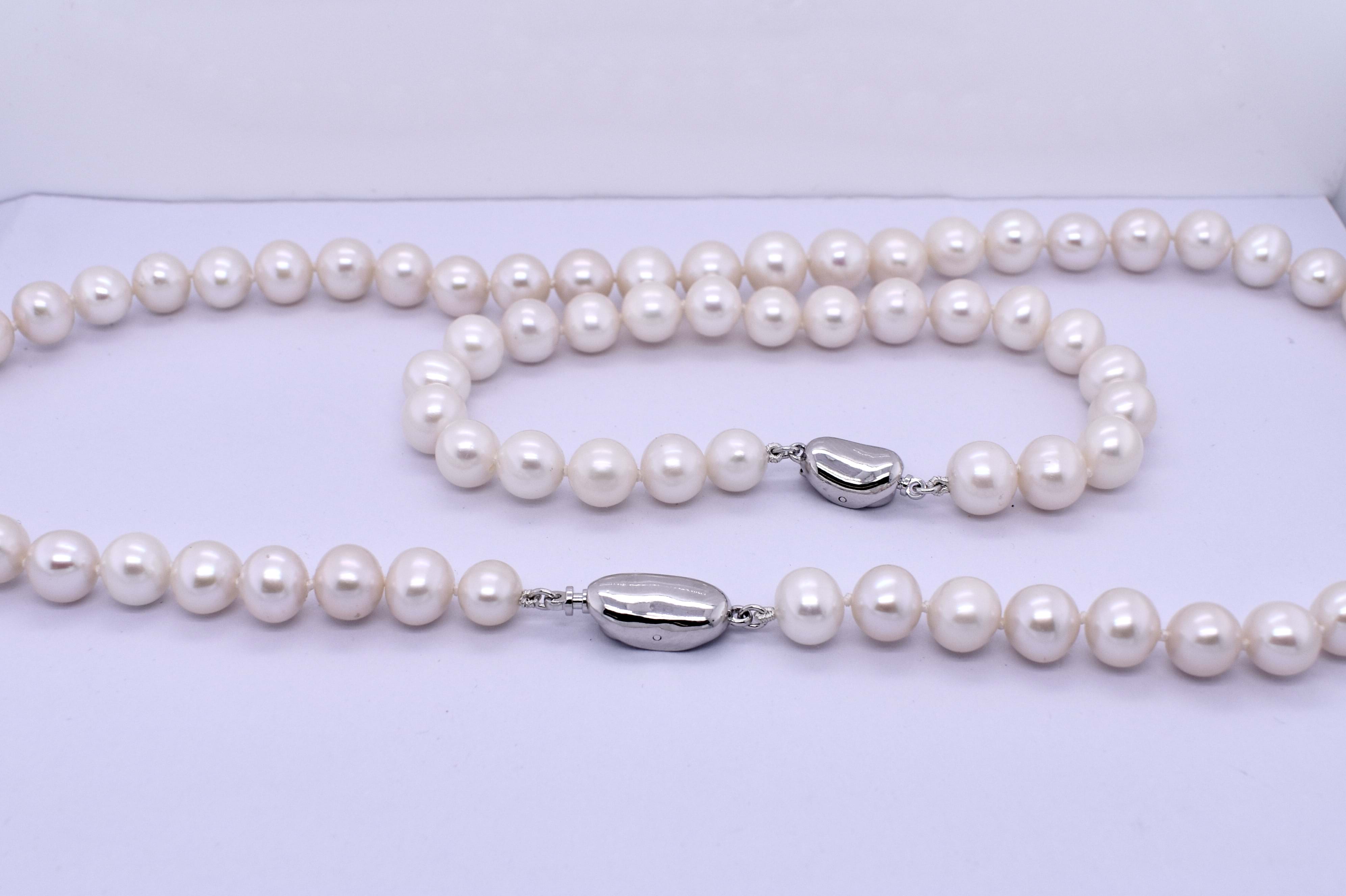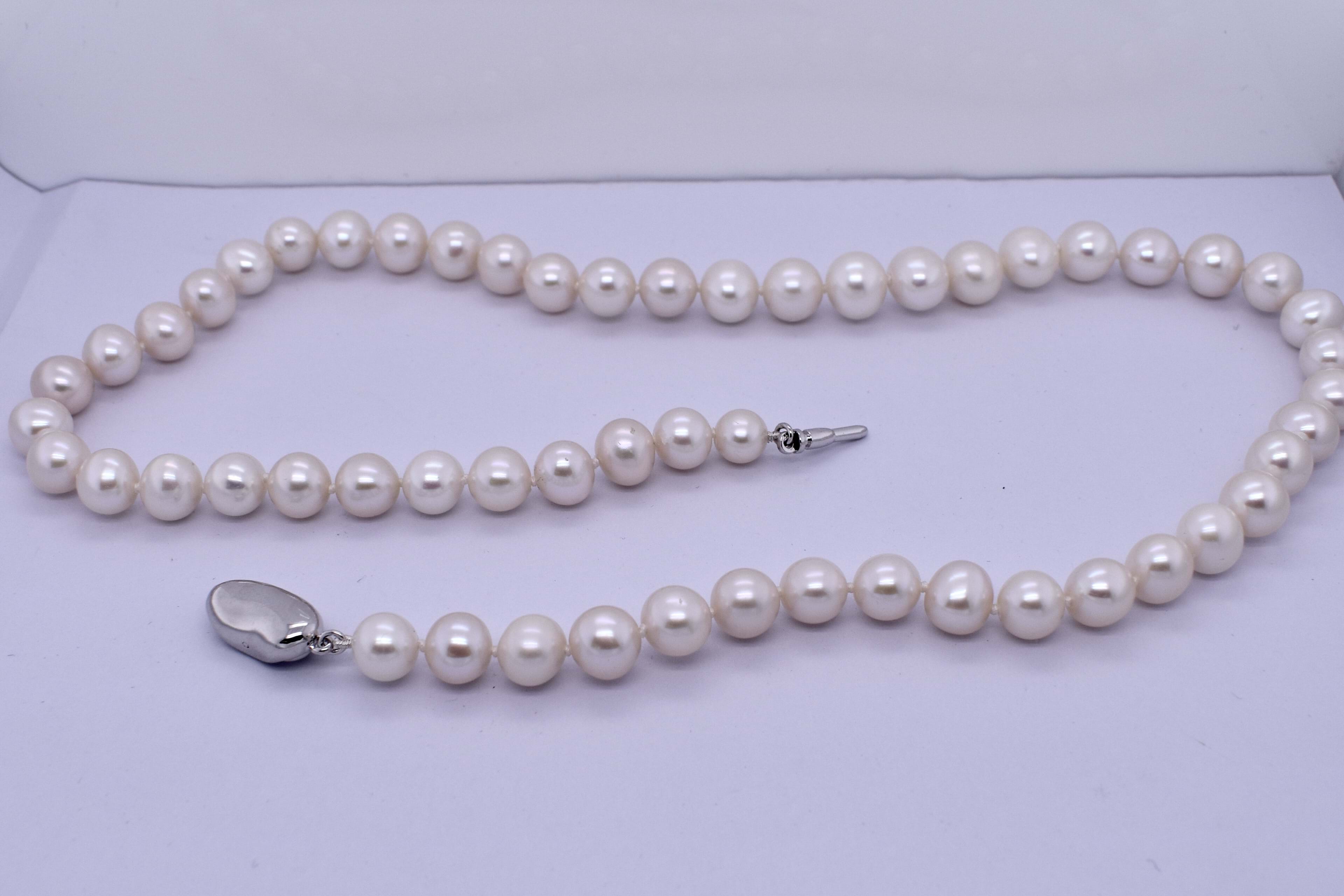 Amazing value! This pretty pearl strand, with 7.5-8.0mm near round white freshwater pearls with a good lustre, threaded and individually knotted on silk. Complete with a steel ''bean' shaped push button clasp. Length of 47cmm long. Matching bracelet available for separate purchase (20383886).