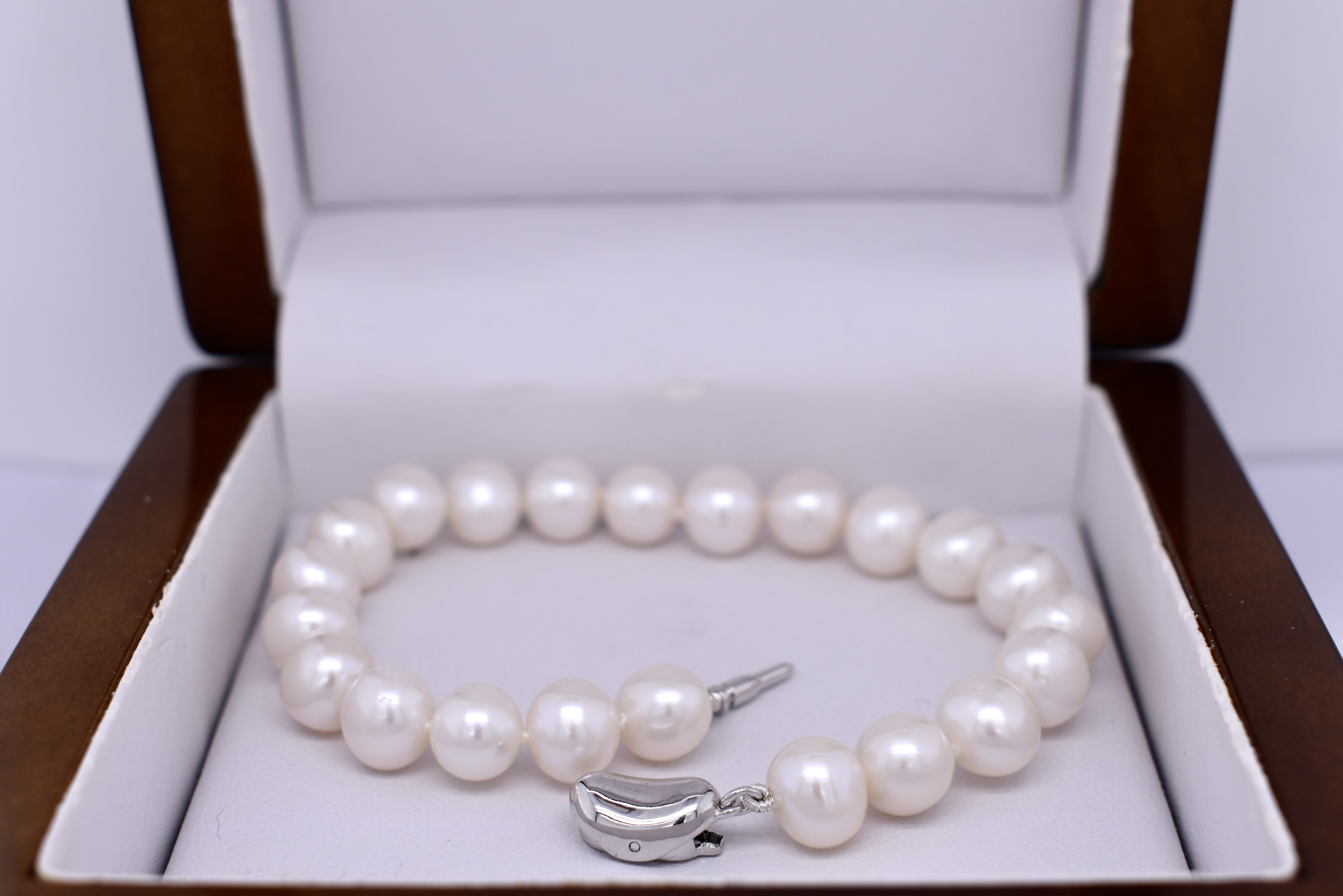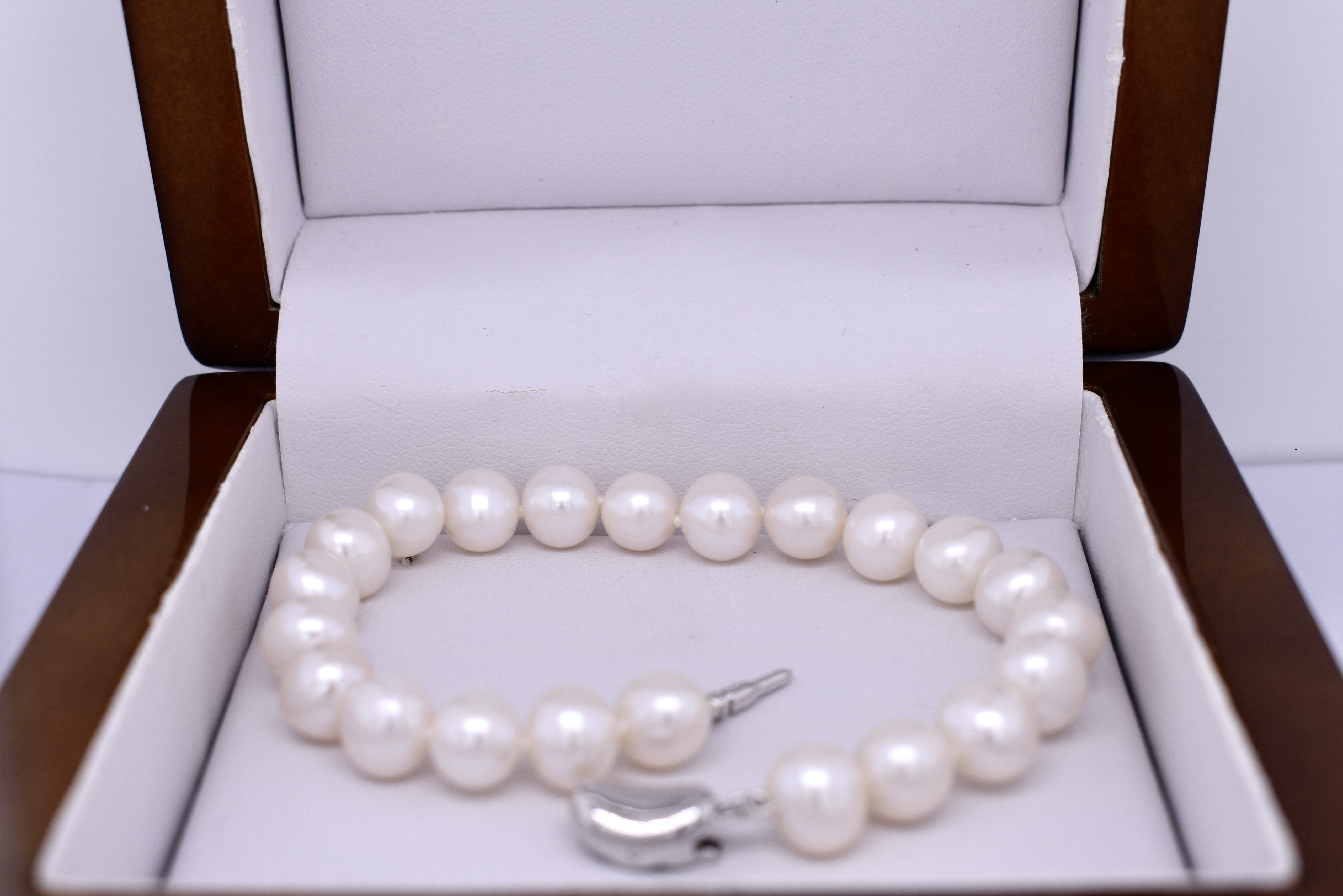 A classic pearl bracelet, with 8-8.5mm near round white freshwater pearls with a good lustre, threaded on silk with a steel ''bean' shaped push button clasp. Bracelet is 20cm long. Matching strand available for separate purchase (20383855).