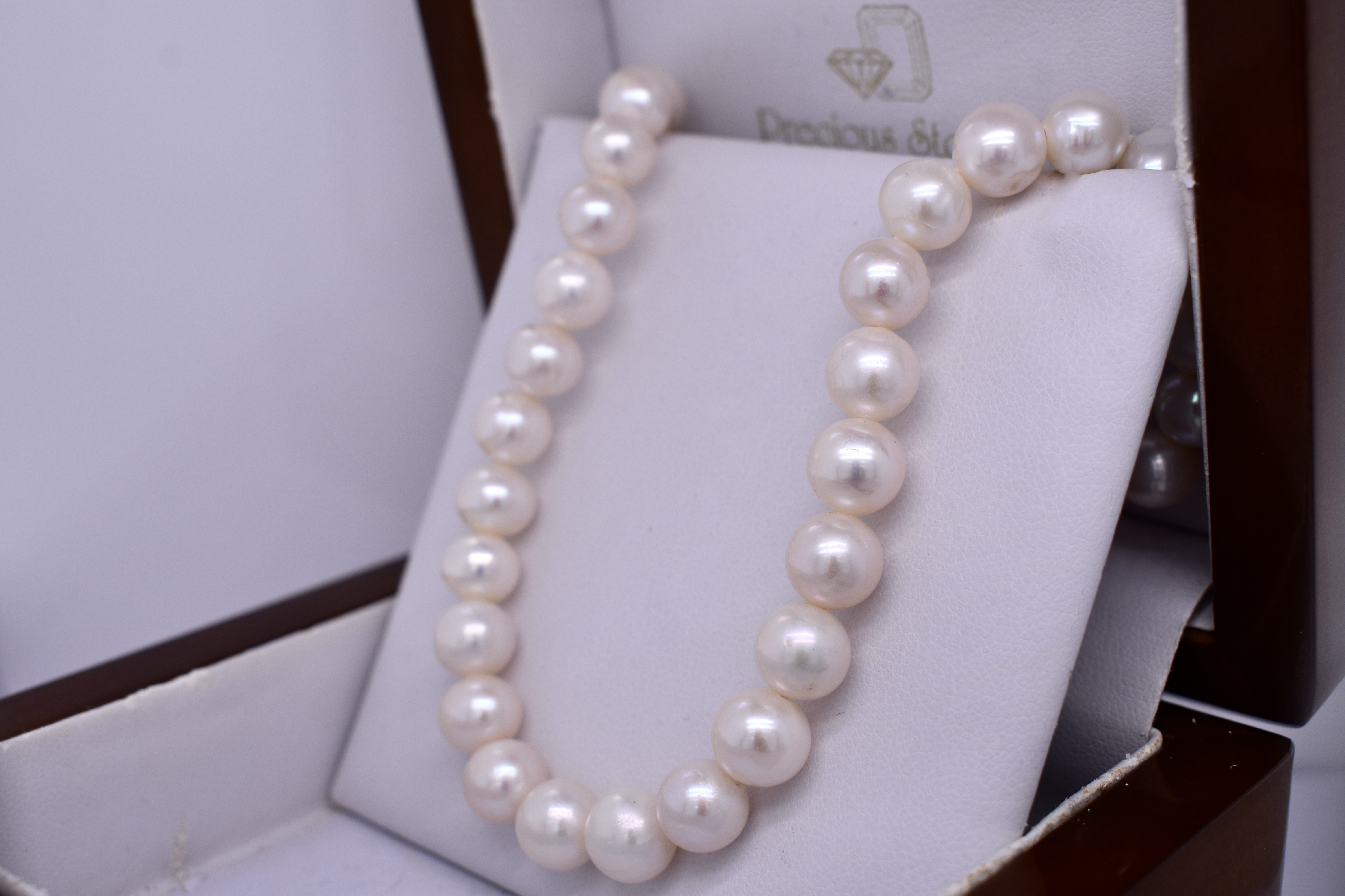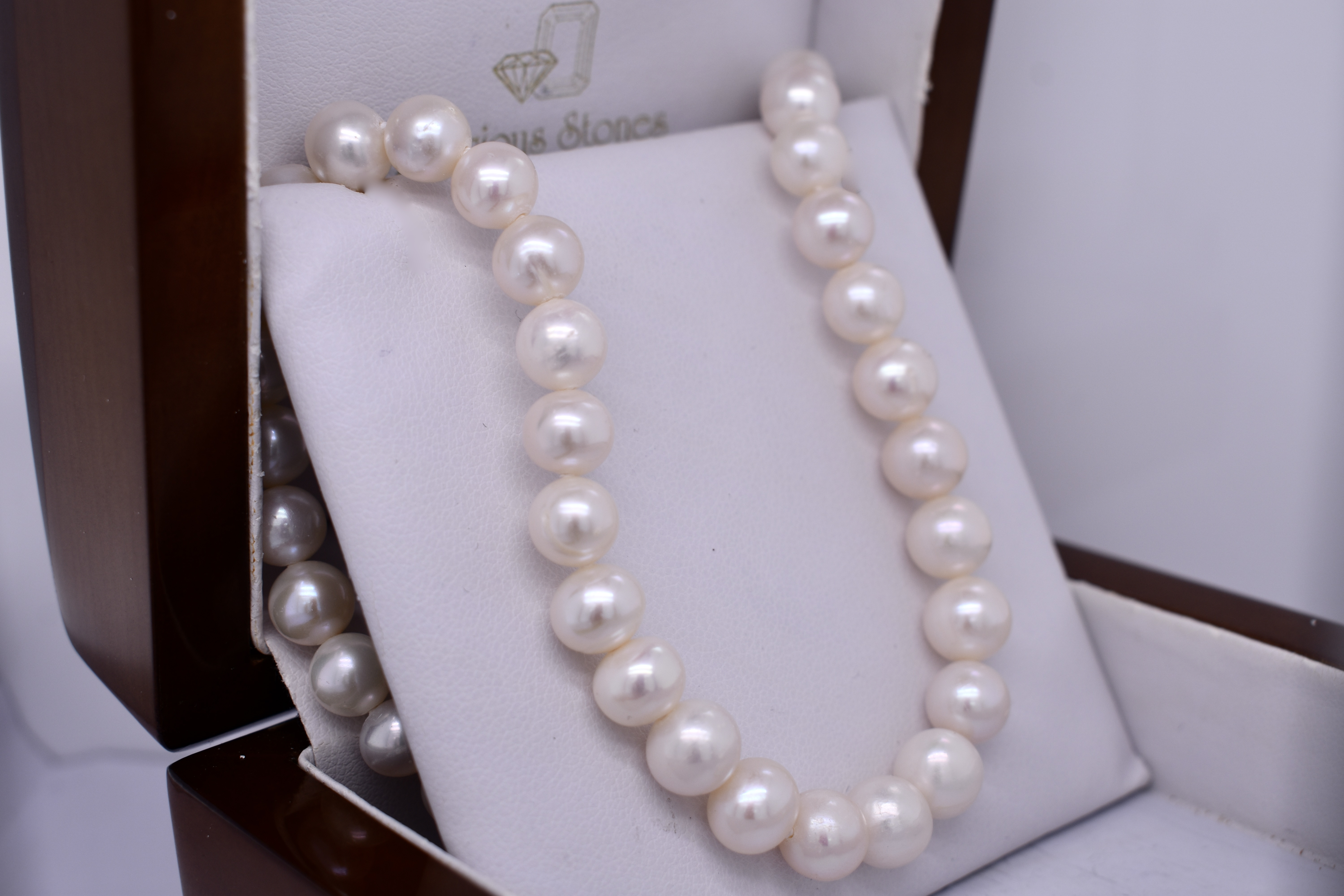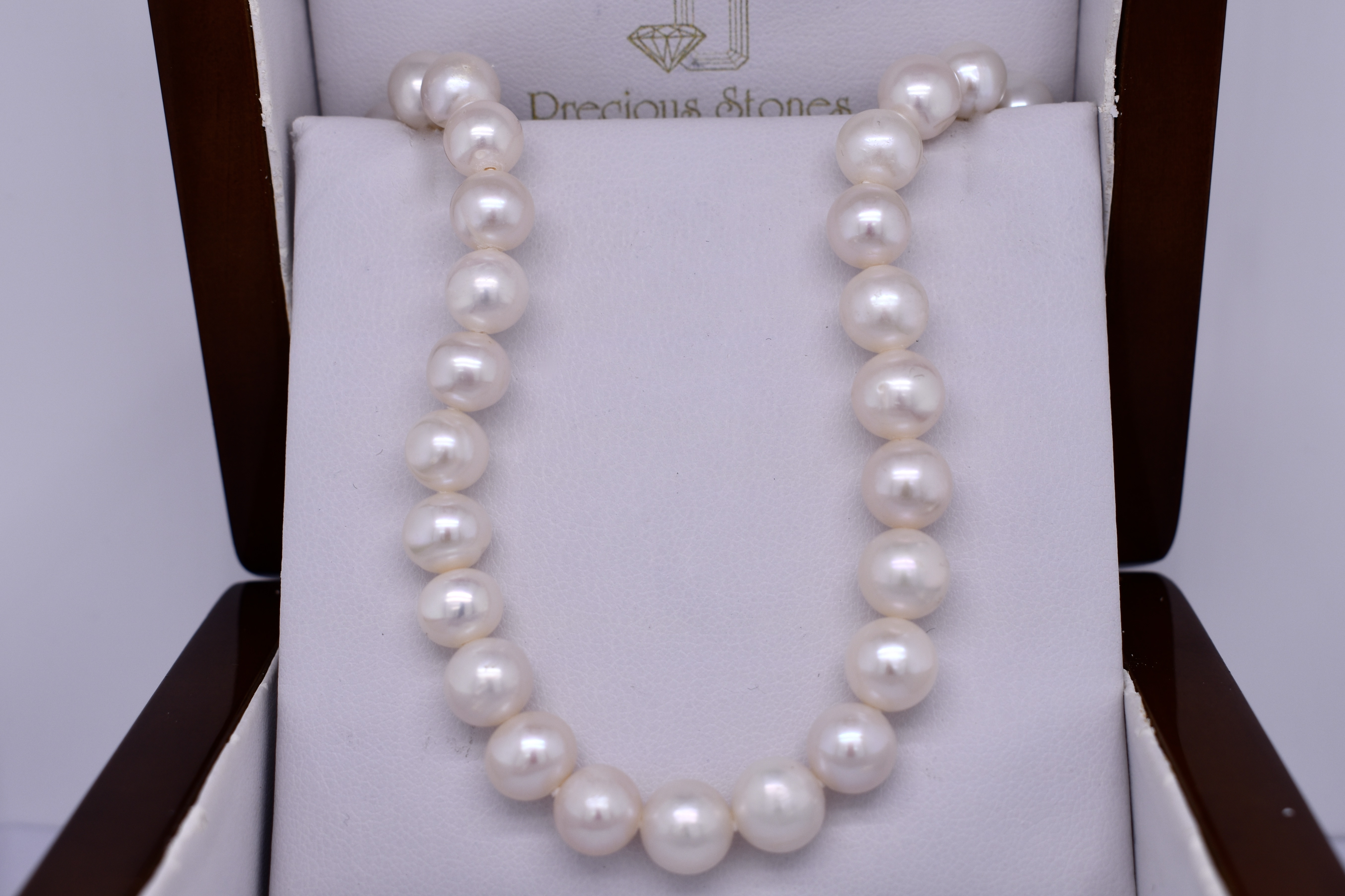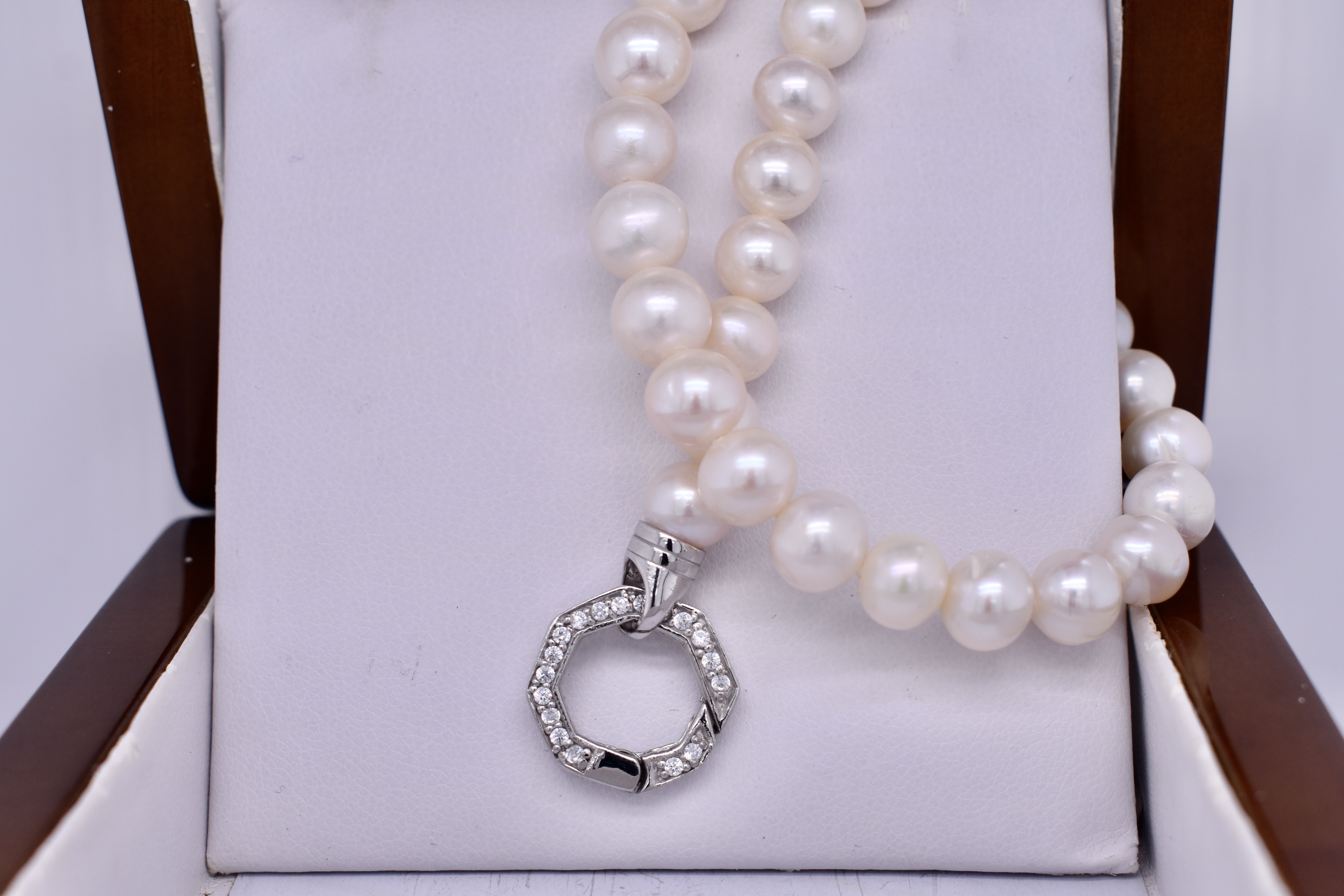Lovely strand of freshwater pearls measuring 45cm long consisting of 8mm near round white freshwater pearls. This strand is completed with sterling silver loop ends and a hexagon clasp studded with cubic zirconias.