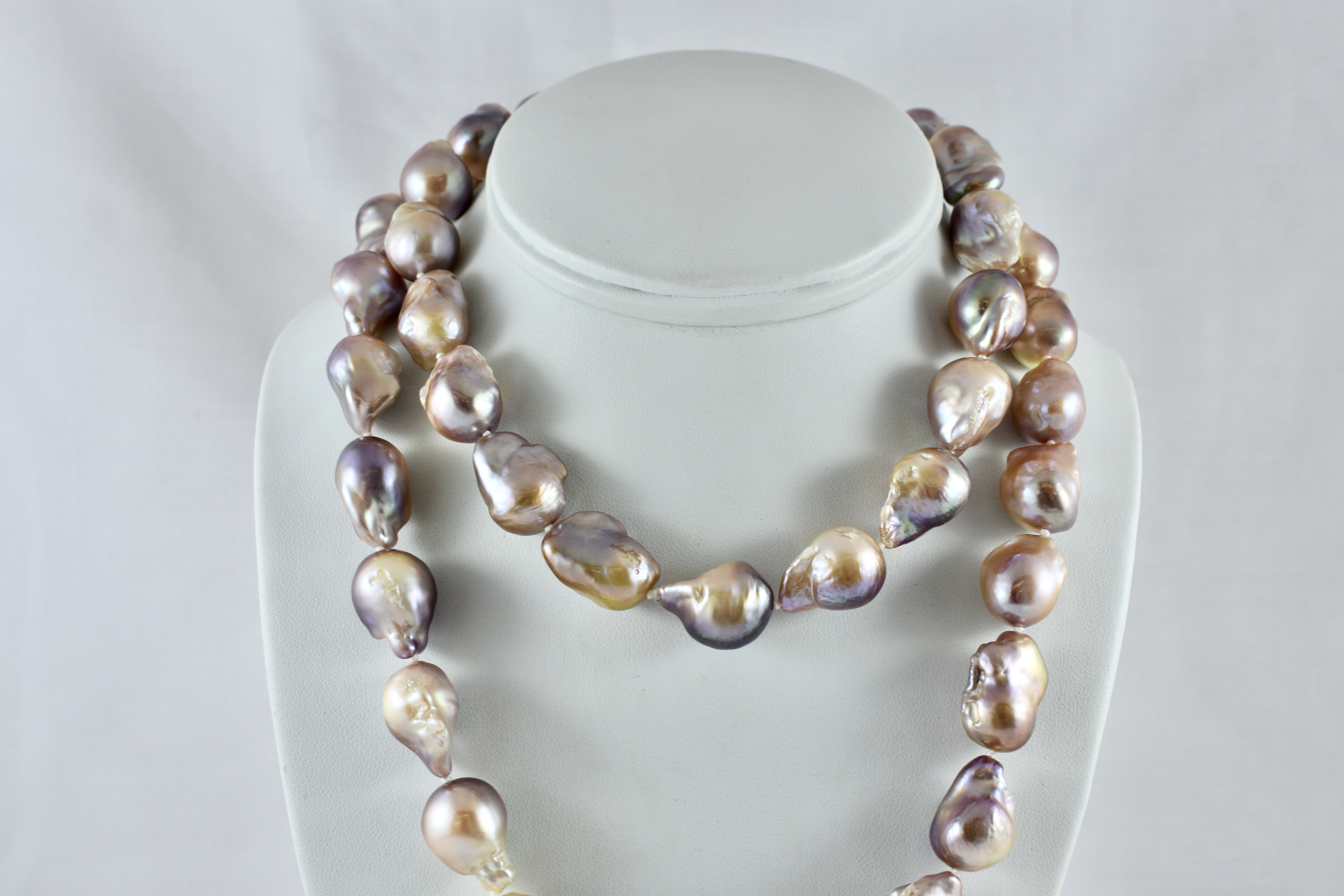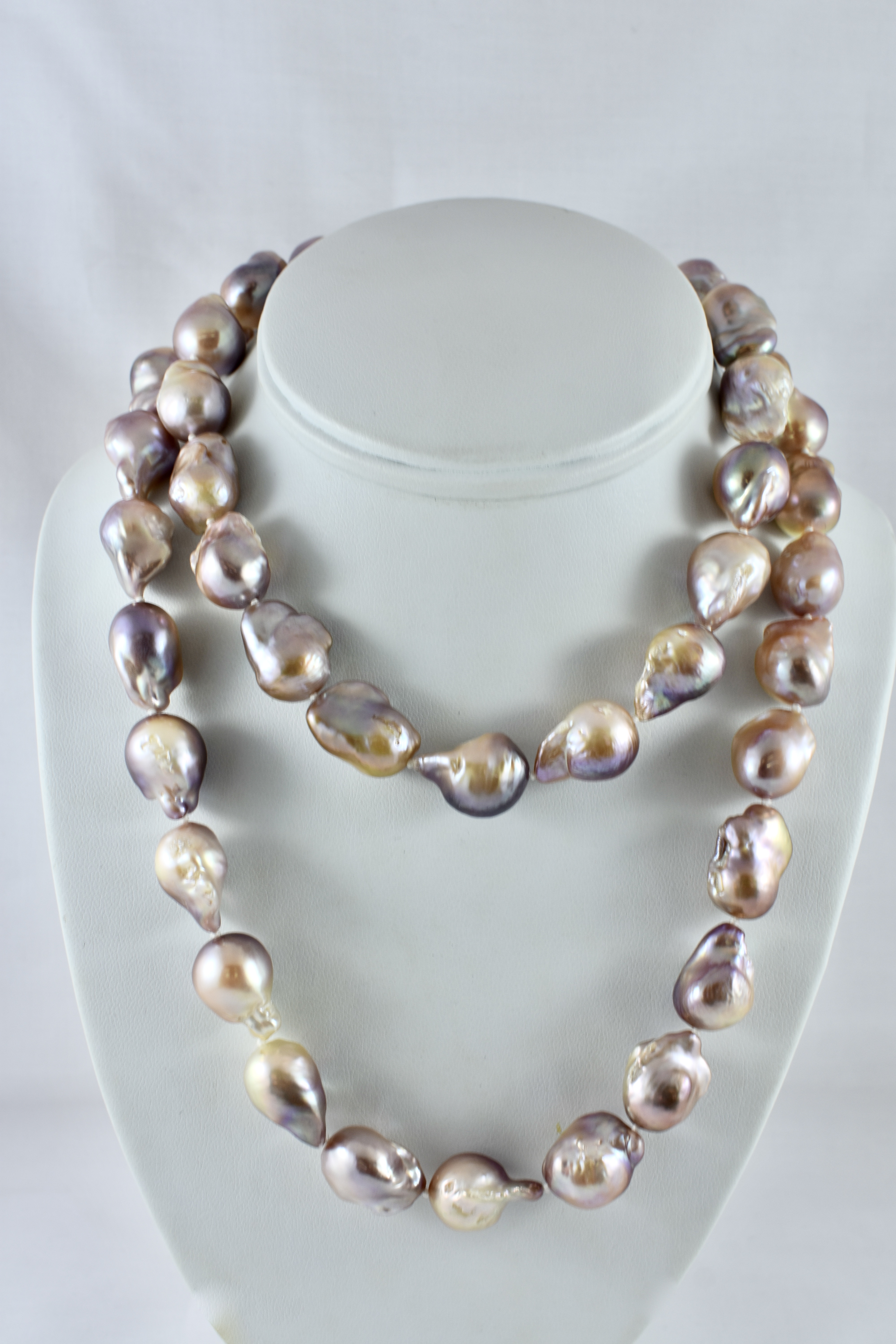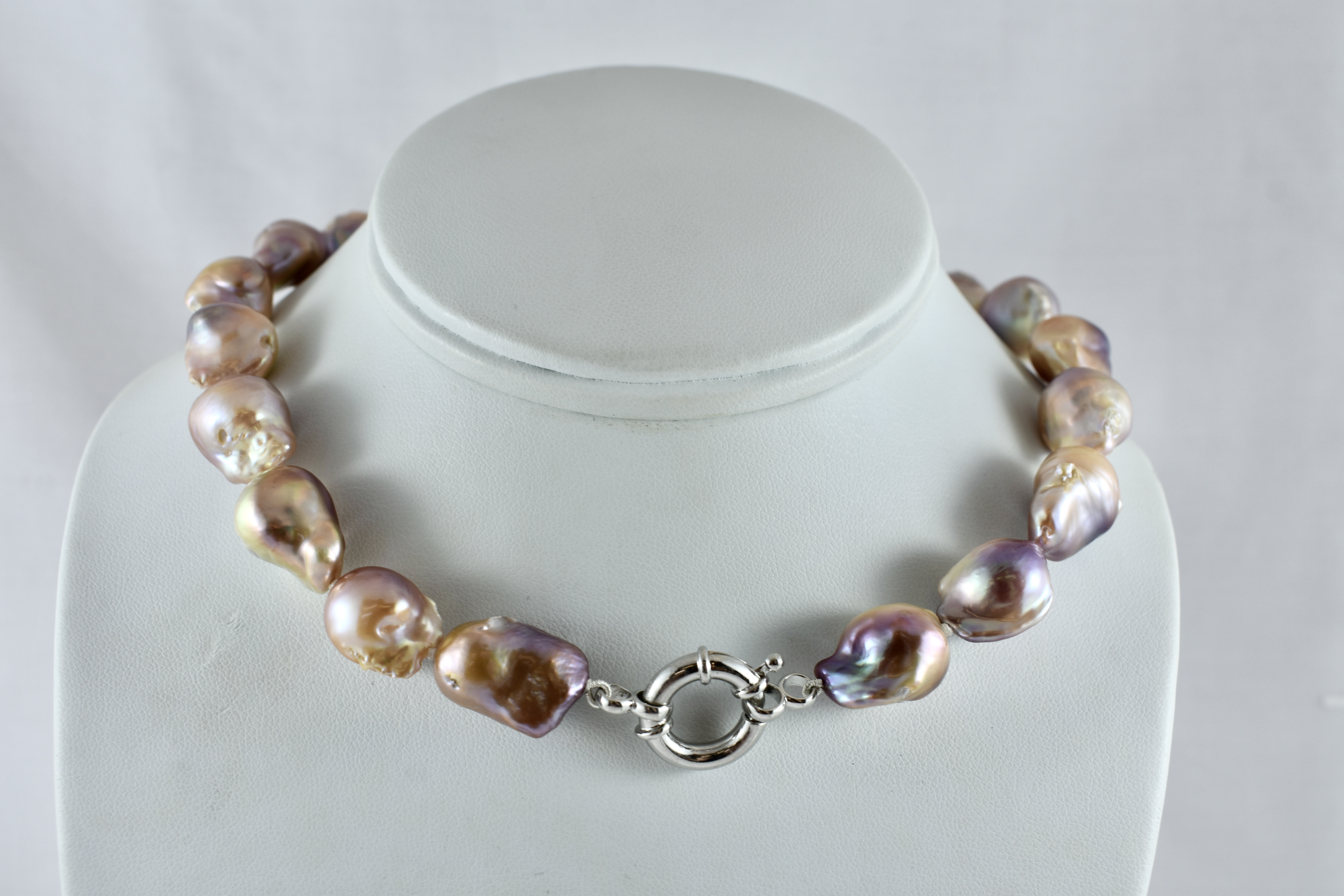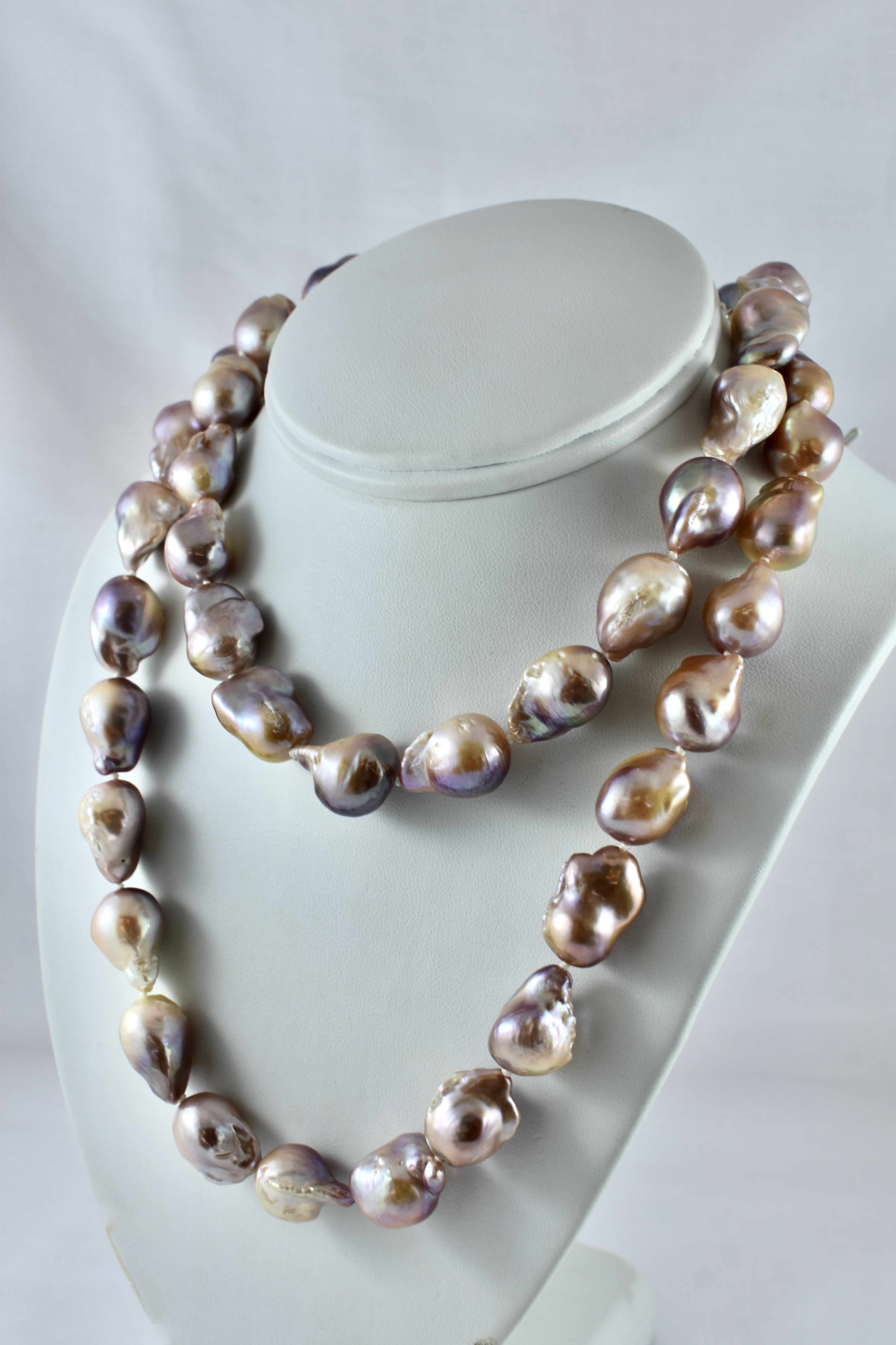 Gorgeous freshwater baroque pink pearl strand, measuring 90cm long. Consisting of many beautiful 13-15mm baroque pearls with good lustre, individually knotted, and completed with a sterling silver bolt ring clasp.