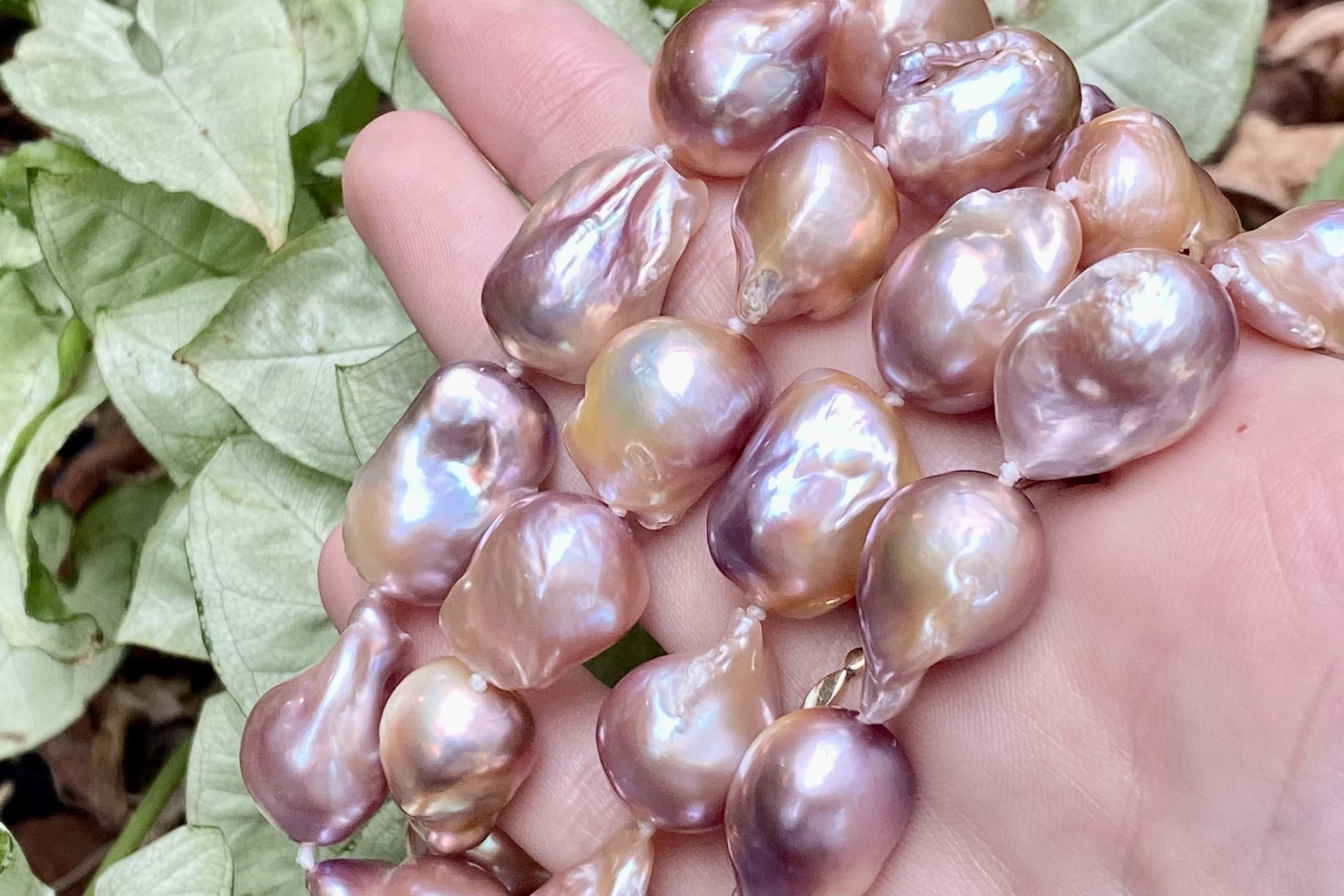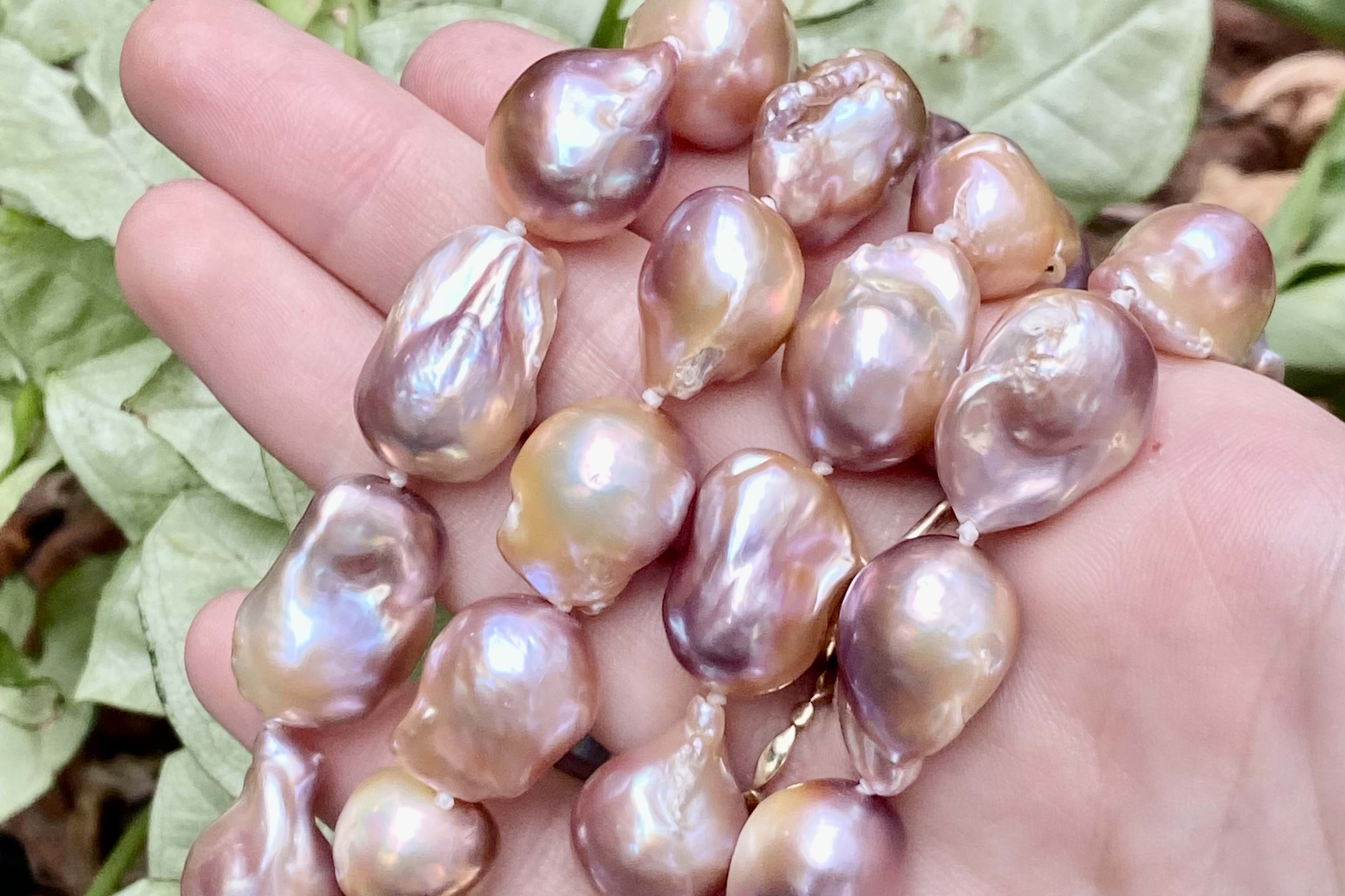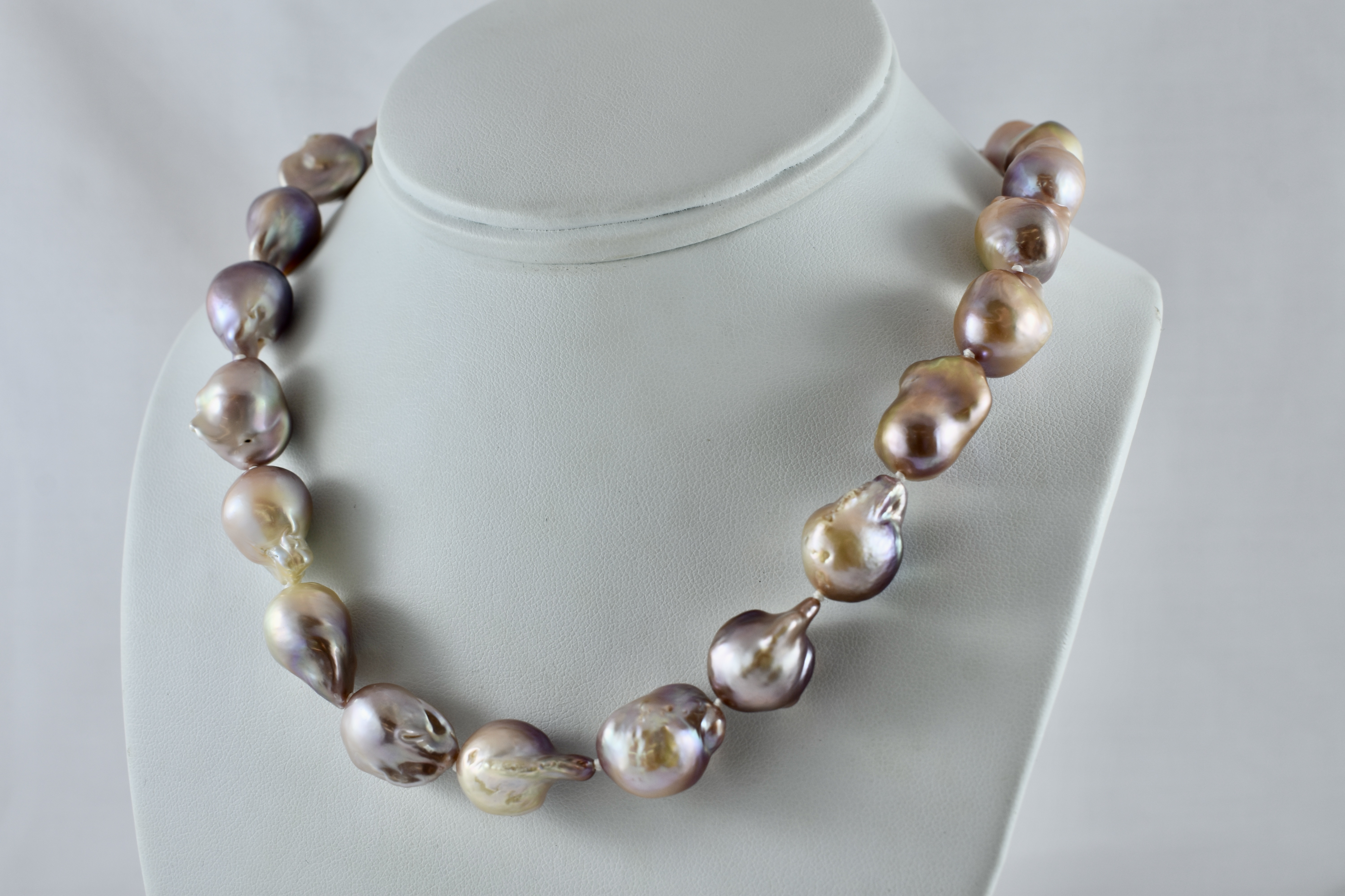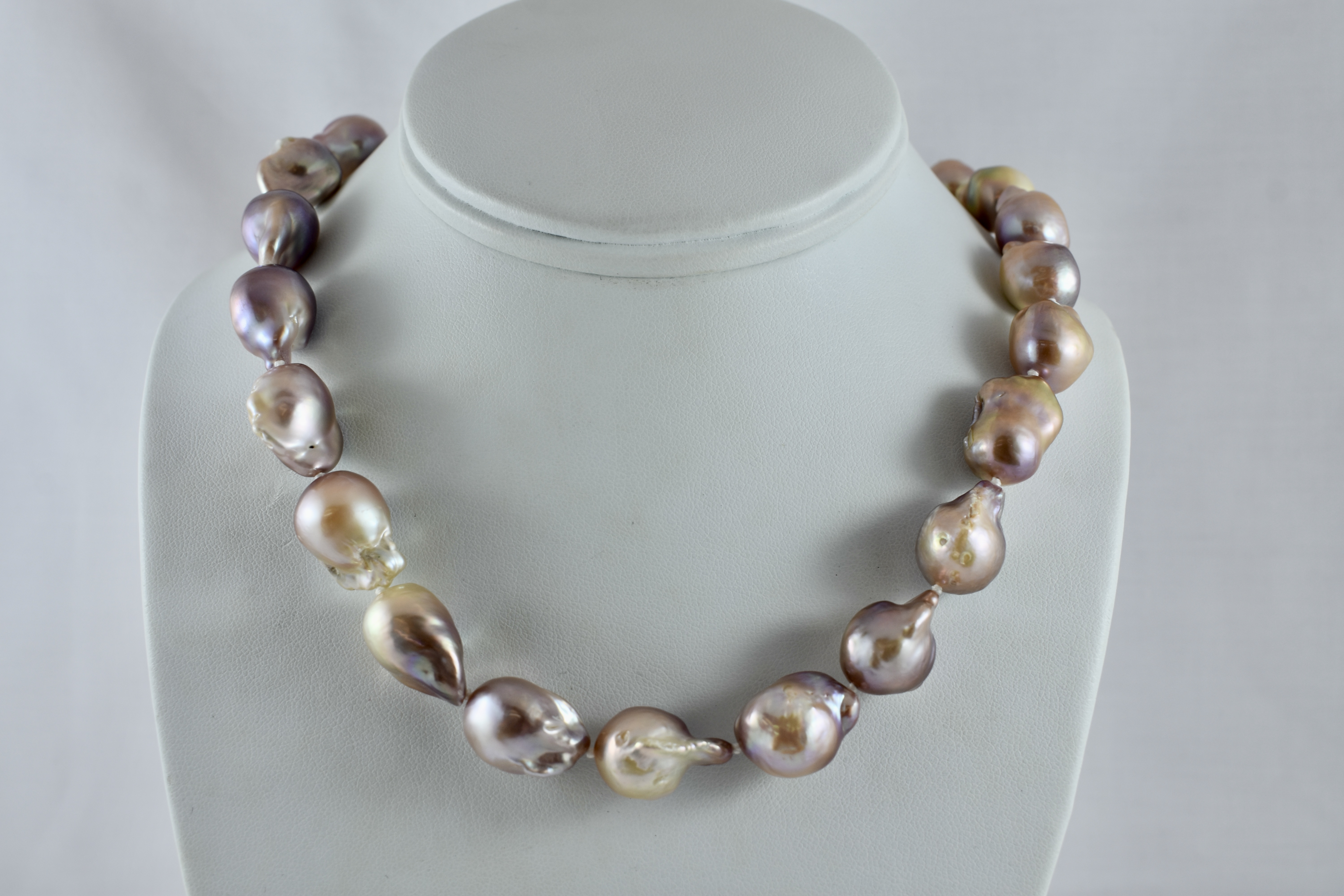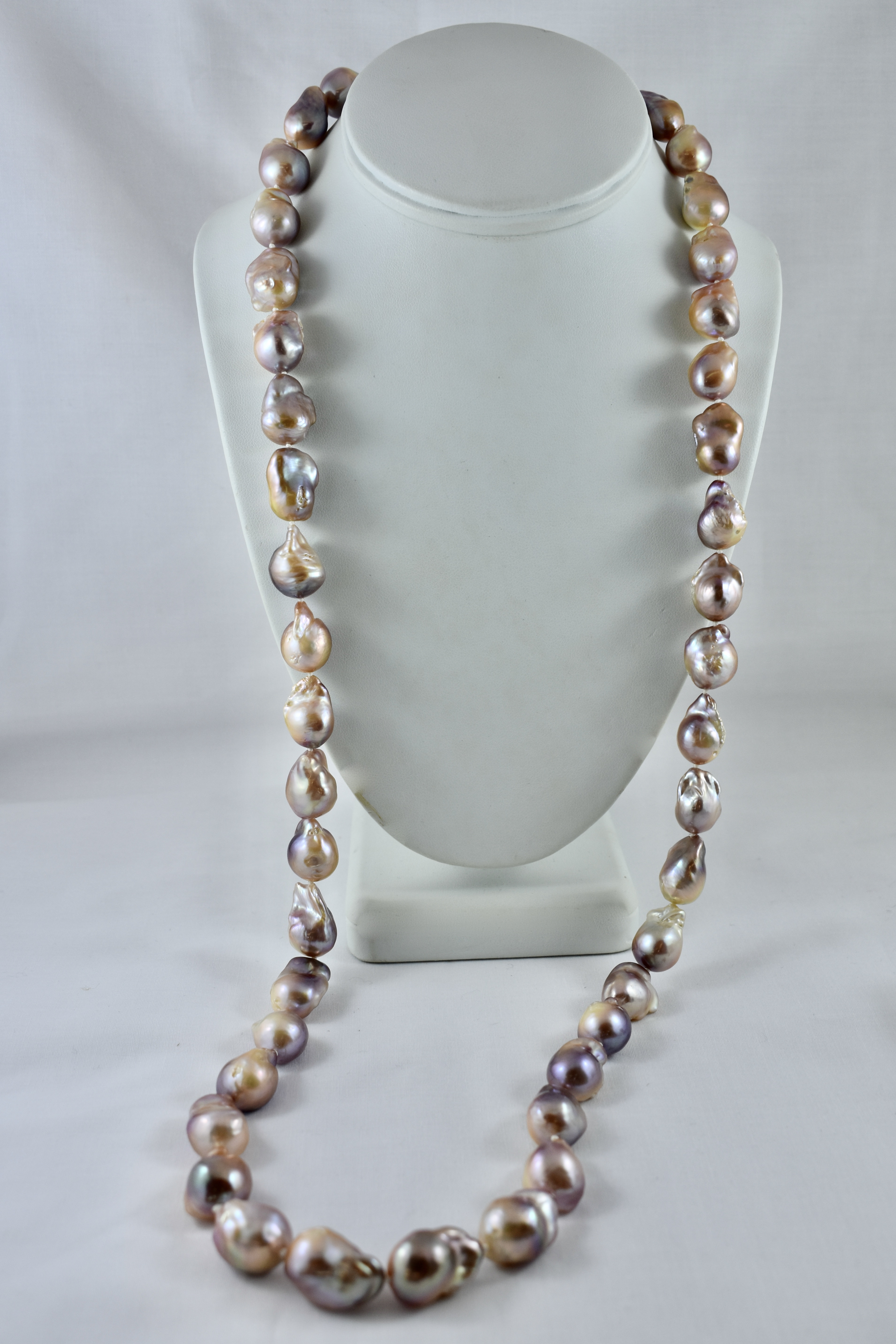 Gorgeous freshwater baroque pink pearl strand, measuring 90cm long. Consisting of many beautiful 13-15mm baroque pearls with good lustre, individually knotted, and completed with a sterling silver bolt ring clasp.