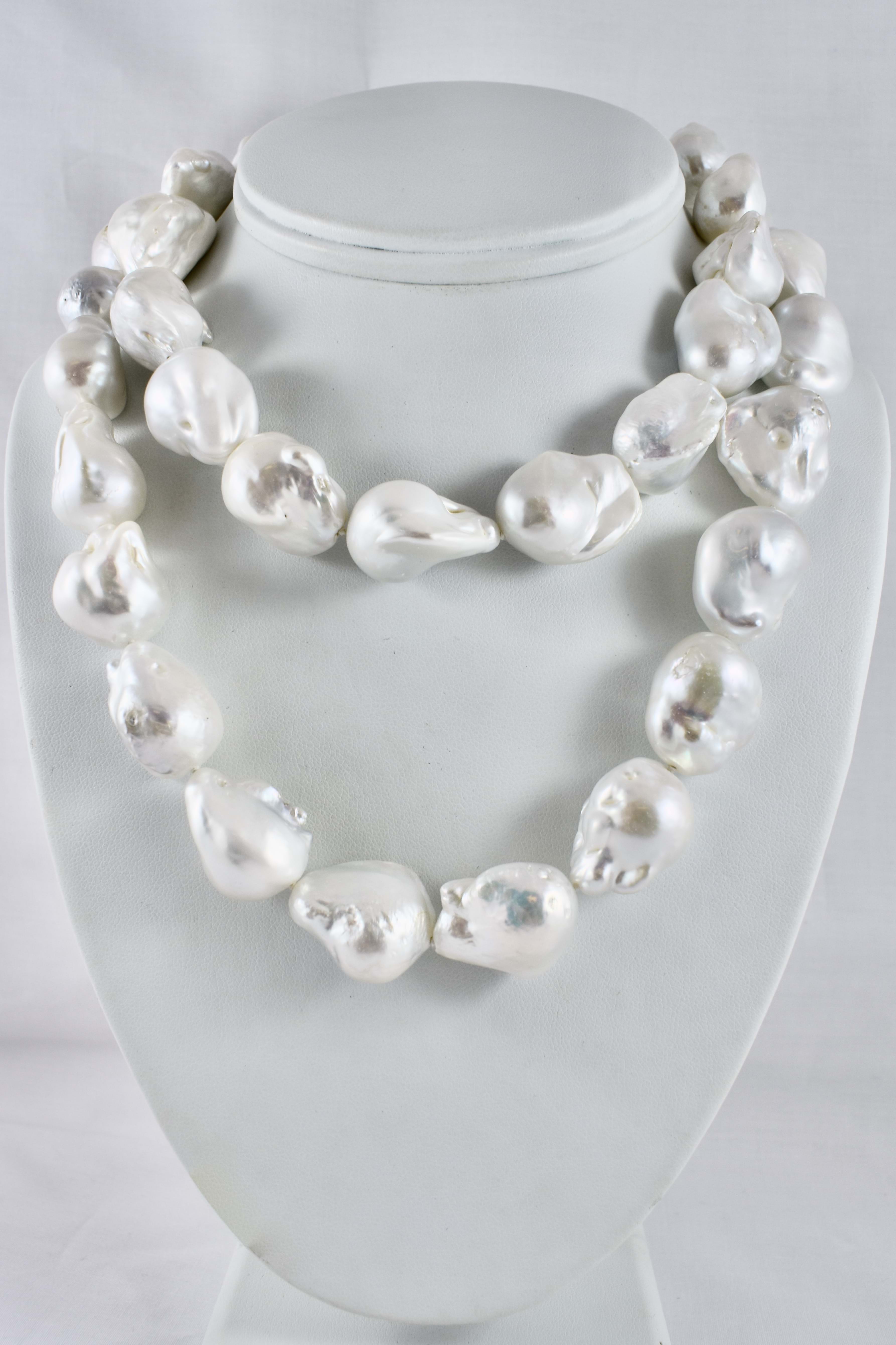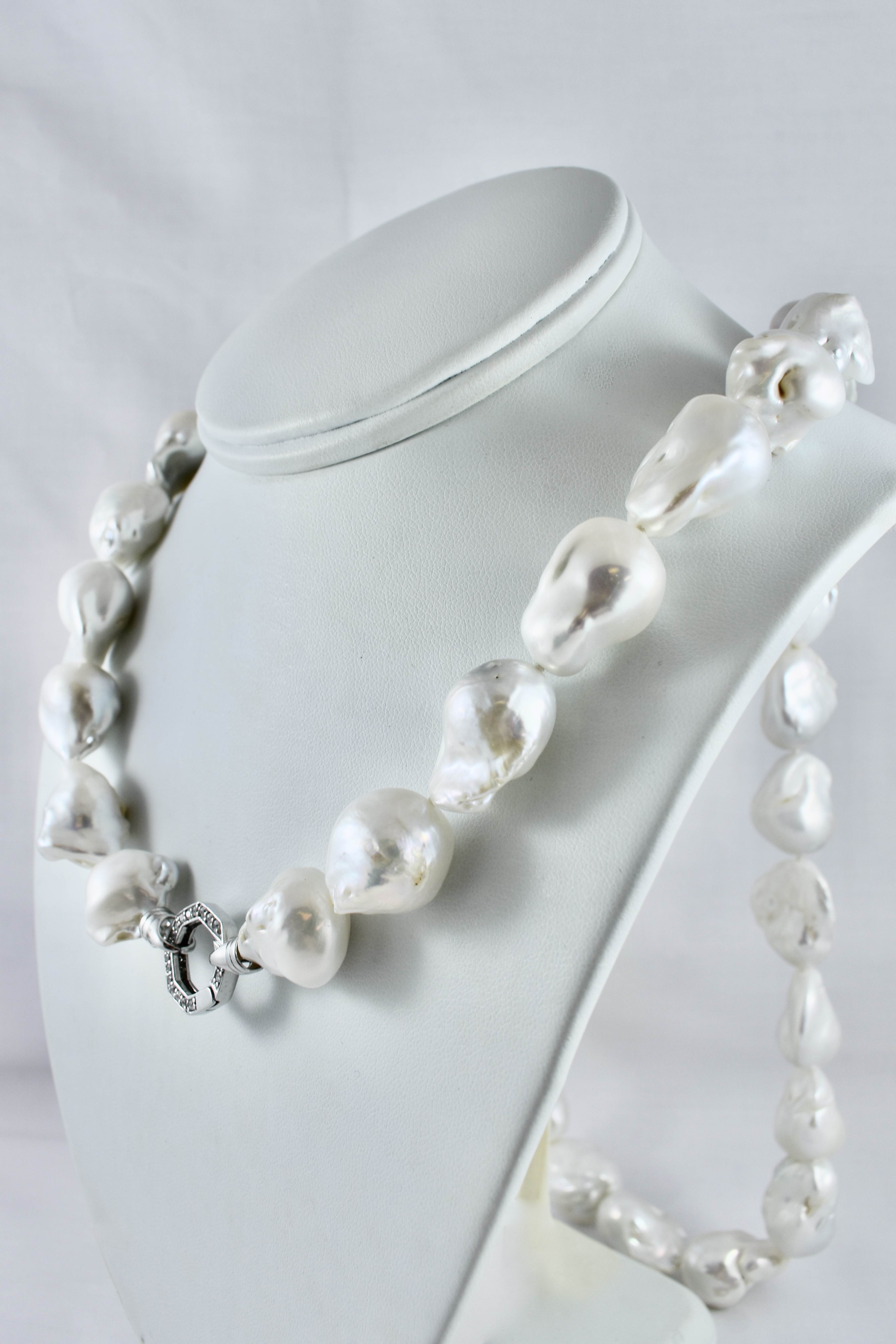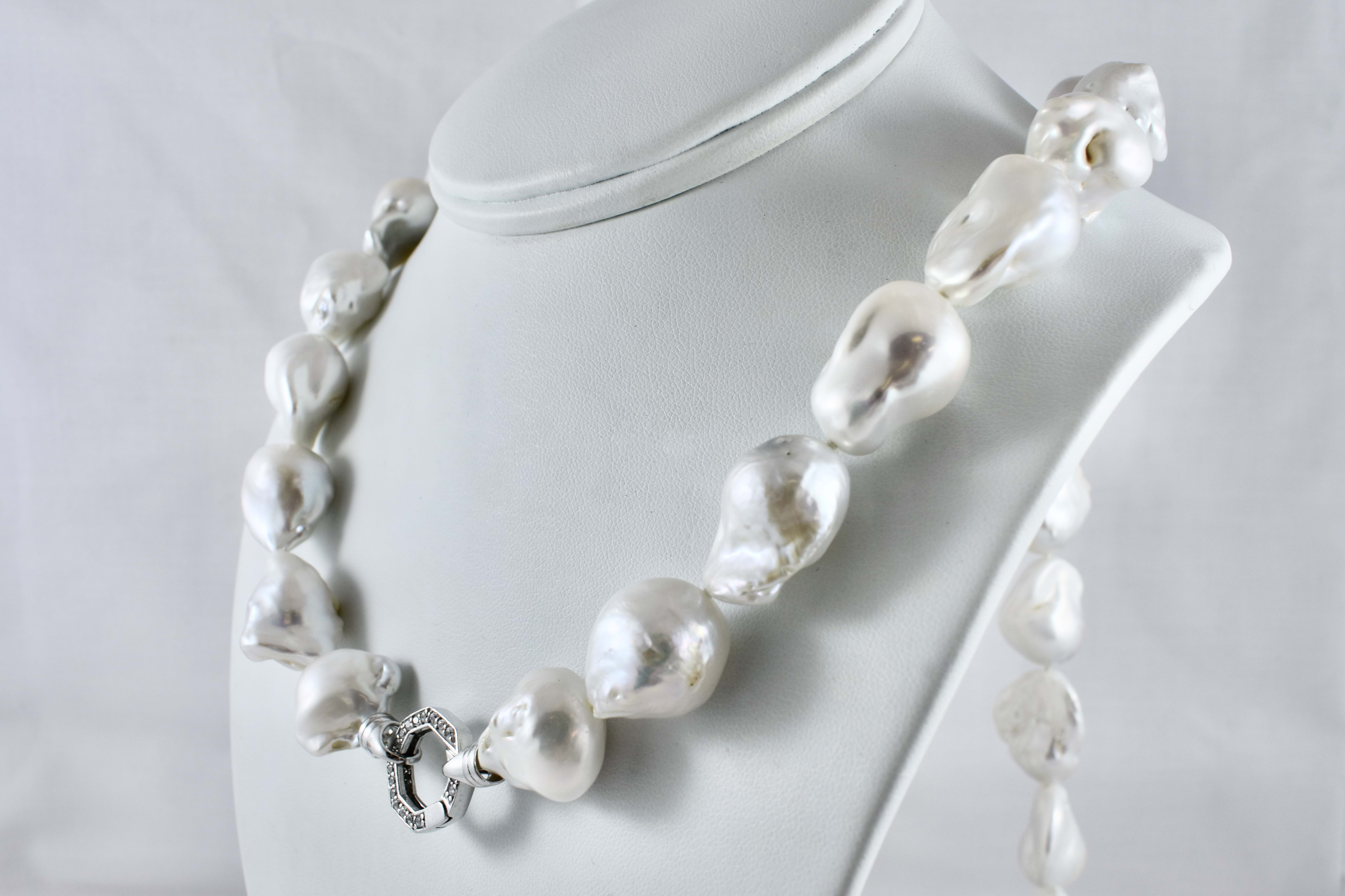 This pretty pearl strand is made up of white 16.6-19.2mm freshwater baroque pearls of good lustre, with a sterling silver cubic zirconia hexagon clasp. Strand is 86.5cm long