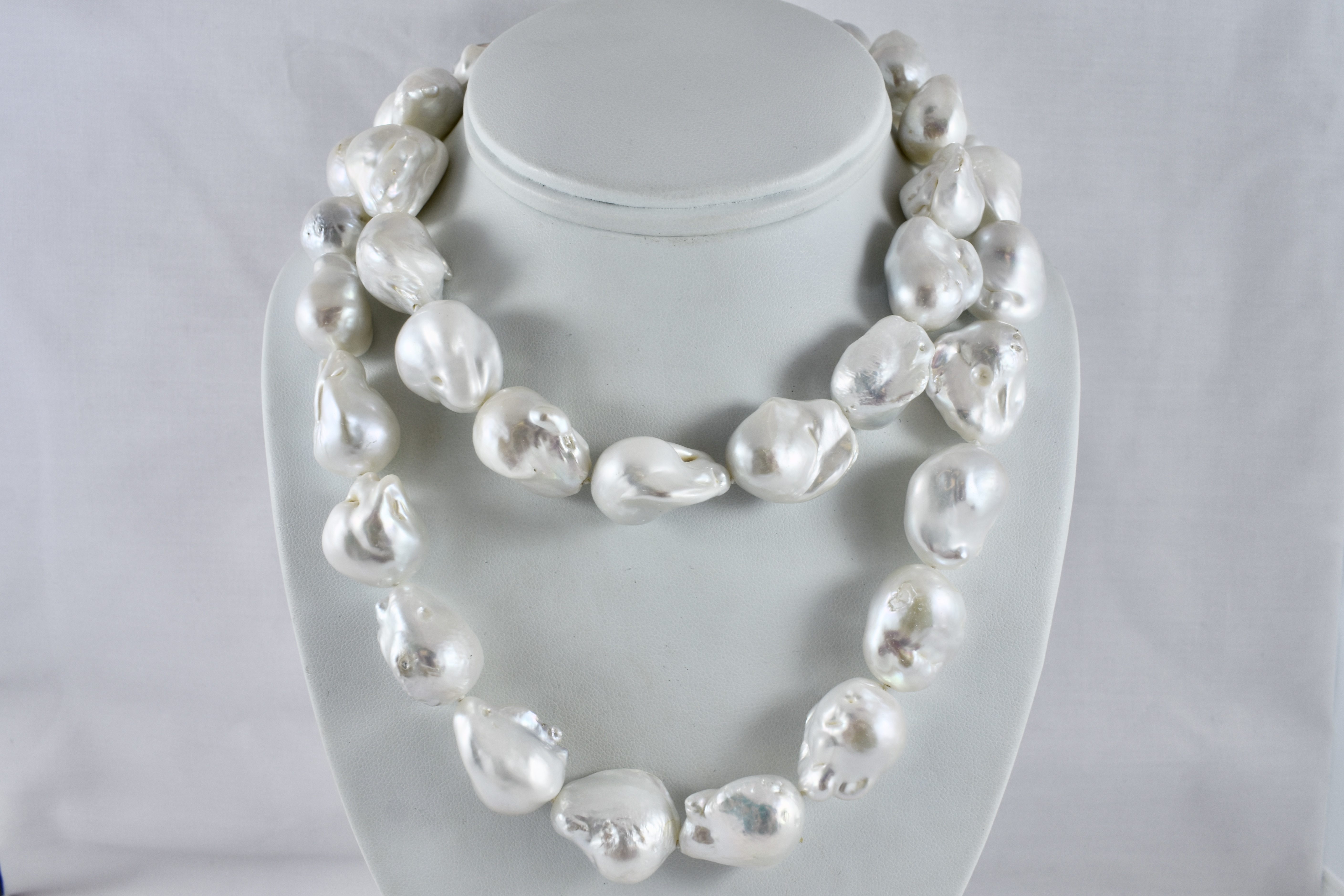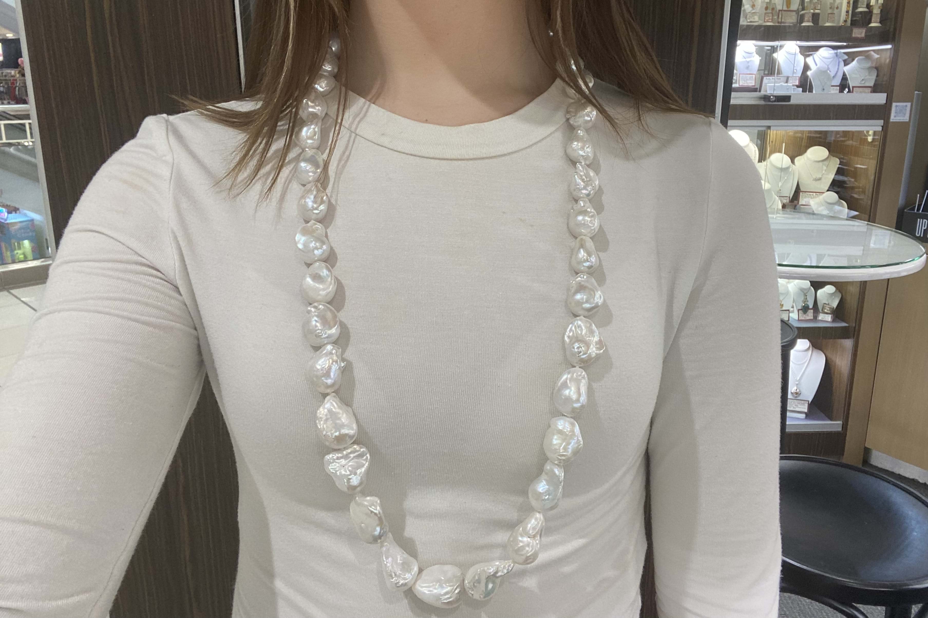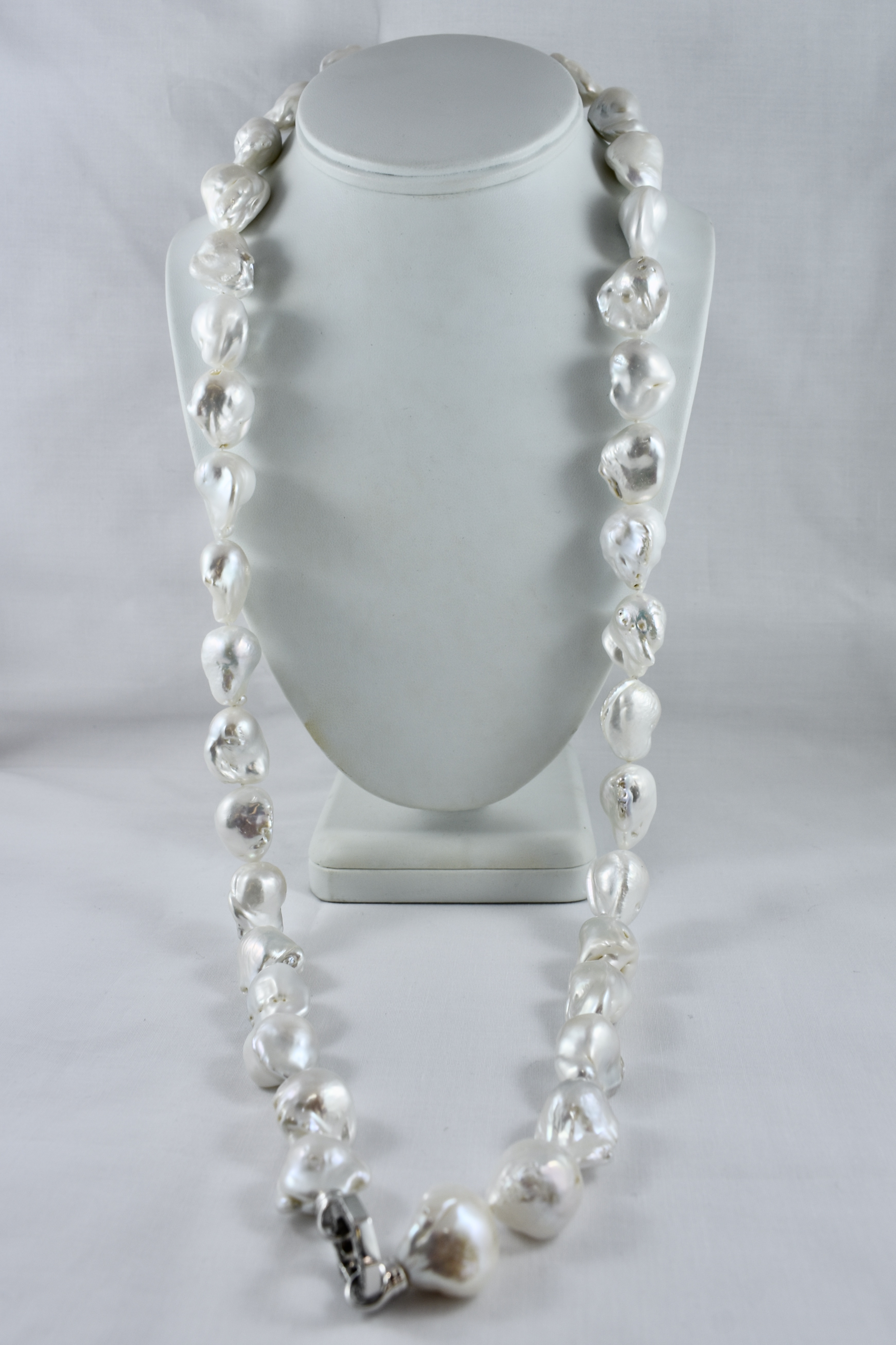 This pretty pearl strand is made up of white 16.6-19.2mm freshwater baroque pearls of good lustre, with a sterling silver cubic zirconia hexagon clasp. Strand is 86.5cm long