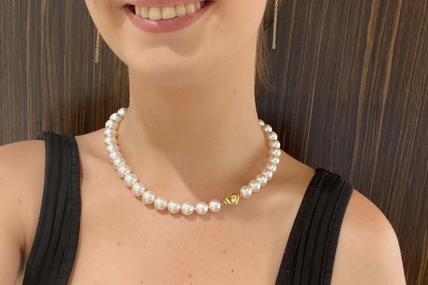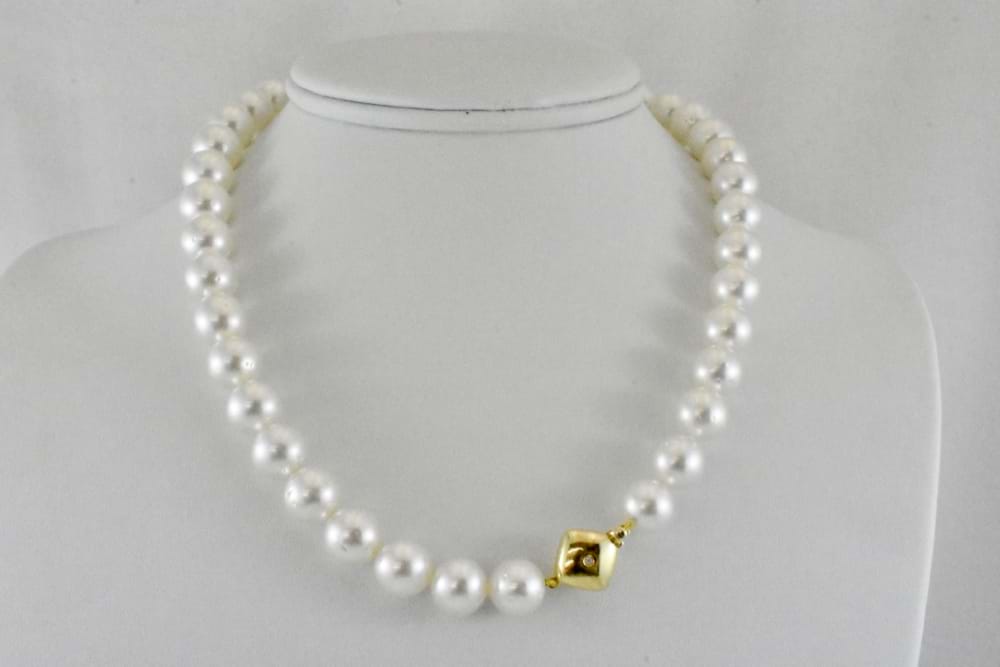 This elegant and timeless strand of 39 semi-round Australian white south sea pearls measures 45cm and has been hand strung on silk with a 14ct diamond set cushion shape clasp. The pearls graduate in size from 10mm - 13mm and have pink white hue, they are lightly blemished with a good lustre. Independent valuation supplied