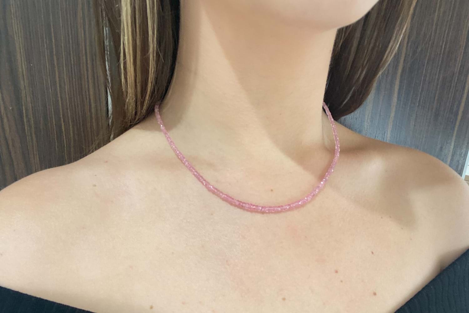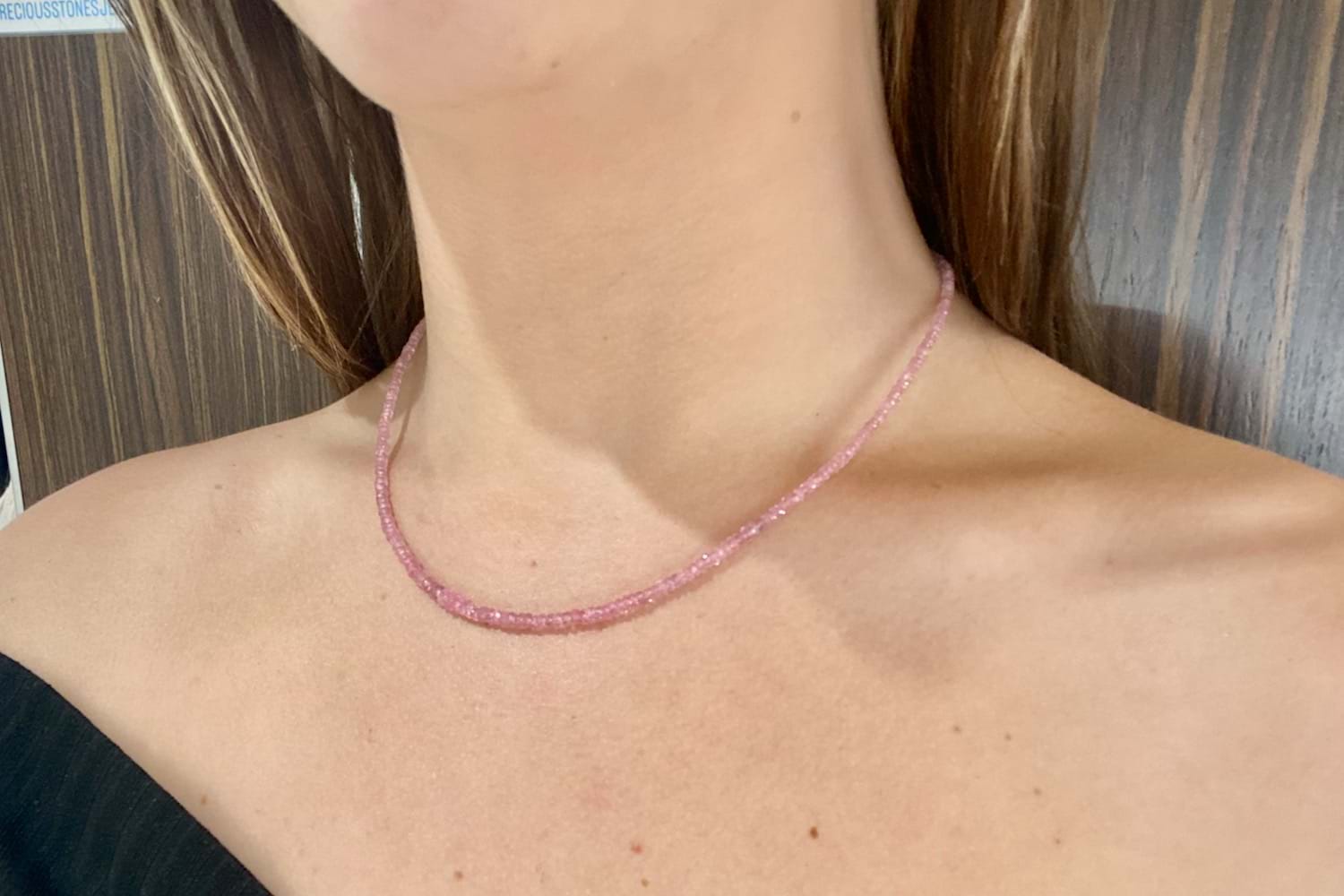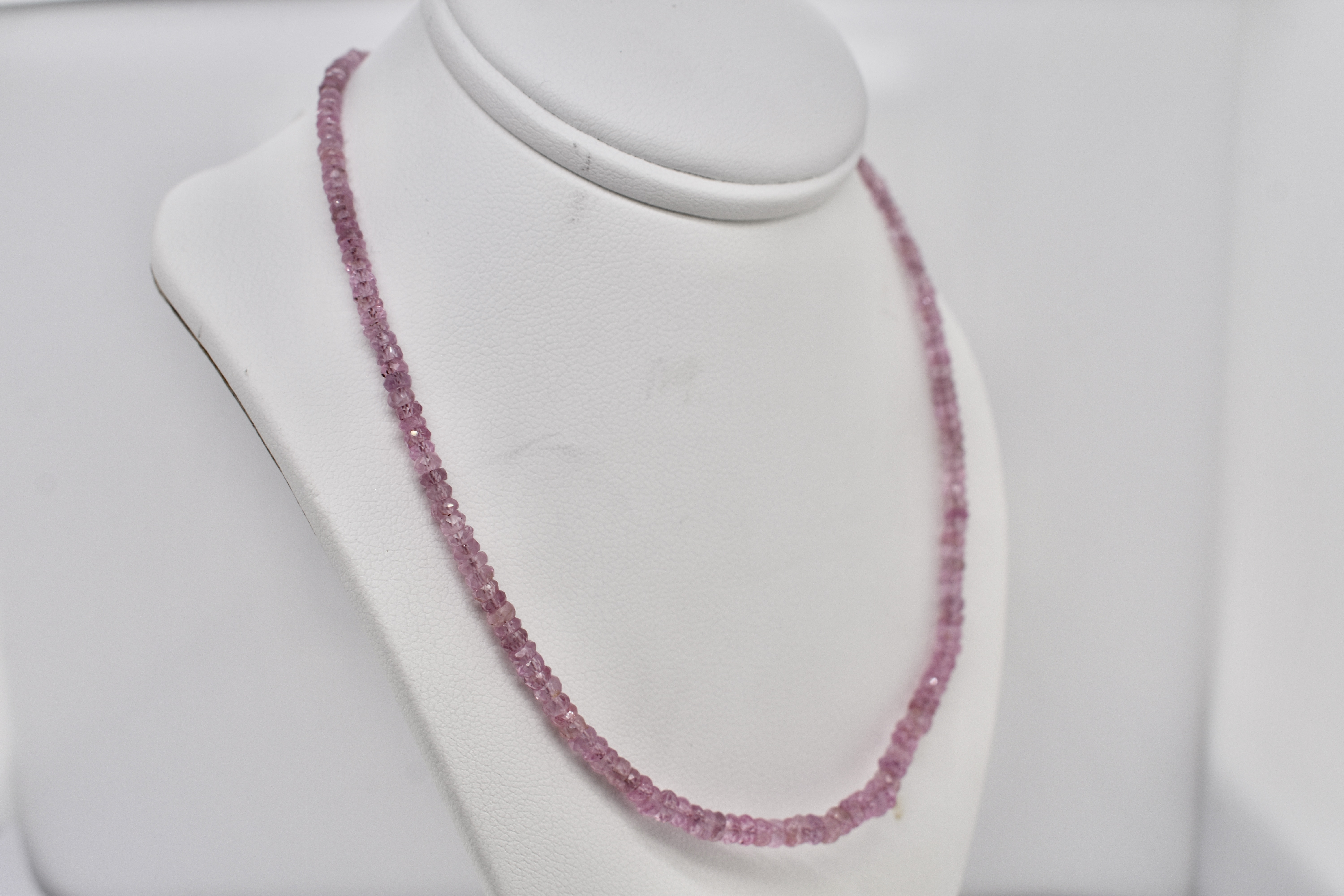 Elegant and pretty, this pastel strand of beads is made up of shimmering, faceted pink spinels which are graduated and measure from approx. 2.3-3.5mm, finished with a sterling silver clasp and extension section. Total length is 43cm + 4cm with the extension. This strand will look lovely on its own or with a small pendant or enhancer