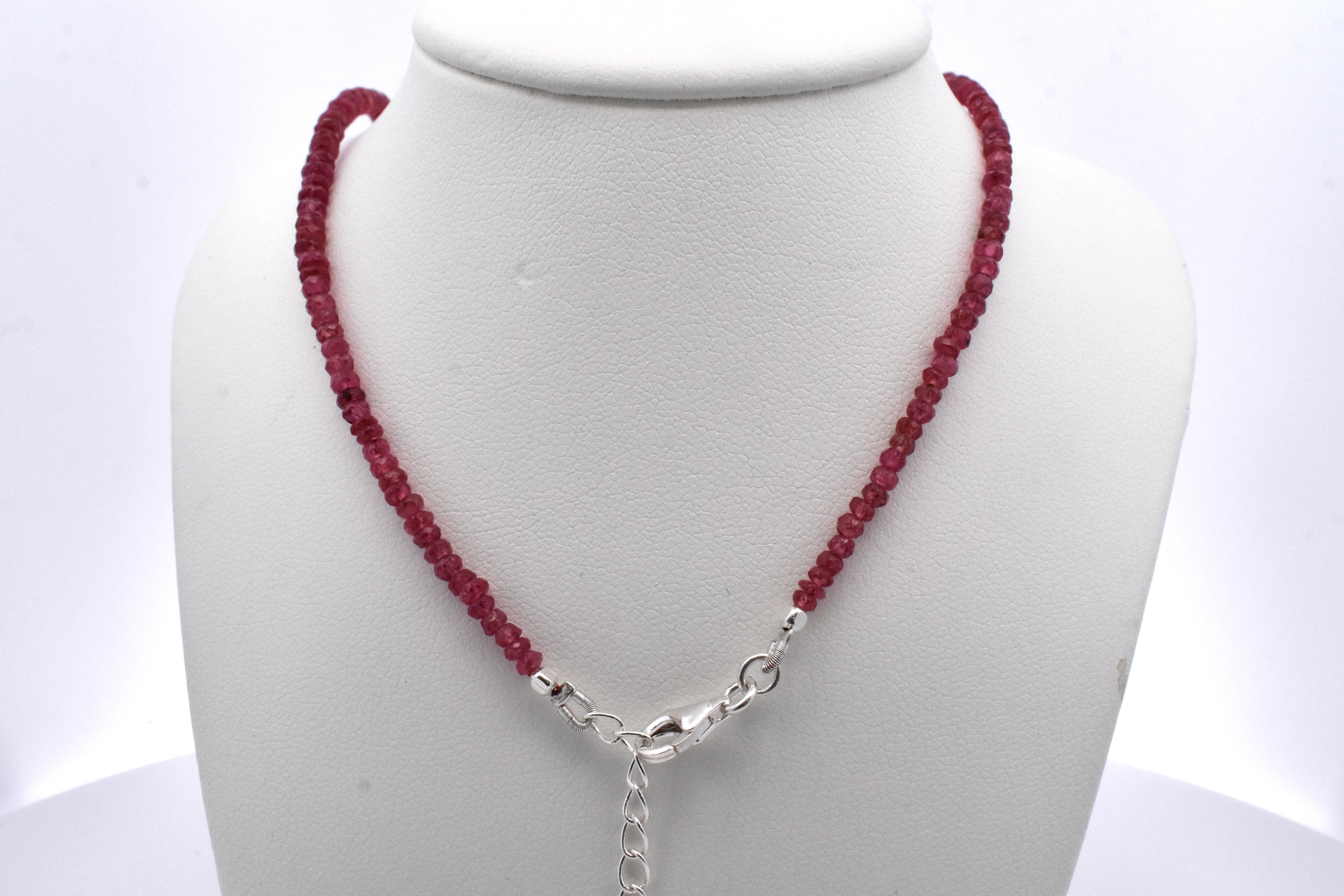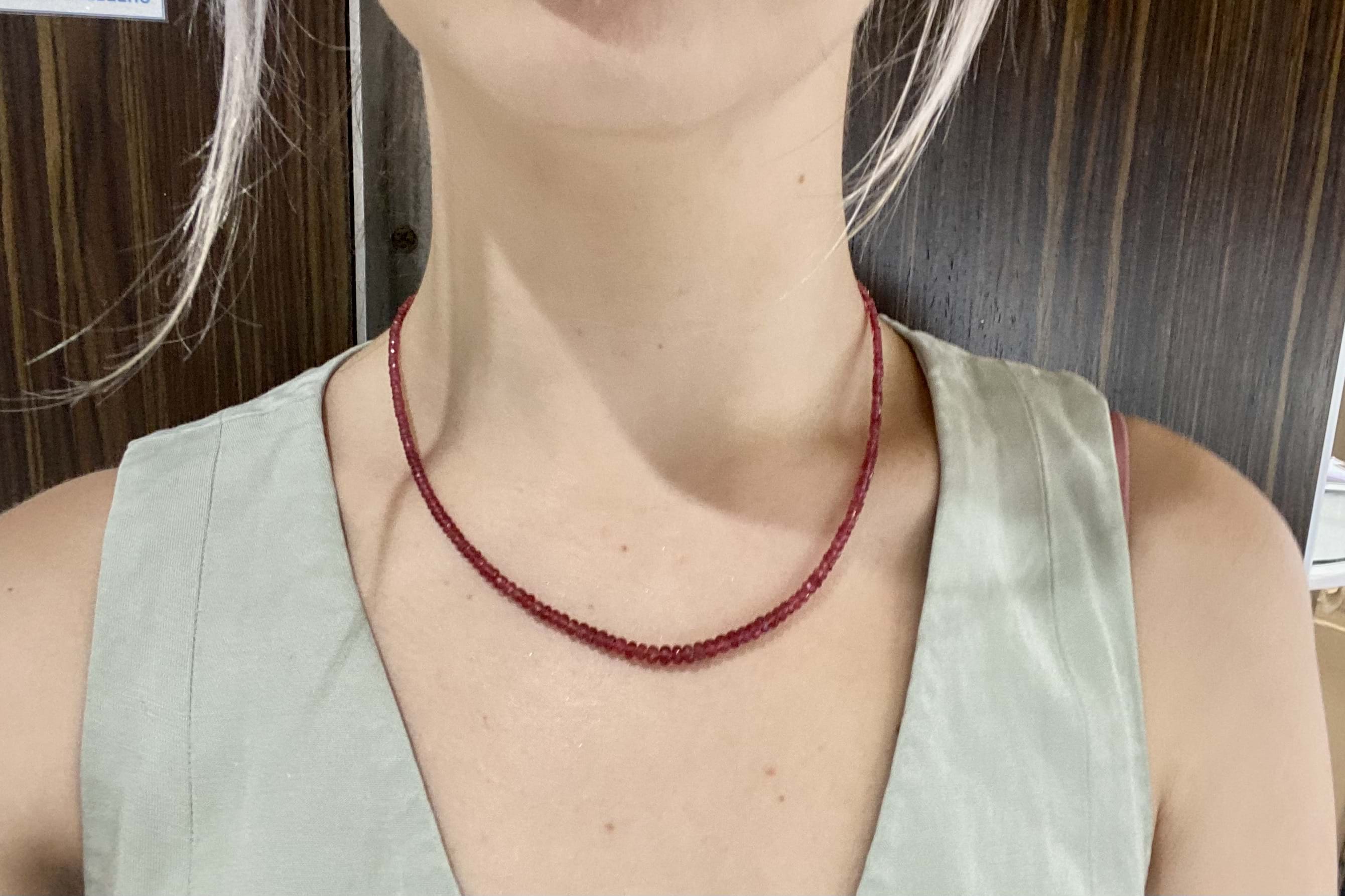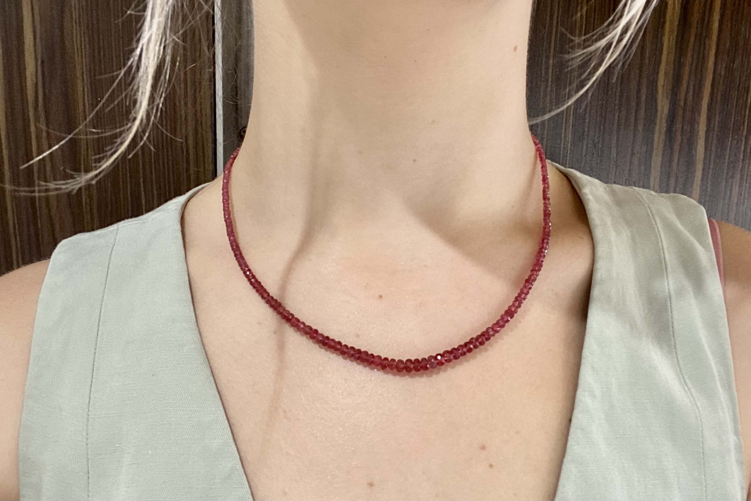 A resplendent strand of graduated, faceted red spinel beads, ranging in size from 2.5 to 5.3mm, finished with a sterling silver clasp and extendable section. Strand is 42 + 3cm and can be worn on its own or with an enhancer to clip over