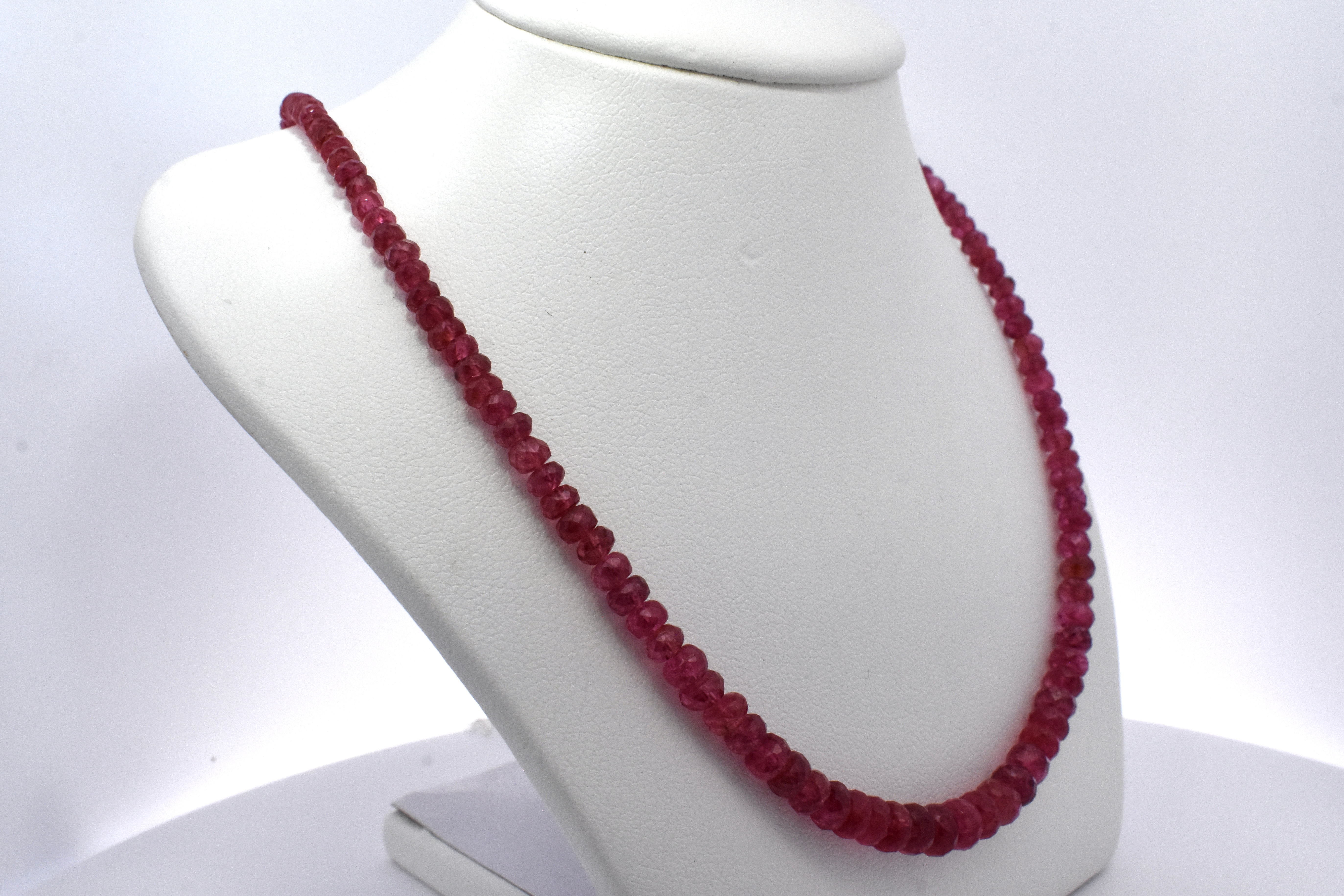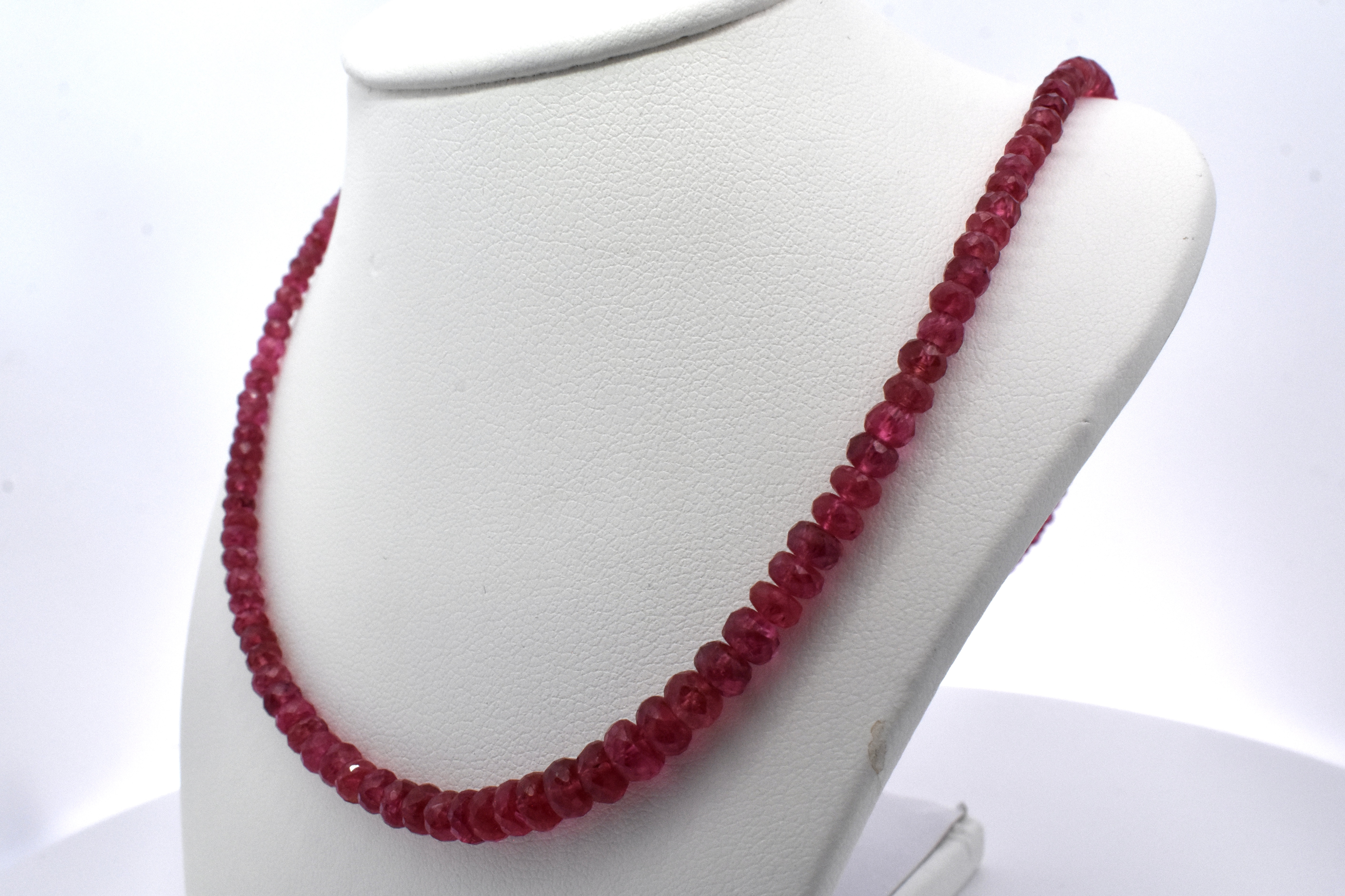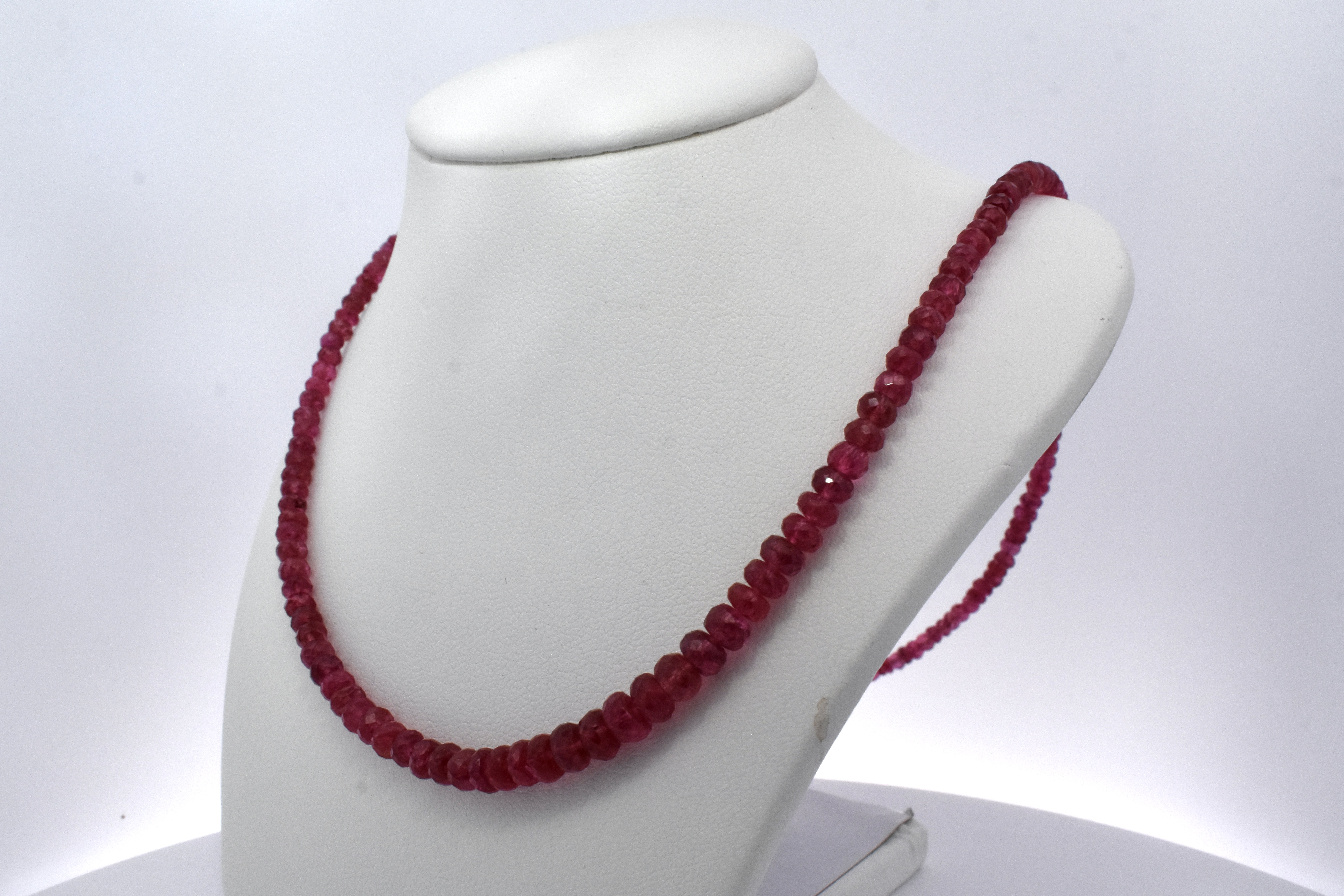 A resplendent strand of graduated, faceted red spinel beads, ranging in size from 2.5 to 5.3mm, finished with a sterling silver clasp and extendable section. Strand is 42 + 3cm and can be worn on its own or with an enhancer to clip over