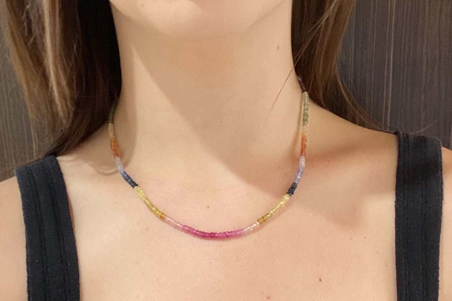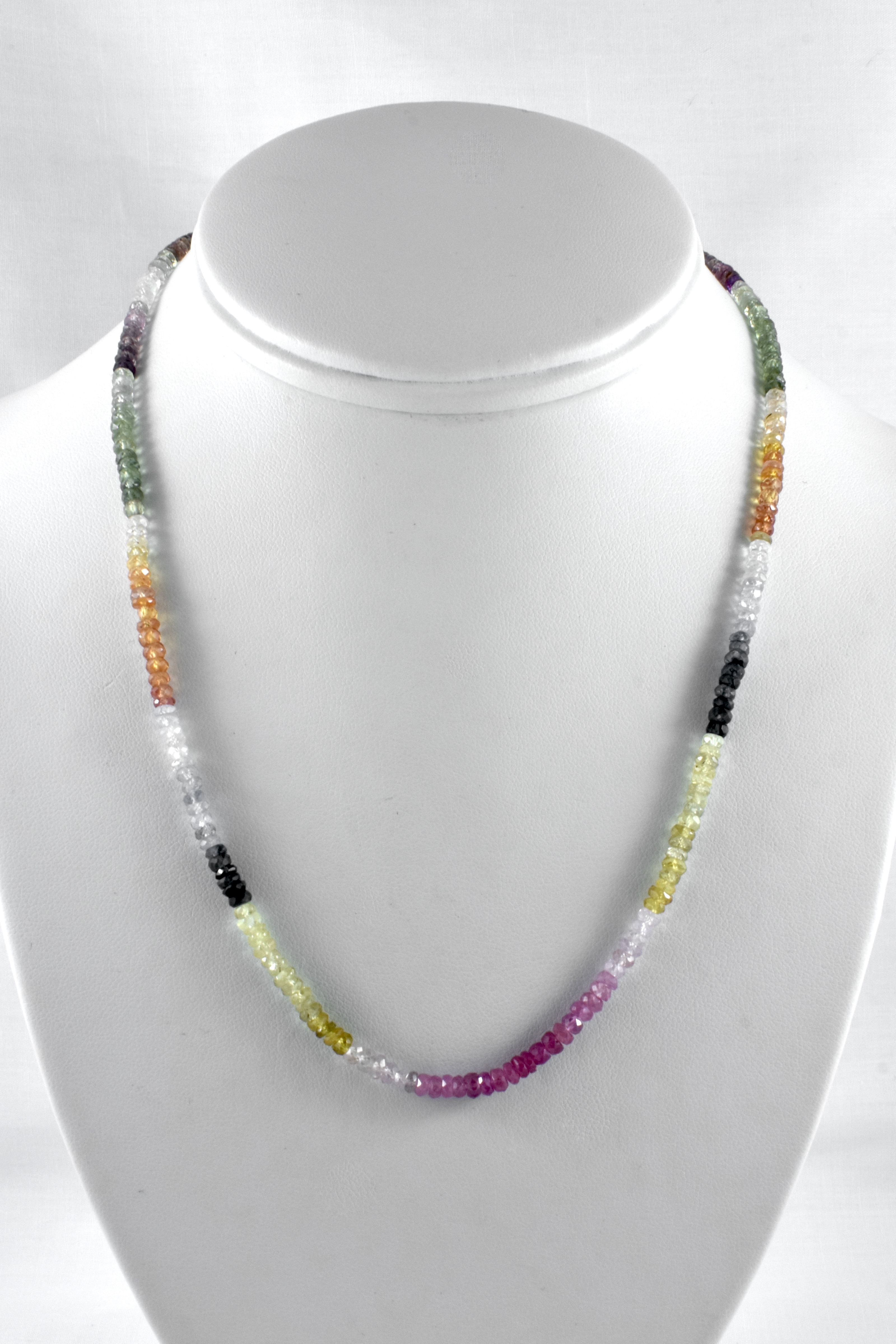 A bright and colourful strand of flattened, faceted multicoloured sapphires measuring 3.5mm round, 44cm long with a 6mm round polished sterling silver ball clasp. Total of 241 sapphires in tones of pink, blue, orange, yellow, green and purple