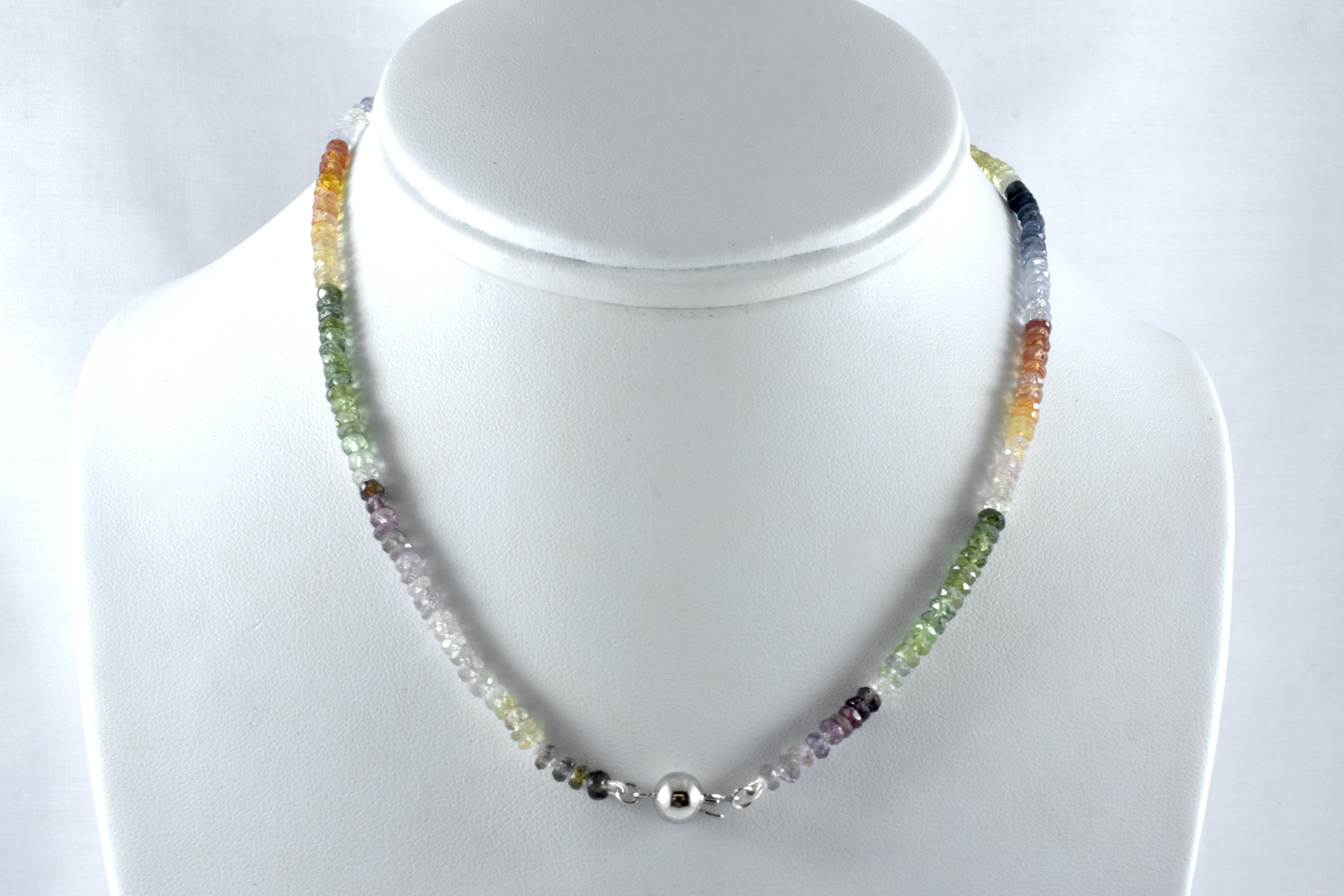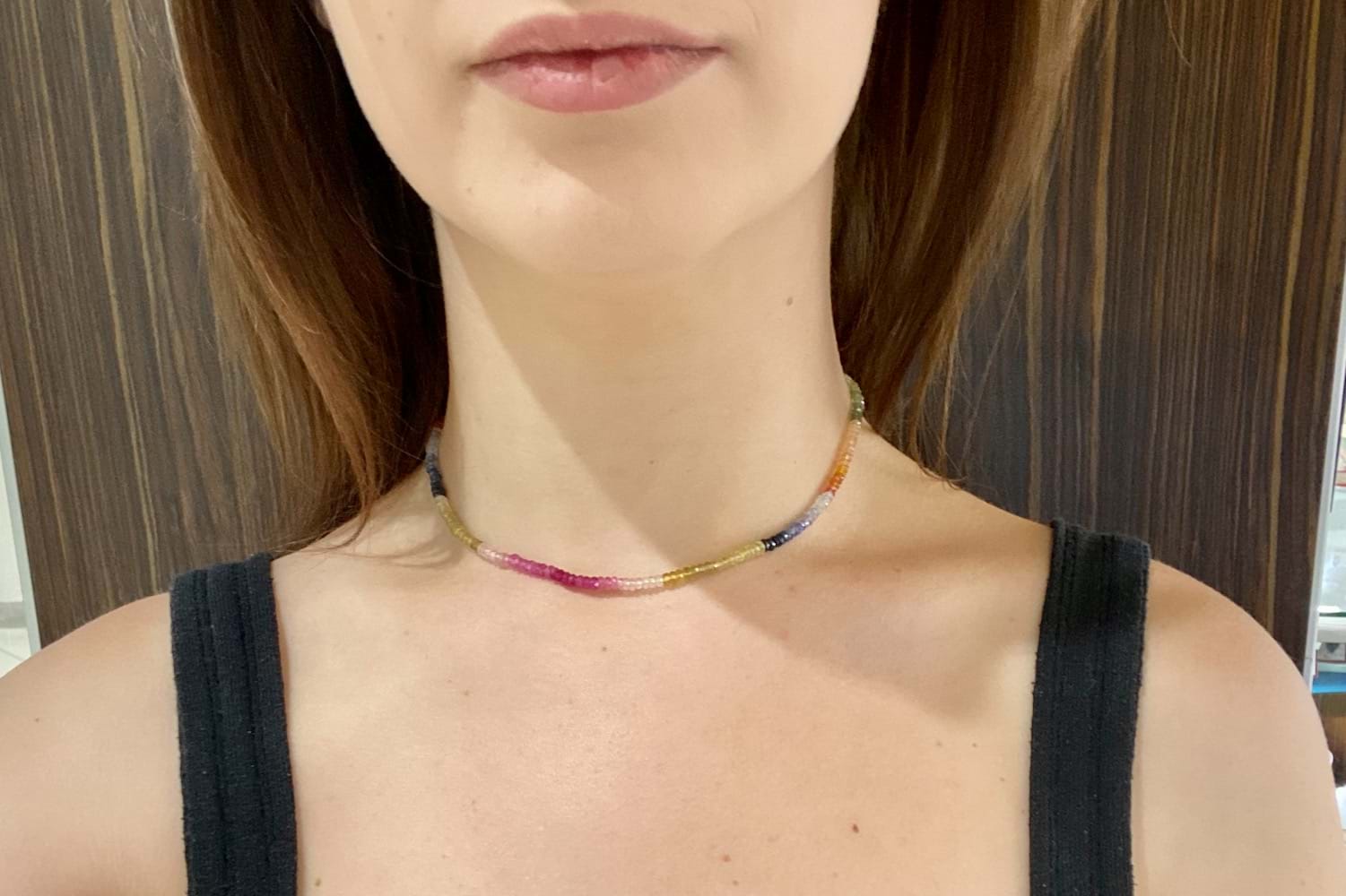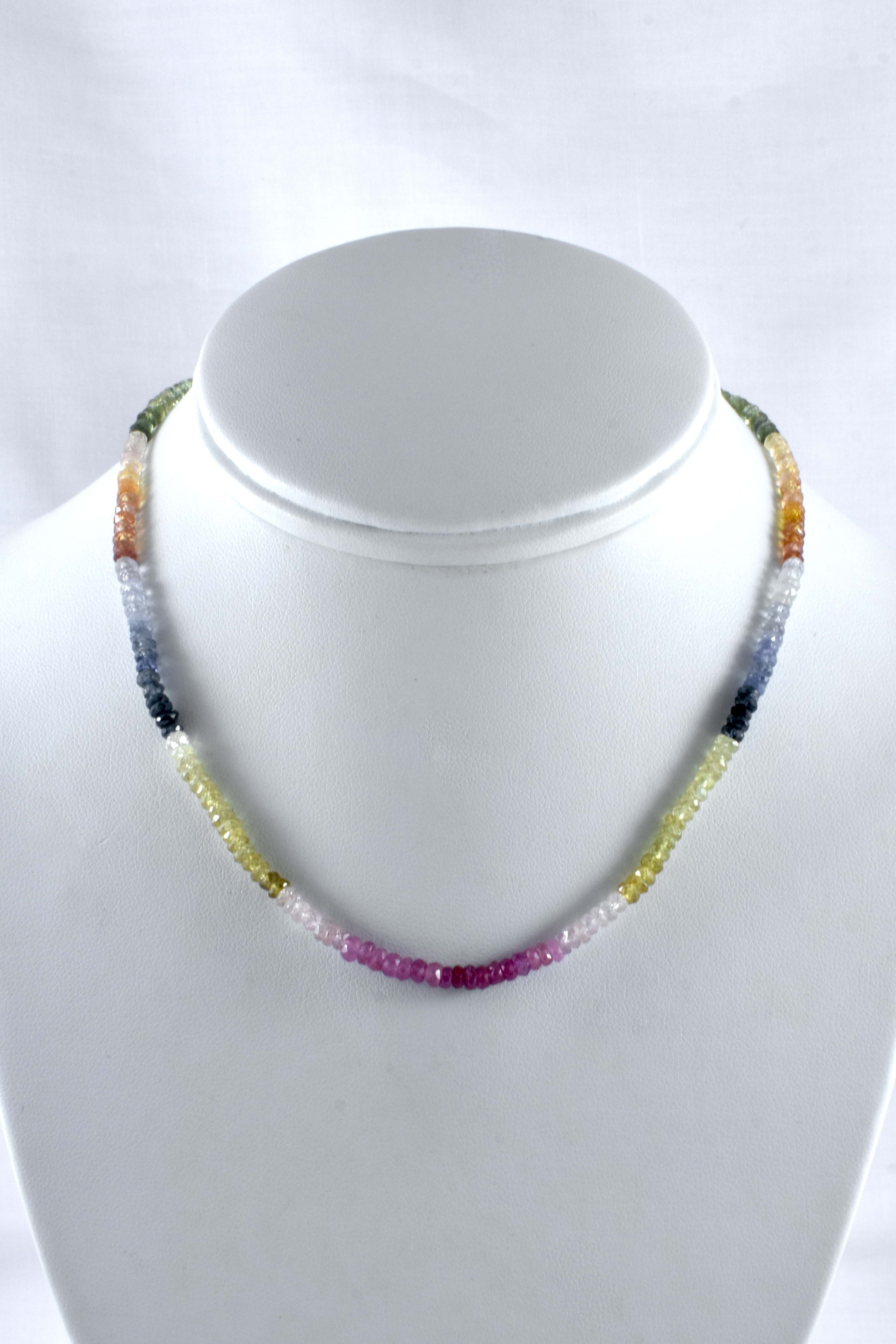 This gorgeous, rainbow strand of flattened, 3.5mm faceted multicoloured sapphires is in a dainty choker length of 38cm and finished with a 6mm round polished sterling silver ball clasp. Total of 193 sapphires in tones of pink, blue, orange, yellow, green and purplish grey