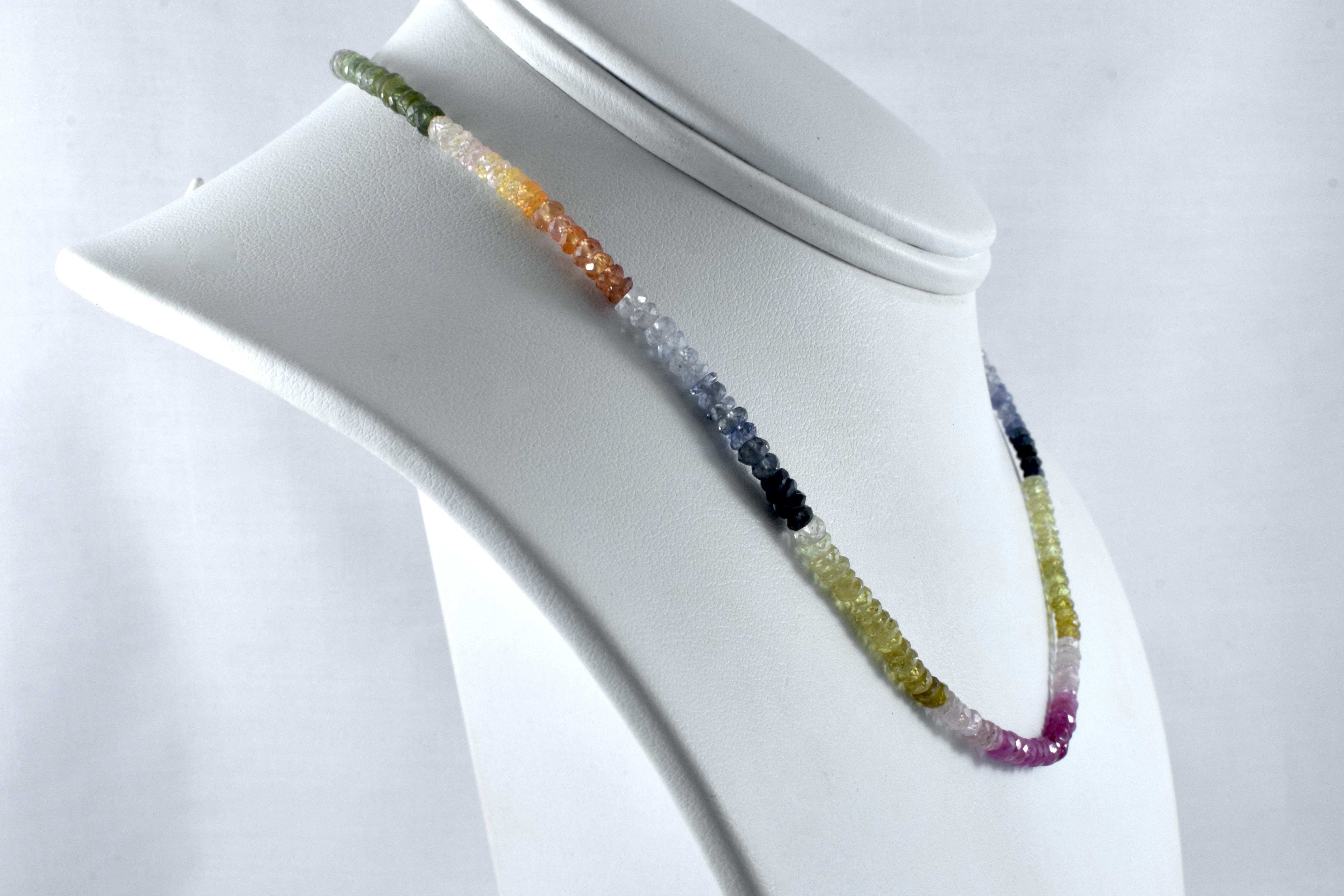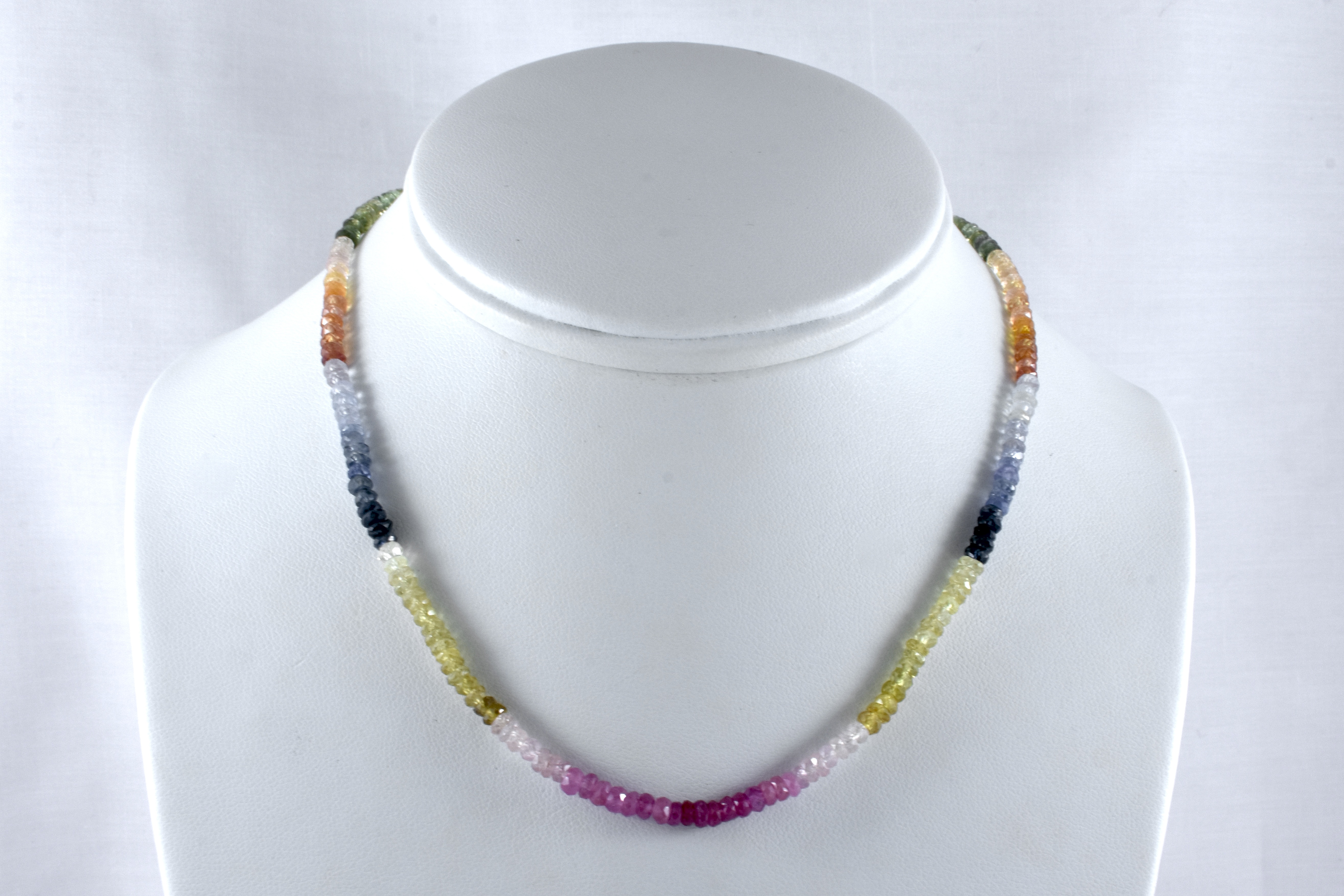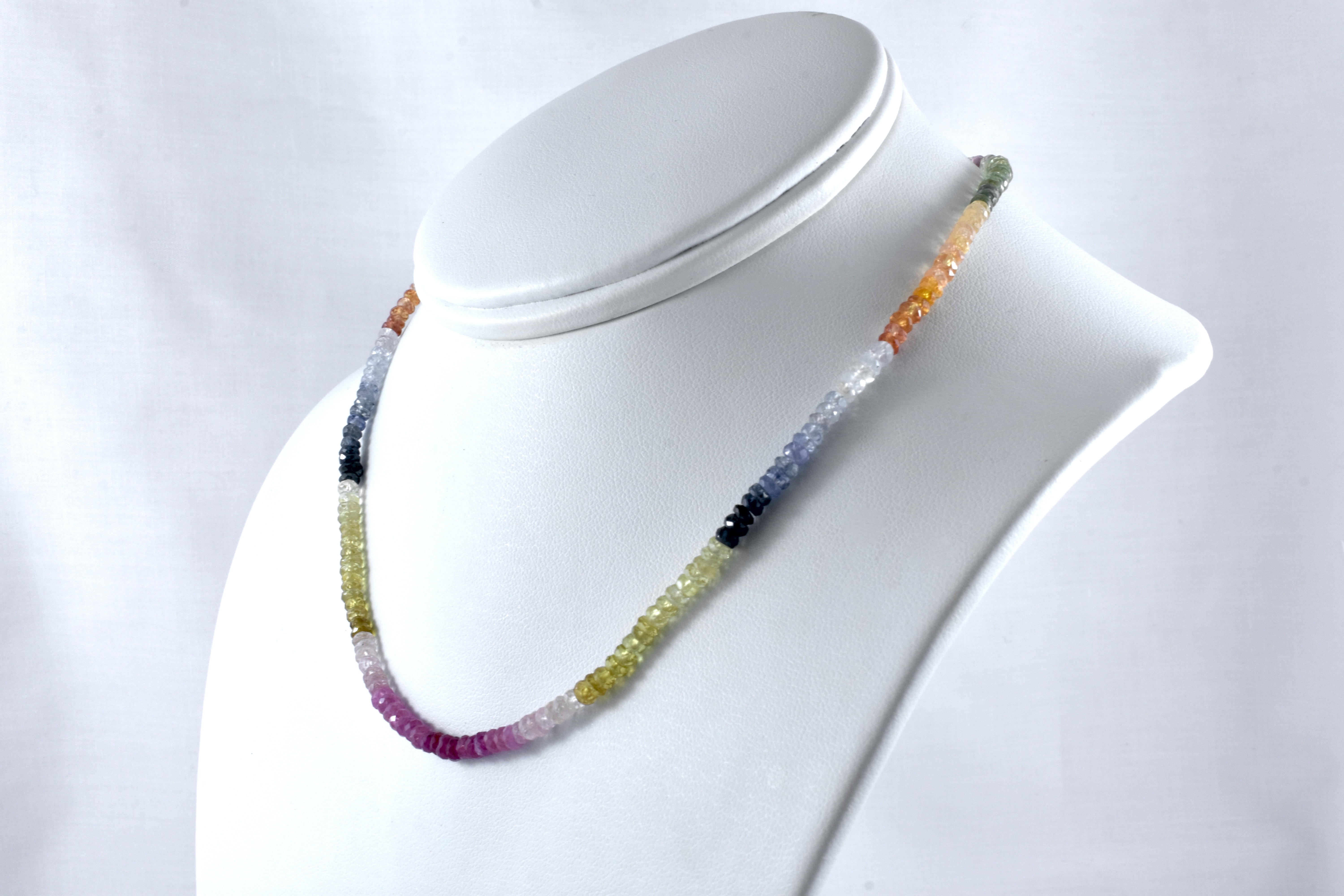 This gorgeous, rainbow strand of flattened, 3.5mm faceted multicoloured sapphires is in a dainty choker length of 38cm and finished with a 6mm round polished sterling silver ball clasp. Total of 193 sapphires in tones of pink, blue, orange, yellow, green and purplish grey