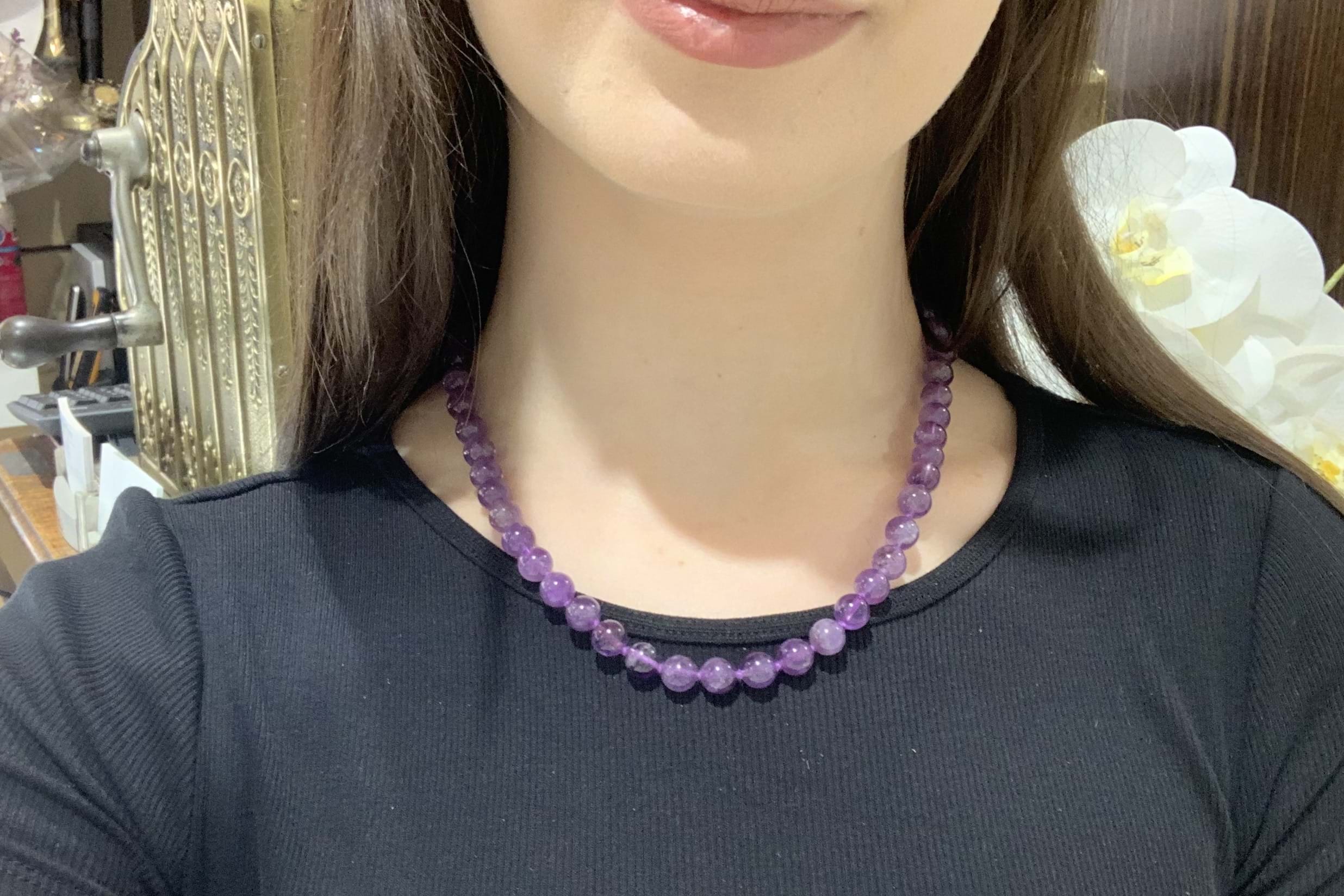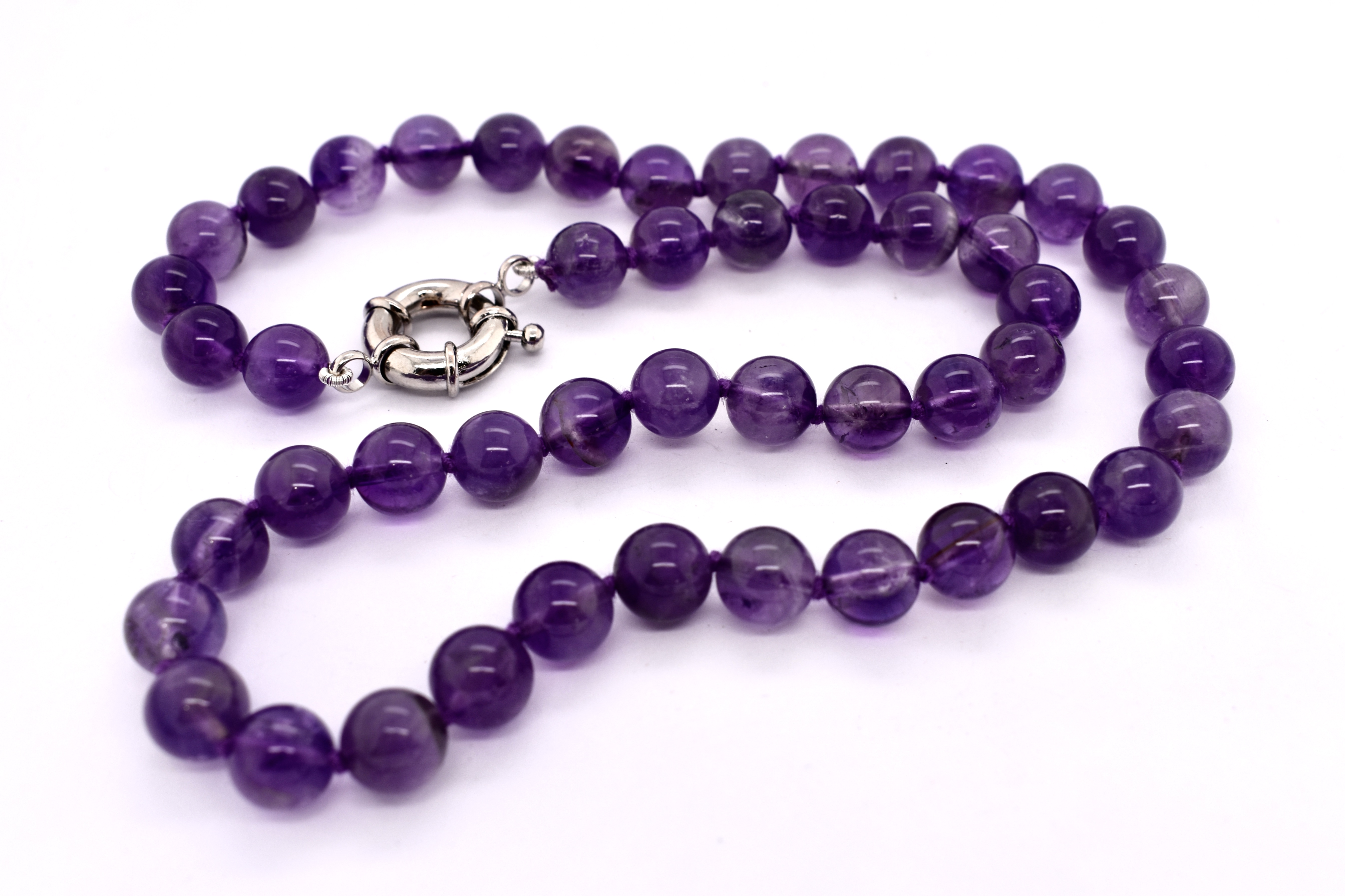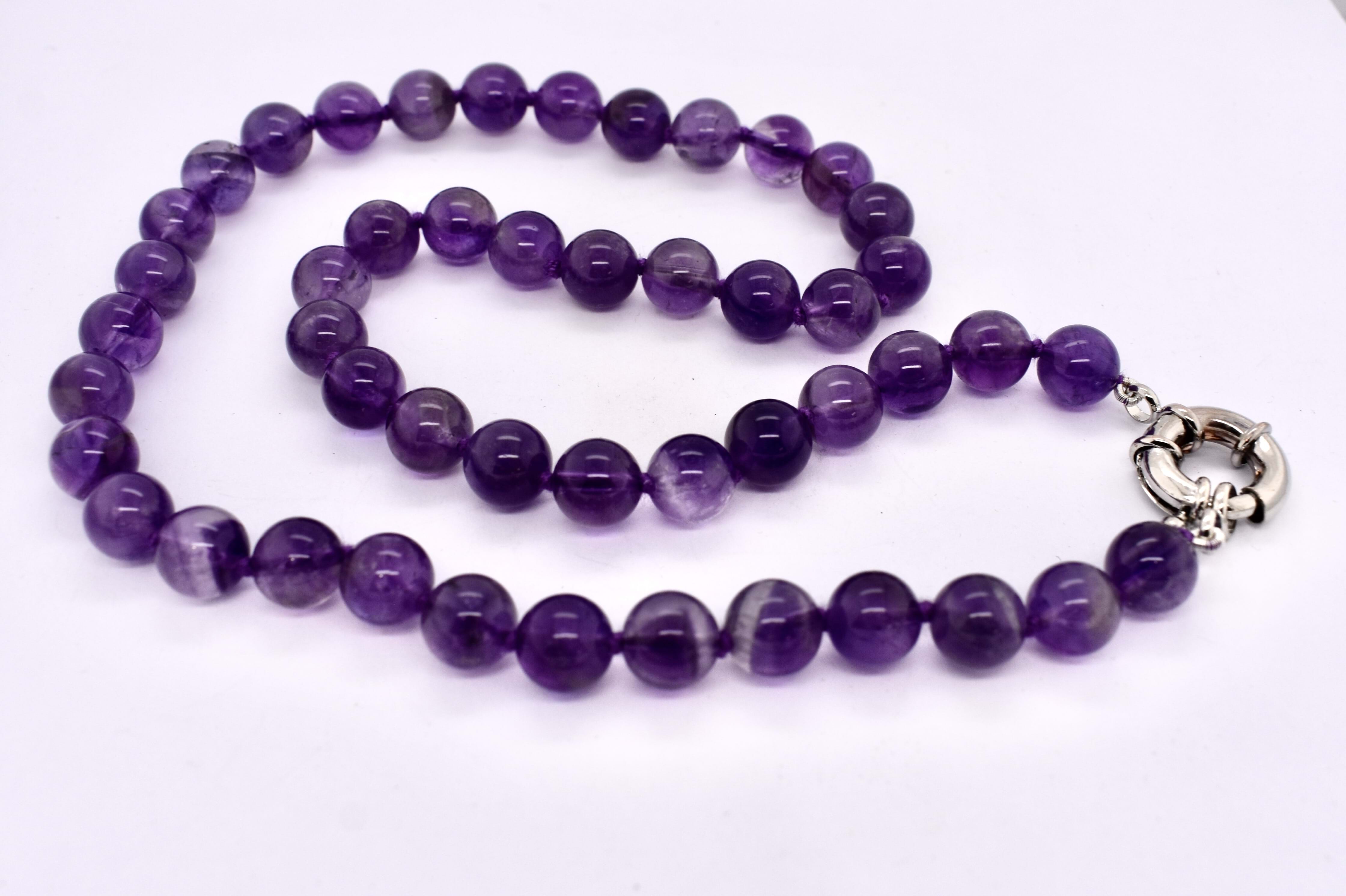 Perfect pop of colour, this purple amethyst bead strand, measuring 48cm long consists of round 8.6mm approx beads. The strand is completed with a steel boltring, perfect to hang pendants from.
