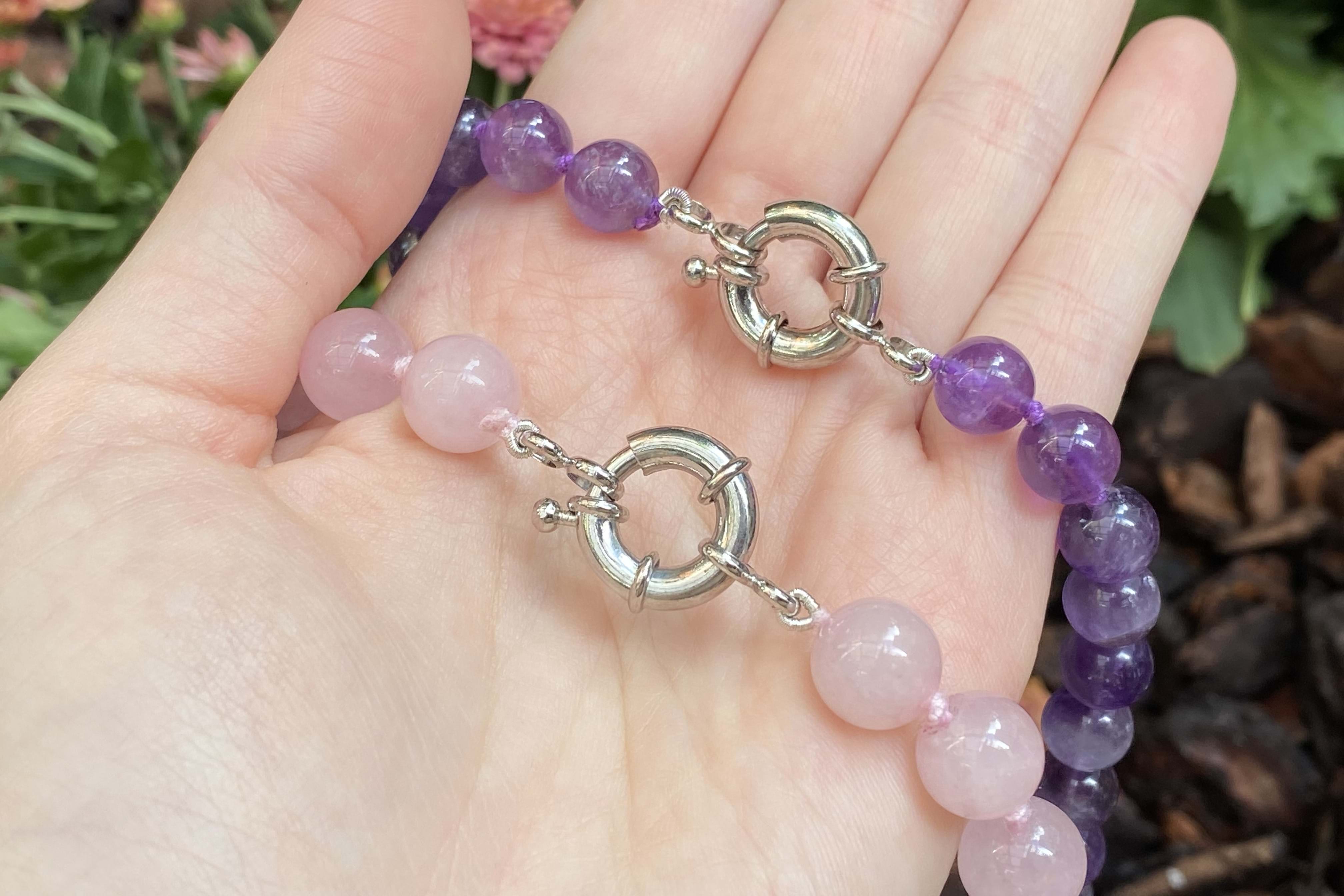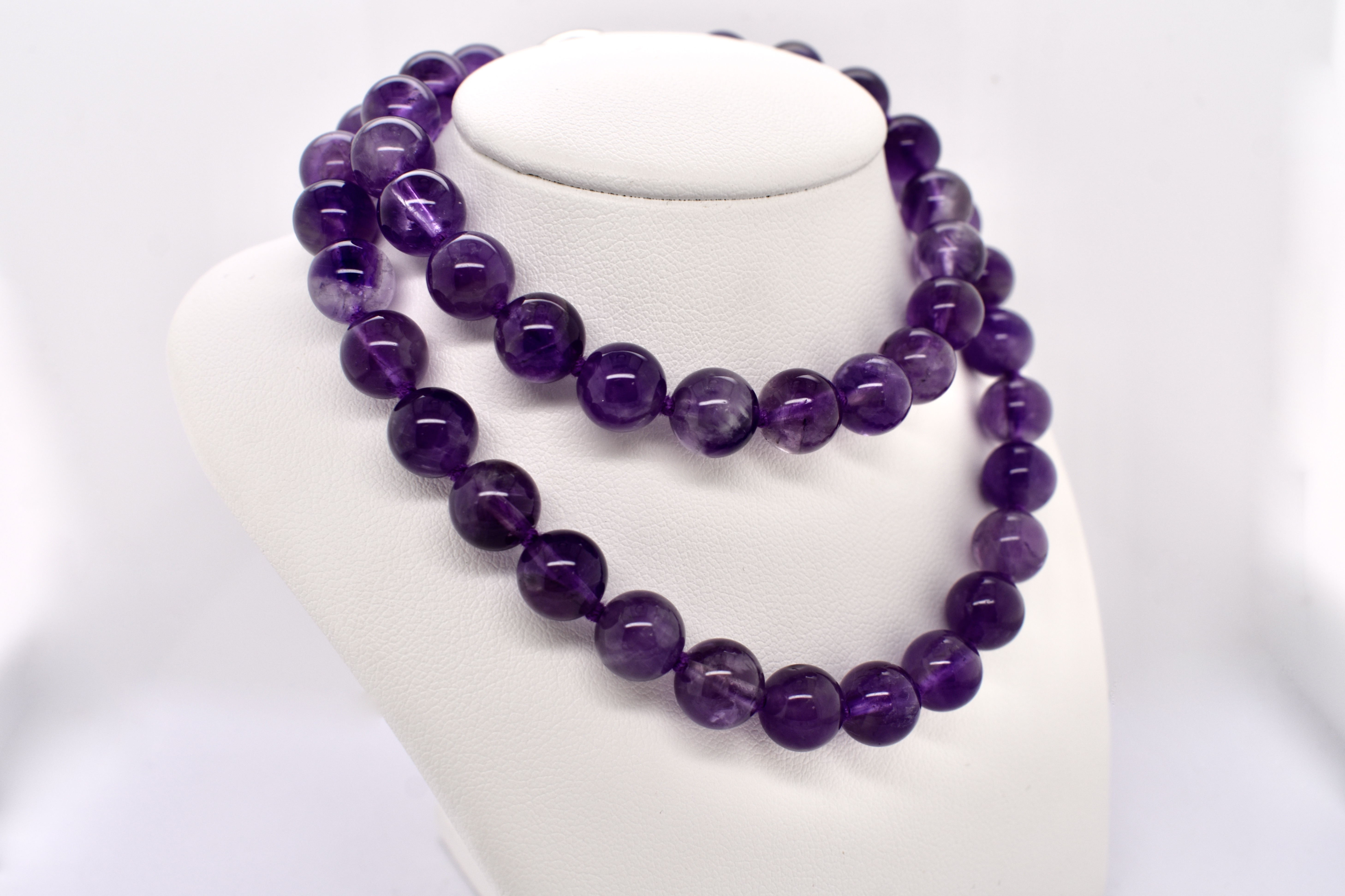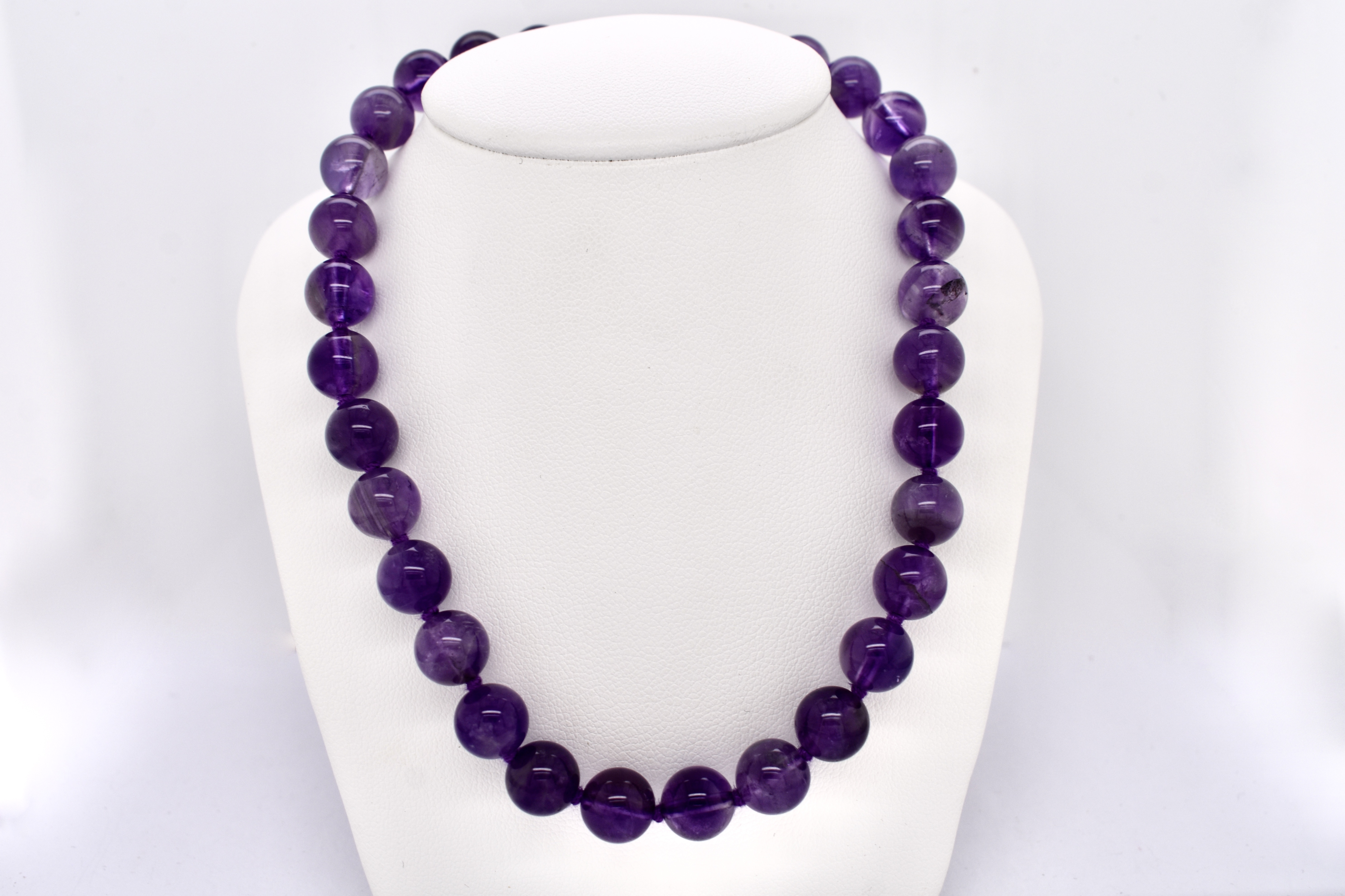 Perfect pop of colour, this purple amethyst bead strand, measuring 48cm long consists of round 8.6mm approx beads. The strand is completed with a steel boltring, perfect to hang pendants from.