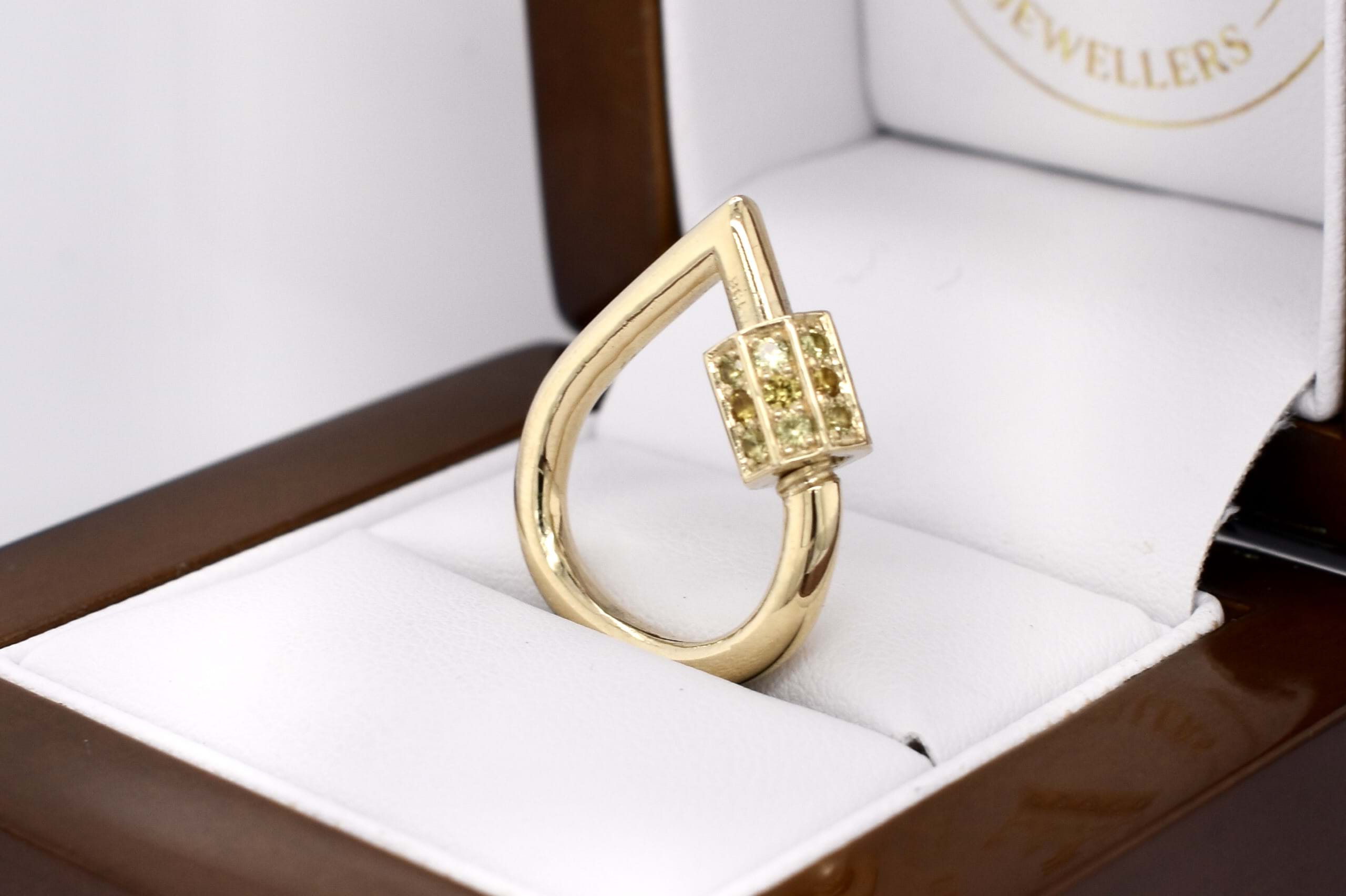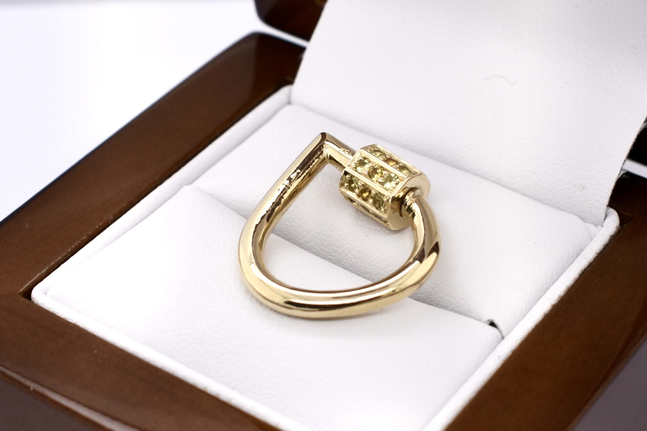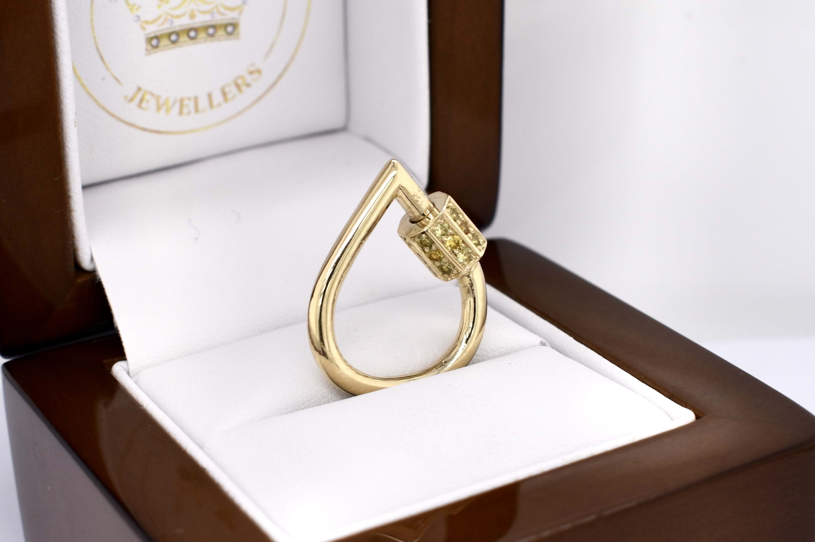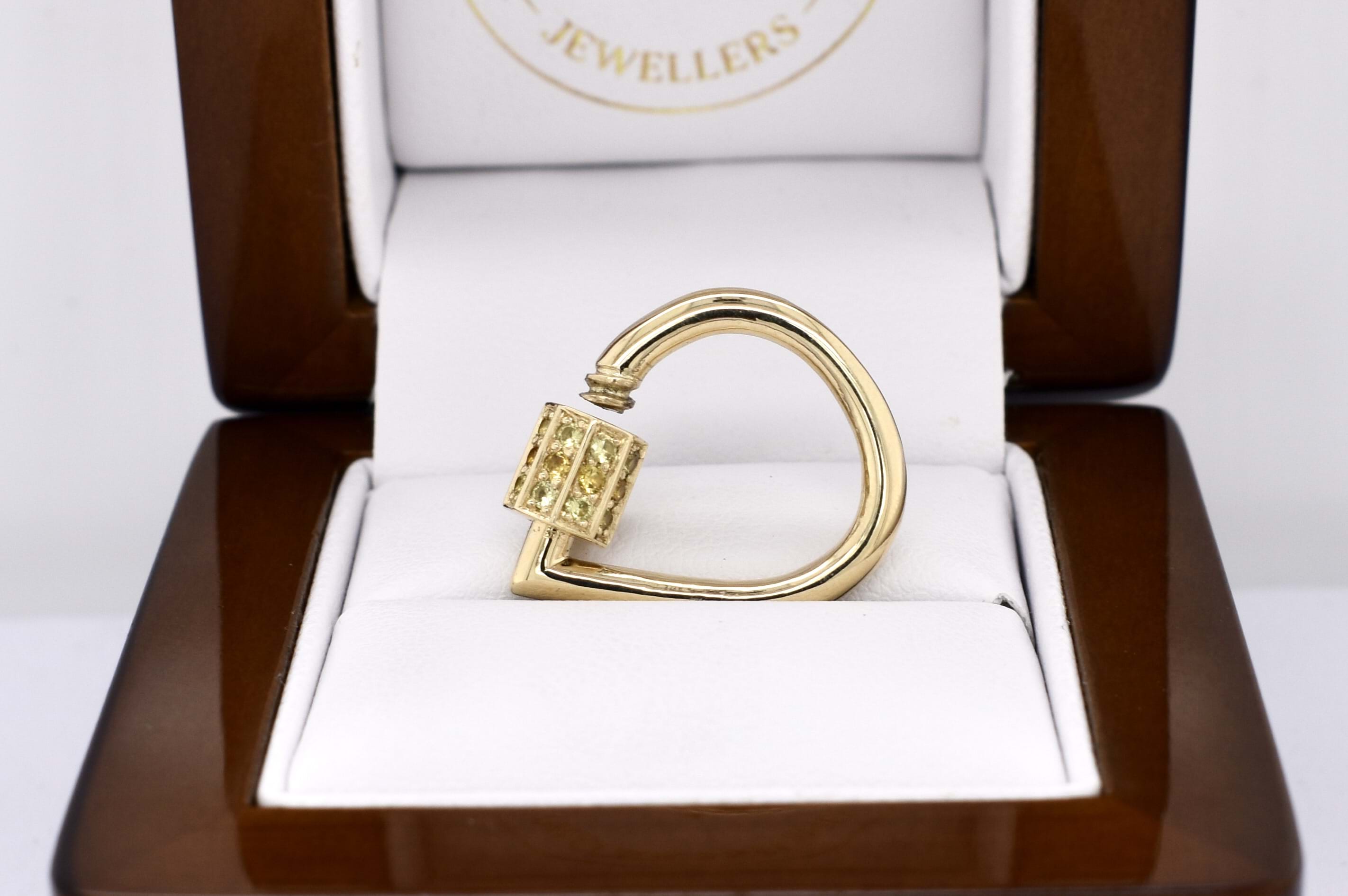 A contemporary and stylish statement accessory with a pop of colour, this teardrop shaped carabiner is crafted in 9ct yellow gold with twenty four 1.60-1.70mm round sapphires set into the barrel. It contains eight dark yellow and sixteen light yellow sapphires, totalling 0.75ct. This has been designed as a multipurpose piece which can act primarily as a clasp but also as a linking or extending accessory; to hang a pendant or enhancer from or even be a pendant itself. Pair it with a yellow gold chain for continuity or white gold for a bold contrast. Carabiner measures approx. 25x20mm. Independent Valuation Supplied.