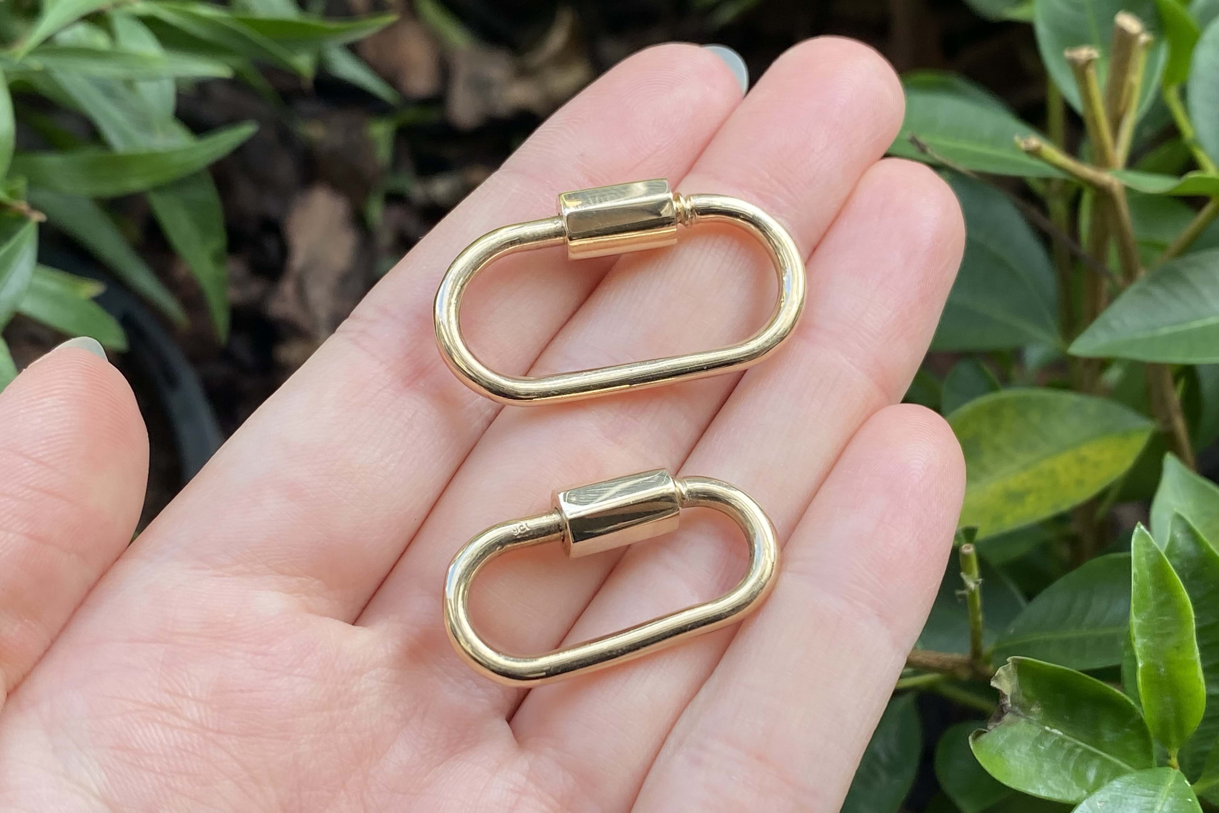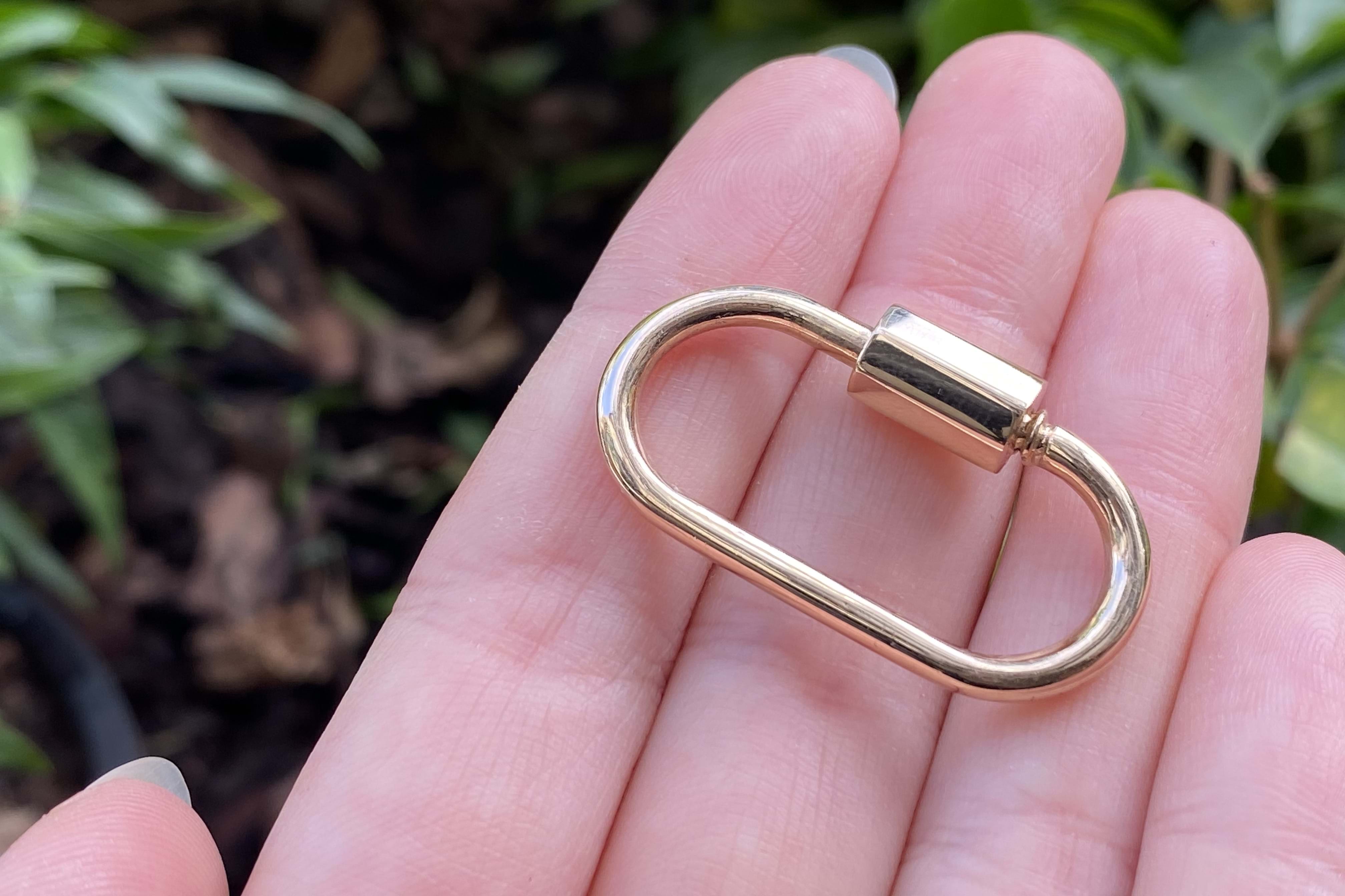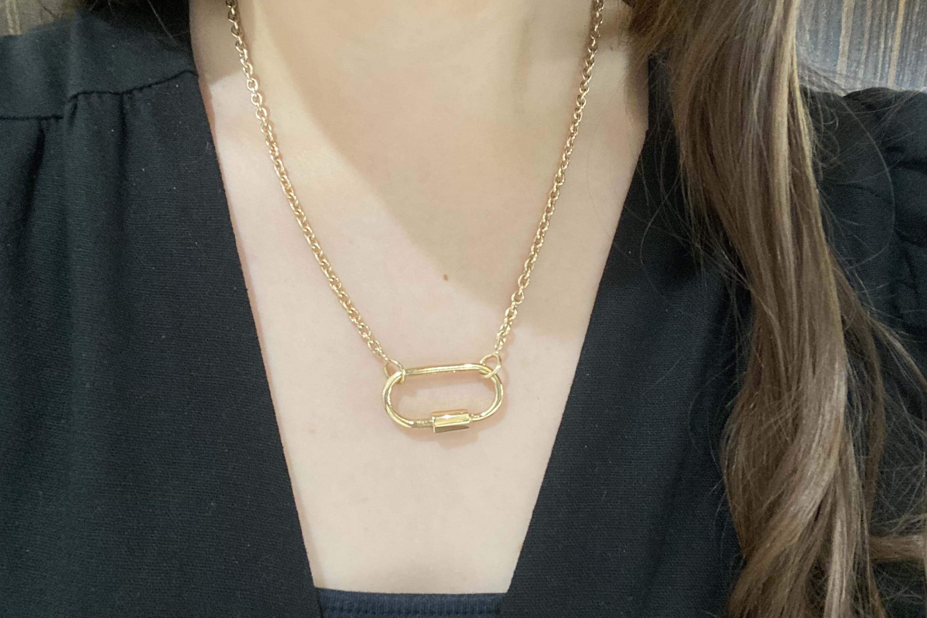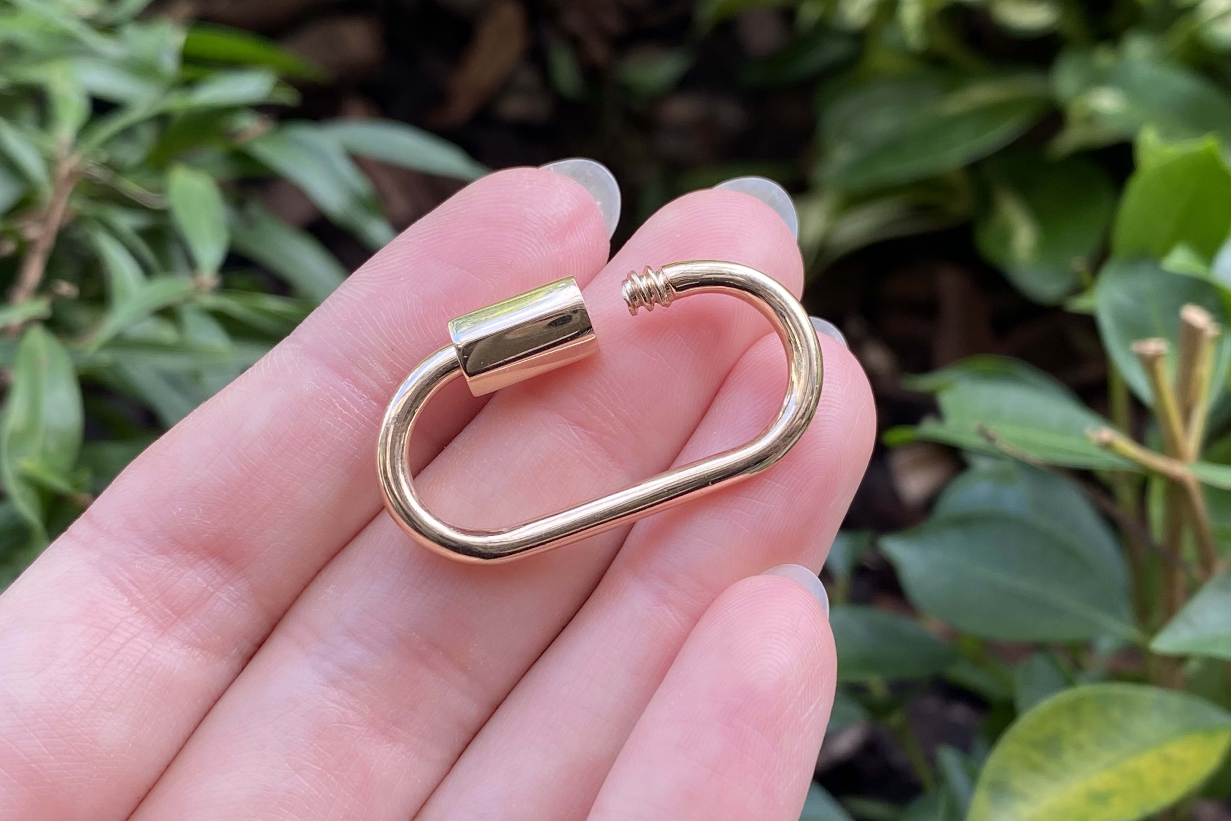 We have upscaled a customer favourite of ours! This large oval carabiner is crafted in 9ct yellow gold and has been designed as a multipurpose piece which can act primarily as a clasp but also as a linking or extending accessory; to hang a pendant or enhancer from or even be a pendant itself. Pair it with a gold chain for continuity or white gold for a bold contrast. Carabiner measures approx. 35x27mm