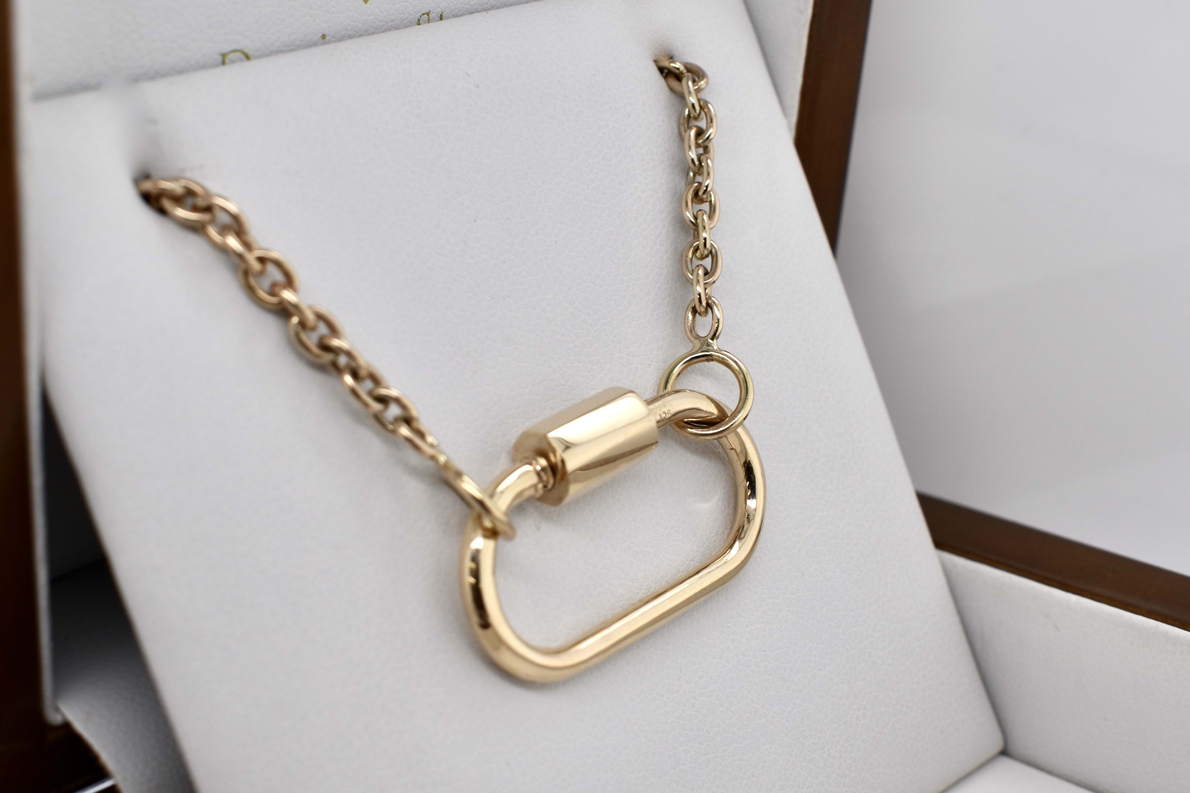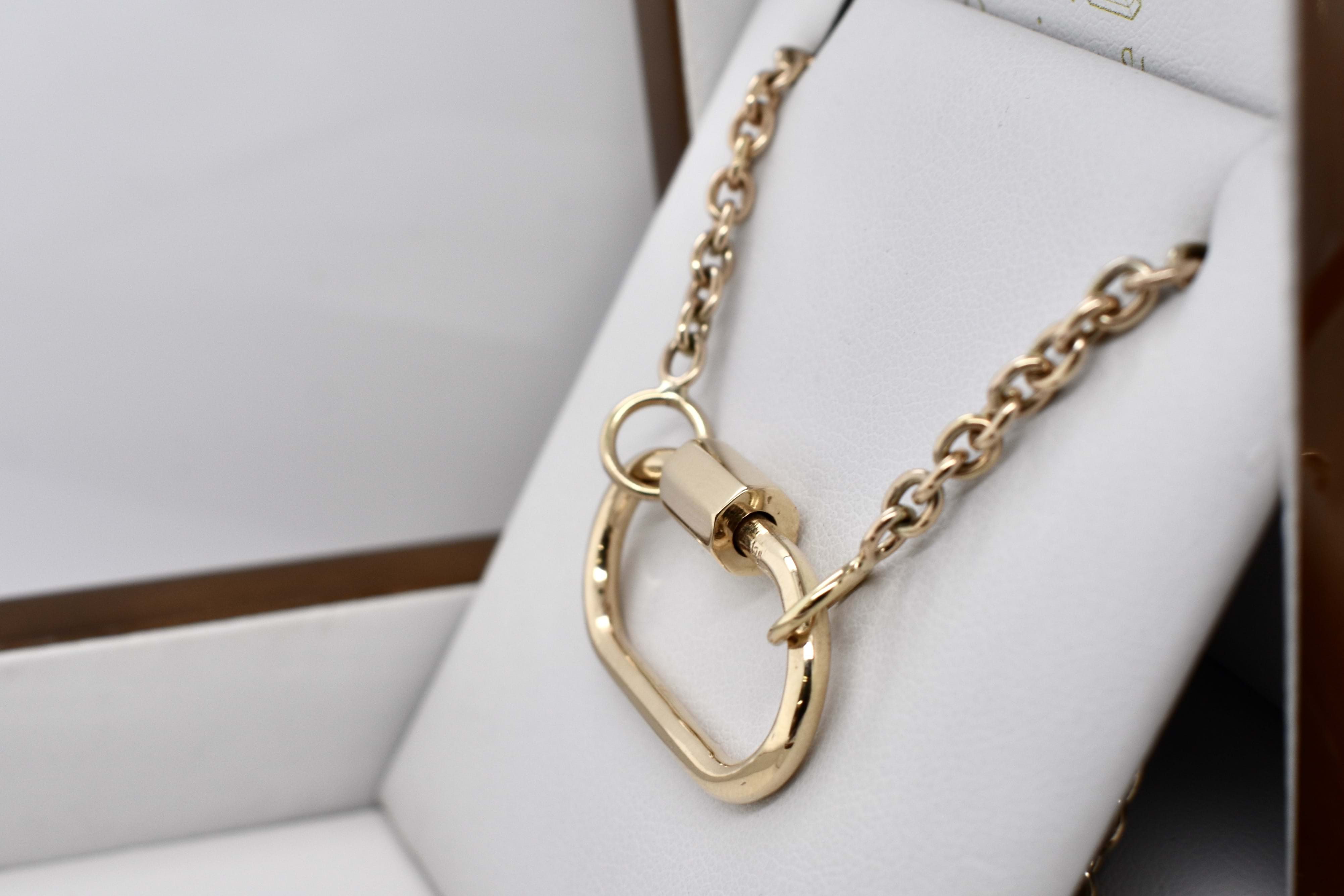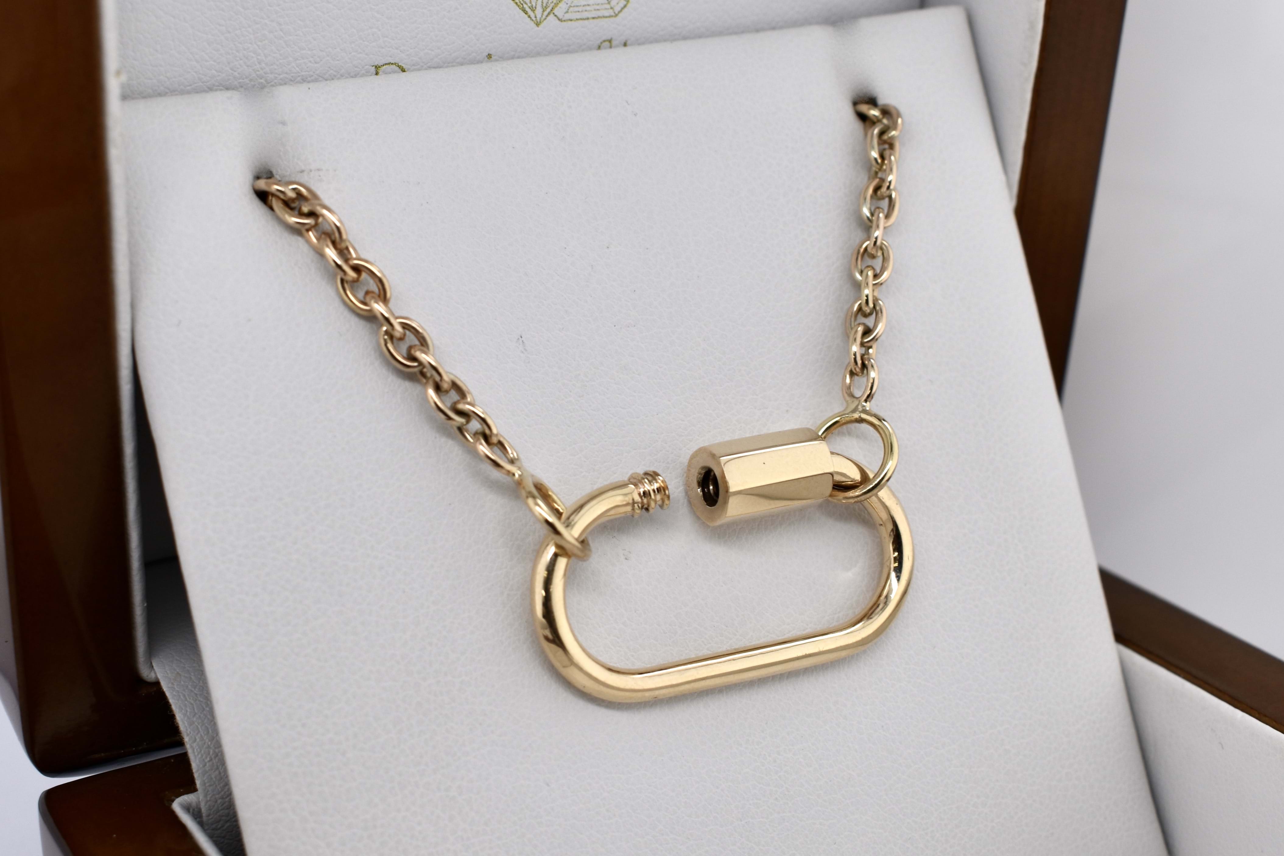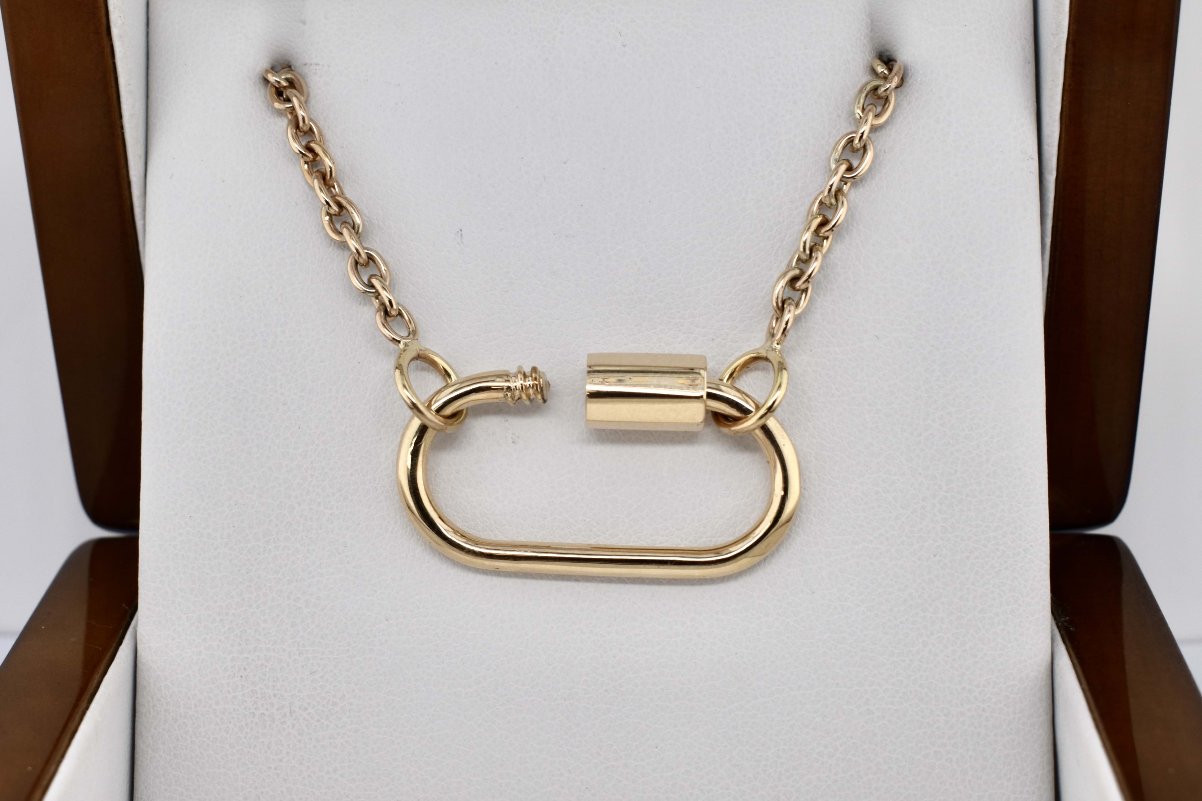 We have upscaled a customer favourite of ours! This large oval carabiner is crafted in 9ct yellow gold and has been designed as a multipurpose piece which can act primarily as a clasp but also as a linking or extending accessory; to hang a pendant or enhancer from or even be a pendant itself. Pair it with a gold chain for continuity or white gold for a bold contrast. Carabiner measures approx. 35x27mm