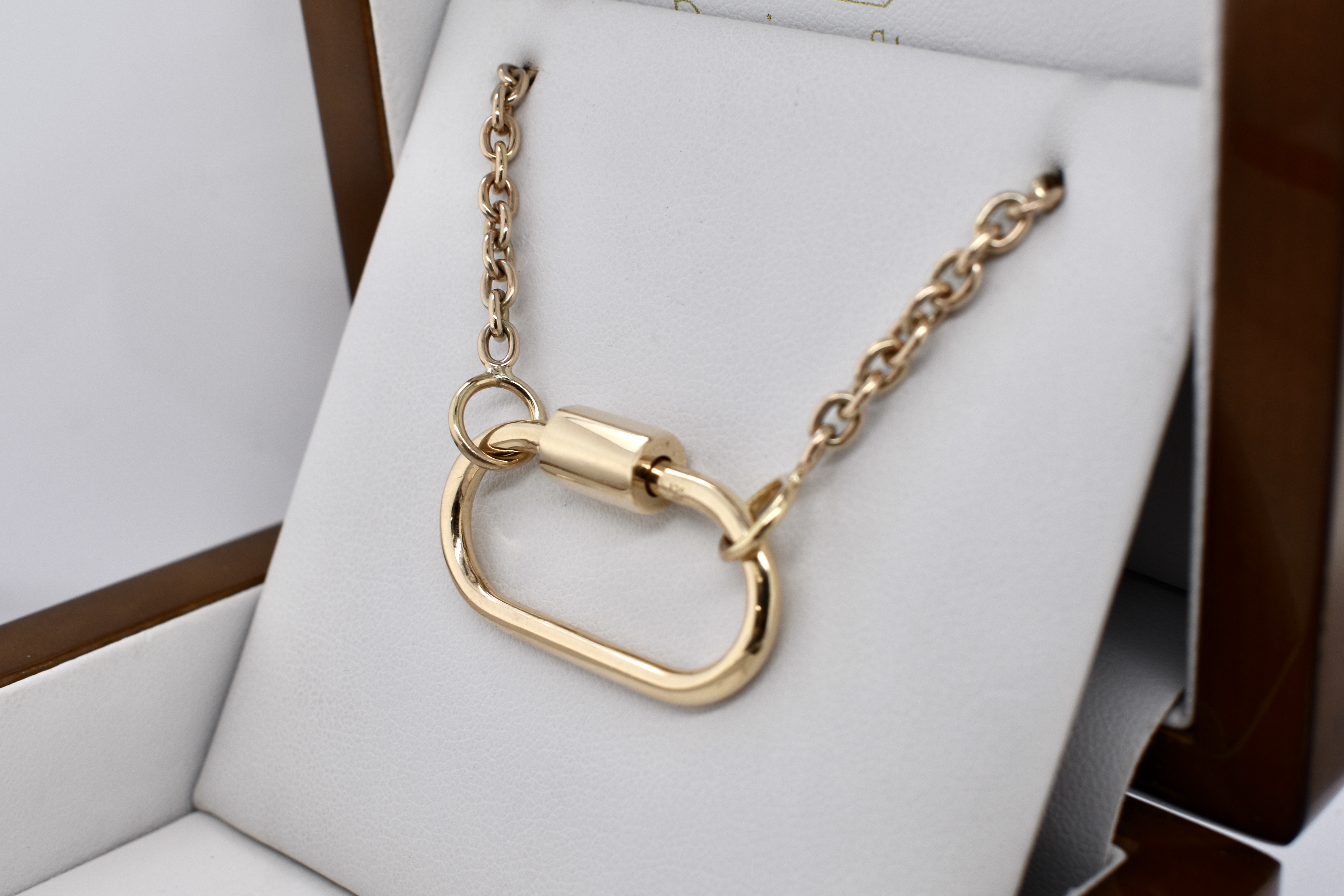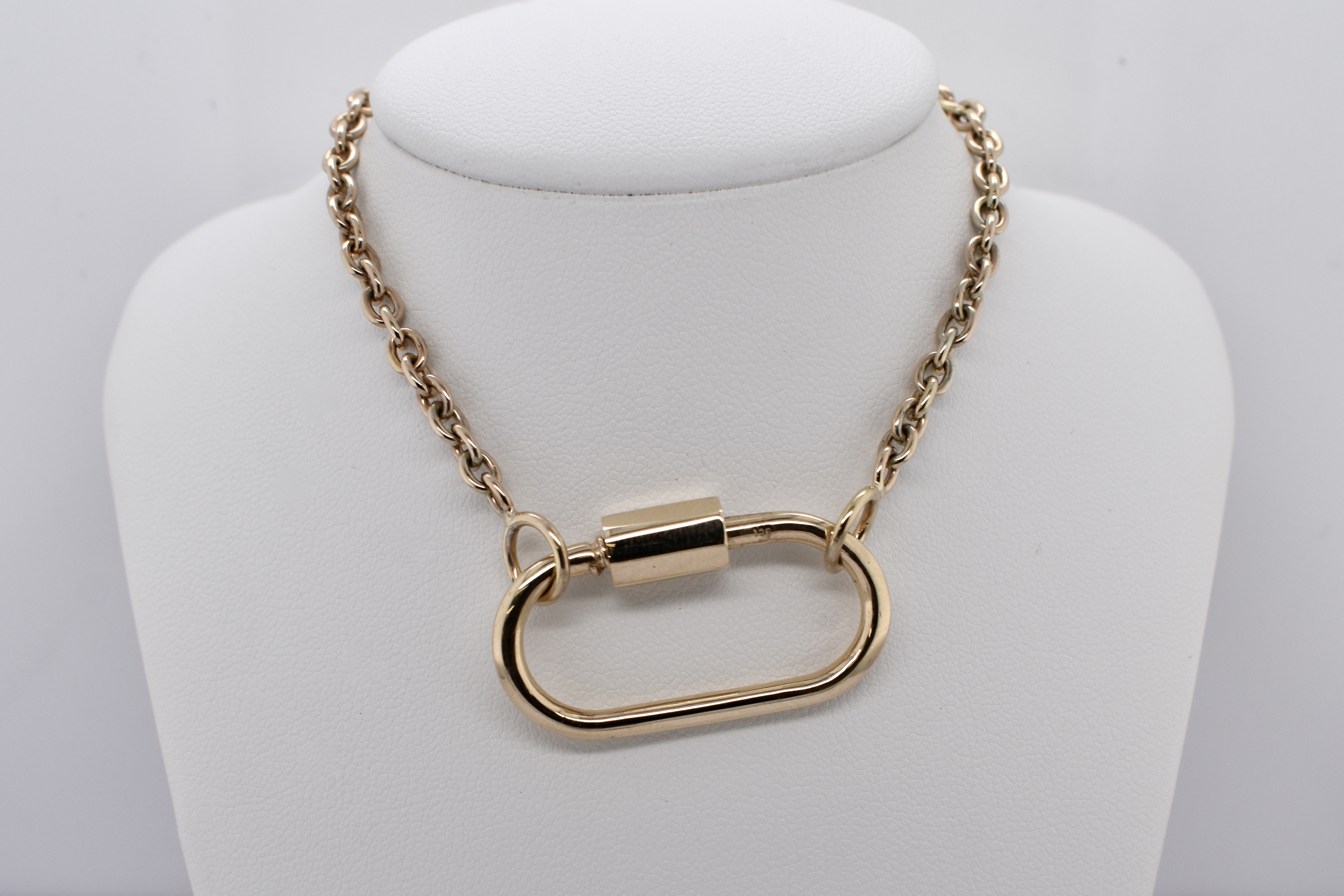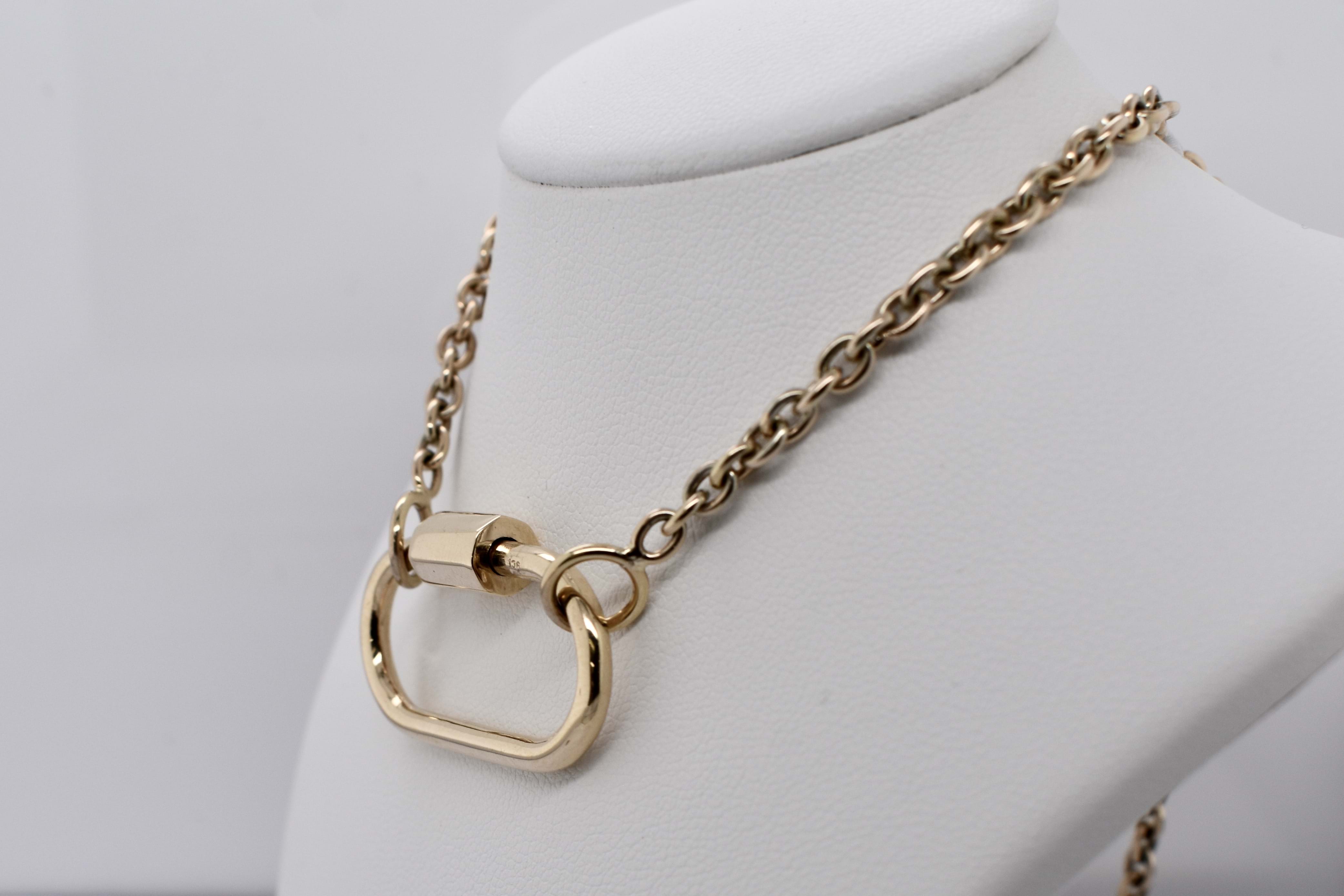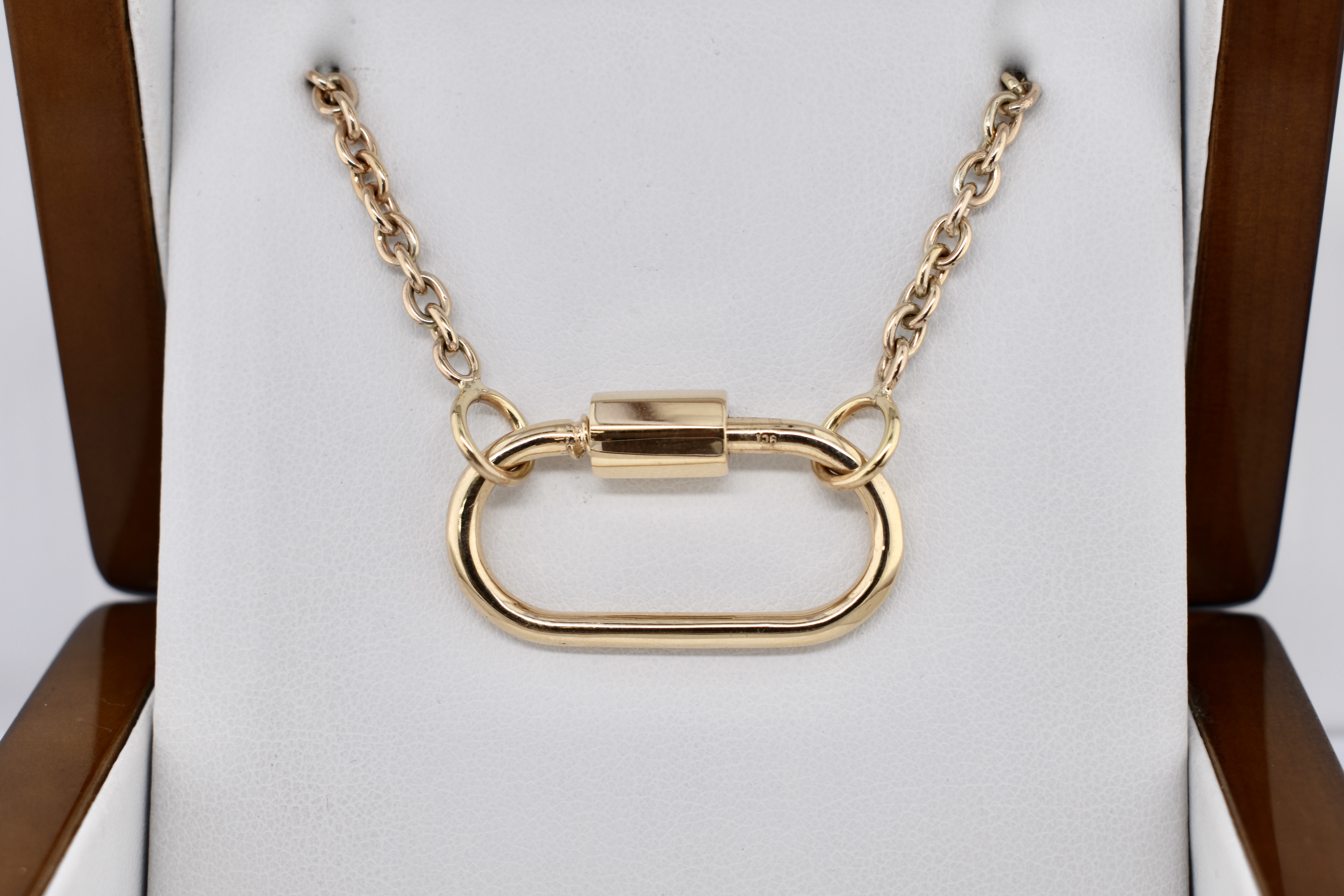 We have upscaled a customer favourite of ours! This large oval carabiner is crafted in 9ct yellow gold and has been designed as a multipurpose piece which can act primarily as a clasp but also as a linking or extending accessory; to hang a pendant or enhancer from or even be a pendant itself. Pair it with a gold chain for continuity or white gold for a bold contrast. Carabiner measures approx. 35x27mm