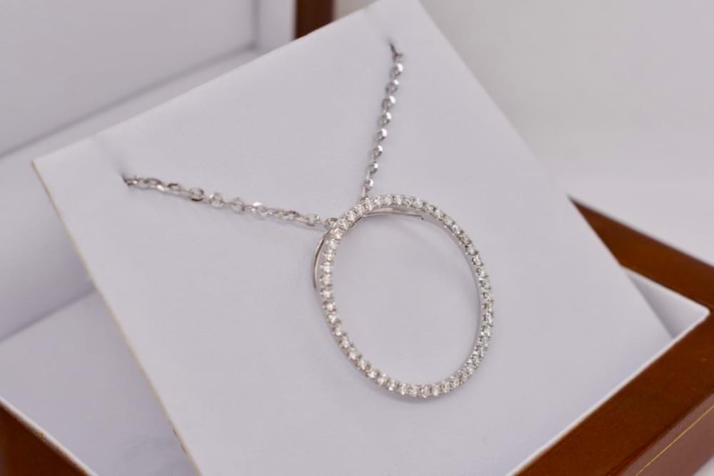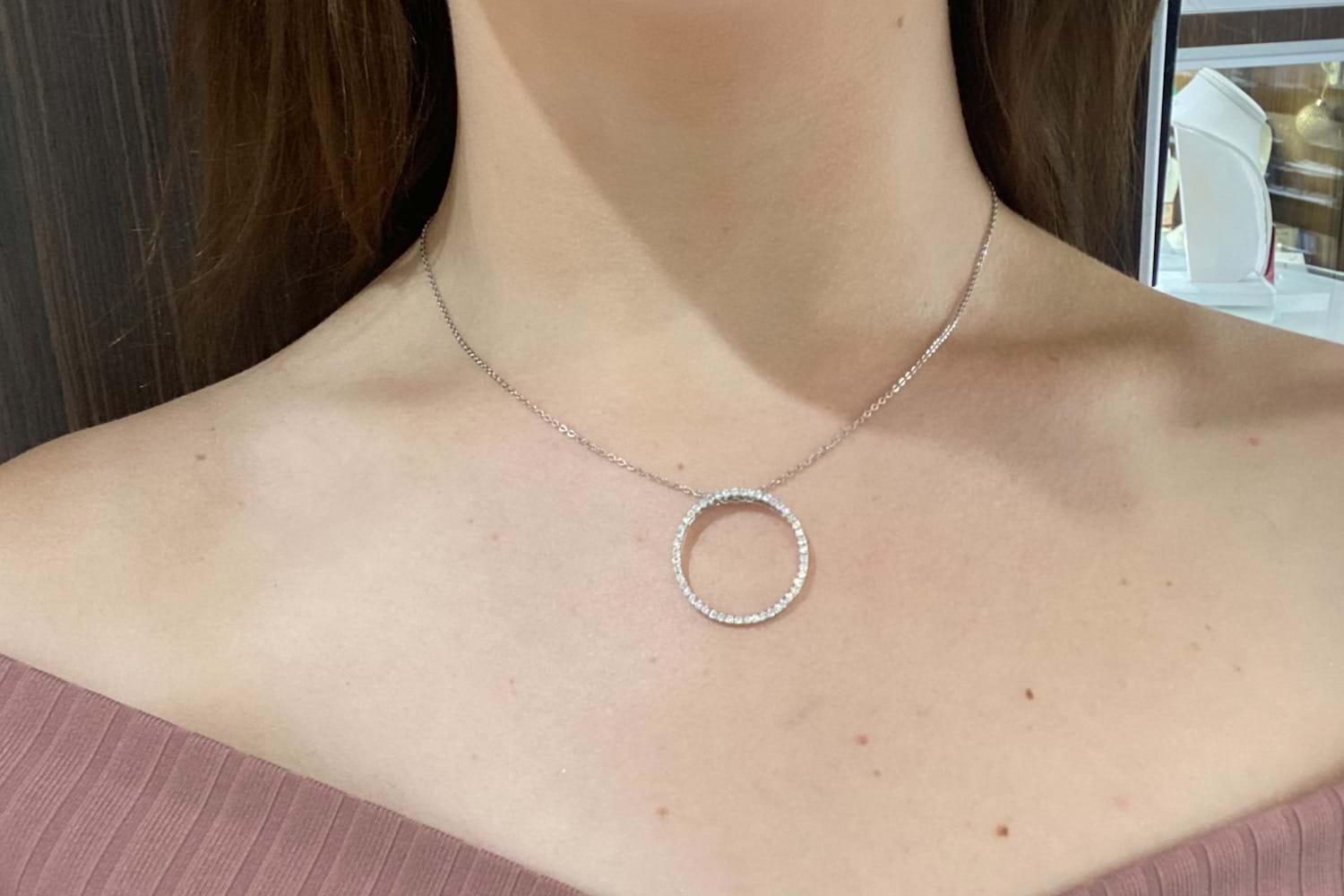 A simple and contemporary pendant crafted in 18ct white gold featuring 48 sparkling round brilliant cut diamonds in a single row circle pendant. Designed to slide along the chain of your choice, this stunning pendant contains a total of 0.51cts. Independent Valuation Supplied