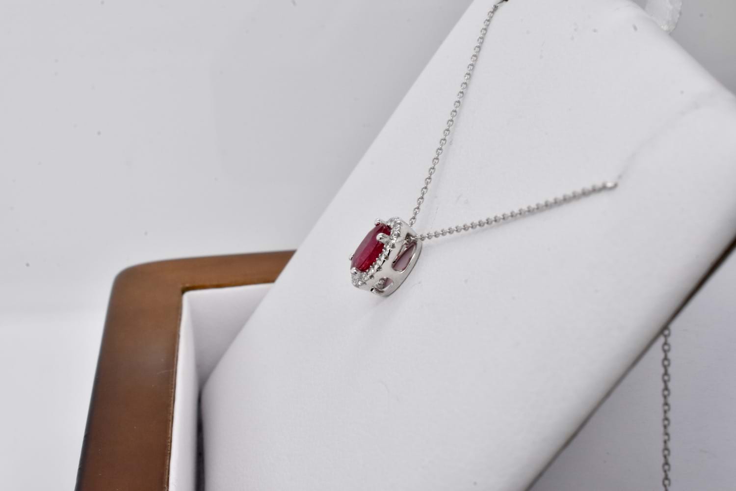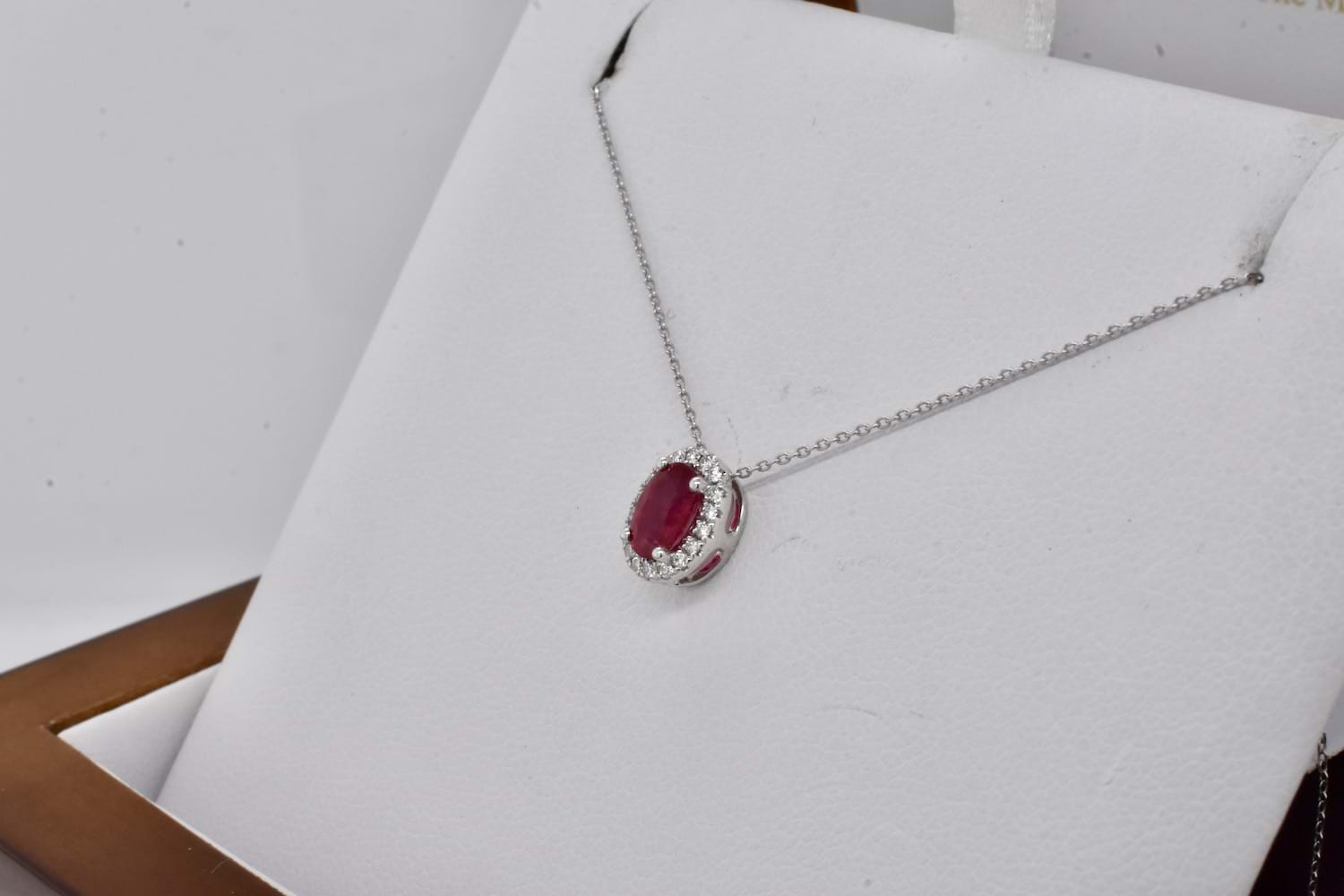 Beautiful and timeless necklace crafted in 18ct white gold featuring a 0.55ct oval ruby four claw set surrounded by a single halo of shimmering round brilliant cut diamonds totalling 0.08cts (FG/SI) in a slide style pendant on a 45cm trace link chain. Independent Valuation Supplied