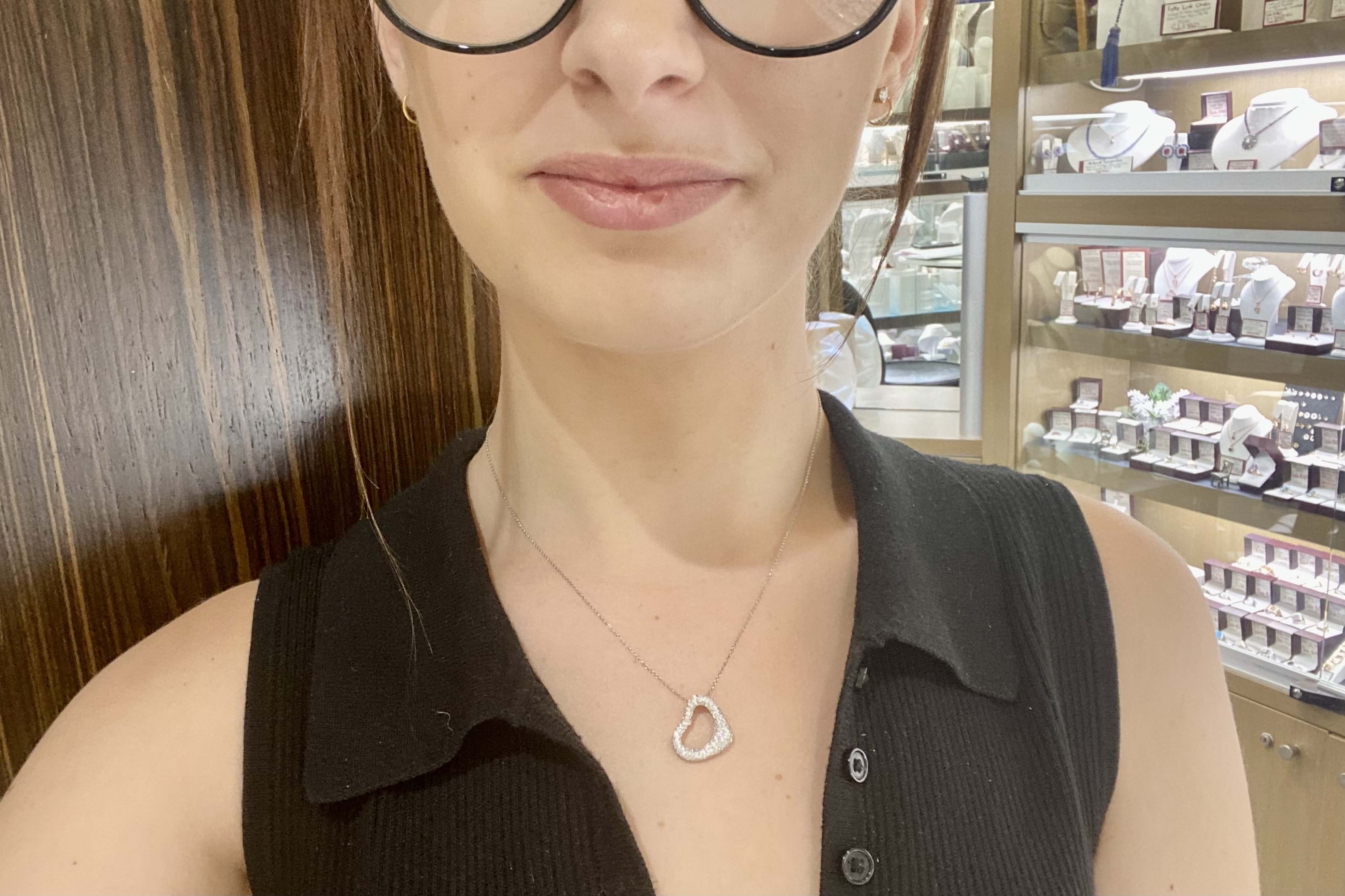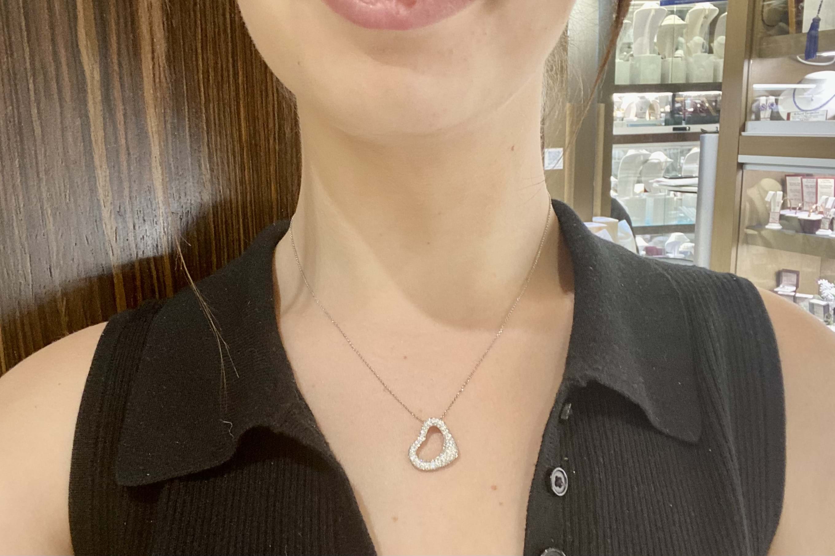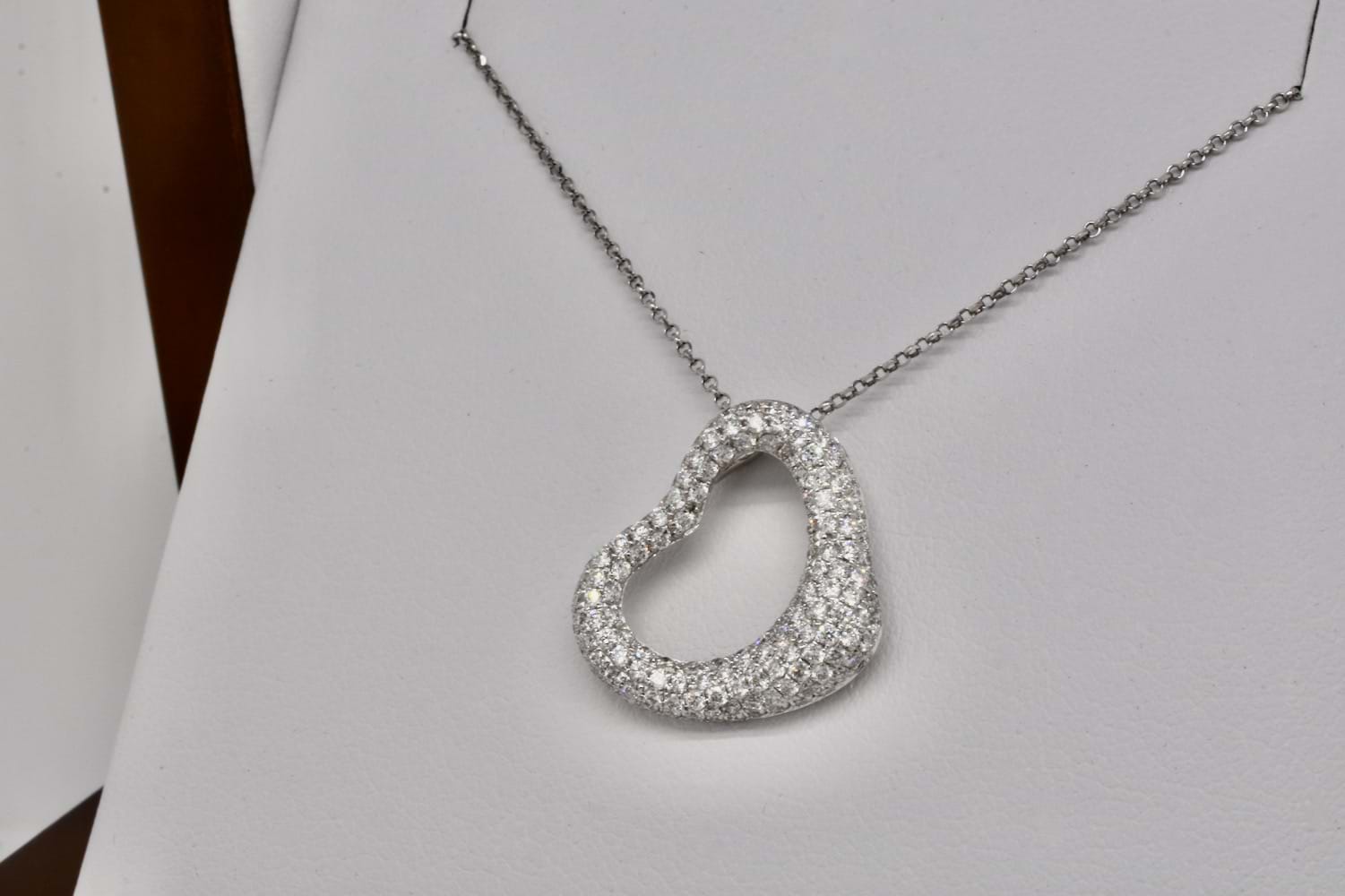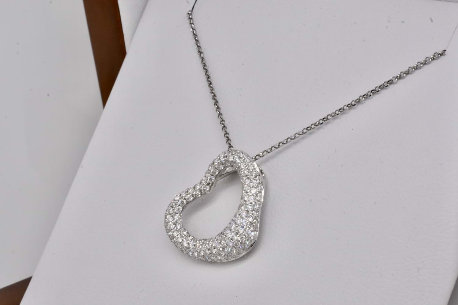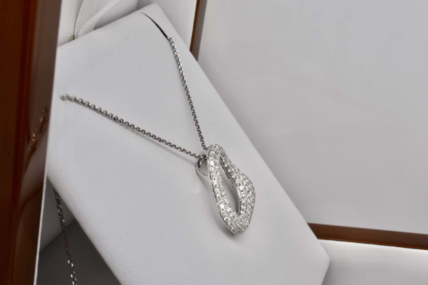 Sparkling and beautiful paved heart pendant encrusted with an amazing 141 shimmering round brilliant cut diamonds totalling 0.98ct (FG/VS-SI) in 18ct white gold. Suspended on an angle from a trace link 43cm chain. Independent Valuation Supplied