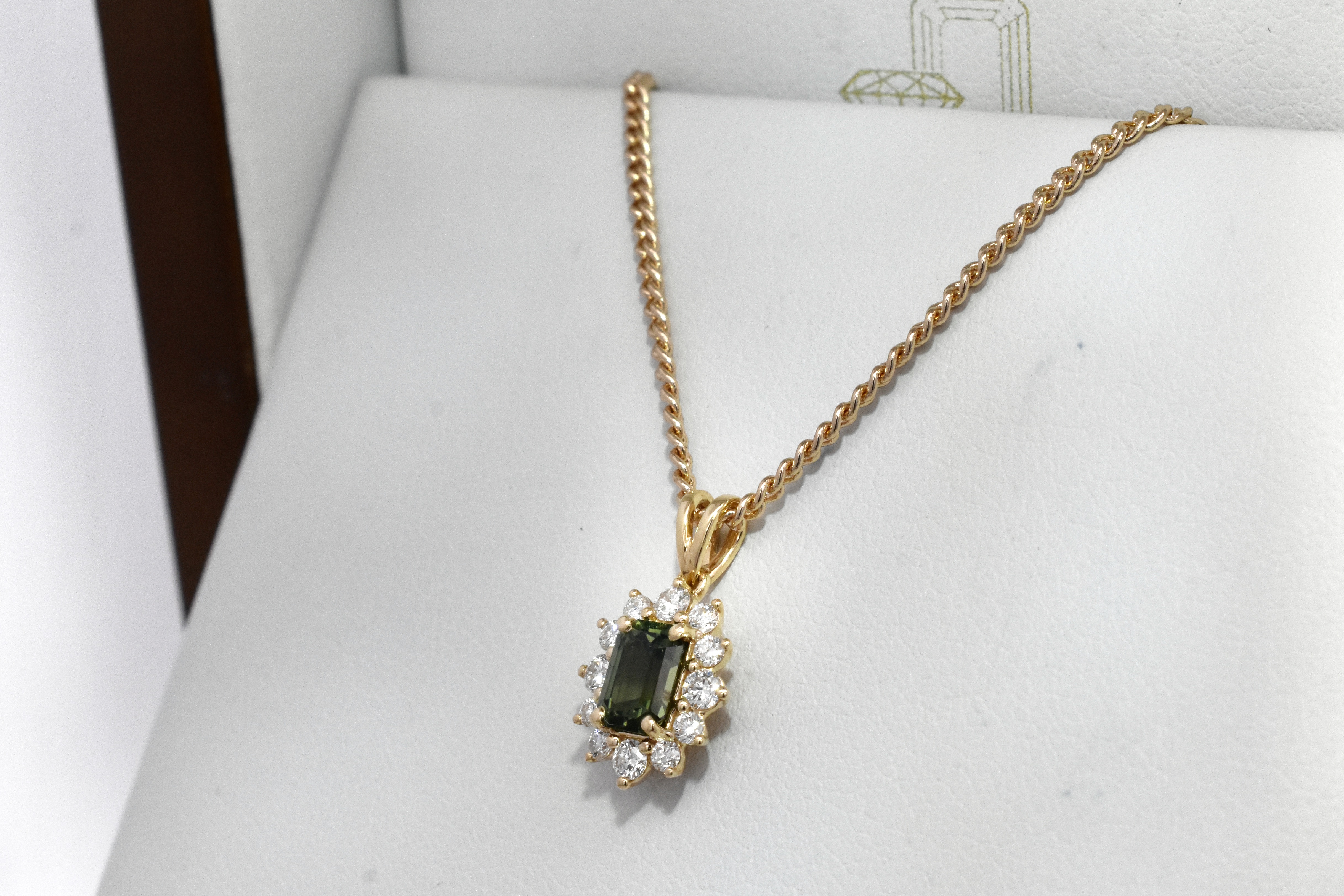Graceful and elegant, this pendant is crafted in 18ct yellow gold and features a centre 0.65ct emerald cut Australian yellowish green parti sapphire set in four claws, with a stunning starburst style surround set with twinkling round brilliant diamonds and finished with a dainty split bail. Total of twelve diamonds equalling 0.30ct GH/SI. Chains available for separate purchase