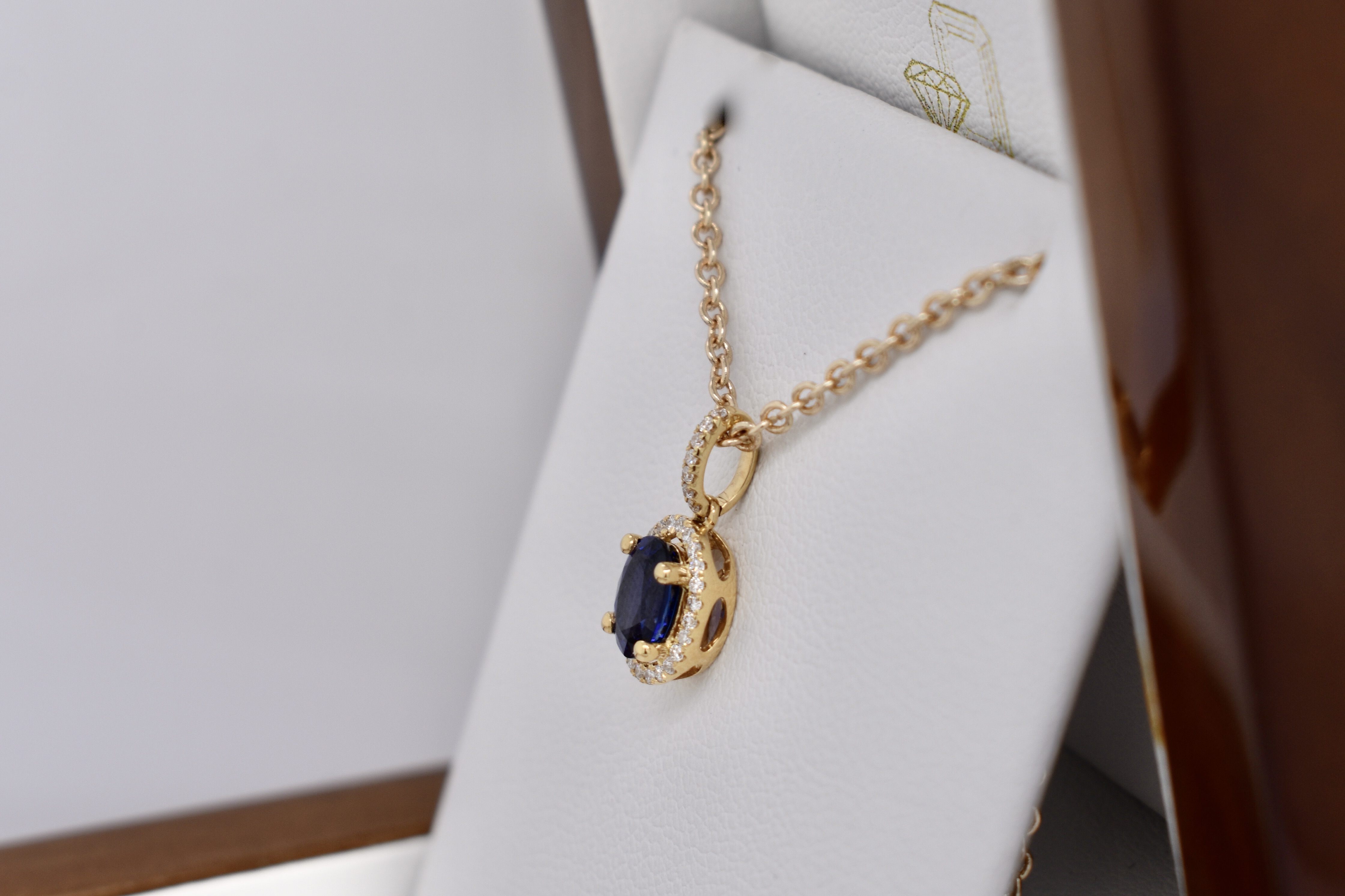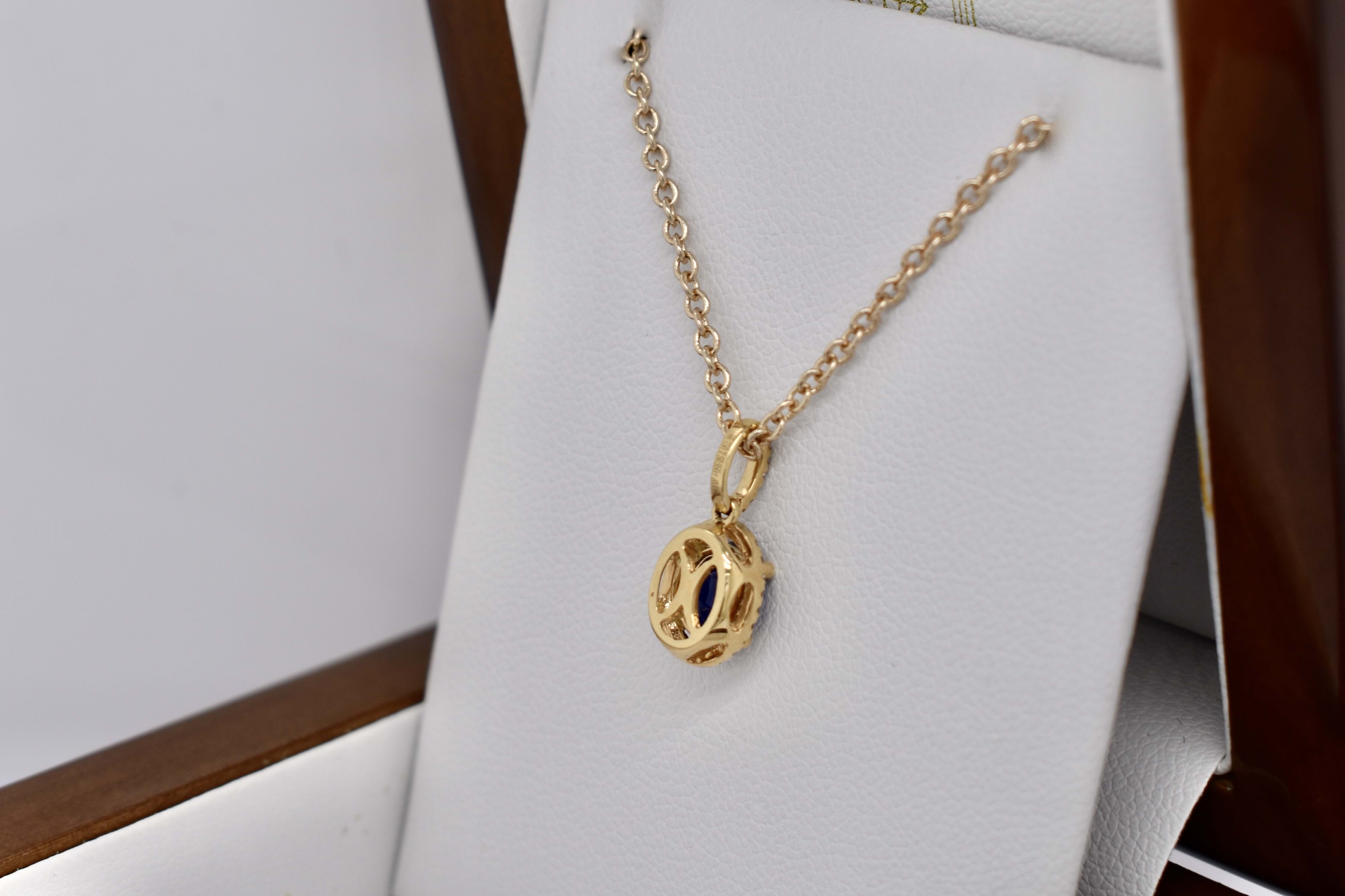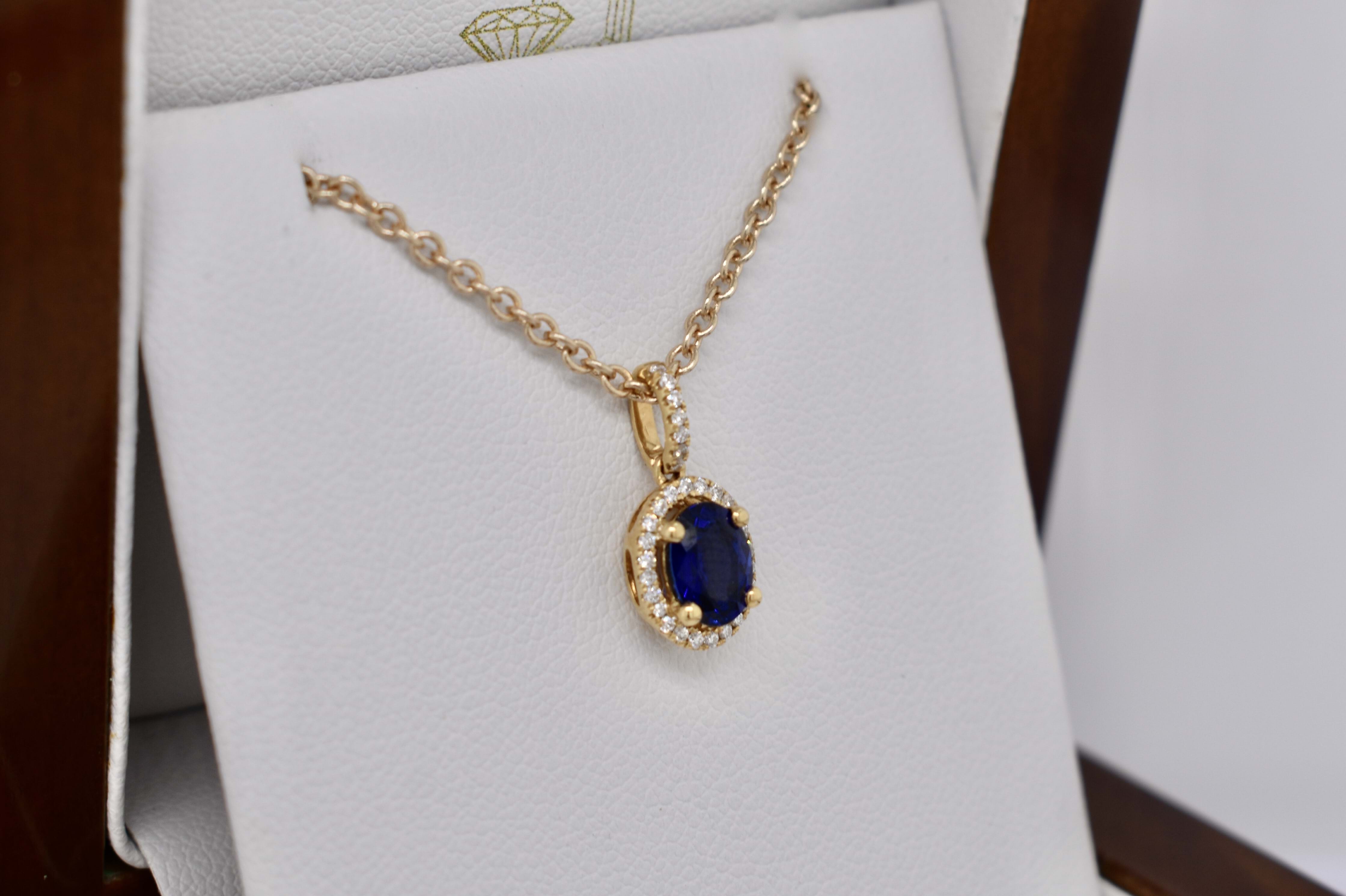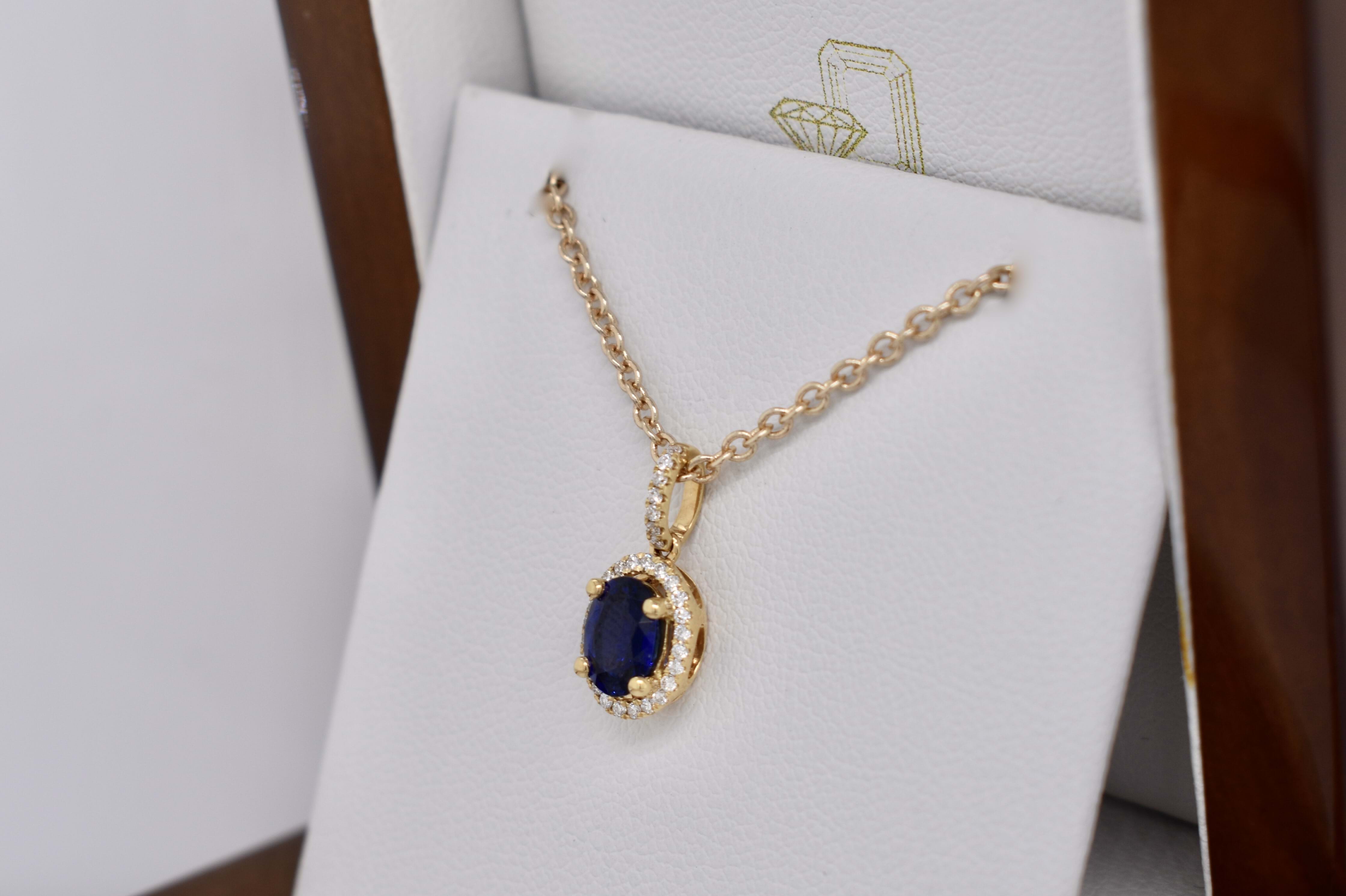 An absolutely stunning, elegant pendant crafted in 18ct yellow gold, with an oval, 6.73x5.04x3.20mm, 0.95ct bright deep blue Ceylon sapphire in four claws. Surrounded with a sparkly halo of white round brilliant cut 0.90mm diamonds which continue up the bail for a total of 31 equalling 0.12ct G SI. 1.20 grams. Chains available for separate purchase. Independent Valuation Supplied
