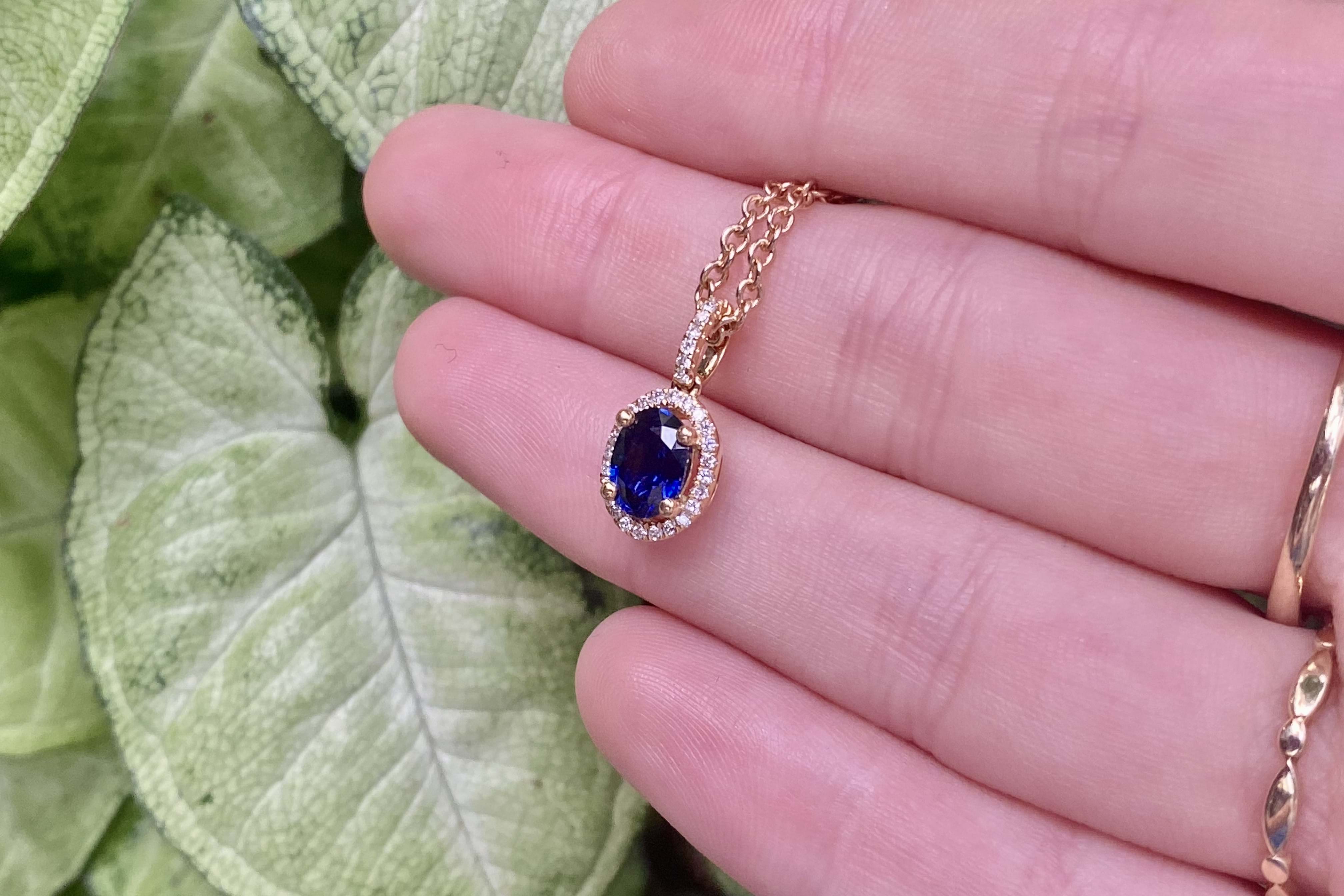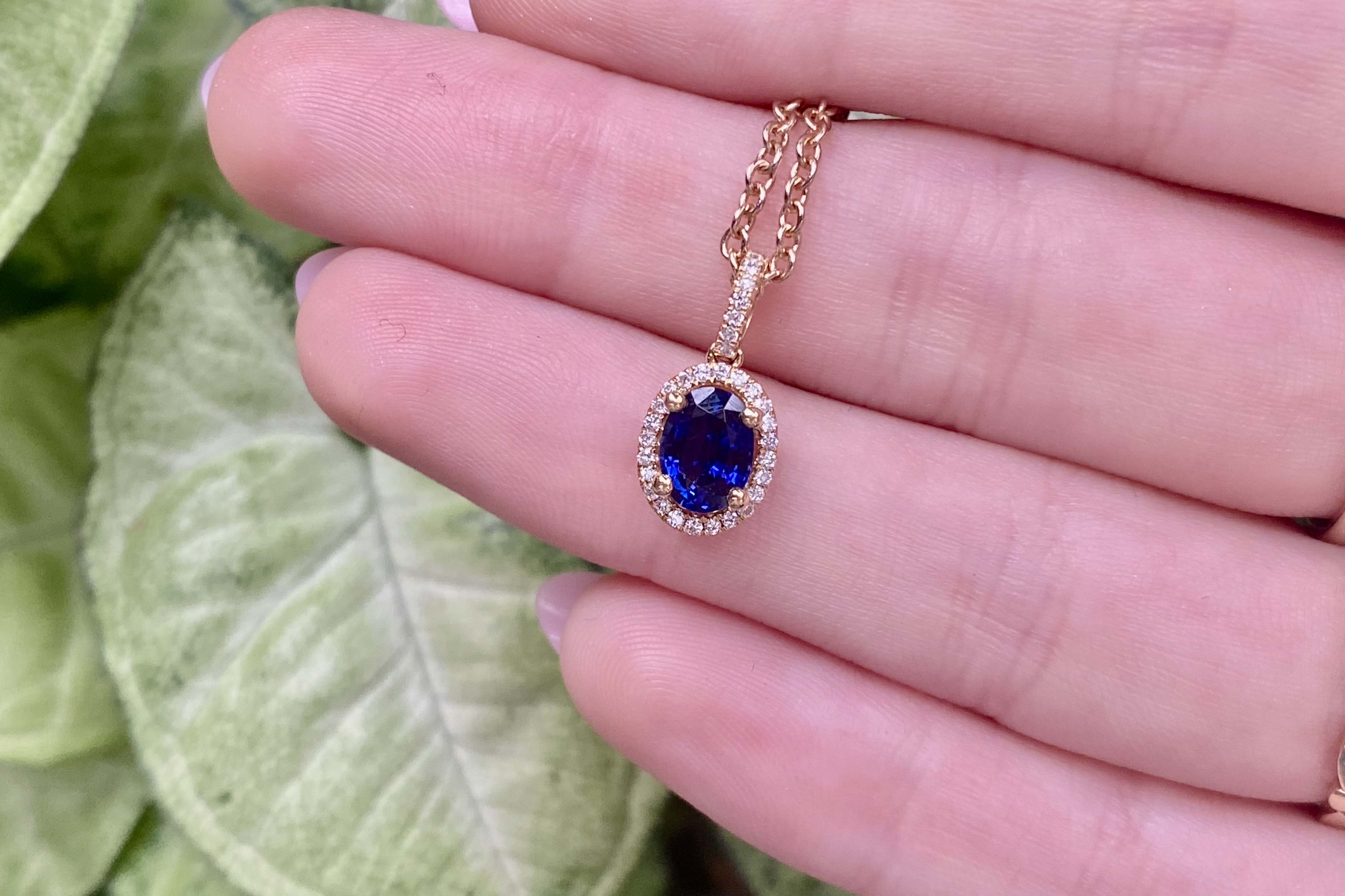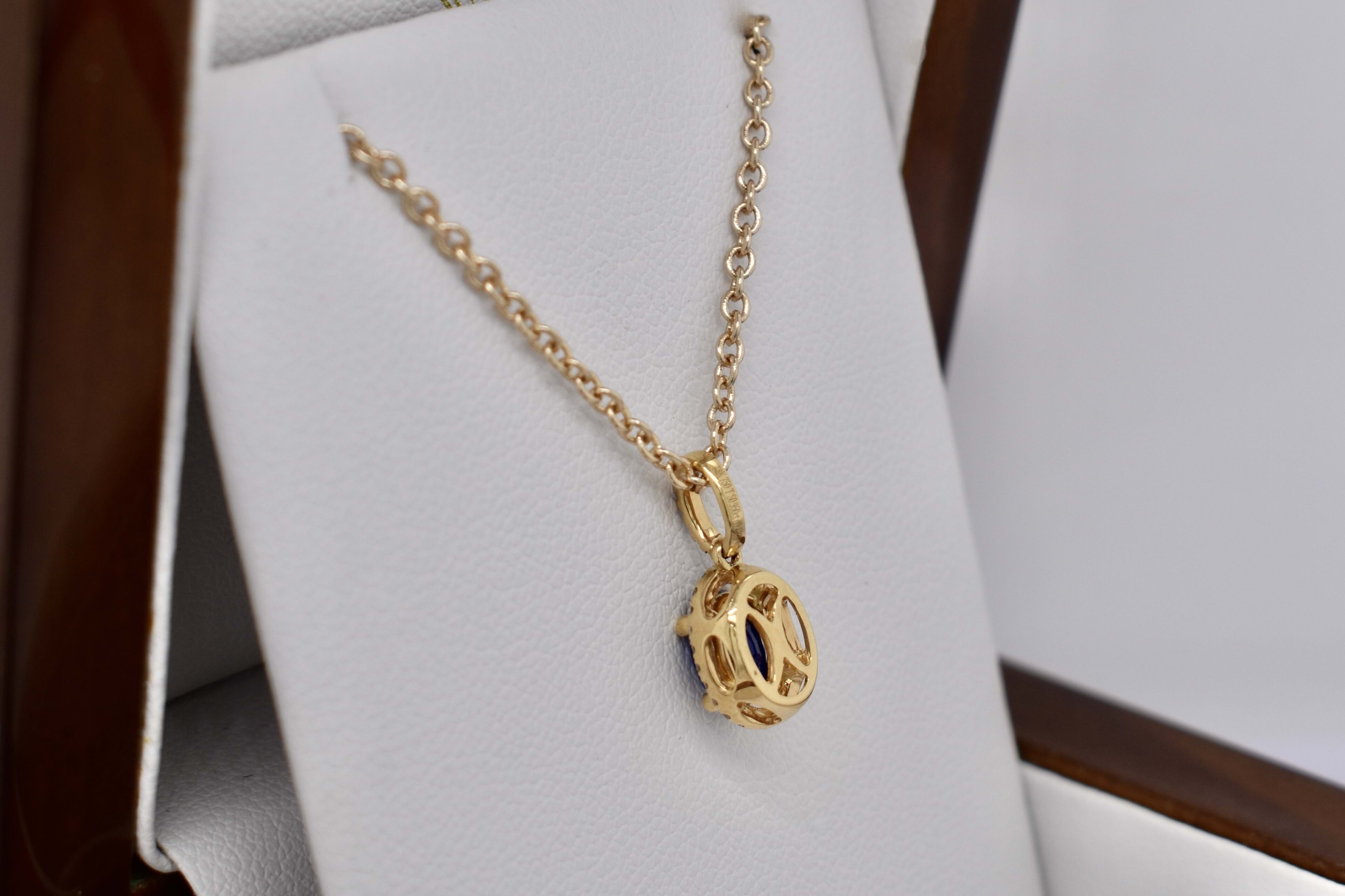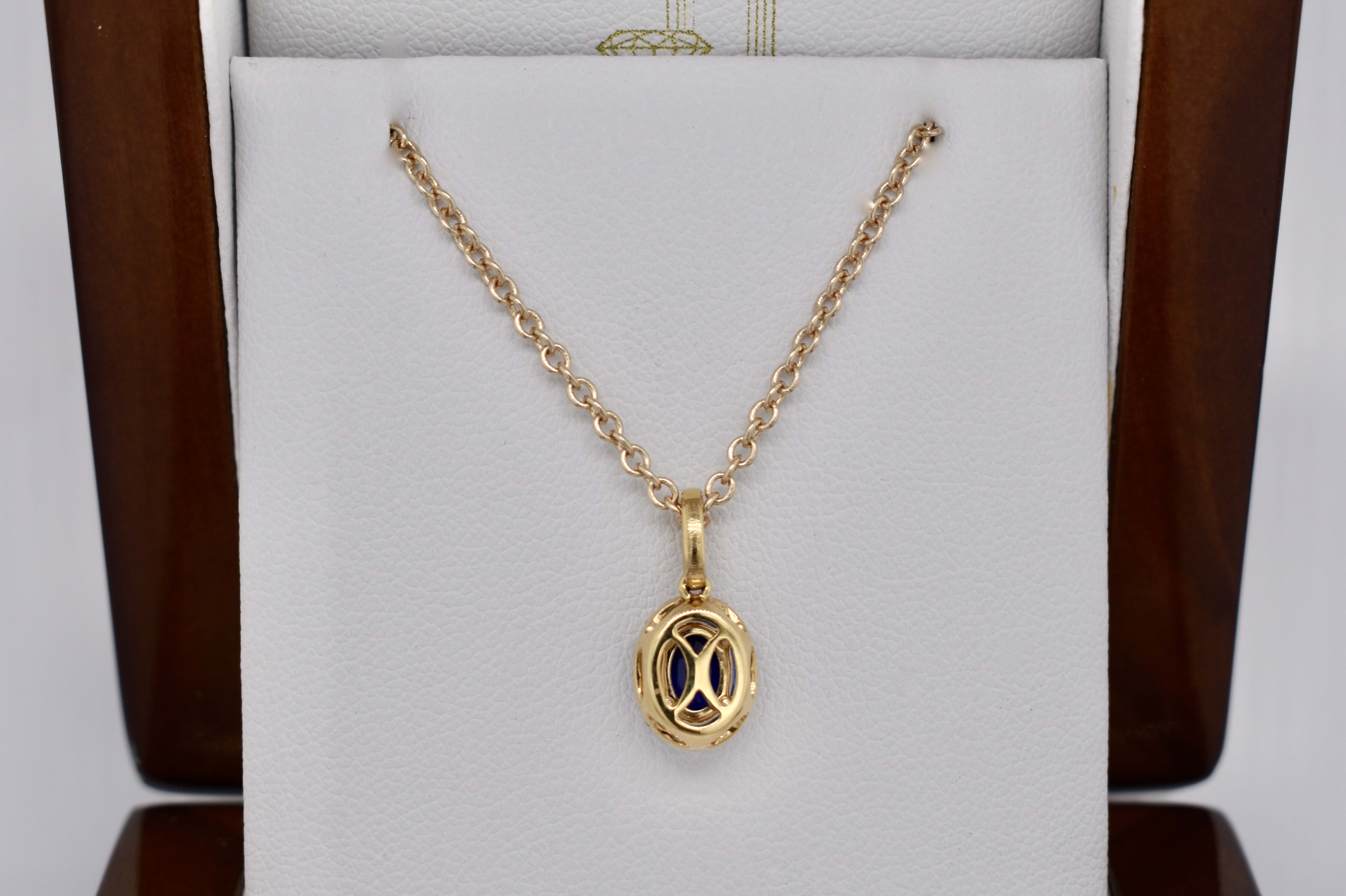 An absolutely stunning, elegant pendant crafted in 18ct yellow gold, with an oval, 6.73x5.04x3.20mm, 0.95ct bright deep blue Ceylon sapphire in four claws. Surrounded with a sparkly halo of white round brilliant cut 0.90mm diamonds which continue up the bail for a total of 31 equalling 0.12ct G SI. 1.20 grams. Chains available for separate purchase. Independent Valuation Supplied