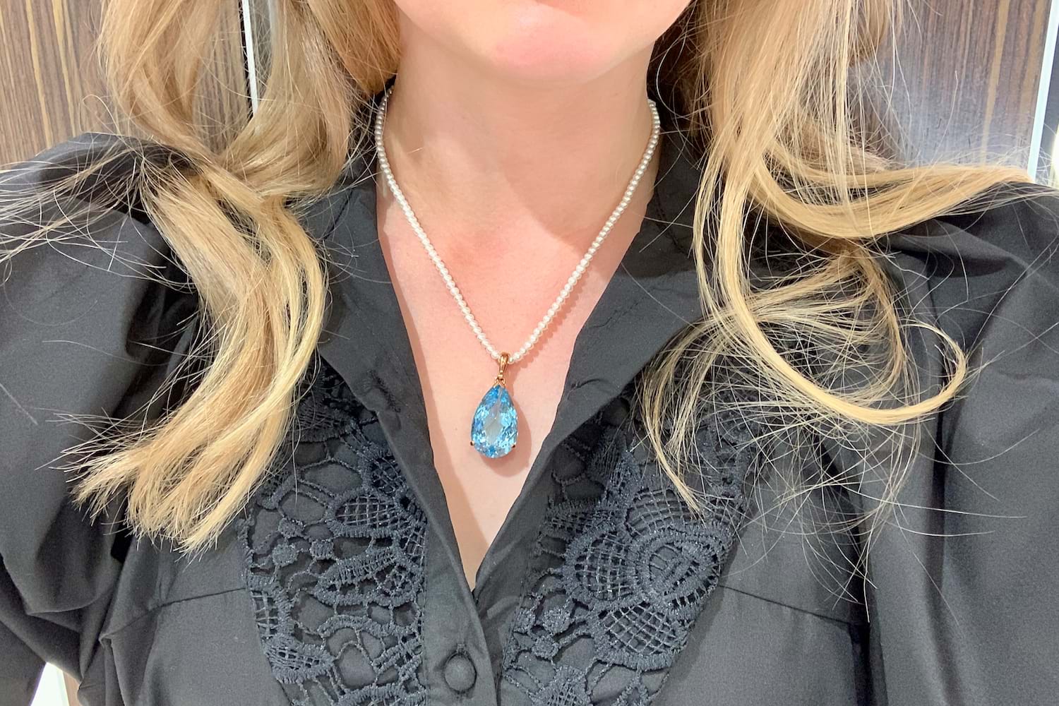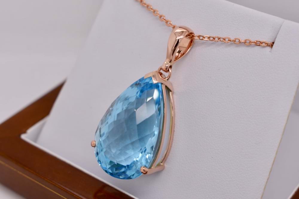 9ct rose gold handmade pendant featuring a beautiful pearshape, faceted, sky blue topaz in a two claw and cap setting with a plain bale. Stones measures 29x18mm. Chains available for separate purchase