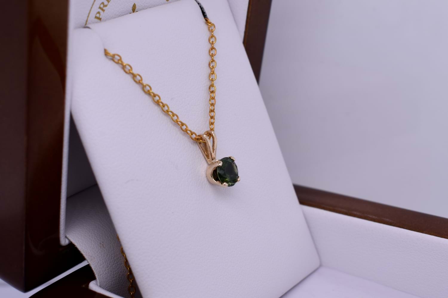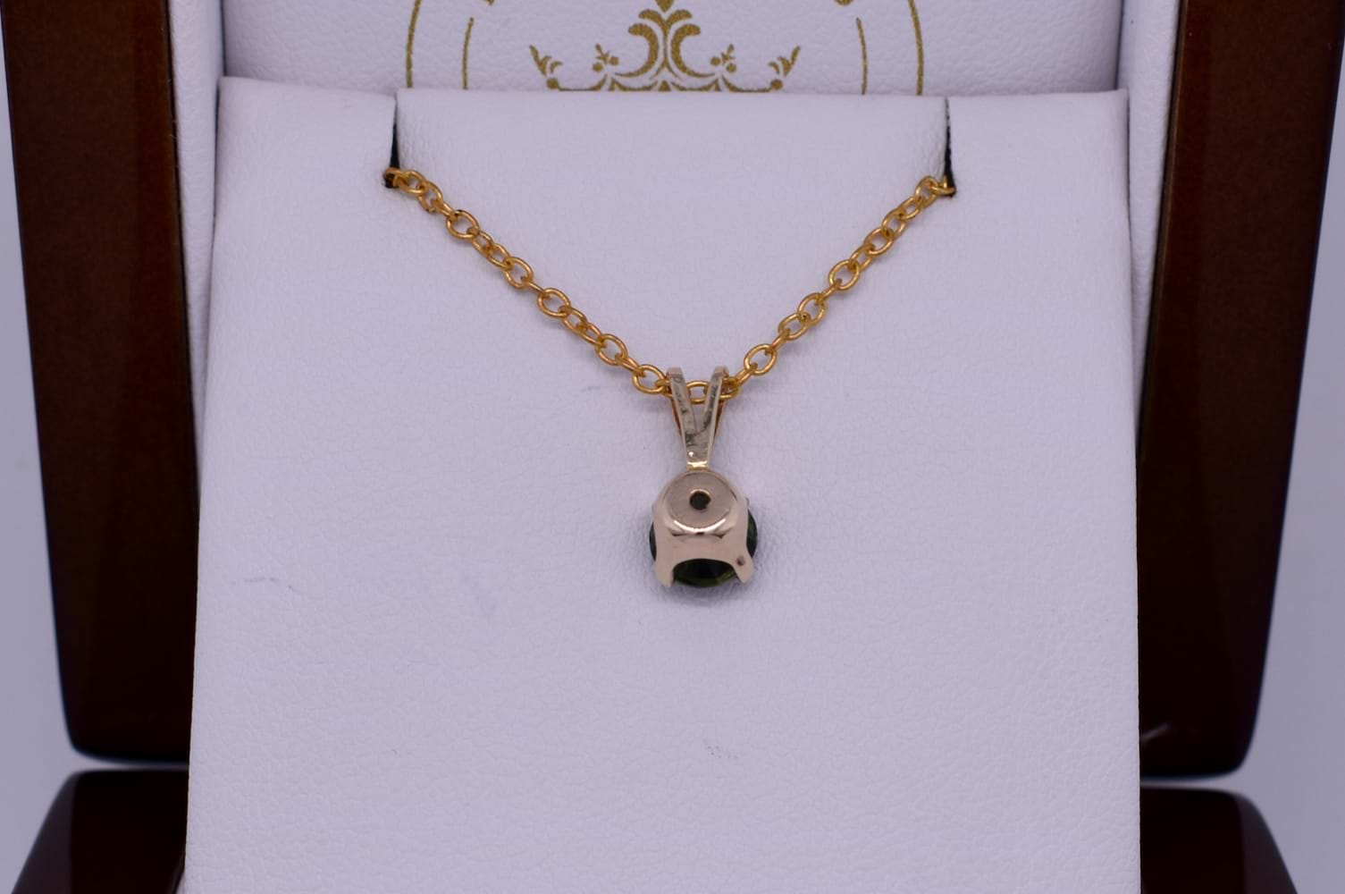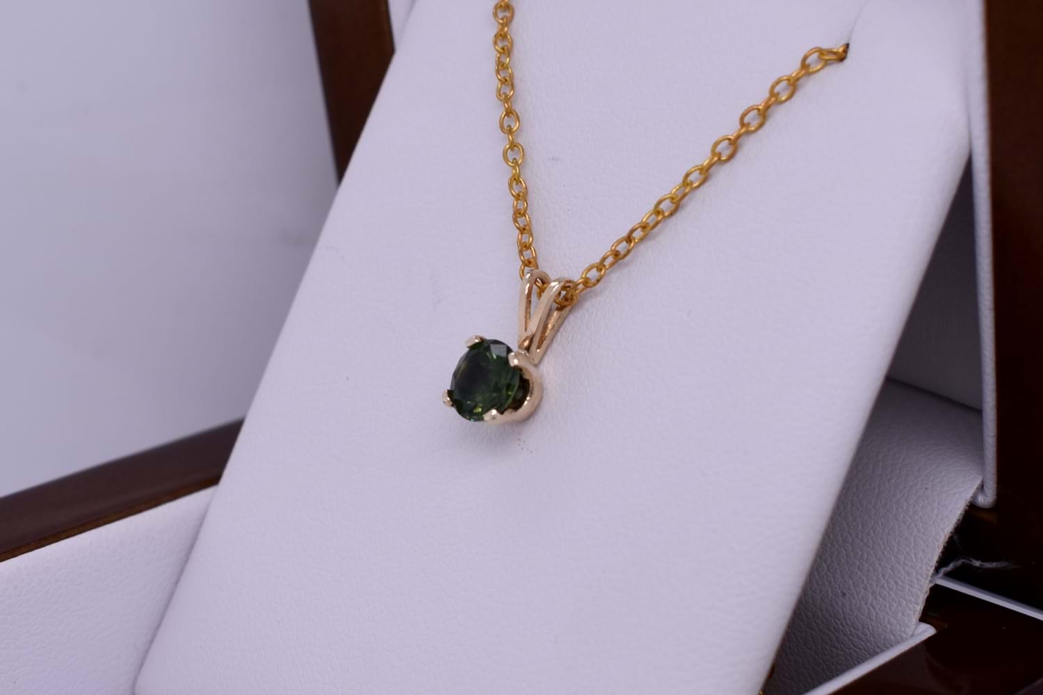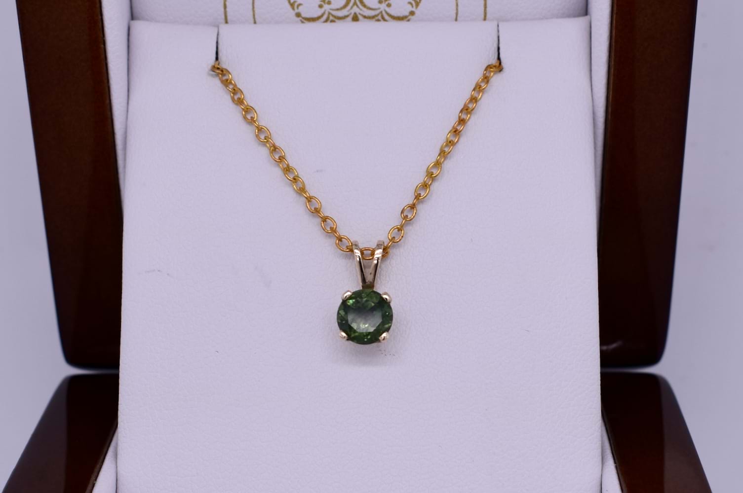 This gorgeous pendant features an approx. 6mm round bright mid green Australian sapphire weighing 0.96ct, four claw set into a 9ct yellow gold setting. The pendant is finished with a tapered, split loop bale. Chains are available for separate purchase. Independent valuation supplied.