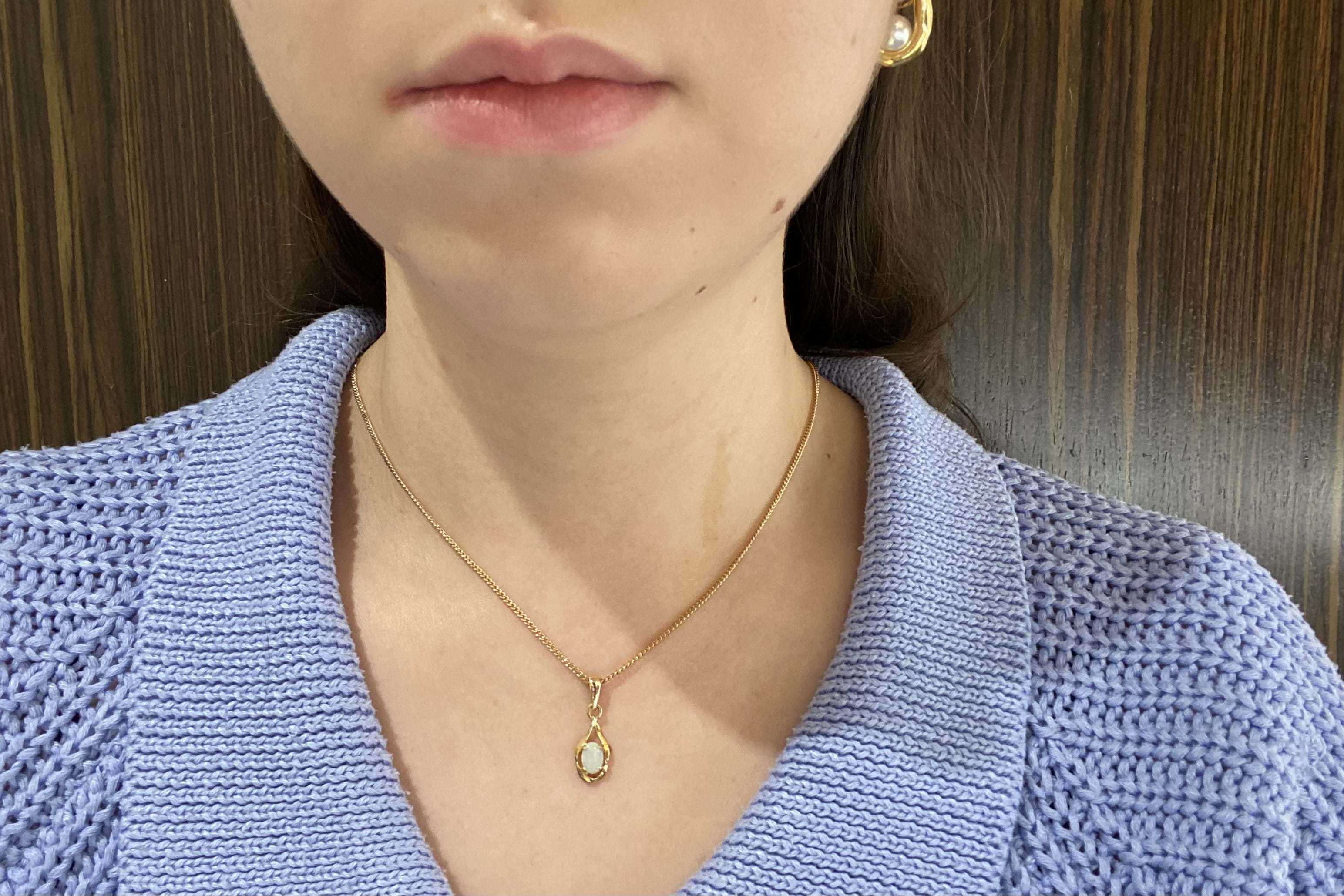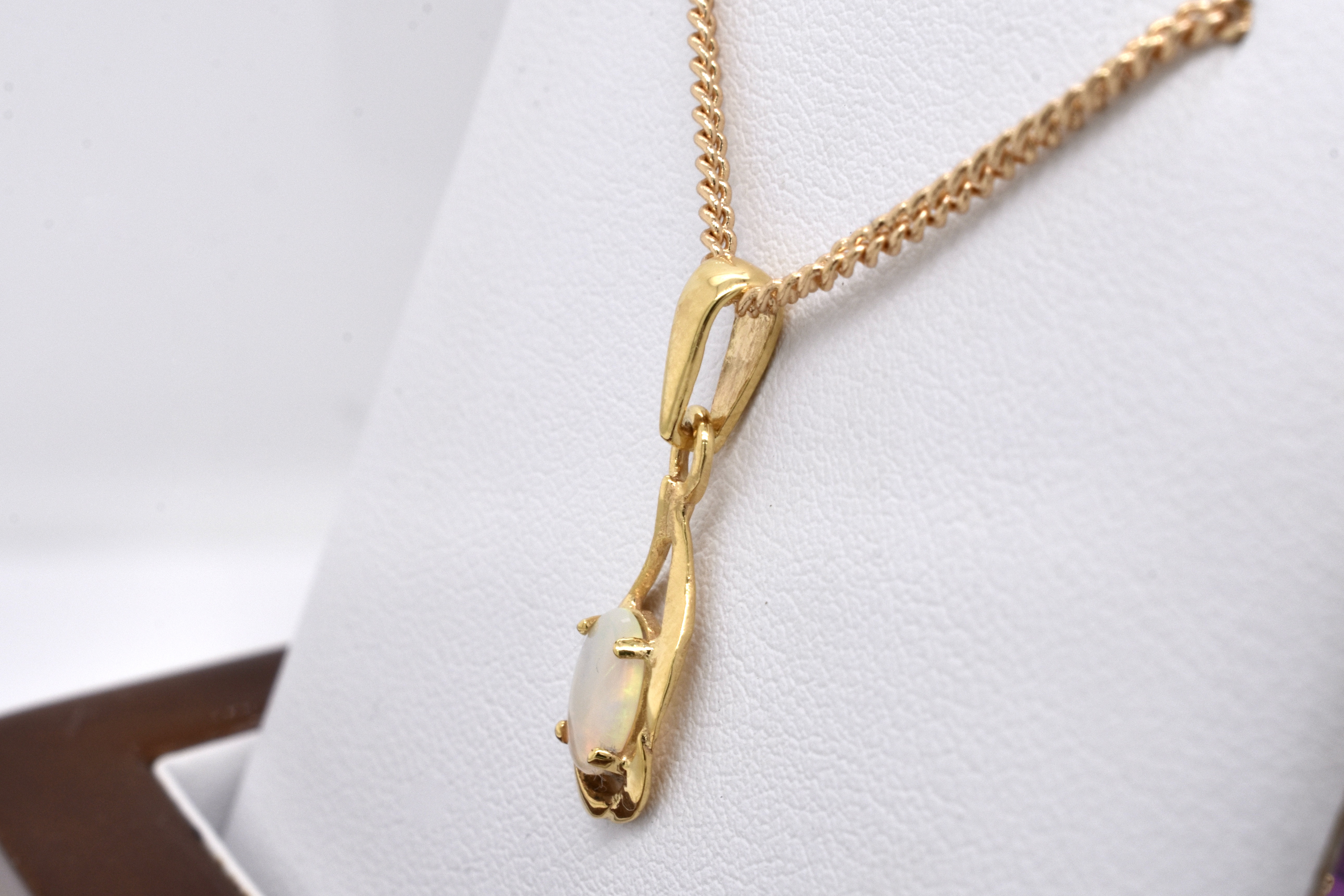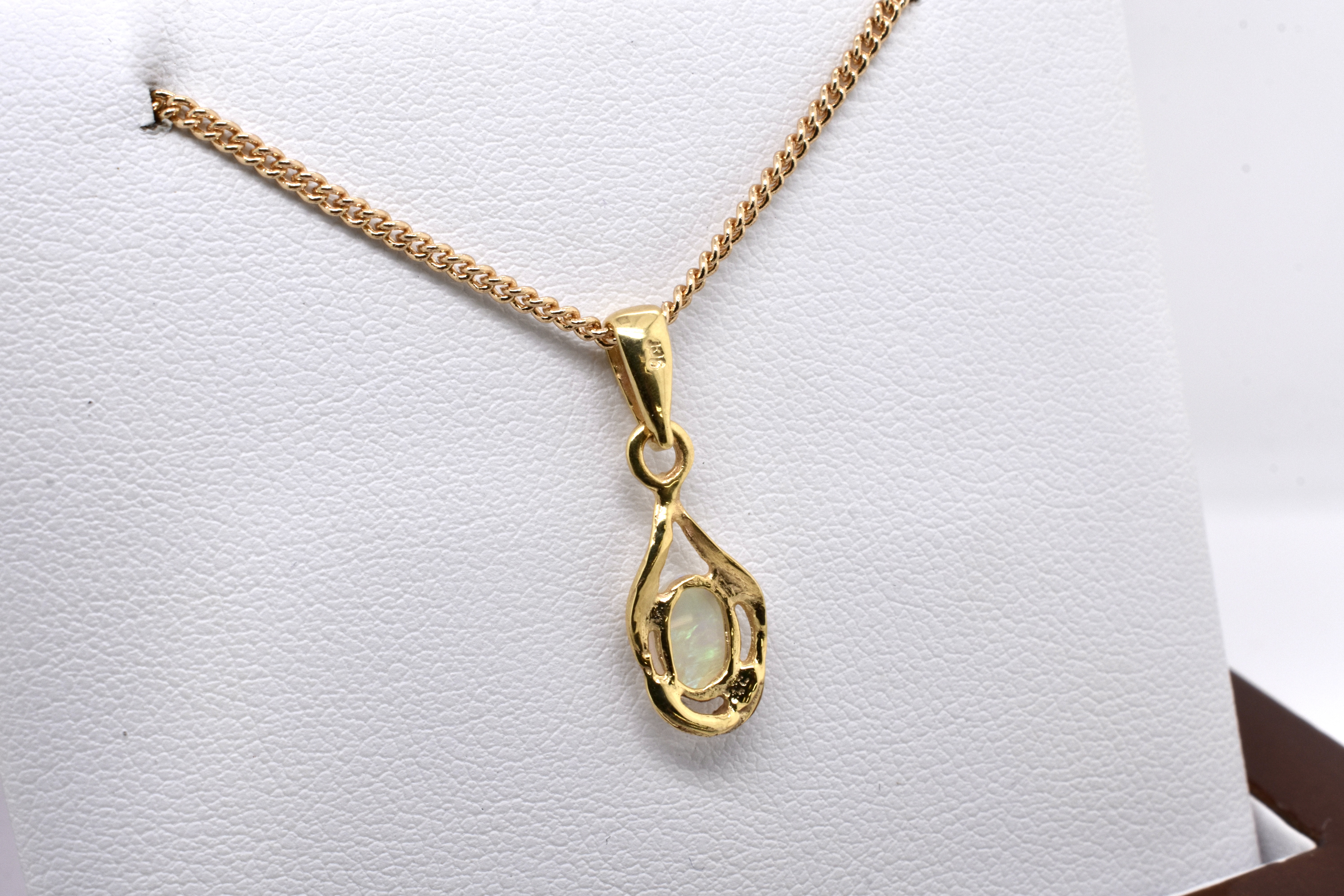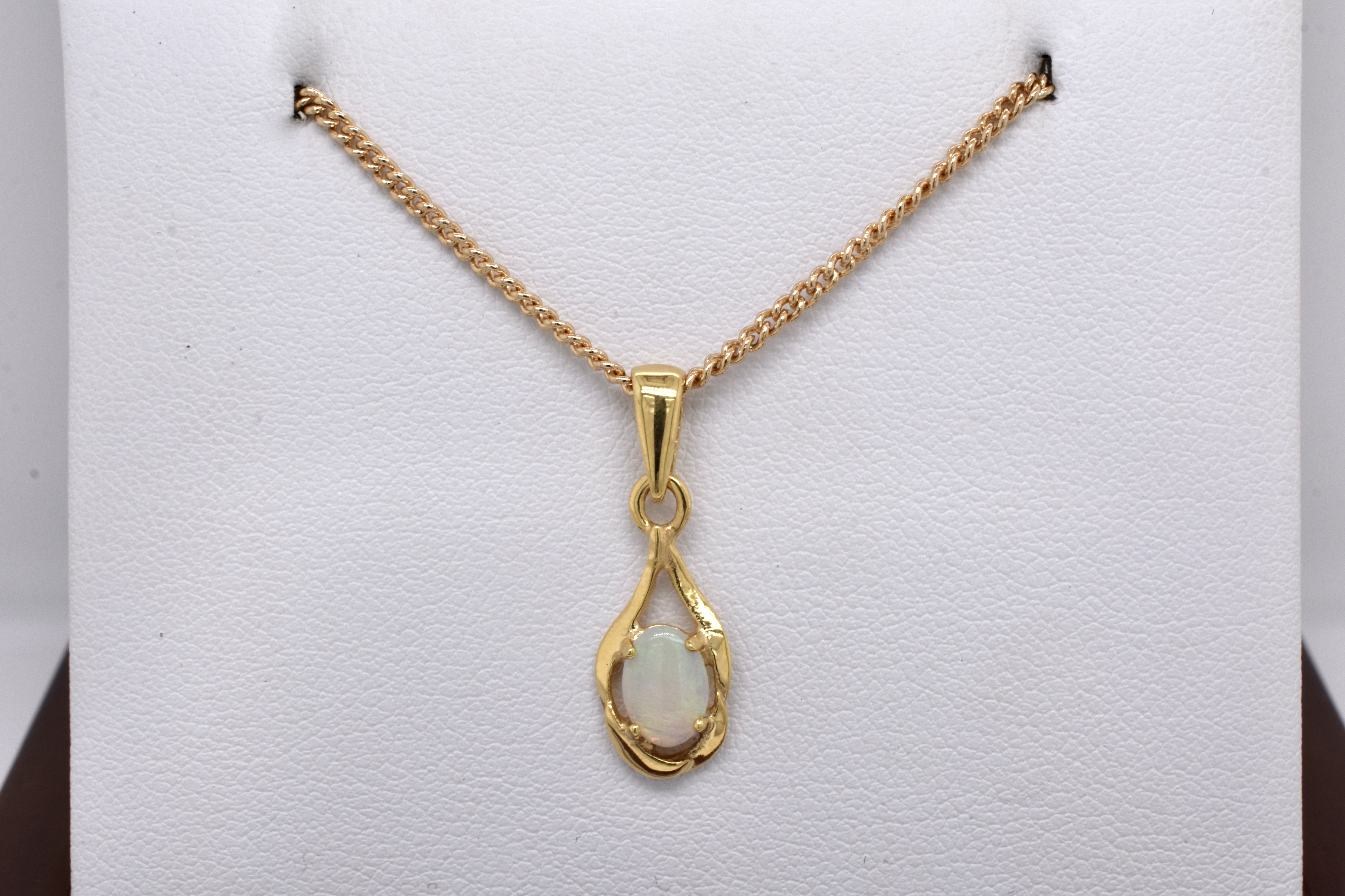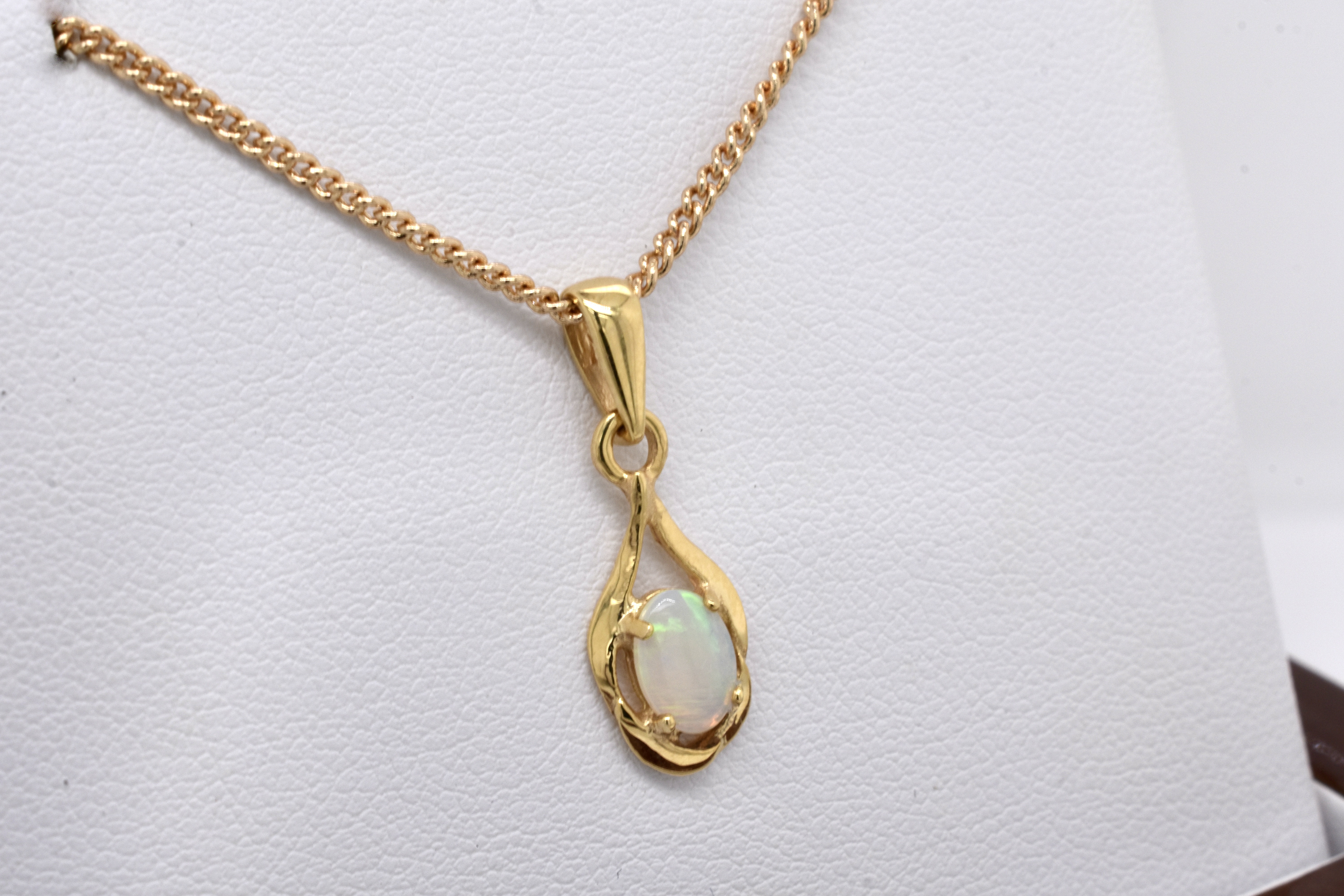 A pretty pendant crafted from 9ct yellow gold, with an approx. 7 x 5mm oval piece of solid white opal with flashes of orange, green and blue in four claws with a surrounding swirl style design and plain tapered bail. Chains available for separate purchase