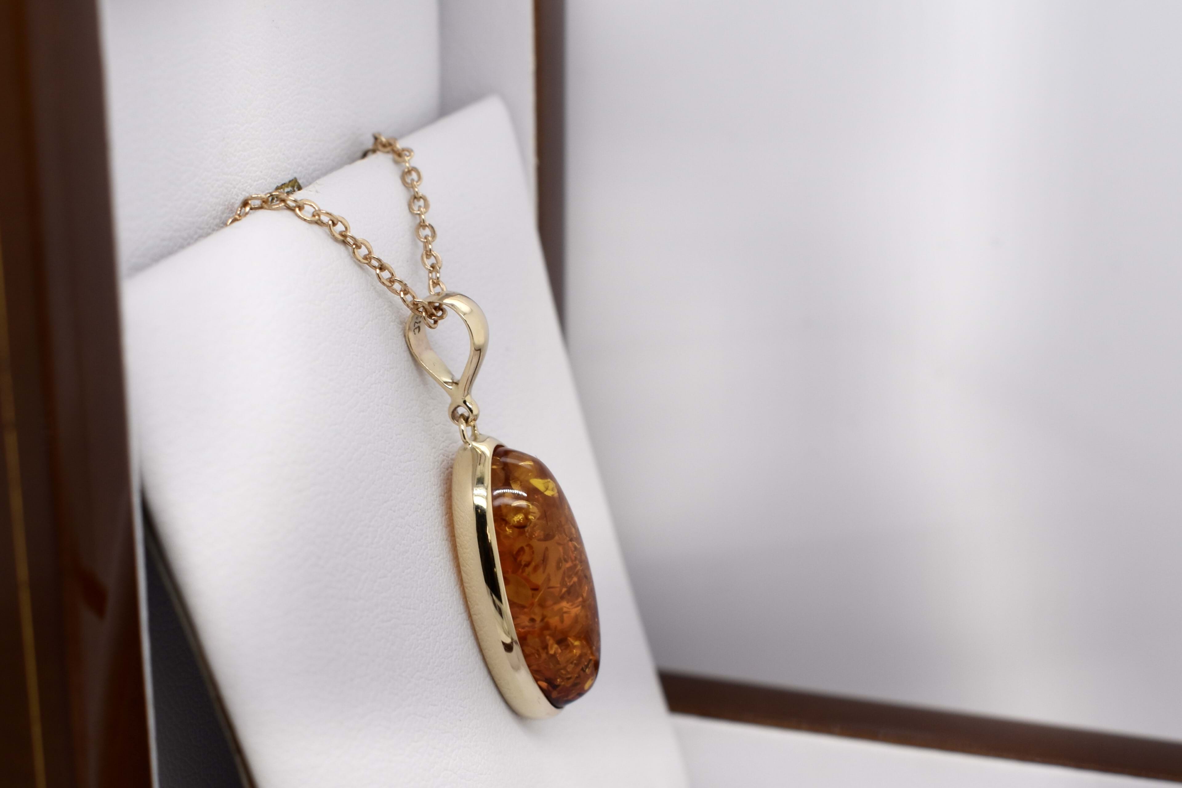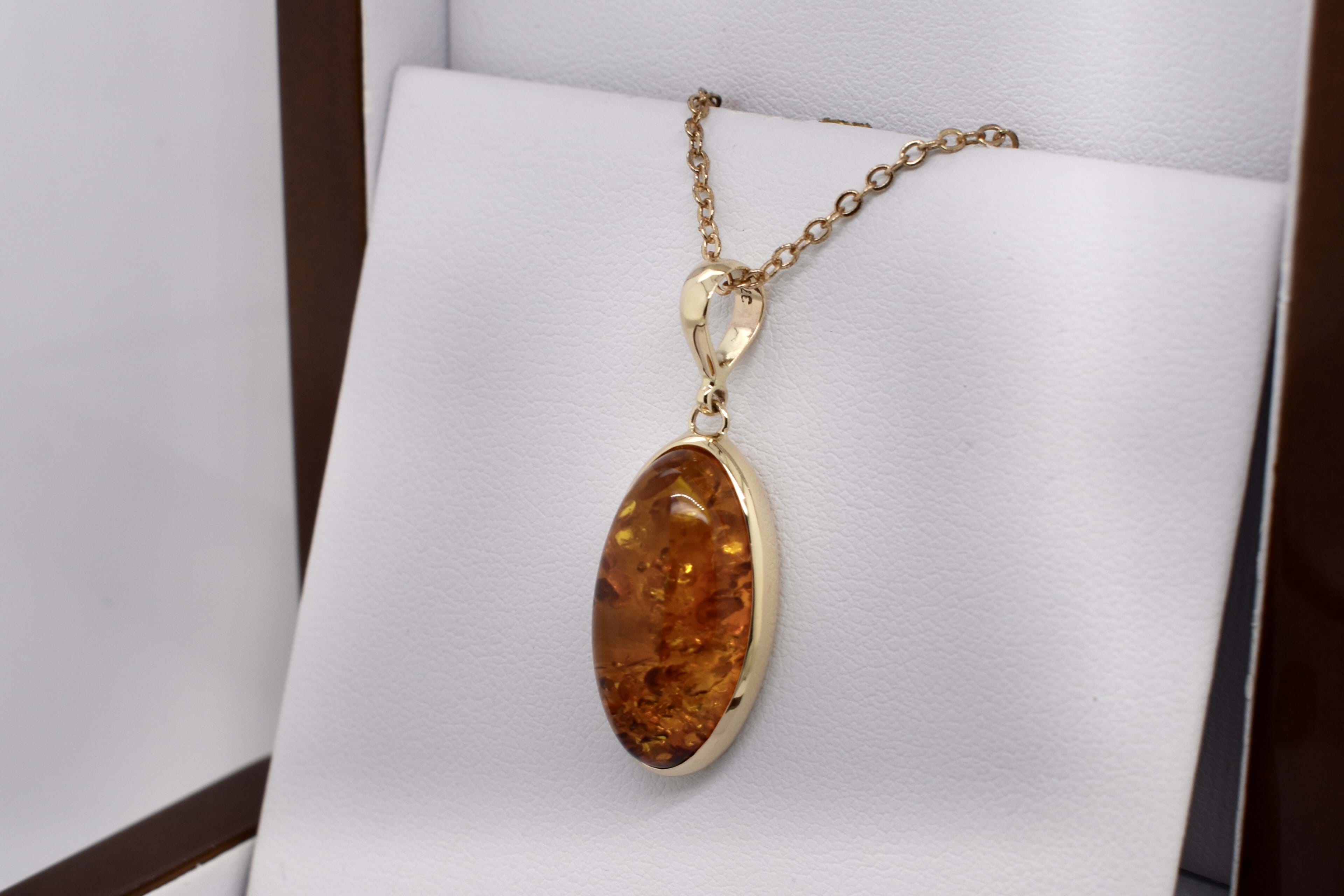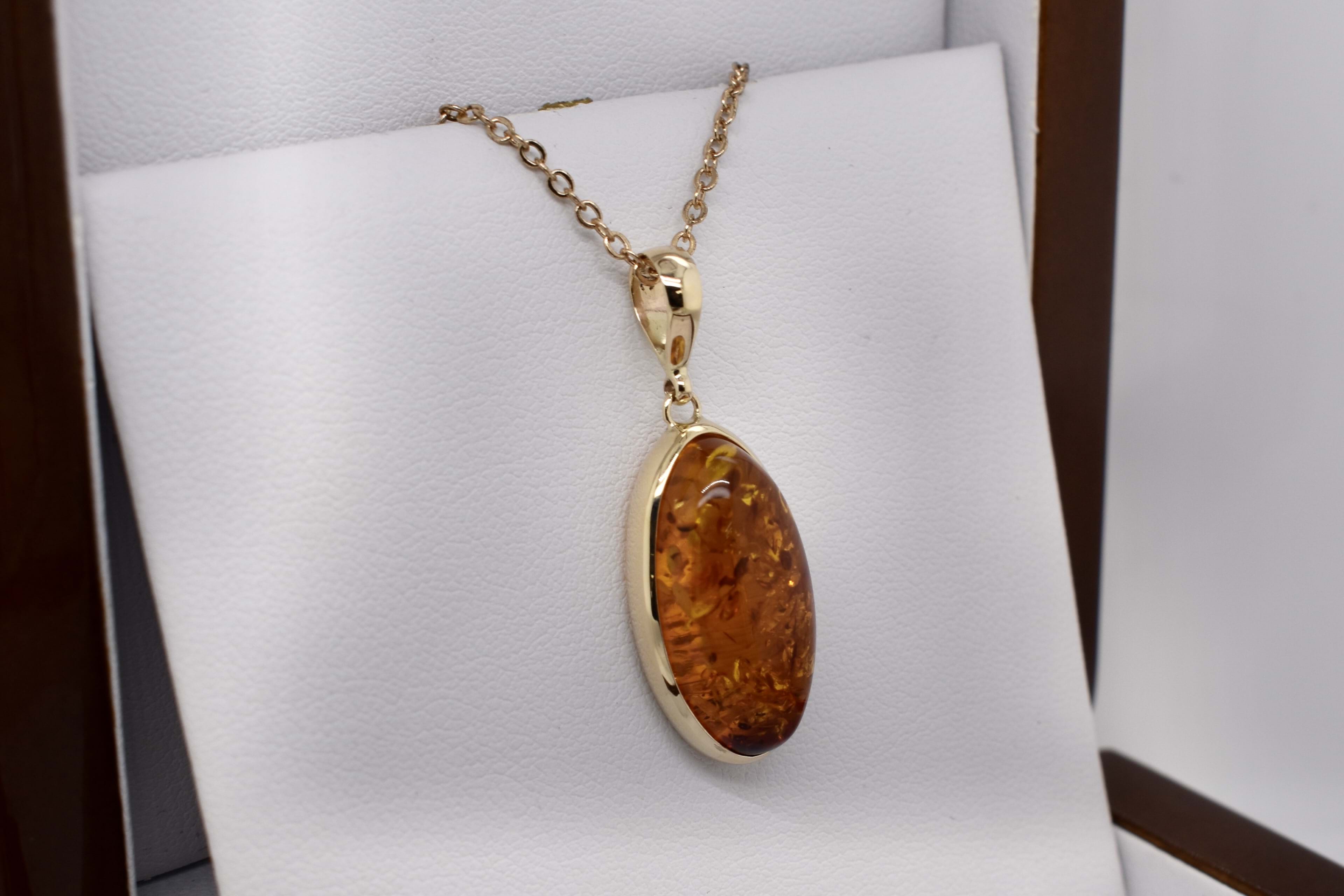 A stunning baltic amber pendant, set in 9ct yellow gold, measuring 23.6x13.6mm. Bezel set with a plain bale. Chains available for separate purchase.